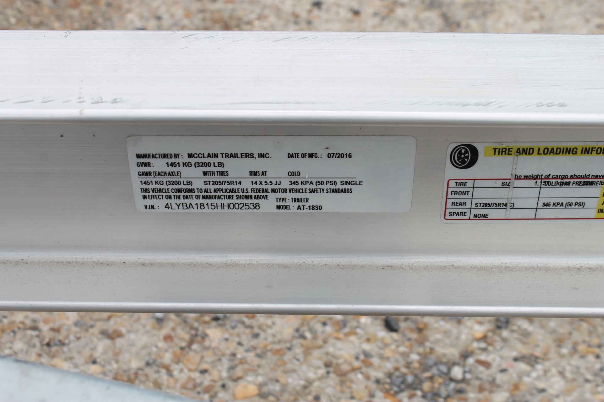 2016 McClain Trailers AT-1830 Aluminum, 17-18' New McClain aluminum trailer for 17-18' boat. Single torsion axle. LED lighting. Stainless hardware. Vault hubs. 70" between fenders, 2950 GVWR, 19'8" overall length, 94" overall width, 14" tires