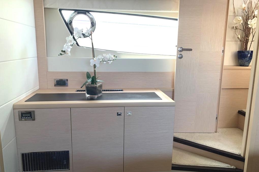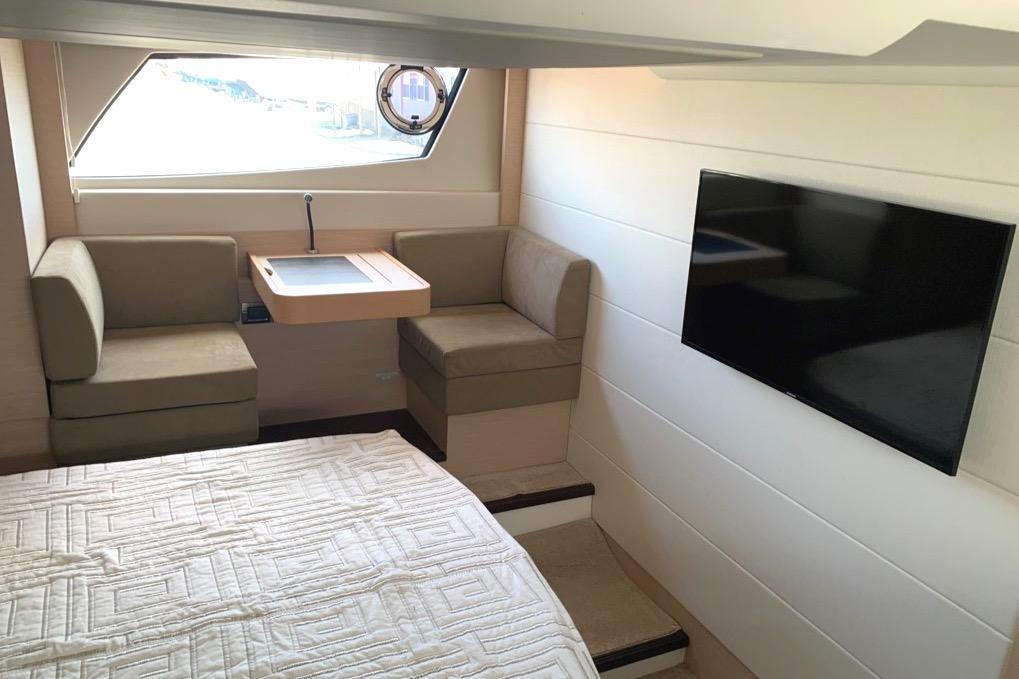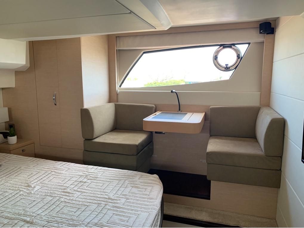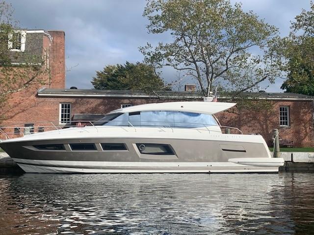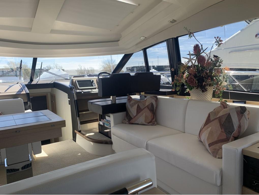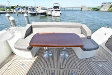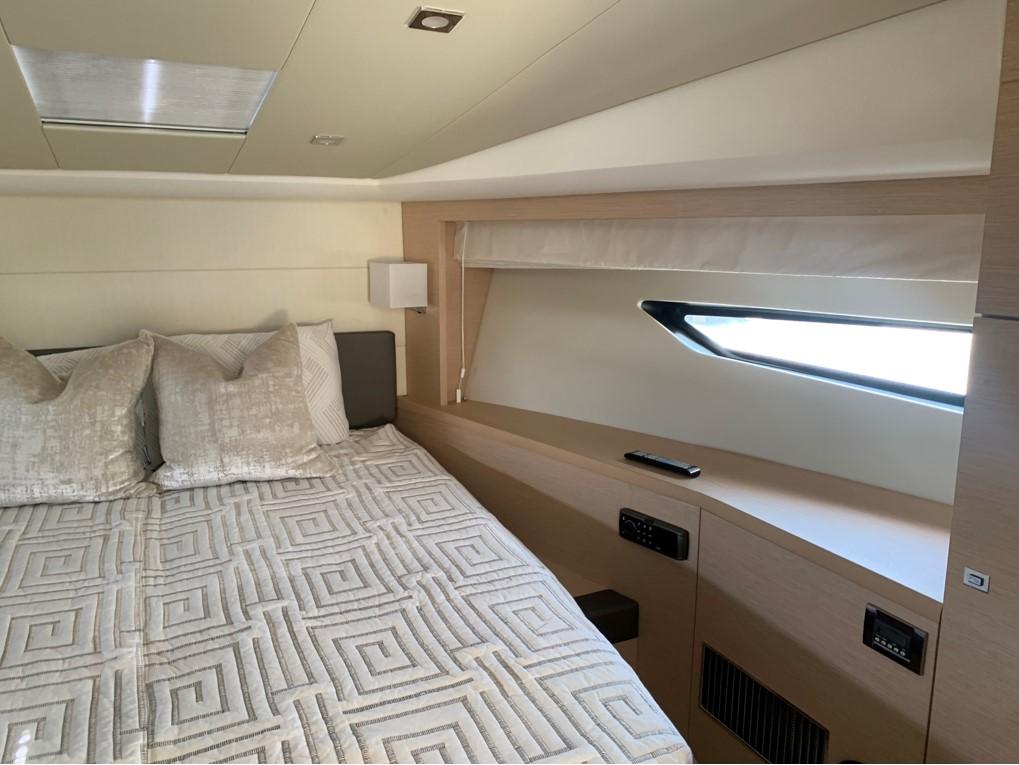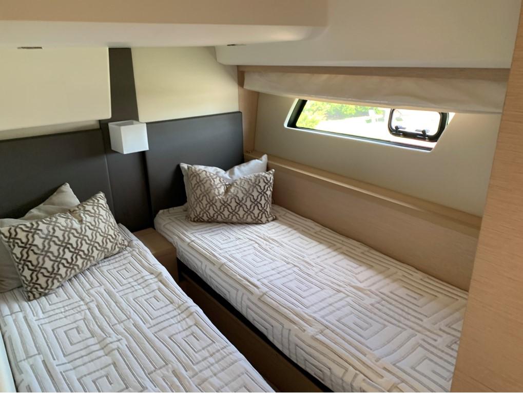 This PRESTIGE 500 S offers a luxurious layout with full beam master stateroom with private entrance and ensuite bathroom. Two guest cabins forward, one with a queen berth and private bathroom entrance and one with two large twin berths. A spacious salon and galley continues into the exterior with a great cockpit space. This model offers a tender garage with room for inflatable or jet ski.