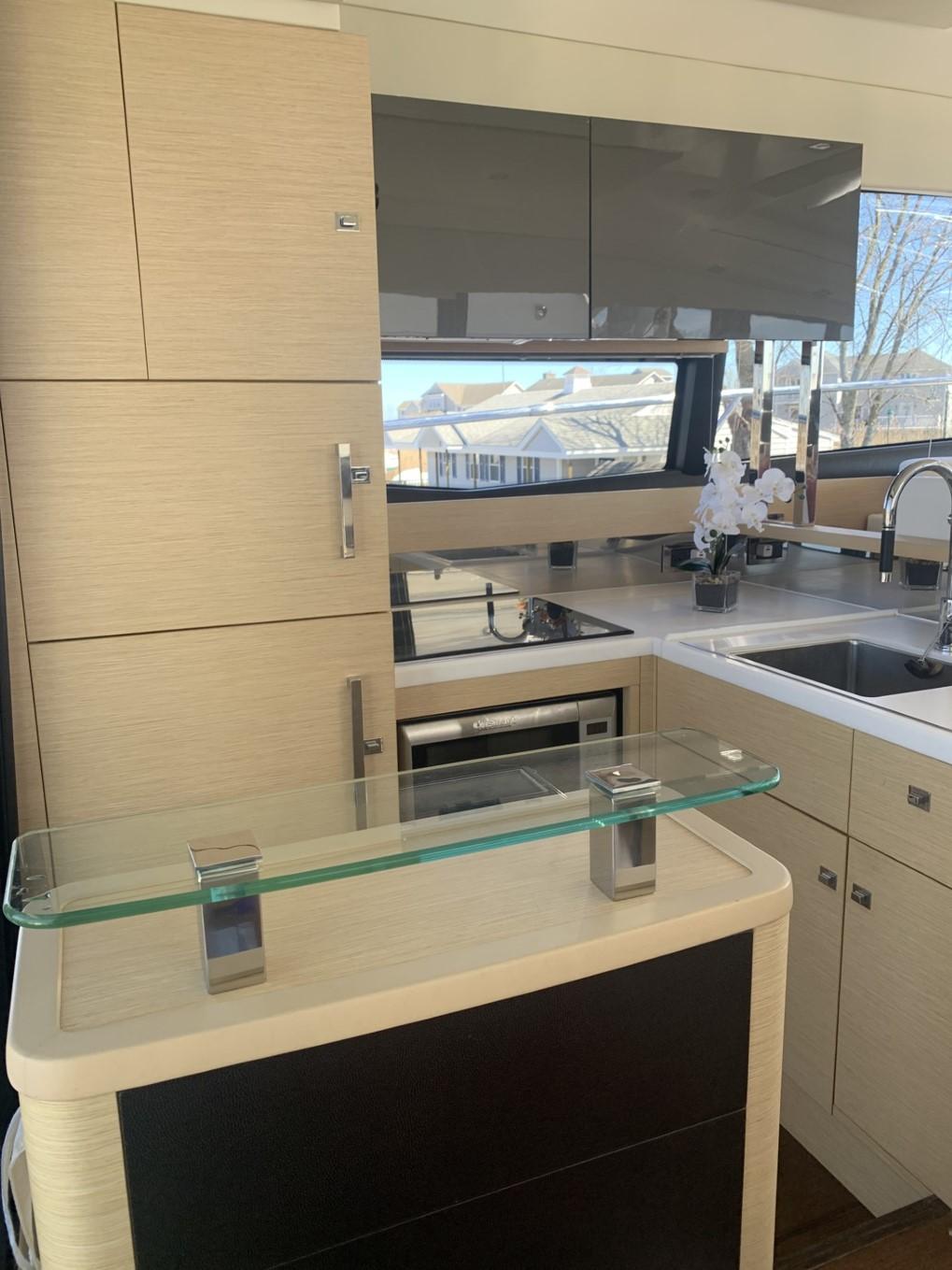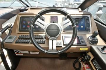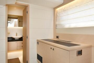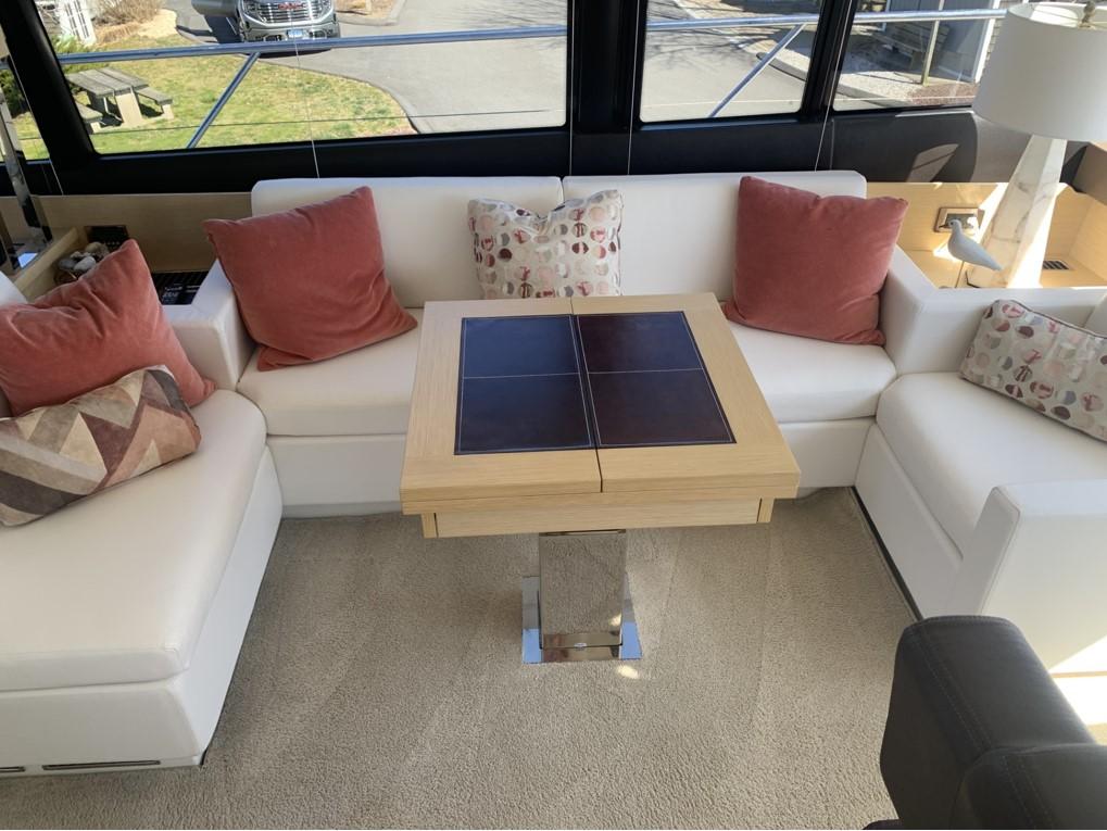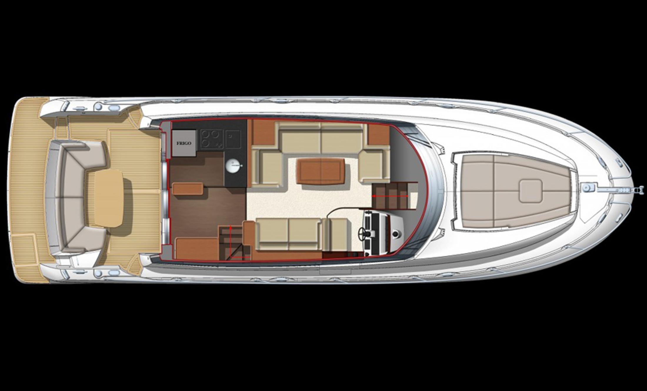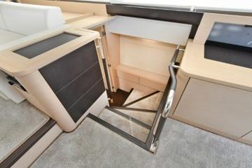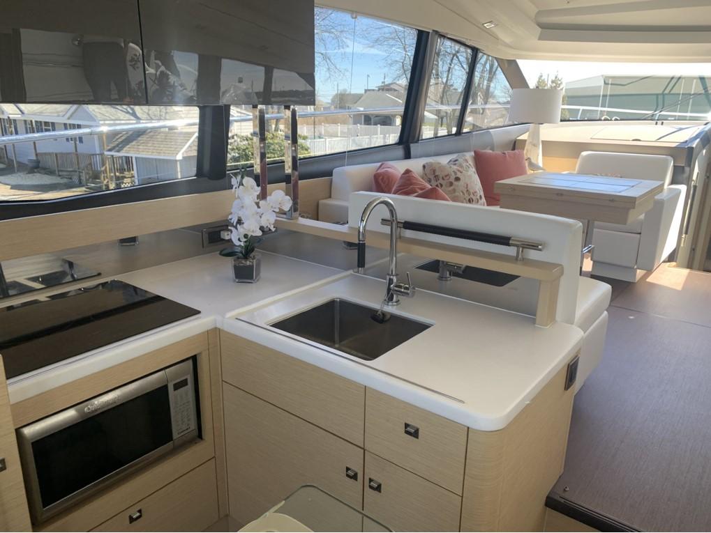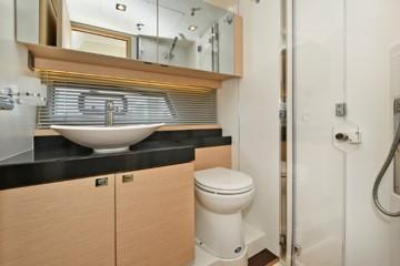 This PRESTIGE 500 S offers a luxurious layout with full beam master stateroom with private entrance and ensuite bathroom. Two guest cabins forward, one with a queen berth and private bathroom entrance and one with two large twin berths. A spacious salon and galley continues into the exterior with a great cockpit space. This model offers a tender garage with room for inflatable or jet ski.