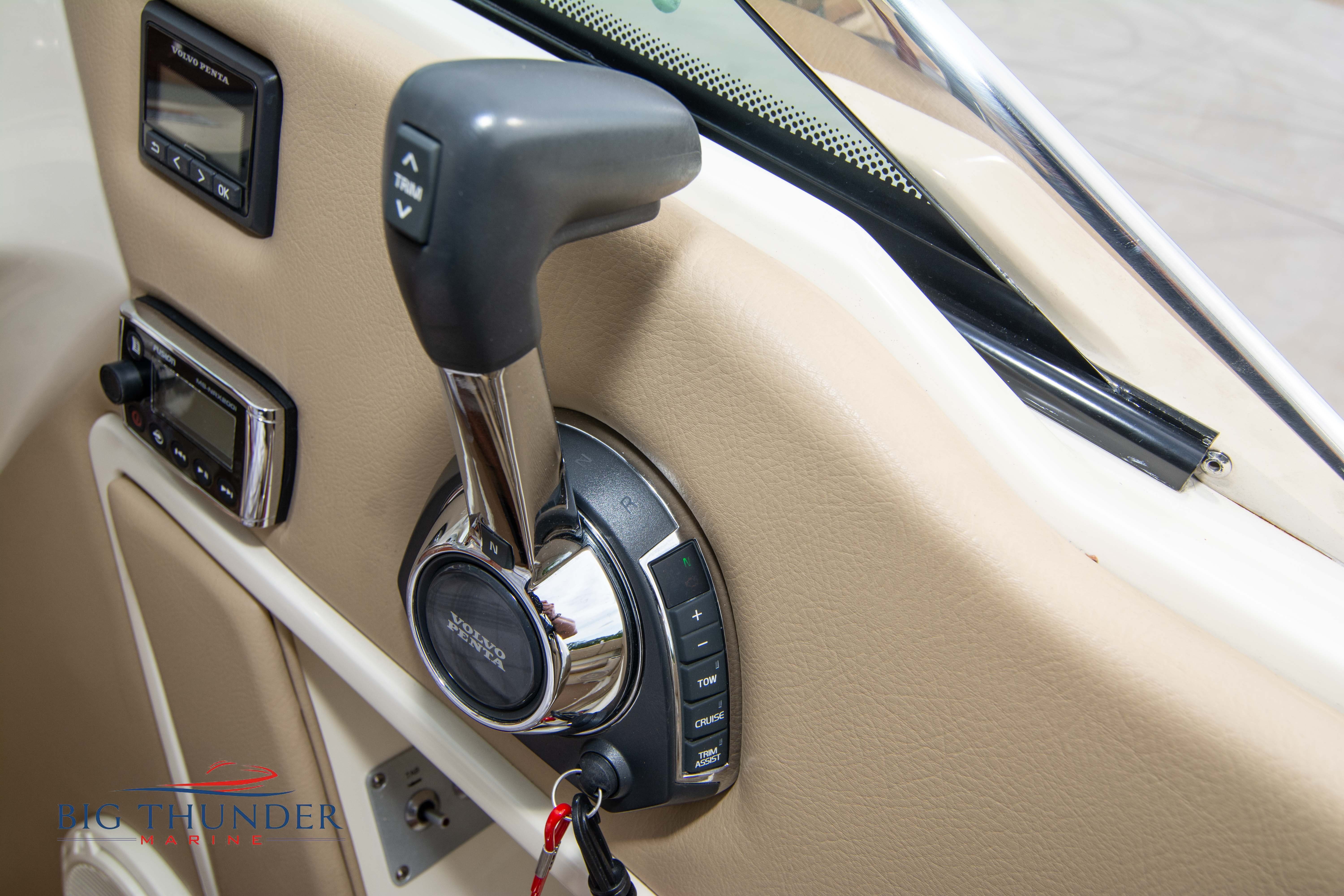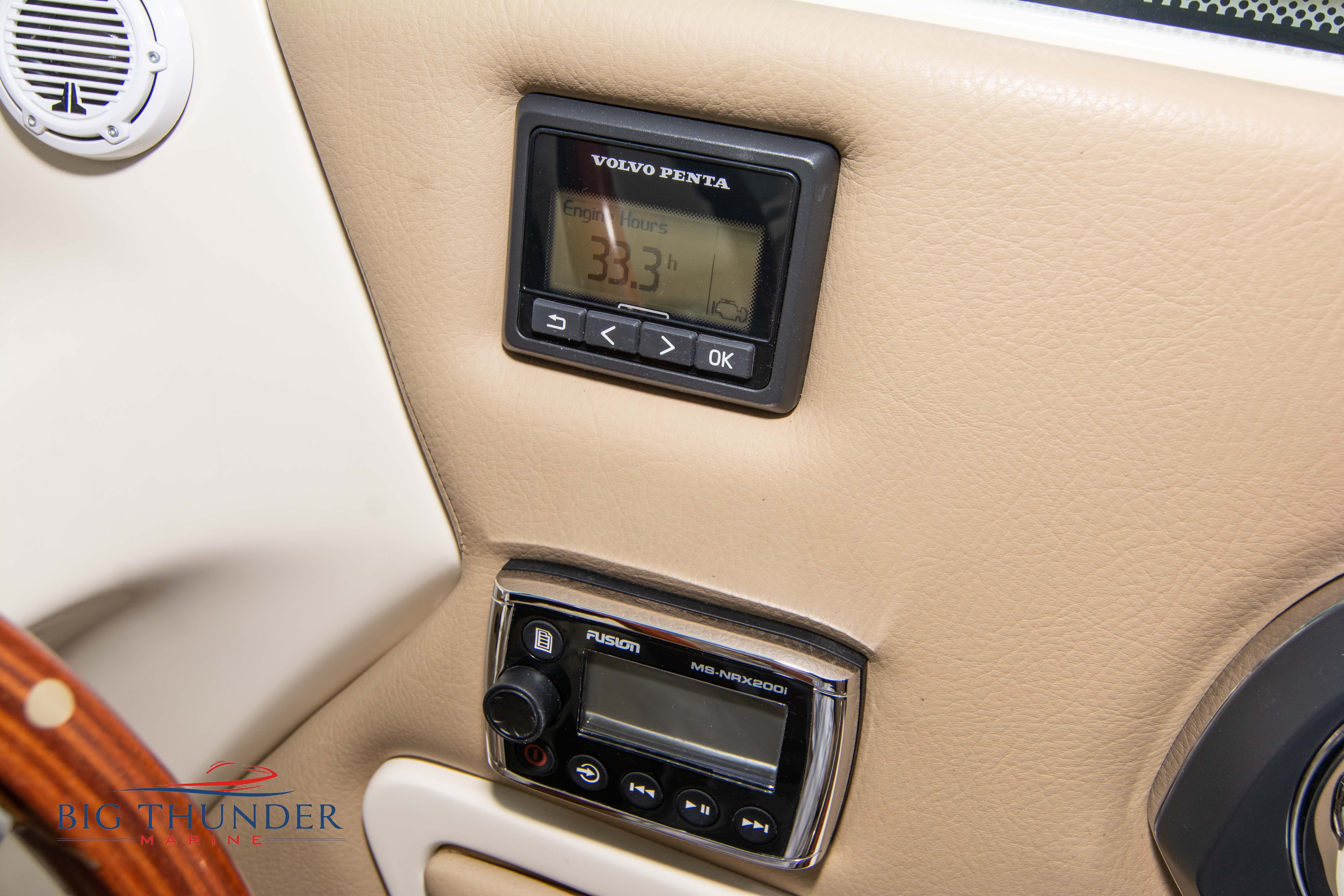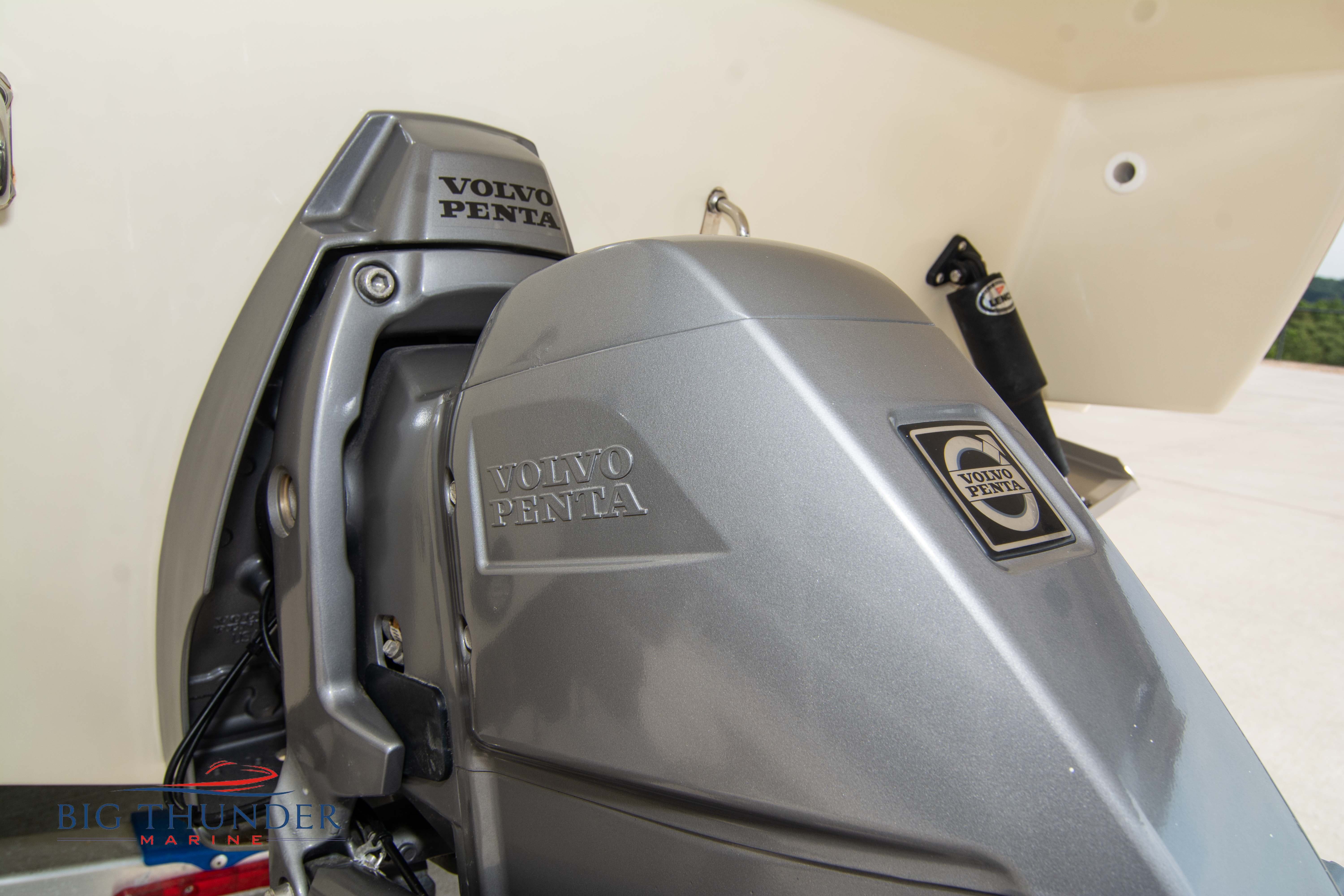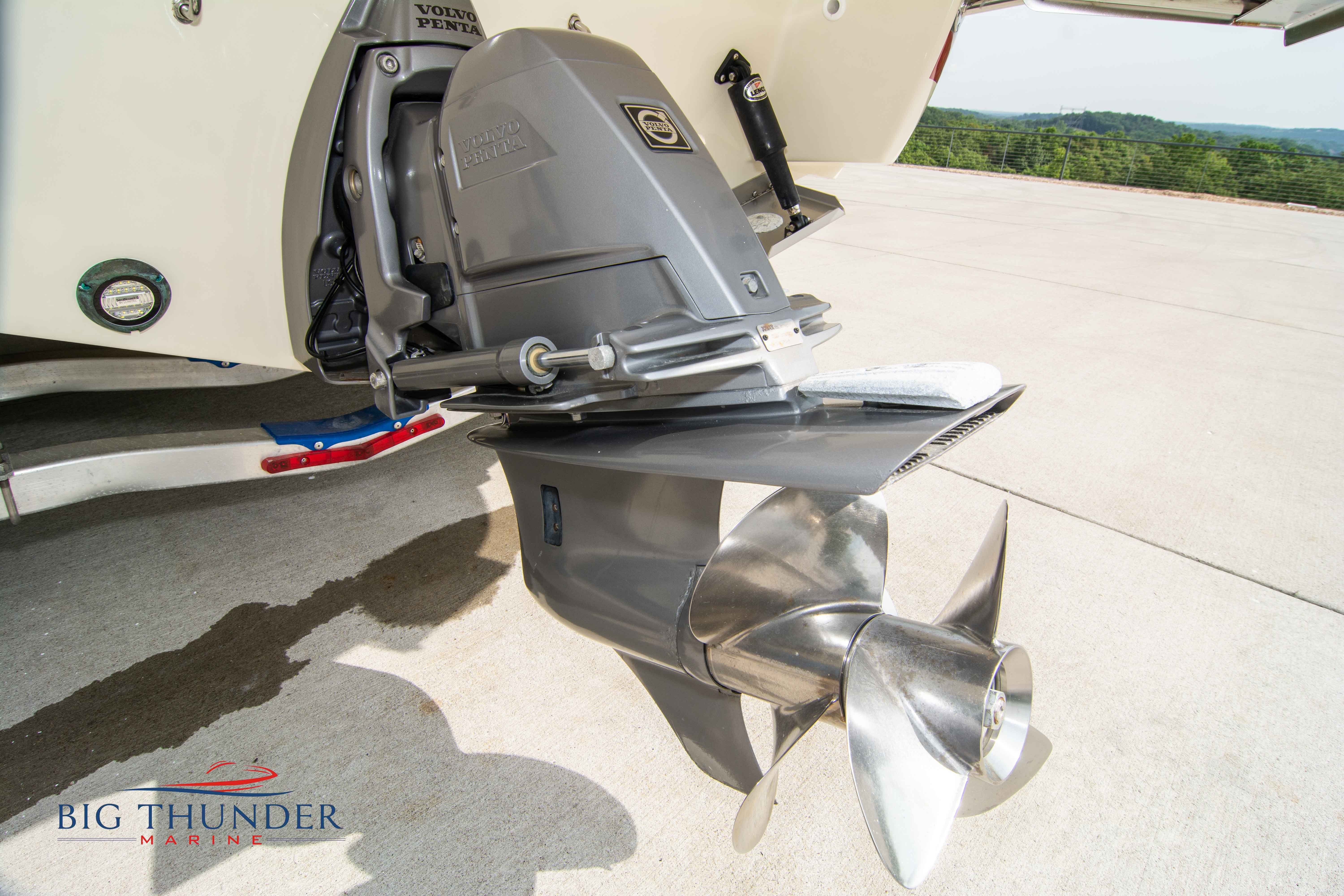 Volvo-Penta 6.0L DP FWC (33.3 hours on meter) Volvo Duoprop drive. Digital throttle & shift w/ Trim Assist. Trim tabs. Volvo engine monitoring system. Captain’s call exhaust. Auto fire extinguishing system. Shore power plug in. Dual batteries w/ switch. Transom shower. Walk-thru transom. Bimini top. Heritage teak trim pkg. Port & starboard side fold down cockpit tables. Pump out Porta Potti. Woven snap in cockpit flooring. Premium JL audio system w/ Fusion Bluetooth stereo. Interior courtesy lighting. Underwater lighting. Nav/dock lights. Speedo & tach w/ digital readouts. Volt meter, fuel gauge, trim gauge, & compass. Garmin GPSmap xs color touchscreen display/GPS. Bilge blower. Flip up bolsters. Windlass w/ line & chain. Mooring cover.