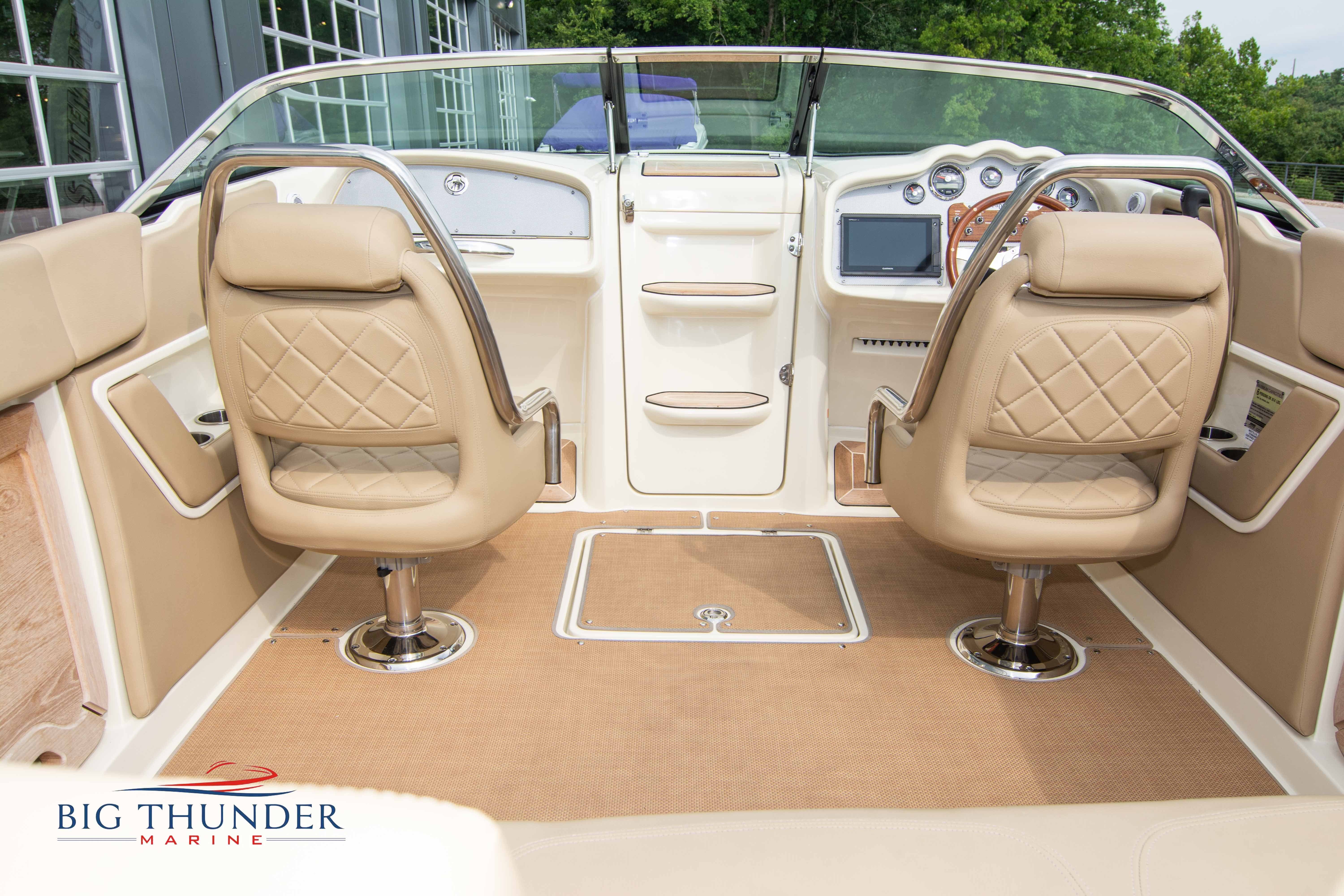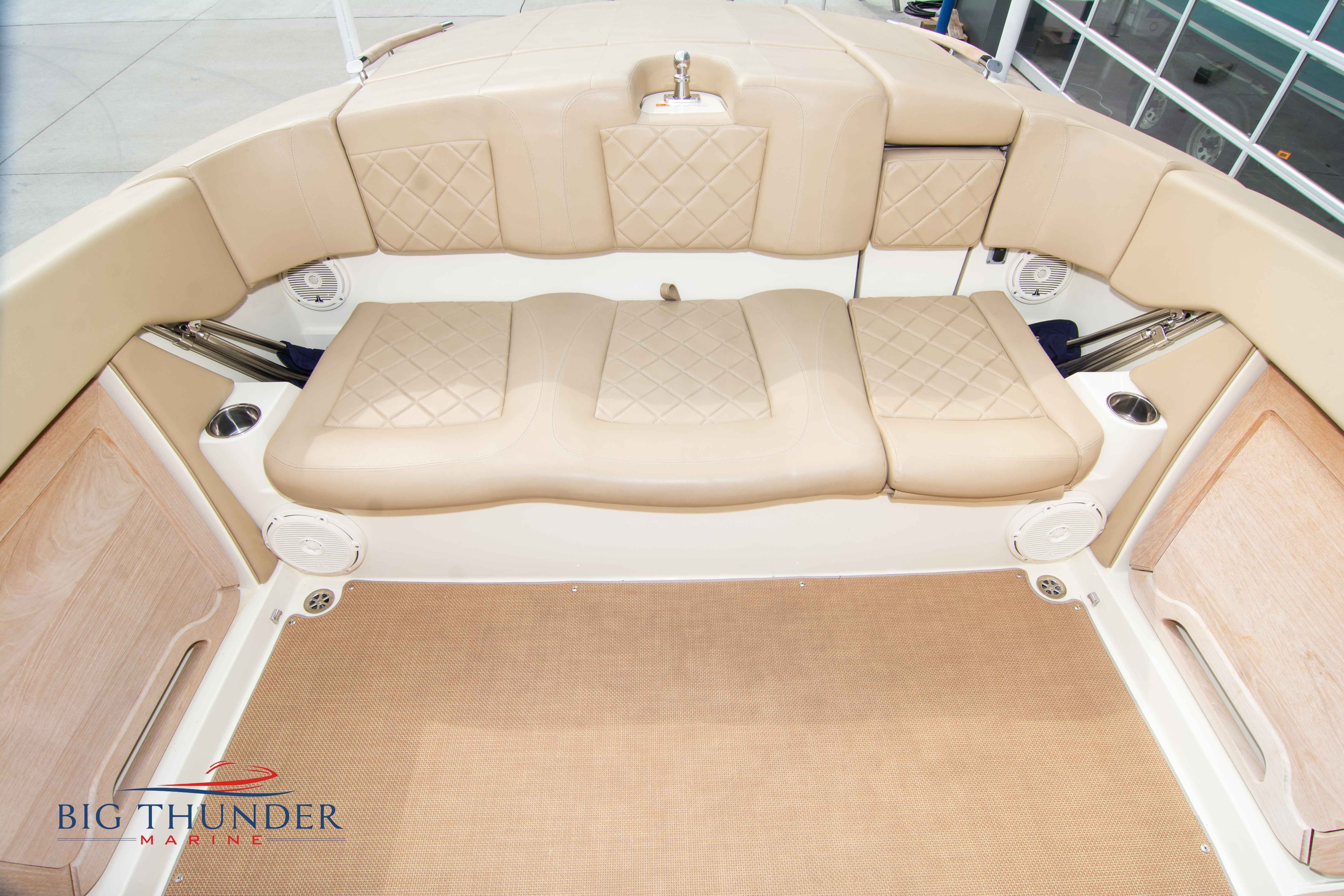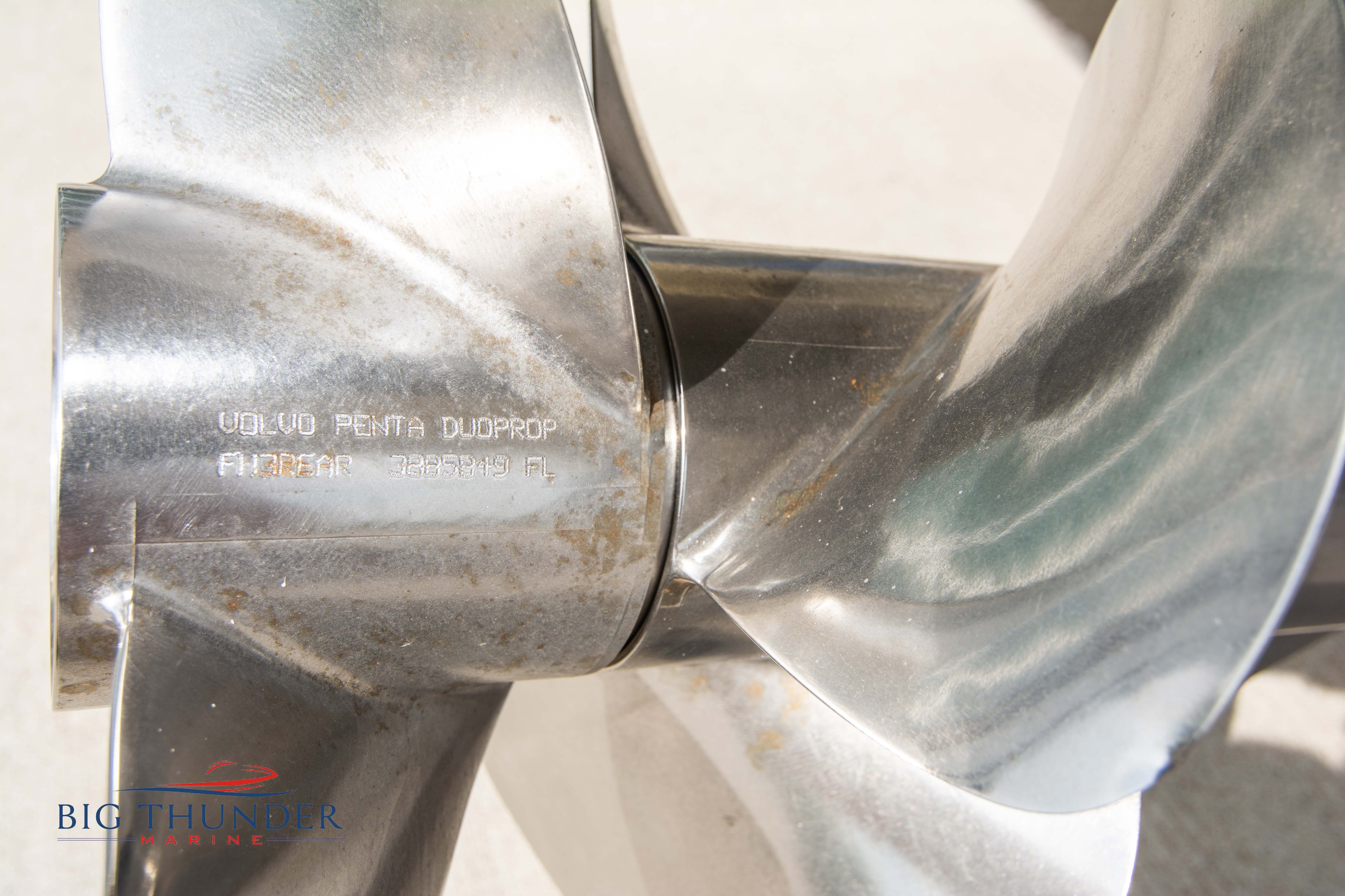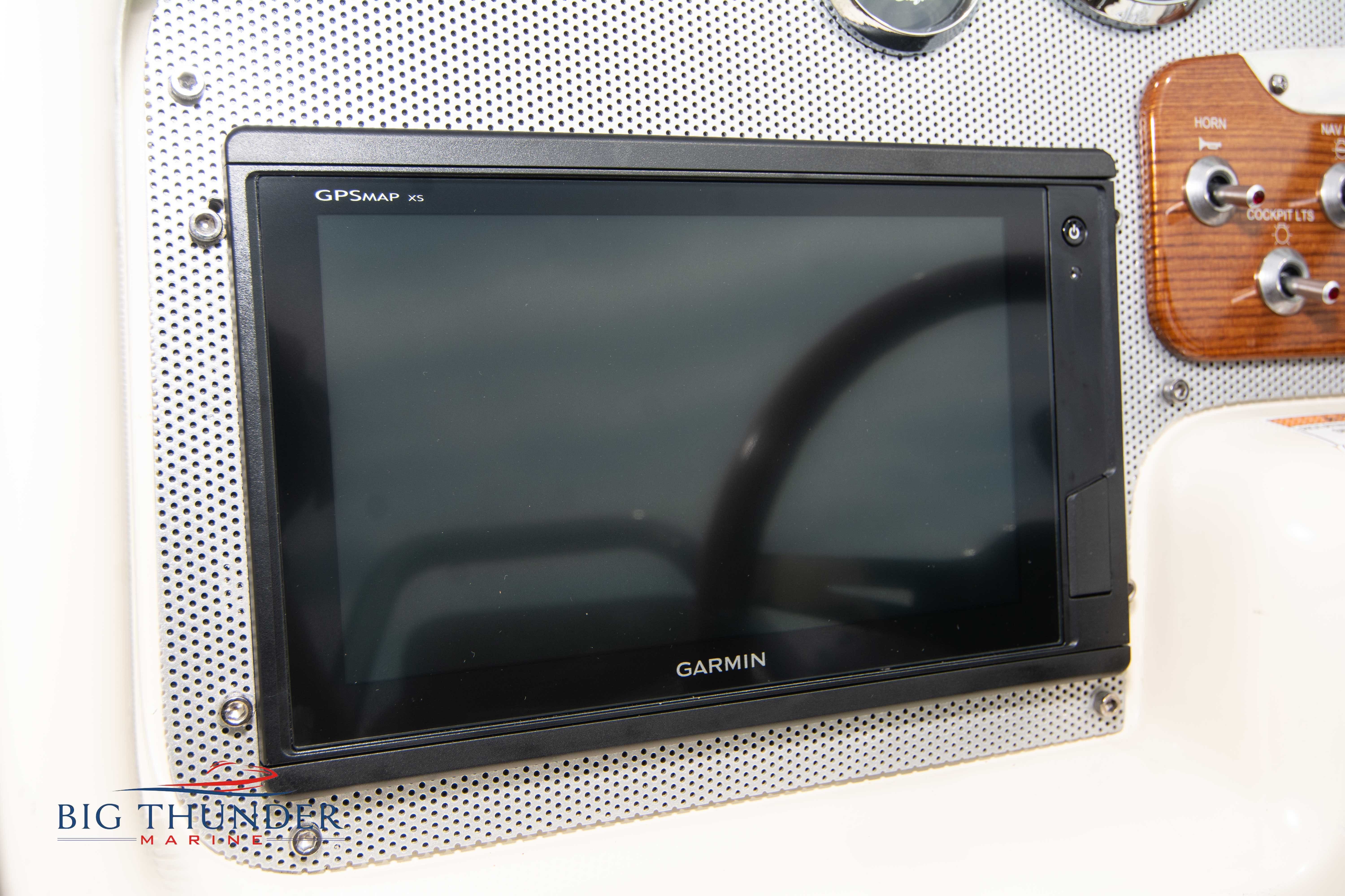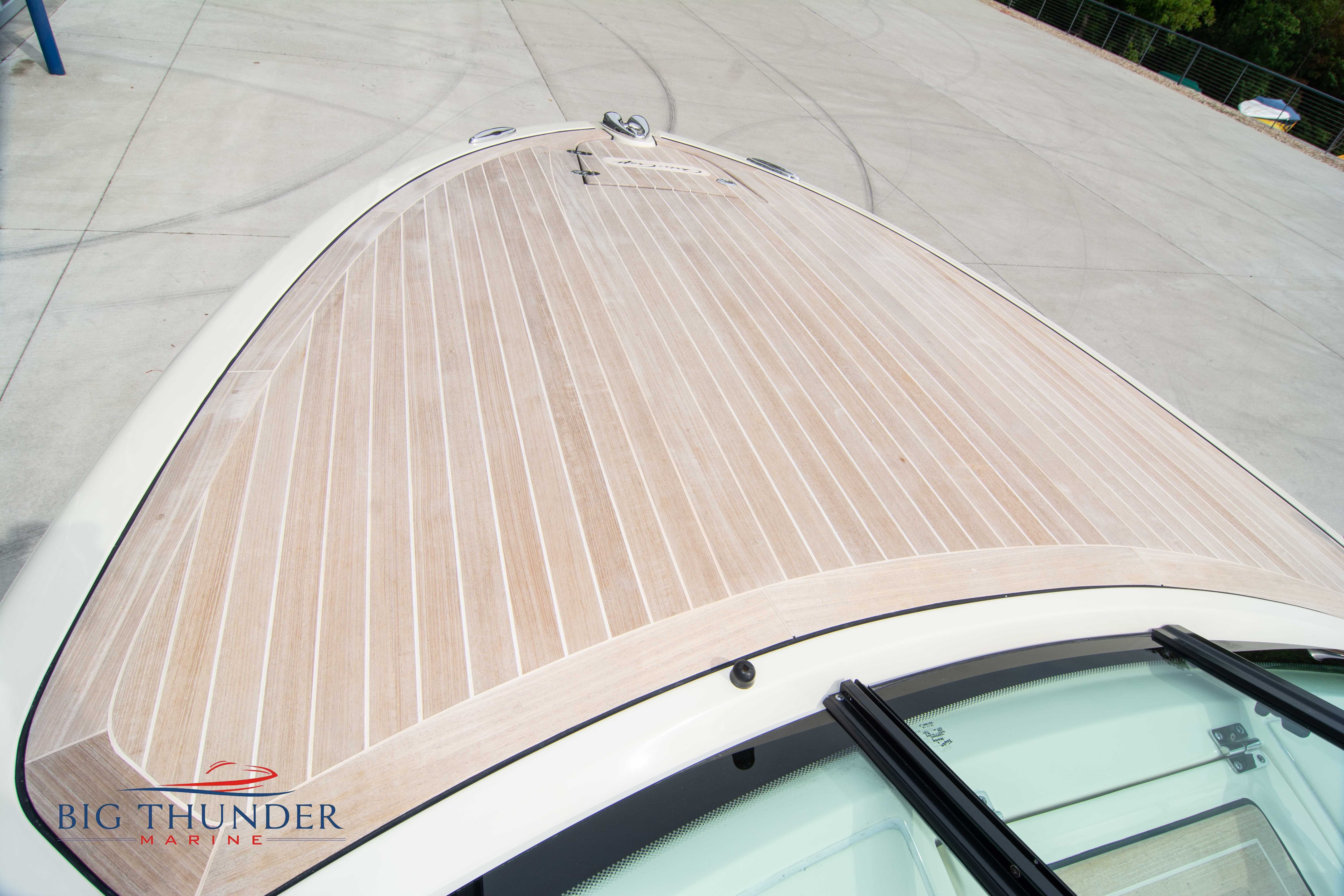 Volvo-Penta 6.0L DP FWC (33.3 hours on meter) Volvo Duoprop drive. Digital throttle & shift w/ Trim Assist. Trim tabs. Volvo engine monitoring system. Captain’s call exhaust. Auto fire extinguishing system. Shore power plug in. Dual batteries w/ switch. Transom shower. Walk-thru transom. Bimini top. Heritage teak trim pkg. Port & starboard side fold down cockpit tables. Pump out Porta Potti. Woven snap in cockpit flooring. Premium JL audio system w/ Fusion Bluetooth stereo. Interior courtesy lighting. Underwater lighting. Nav/dock lights. Speedo & tach w/ digital readouts. Volt meter, fuel gauge, trim gauge, & compass. Garmin GPSmap xs color touchscreen display/GPS. Bilge blower. Flip up bolsters. Windlass w/ line & chain. Mooring cover.