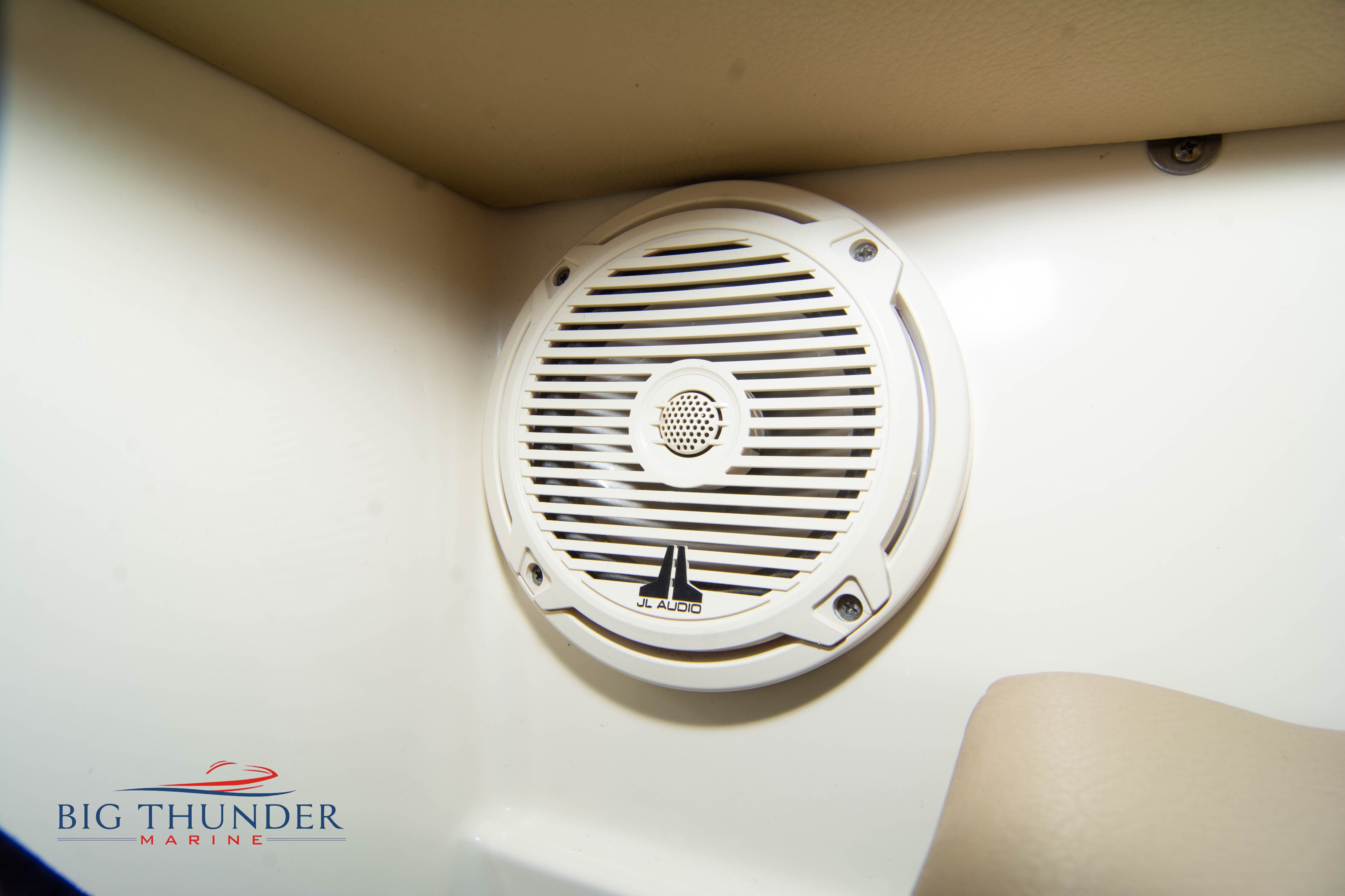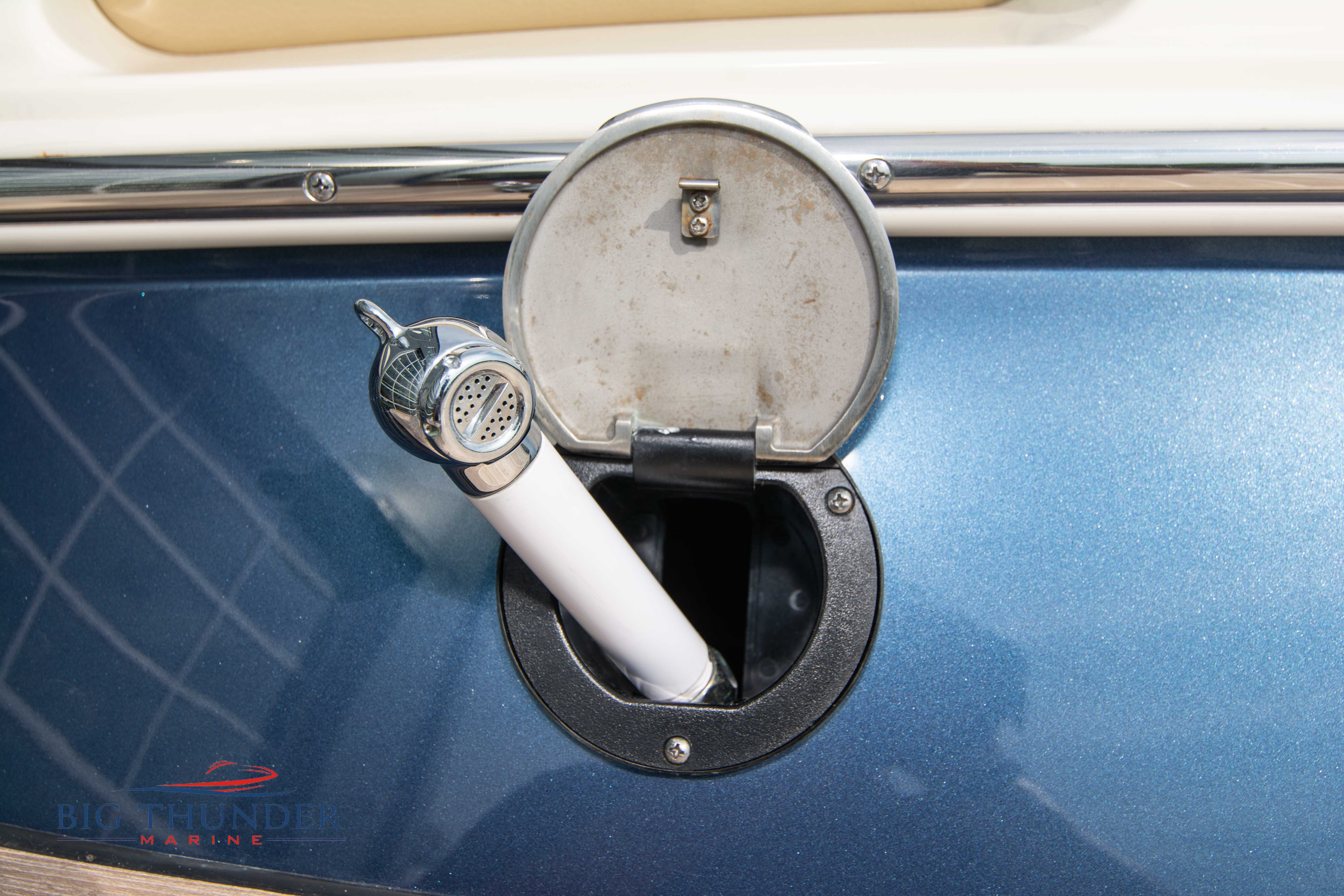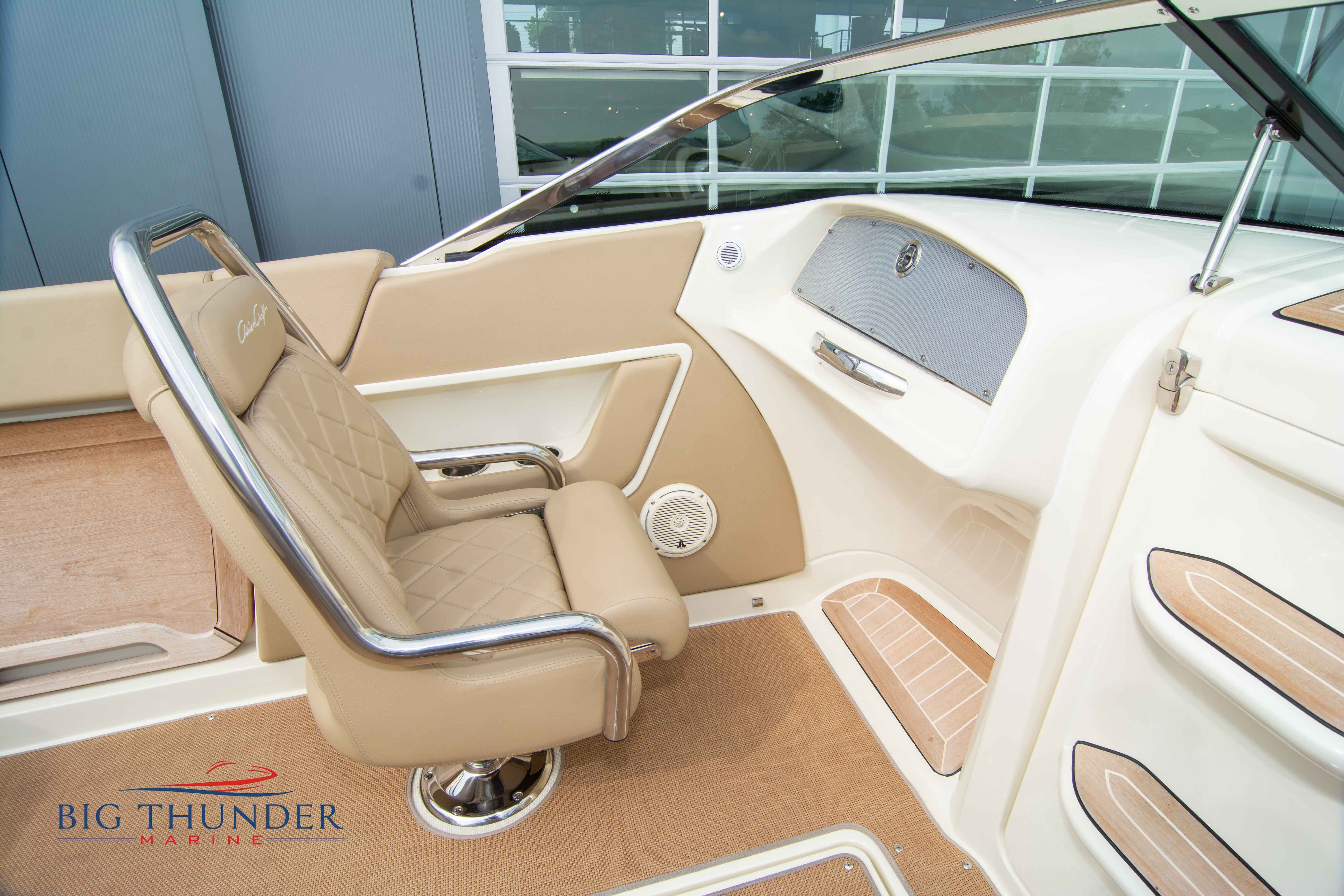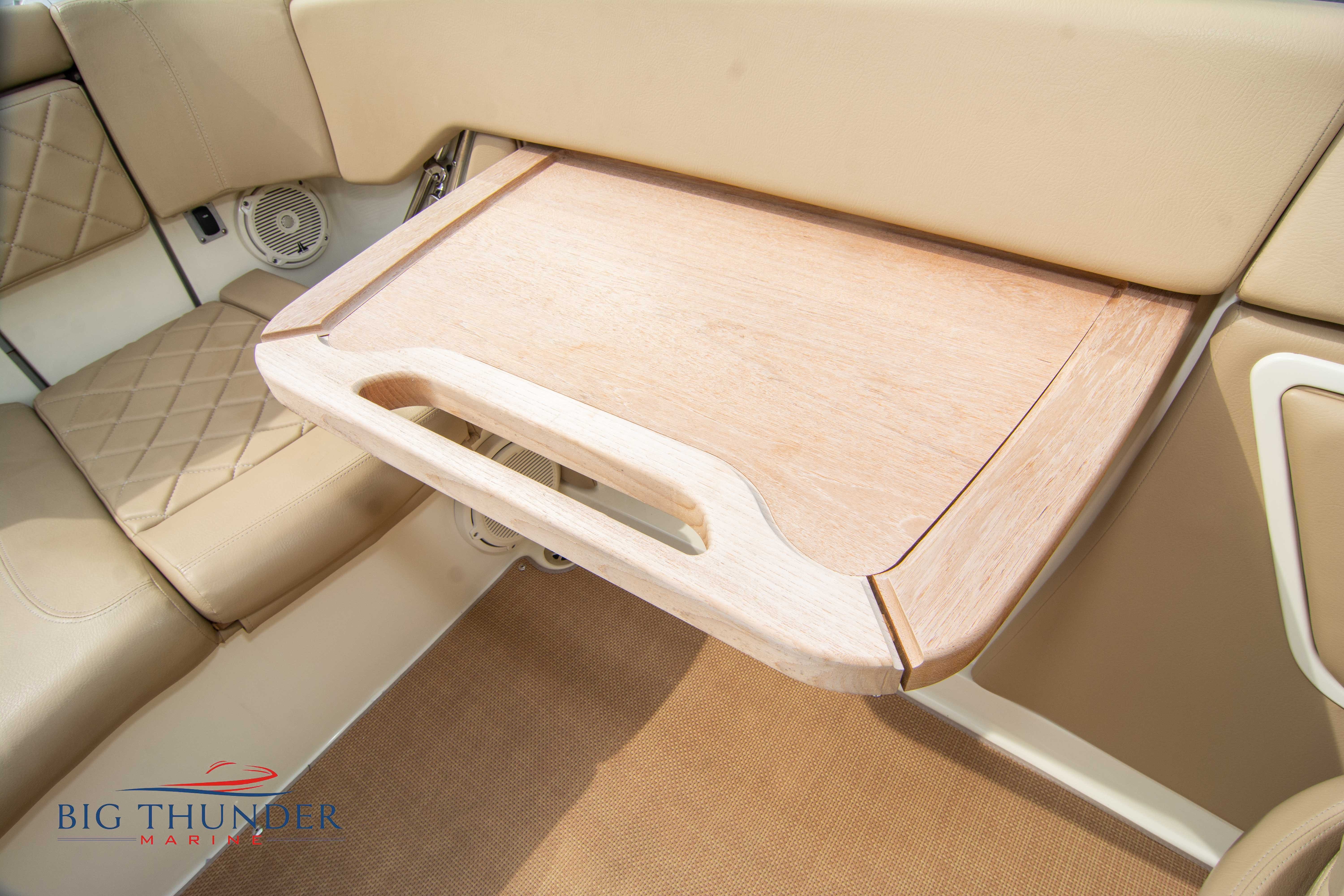 Volvo-Penta 6.0L DP FWC (33.3 hours on meter) Volvo Duoprop drive. Digital throttle & shift w/ Trim Assist. Trim tabs. Volvo engine monitoring system. Captain’s call exhaust. Auto fire extinguishing system. Shore power plug in. Dual batteries w/ switch. Transom shower. Walk-thru transom. Bimini top. Heritage teak trim pkg. Port & starboard side fold down cockpit tables. Pump out Porta Potti. Woven snap in cockpit flooring. Premium JL audio system w/ Fusion Bluetooth stereo. Interior courtesy lighting. Underwater lighting. Nav/dock lights. Speedo & tach w/ digital readouts. Volt meter, fuel gauge, trim gauge, & compass. Garmin GPSmap xs color touchscreen display/GPS. Bilge blower. Flip up bolsters. Windlass w/ line & chain. Mooring cover.