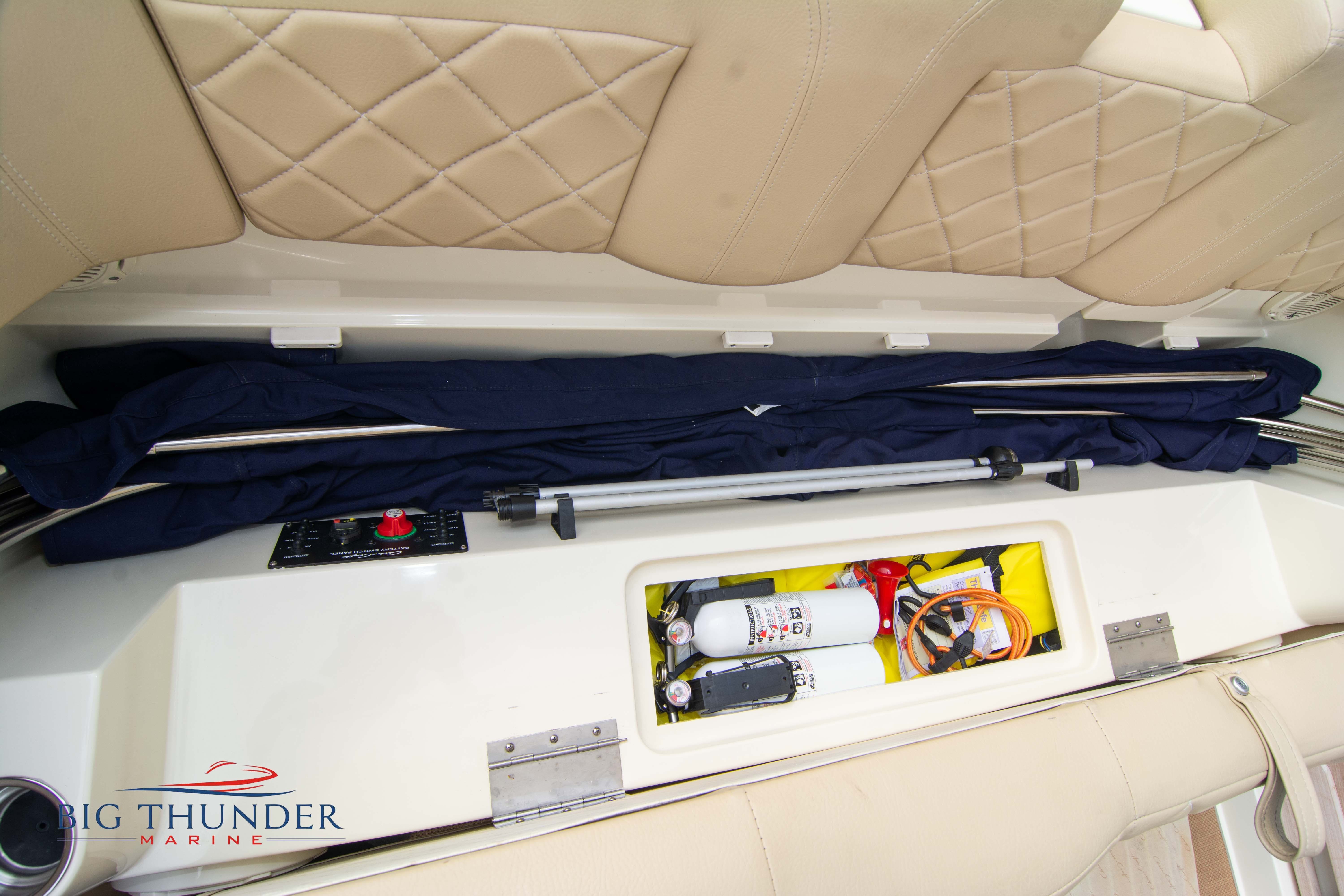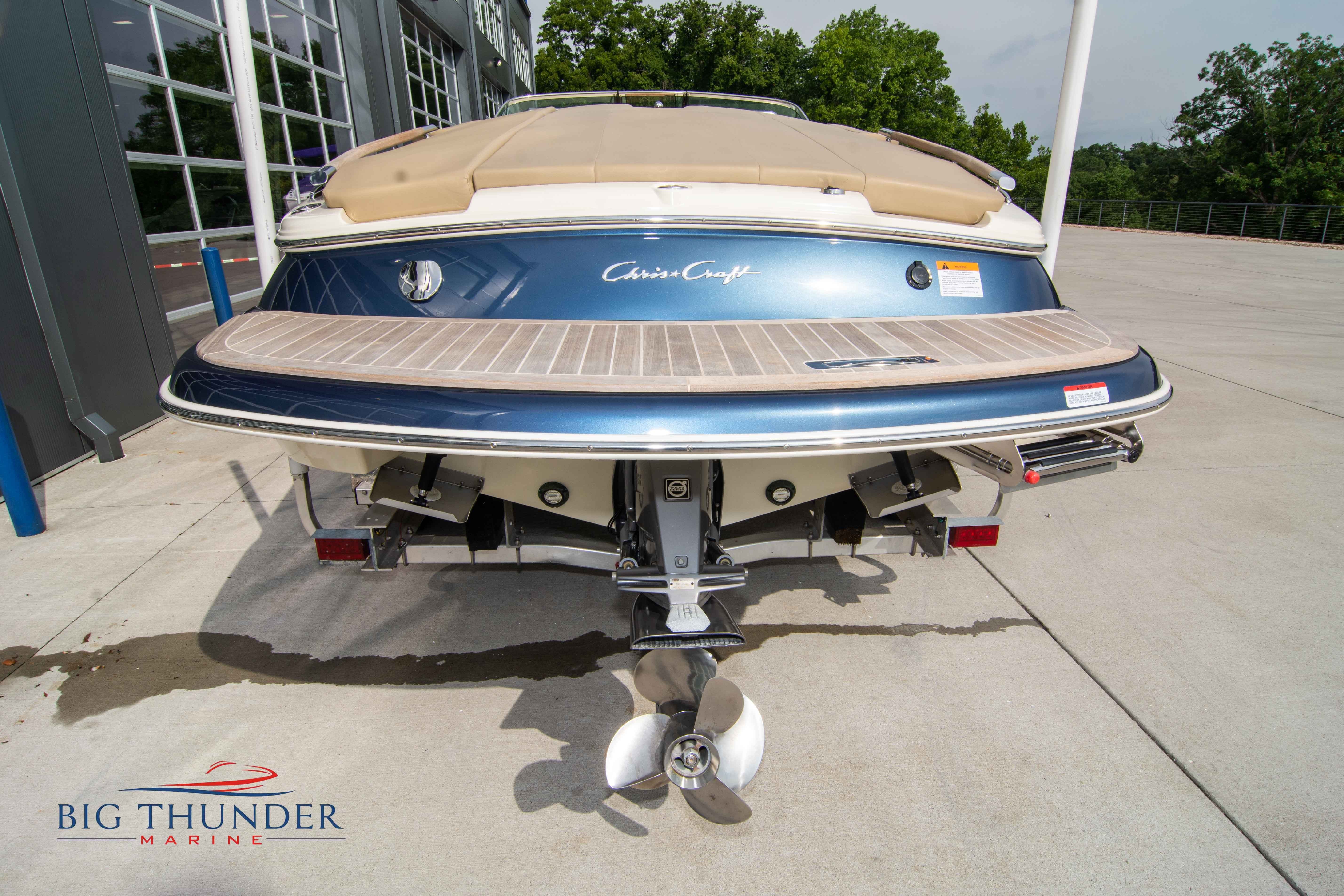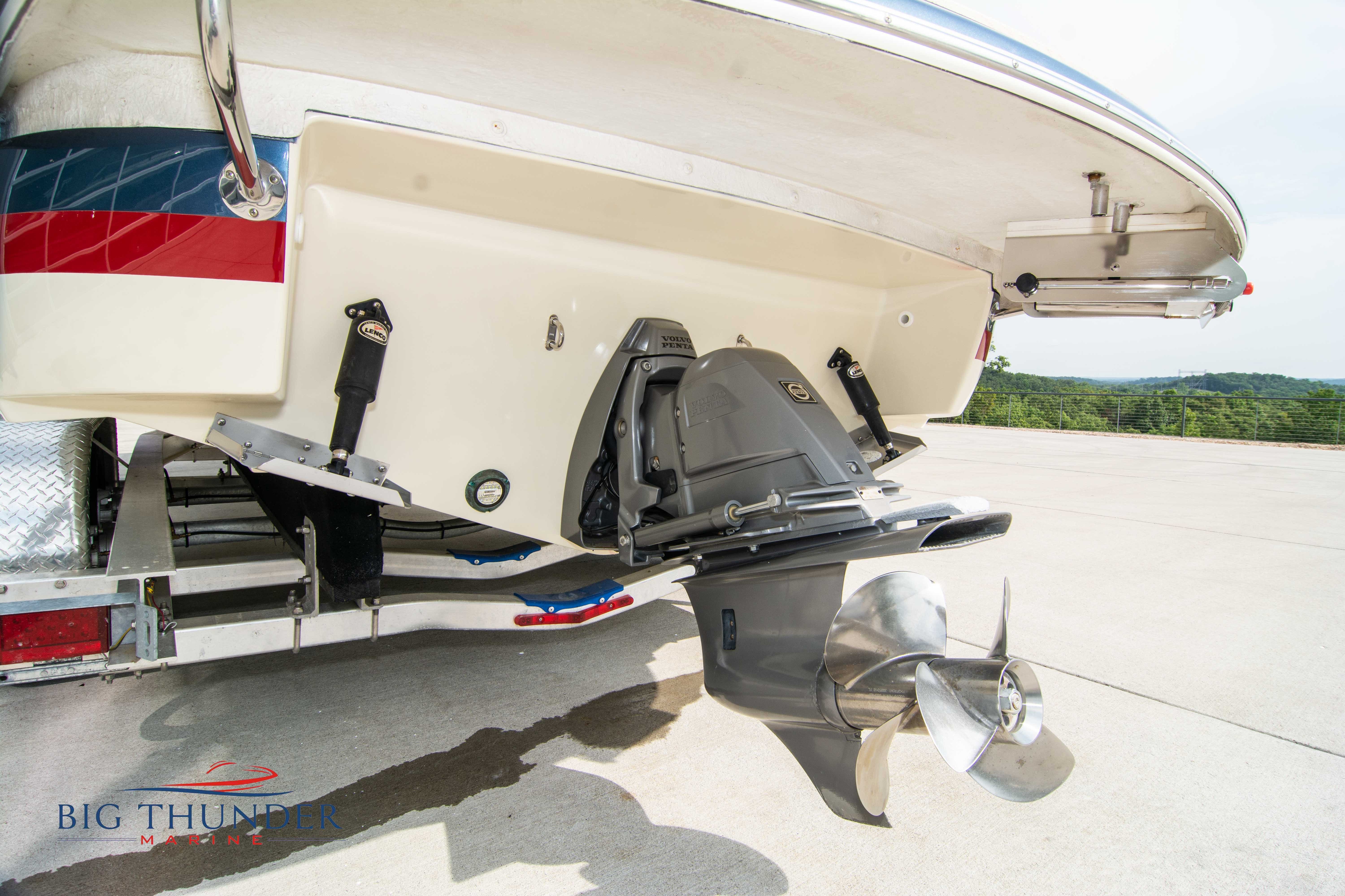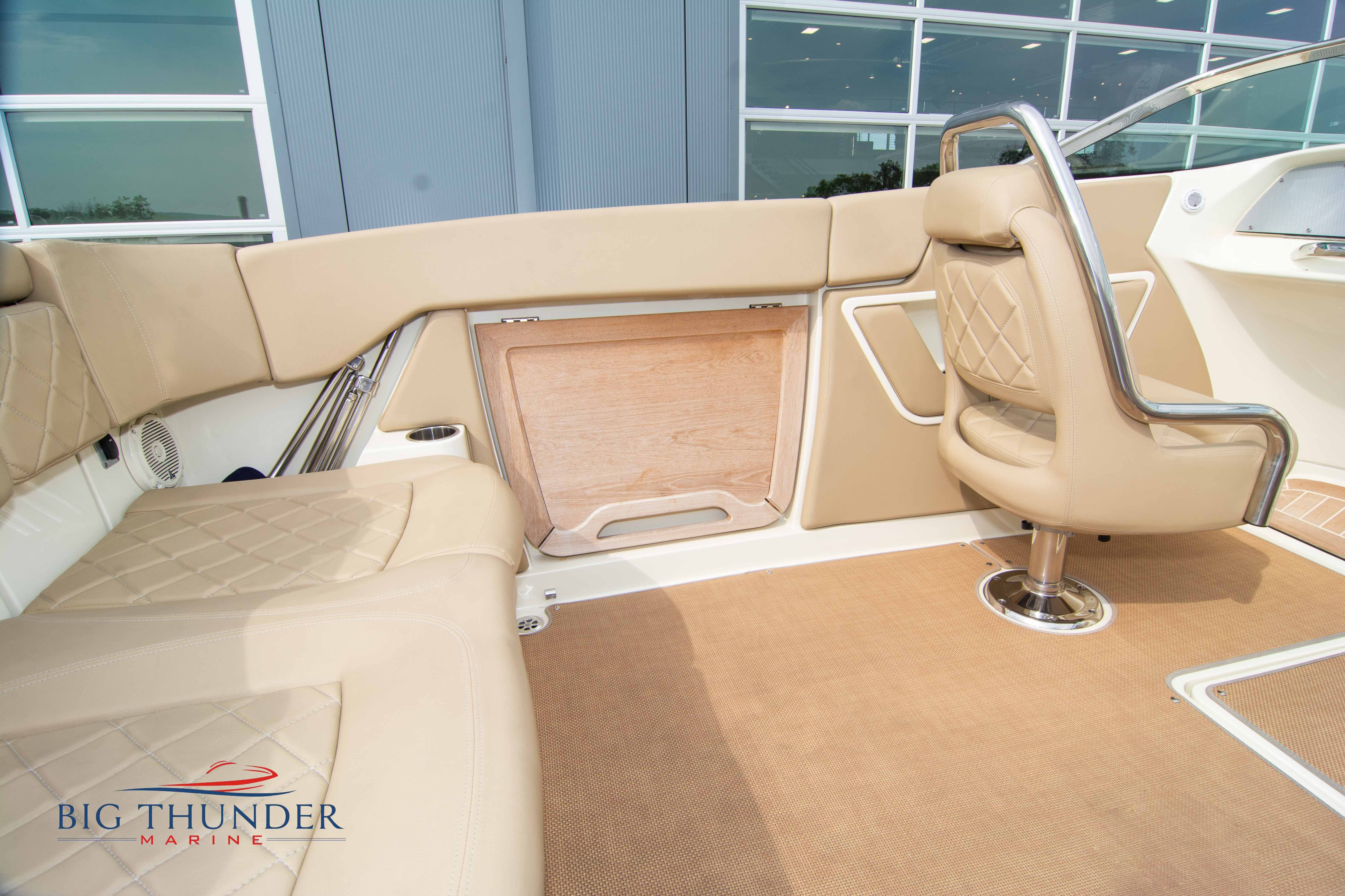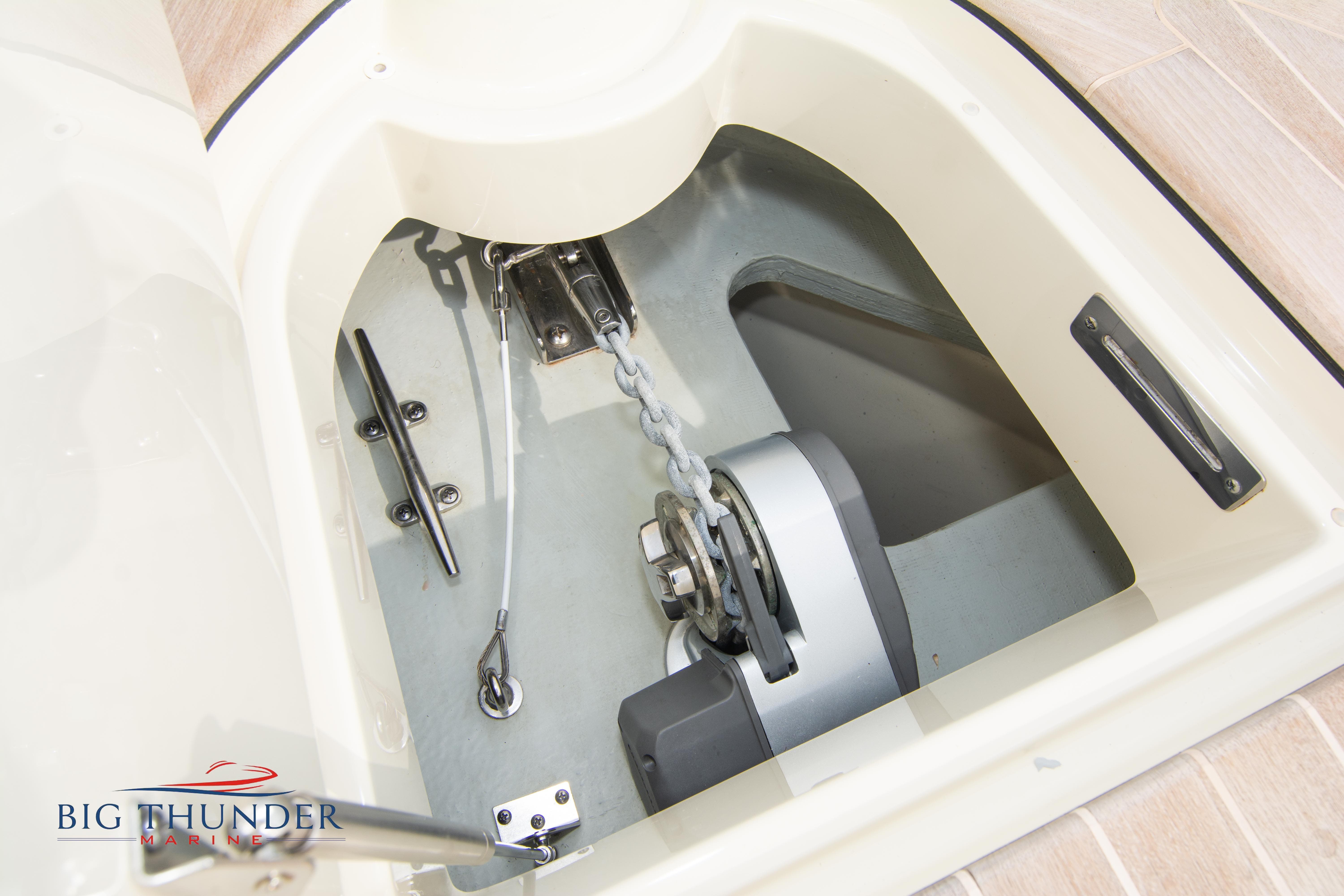 Volvo-Penta 6.0L DP FWC (33.3 hours on meter) Volvo Duoprop drive. Digital throttle & shift w/ Trim Assist. Trim tabs. Volvo engine monitoring system. Captain’s call exhaust. Auto fire extinguishing system. Shore power plug in. Dual batteries w/ switch. Transom shower. Walk-thru transom. Bimini top. Heritage teak trim pkg. Port & starboard side fold down cockpit tables. Pump out Porta Potti. Woven snap in cockpit flooring. Premium JL audio system w/ Fusion Bluetooth stereo. Interior courtesy lighting. Underwater lighting. Nav/dock lights. Speedo & tach w/ digital readouts. Volt meter, fuel gauge, trim gauge, & compass. Garmin GPSmap xs color touchscreen display/GPS. Bilge blower. Flip up bolsters. Windlass w/ line & chain. Mooring cover.