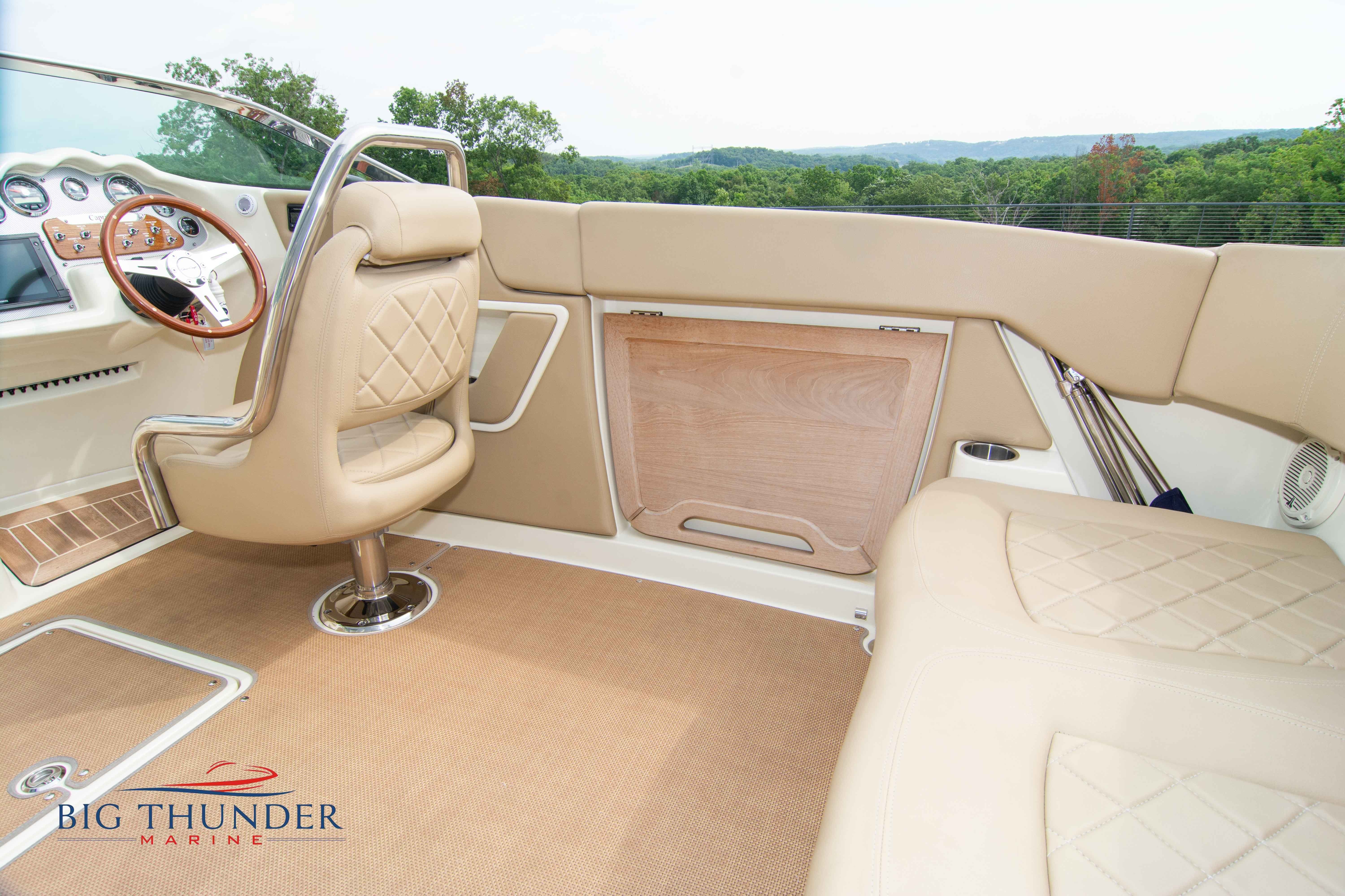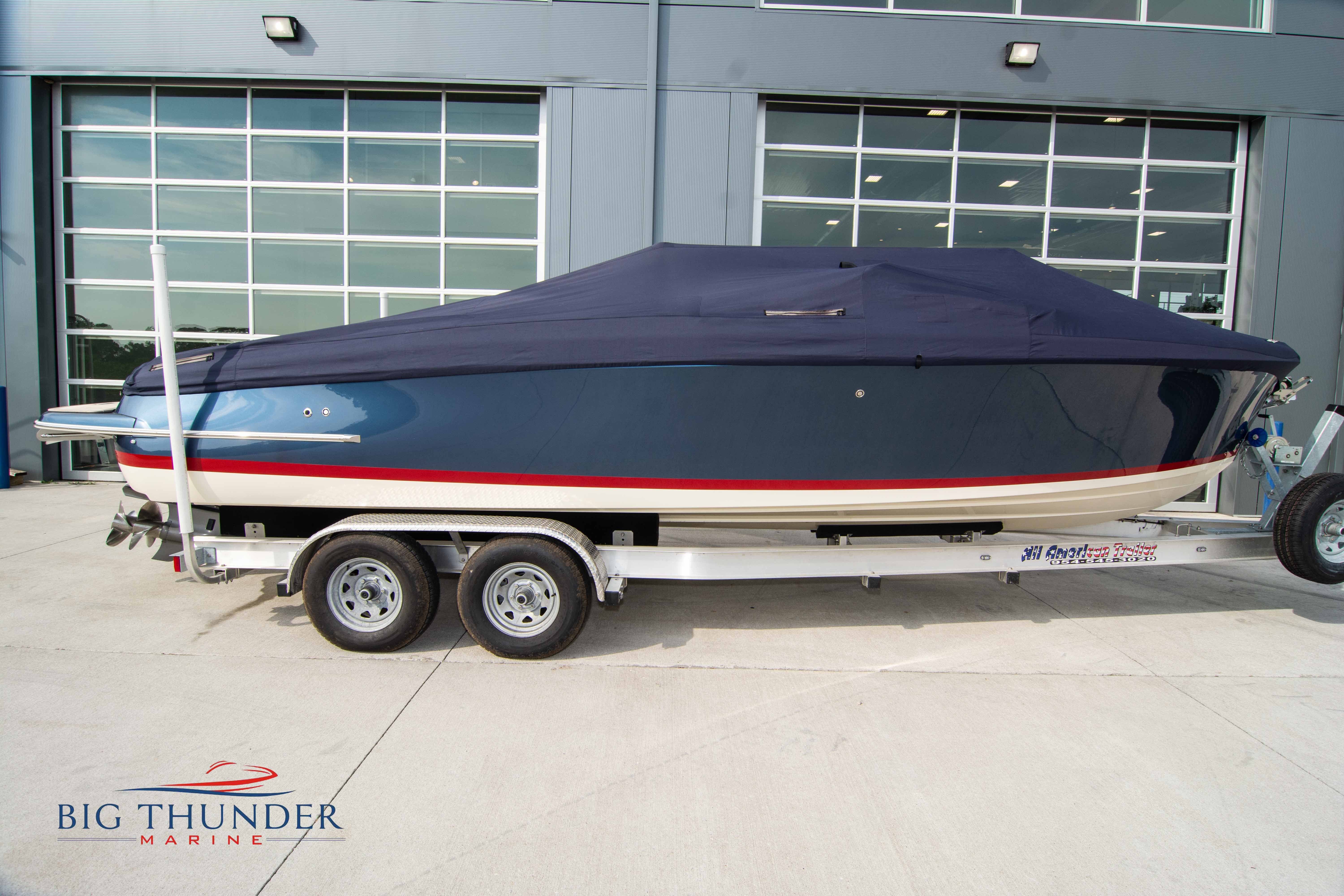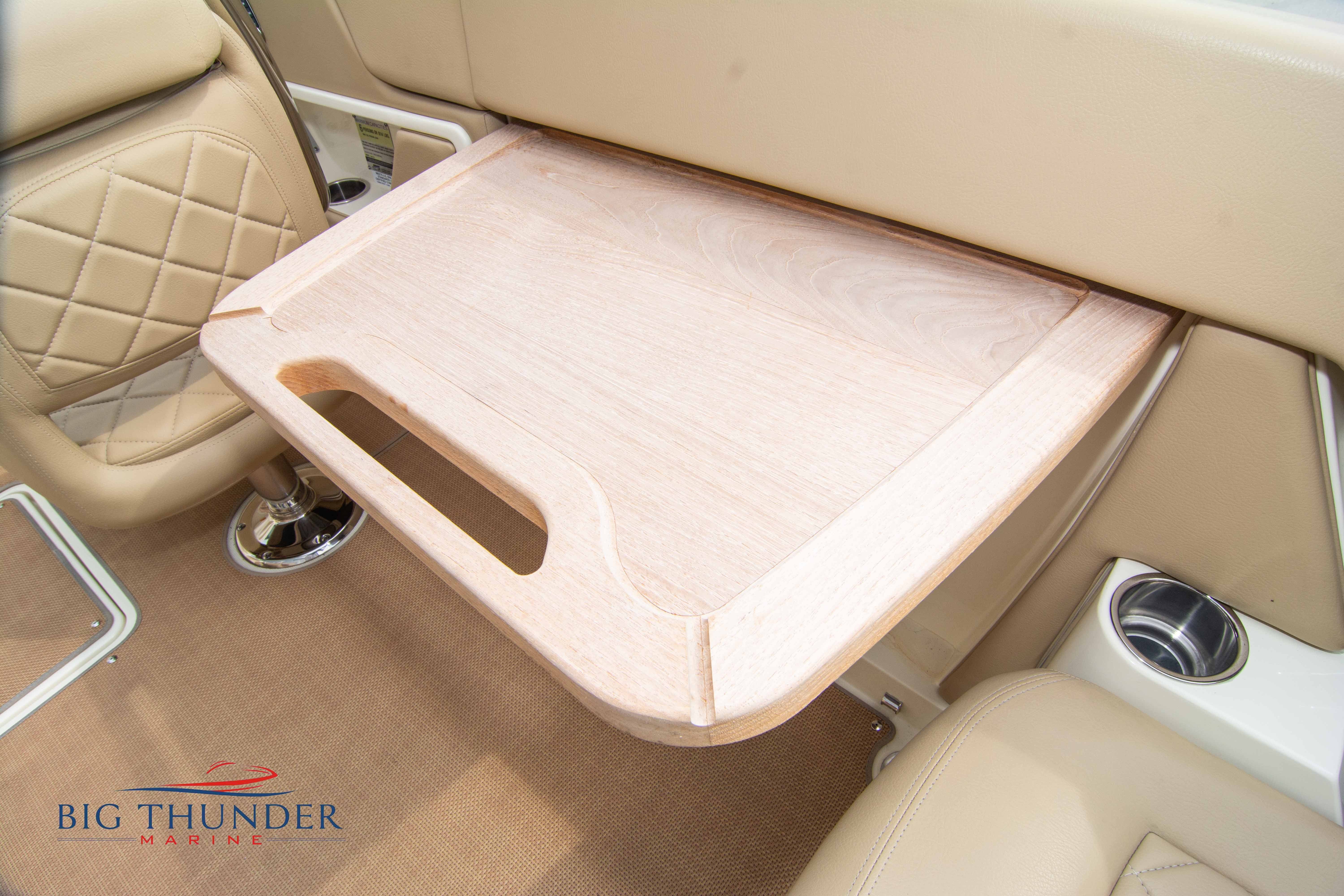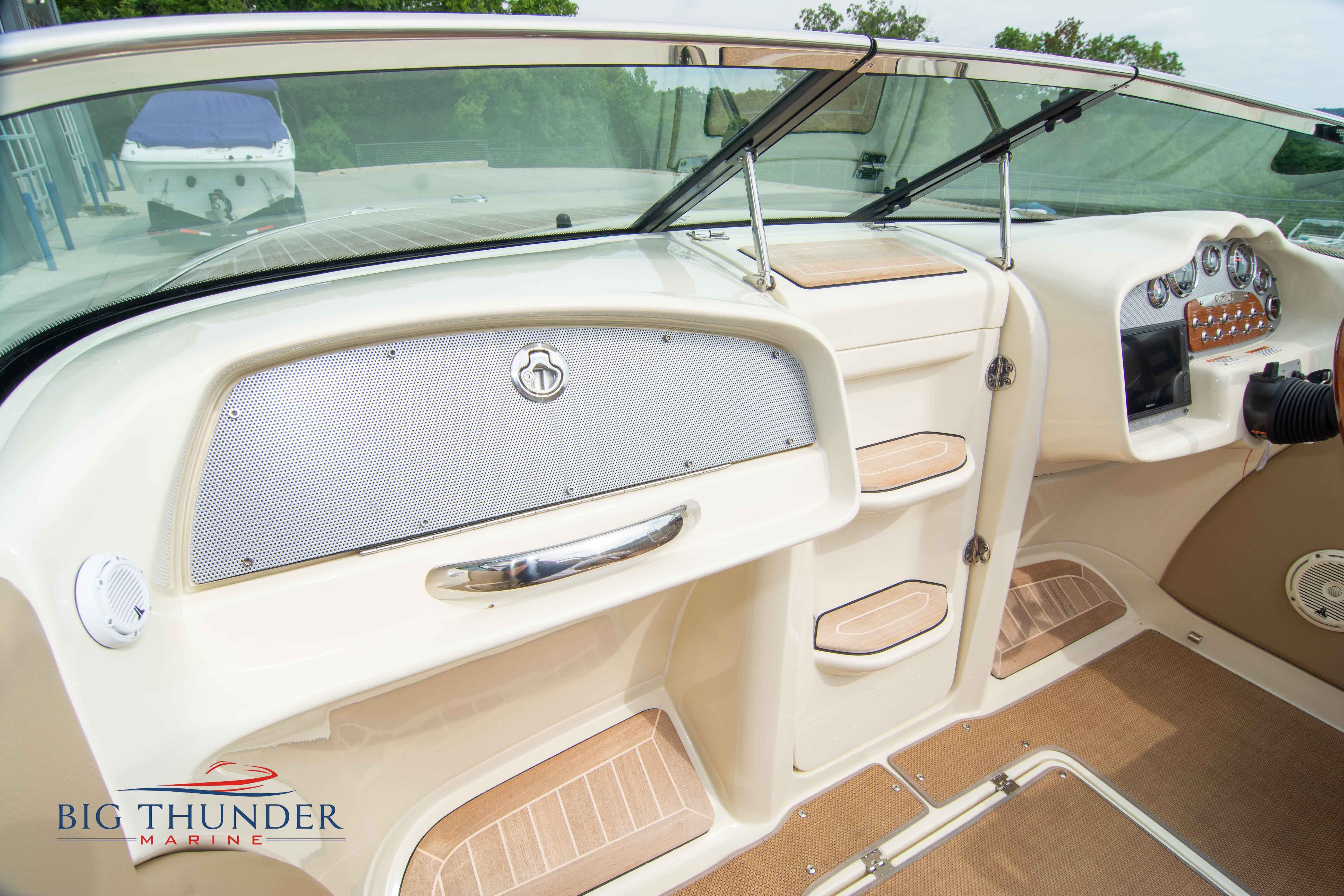 Volvo-Penta 6.0L DP FWC (33.3 hours on meter) Volvo Duoprop drive. Digital throttle & shift w/ Trim Assist. Trim tabs. Volvo engine monitoring system. Captain’s call exhaust. Auto fire extinguishing system. Shore power plug in. Dual batteries w/ switch. Transom shower. Walk-thru transom. Bimini top. Heritage teak trim pkg. Port & starboard side fold down cockpit tables. Pump out Porta Potti. Woven snap in cockpit flooring. Premium JL audio system w/ Fusion Bluetooth stereo. Interior courtesy lighting. Underwater lighting. Nav/dock lights. Speedo & tach w/ digital readouts. Volt meter, fuel gauge, trim gauge, & compass. Garmin GPSmap xs color touchscreen display/GPS. Bilge blower. Flip up bolsters. Windlass w/ line & chain. Mooring cover.
