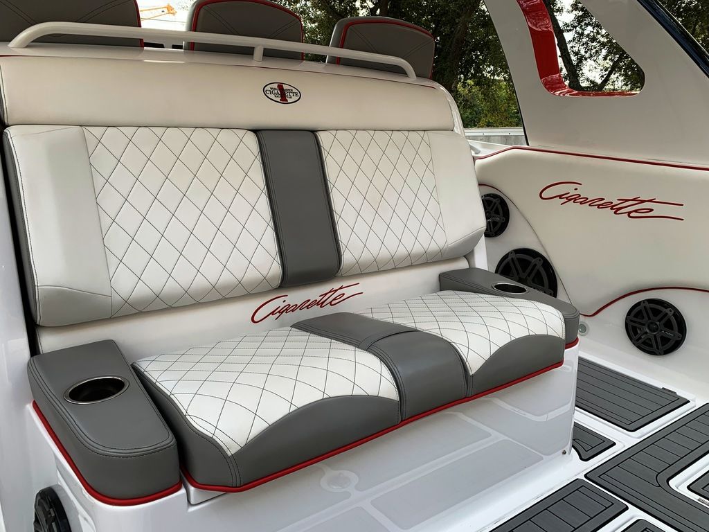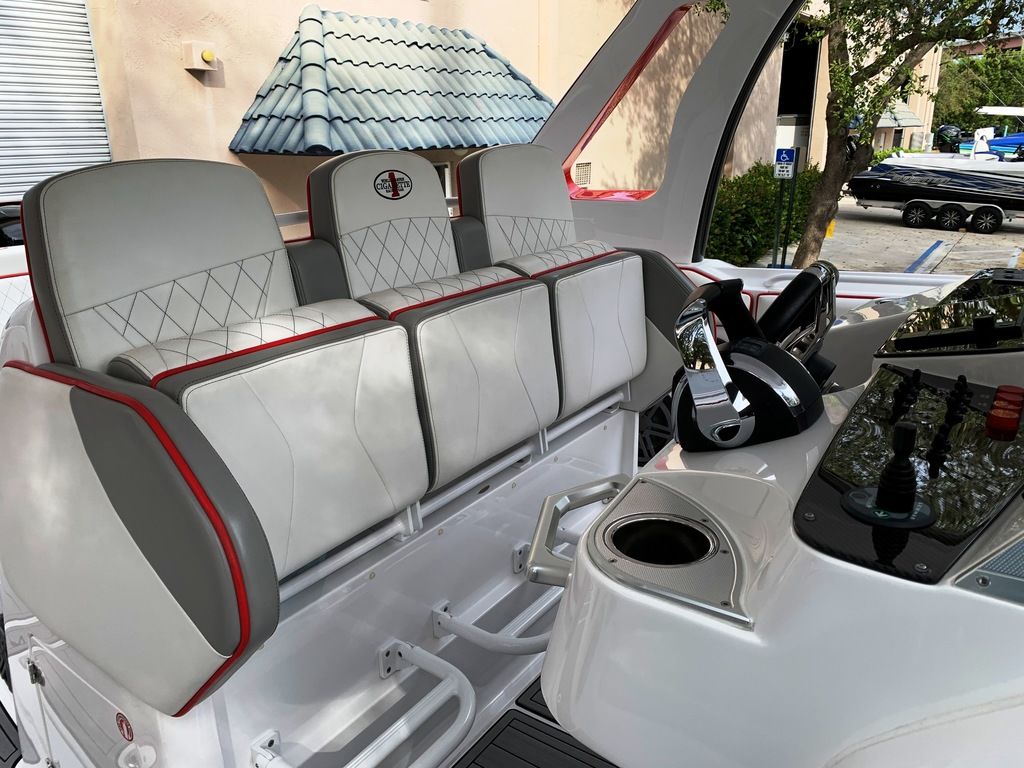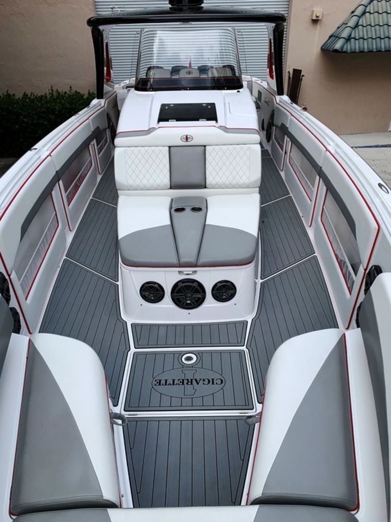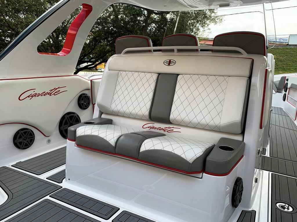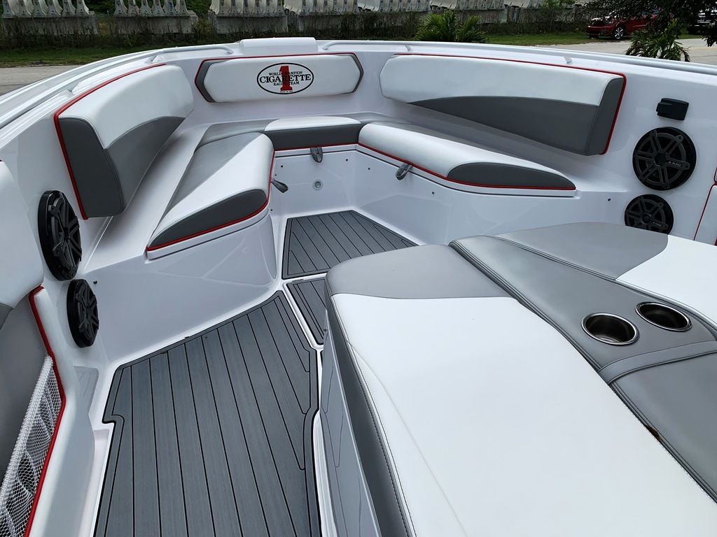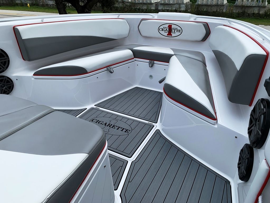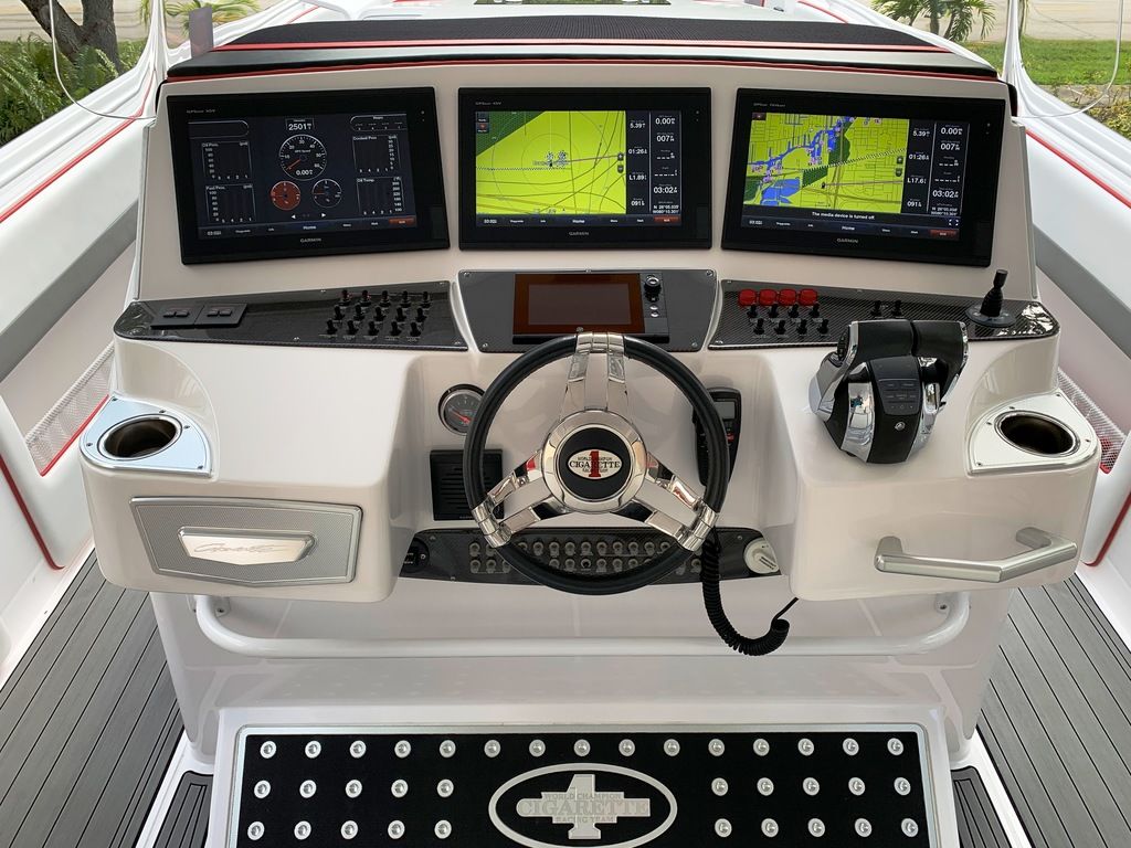 CIGARETTE 180° PANORAMIC HARDTOP, STARBOARD SIDE DIVE DOOR WITH SAFETY LATCH AND RETRACTABLE STAINLESS STEEL HANDLES AND LADDER, (1) 15” HIGH DEFINITION TOUCH SCREEN GARMIN 8215, (2) 12” HIGH DEFINITION TOUCH SCREEN GARMIN 8212 , GARMIN HIGH DEFINITION DEPTH FINDER, GARMIN VHF 300 RADIO WITH REMOTE HANDSET, 7” MERCURY MARINE VESSELVIEW FOR ENGINE INFORMATION AND DIAGNOSTICS, PREMIUM AUDIO SYSTEM BY JL AUDIO, BLUETOOTH WITH GARMIN INTERFACE, (12) DYNAMIC AMBIENT MOOD LIGHTS IN COCKPIT AND HARDTOP, (4) UNDERWATER LED LIGHTS, DASH CONTROLLED BATTERY SWITCHES, CARBON FIBER DASH PANELS, FORWARD CIRCULAR SEATING WITH UNDER-SEAT STORAGE, OVERSIZED FORWARD FACING SUN LOUNGE, HELM SEAT WITH INDIVIDUAL FOOTRESTS & REAR FACING SEATS WITH BUILT IN INSULATED COOLER, MULTI-PASSENGER AFT TRANSOM SEATING, BESPOKE DIAMOND PATTERN STITCHING, CNC MACHINED BILLET GLOVE BOX, CNC MACHINED BILLET TRIM, FRESHWATER TRANSOM SHOWER, CUP HOLDERS THROUGHOUT, GRAB BARS THROUGHOUT, POWDER COATED GRAB RAILS, AIRCRAFT GRADE HARD COATED WINDSHIELD, STAINLESS STEEL DECK HARDWARE, (2) DISTRIBUTED ON DEMAND BATTERY CHARGERS, MERCURY MARINE PUSH BUTTON START, 30 AMP SHORE POWER INLET, GENERATOR AND A/C. PAINT BY PERFORMANCE BOAT CENTER.