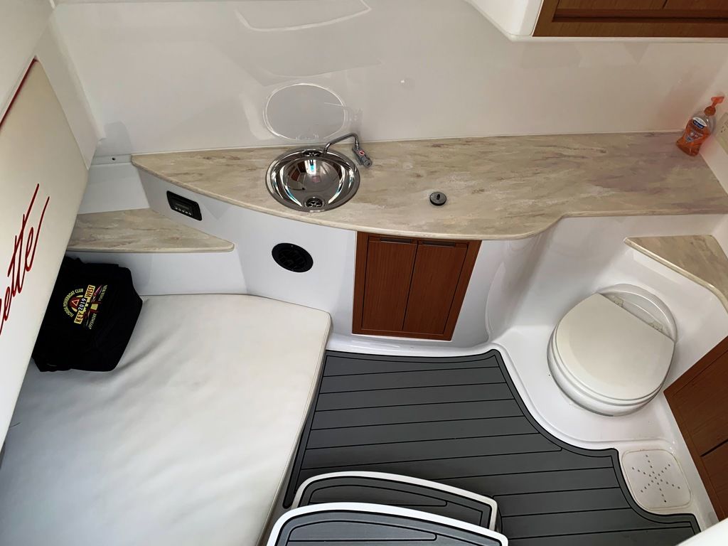 CNC CUT CABINETS IN MATTE CHERRY FINISH, CNC CUT CORAIN COUNTERTOPS, TWO PASSENGER SLEEPING BERTH, ELECTRIC HEAD WITH MACERATOR AND HOLDING TANK, STAINLESS STEEL FRESHWATER SINK, LED LIGHTING, POLISHED TOWEL AND TOILET PAPER HOLDERS