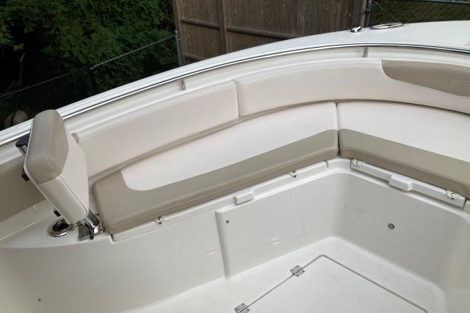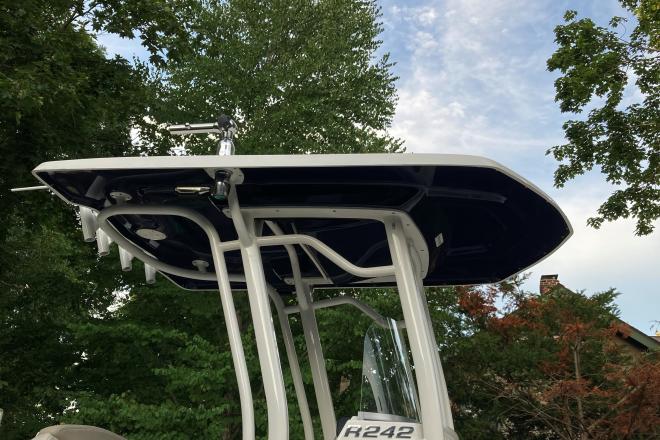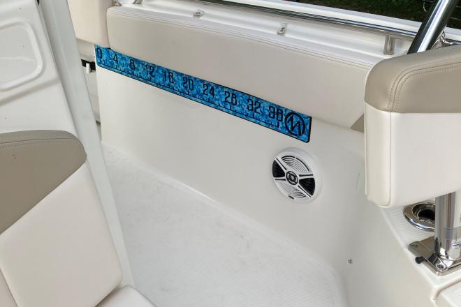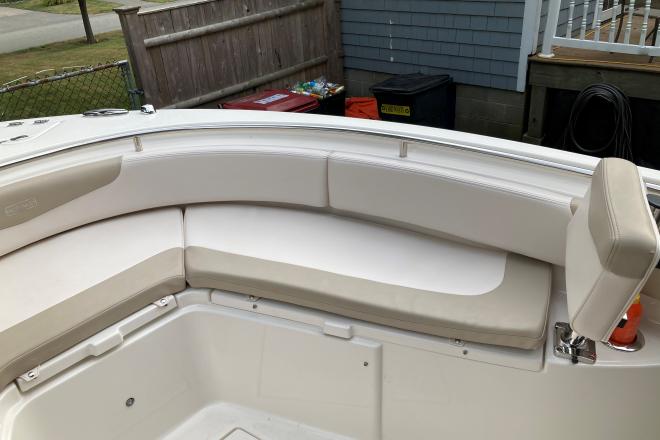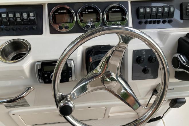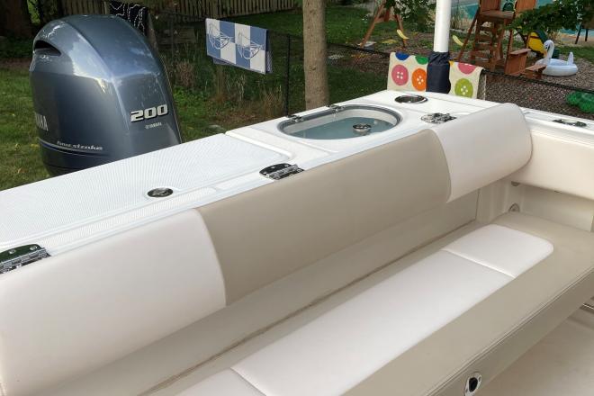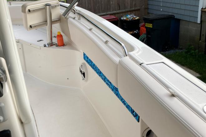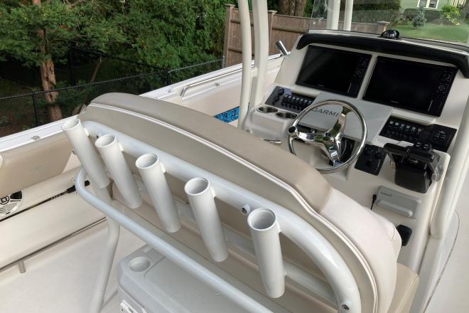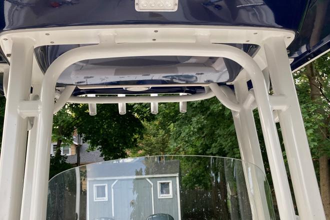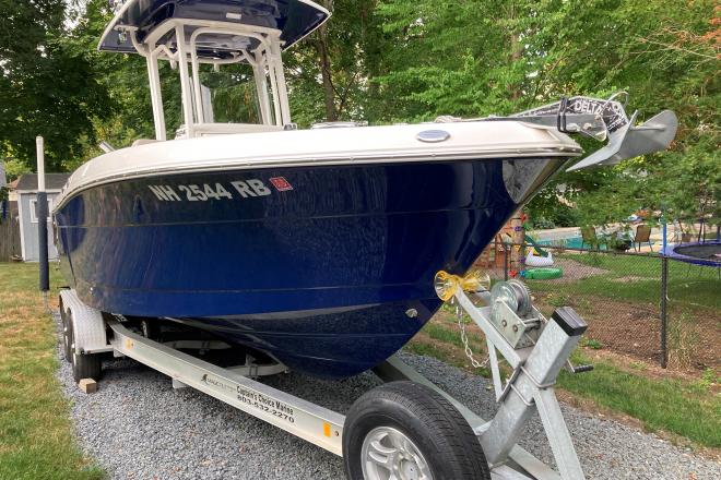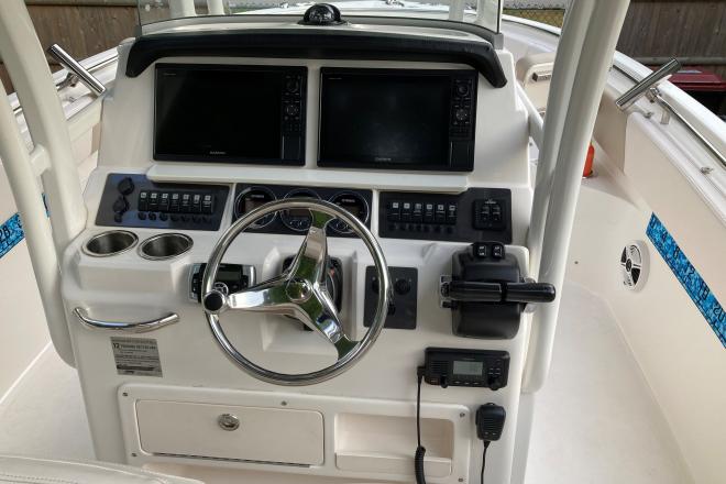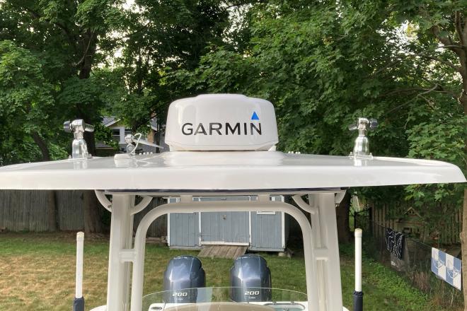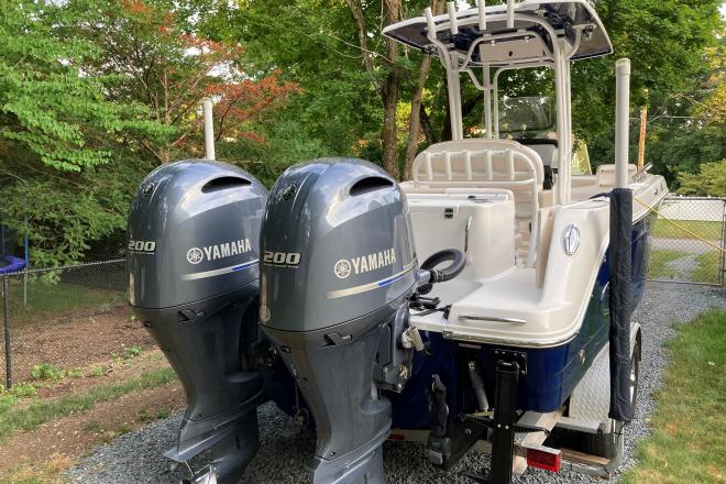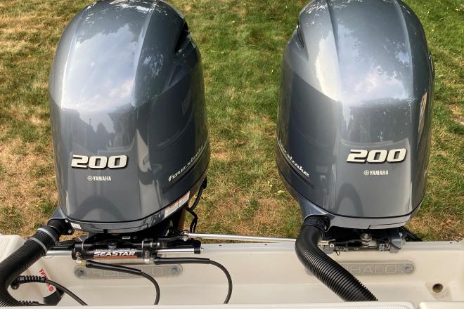 Dark blue hull with Robalo swoosh, no bottom paint. Garmin VHF with antenna, Fathom 18 Radar with dual 12inch Garmin screens sideview, downview, chirp. Fresh water and raw water. Taco outrigger mounts, 4 speaker Clarion stereo, 23 rod holders, 2 live wells, forward opening center console with portable toilet, spreader lights, underwater lights, dual Yamaha 200hp 4 strokes with 342 hours. Ttop with storage compartment, slide cooler under leaning post with bolsters. 4 combination rod holderscup holders, 2 Lee’s swivel rod holders with backing plate. Great boat, cuts through chop like no other with the trim tabs adjusted correctly. Trailer is a MagicTilt dual axle, dual disc brake bunk trailer.Turbo swing on back of boat for skiing or tubing.Change in life status, my wife wants to buy a cottage Please let me know if you are interested, $99,900 or best reasonable offer.
