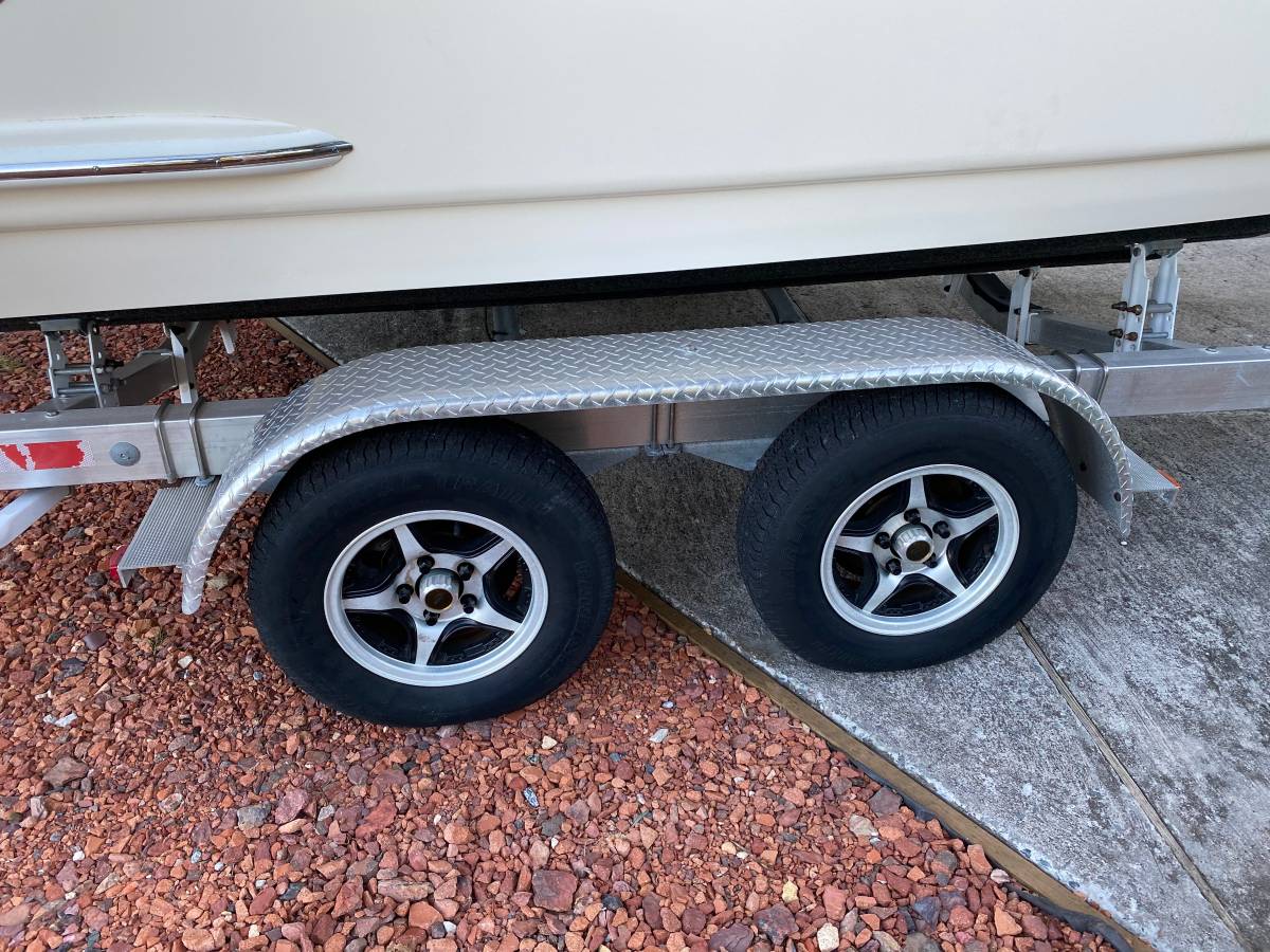 Custom Magic Tilt aluminum trailer with double bunks, stainless hardware, aluminum wheels, aluminum treadplate fenders, dual hydraulic surge brakes, and powder coated metal.