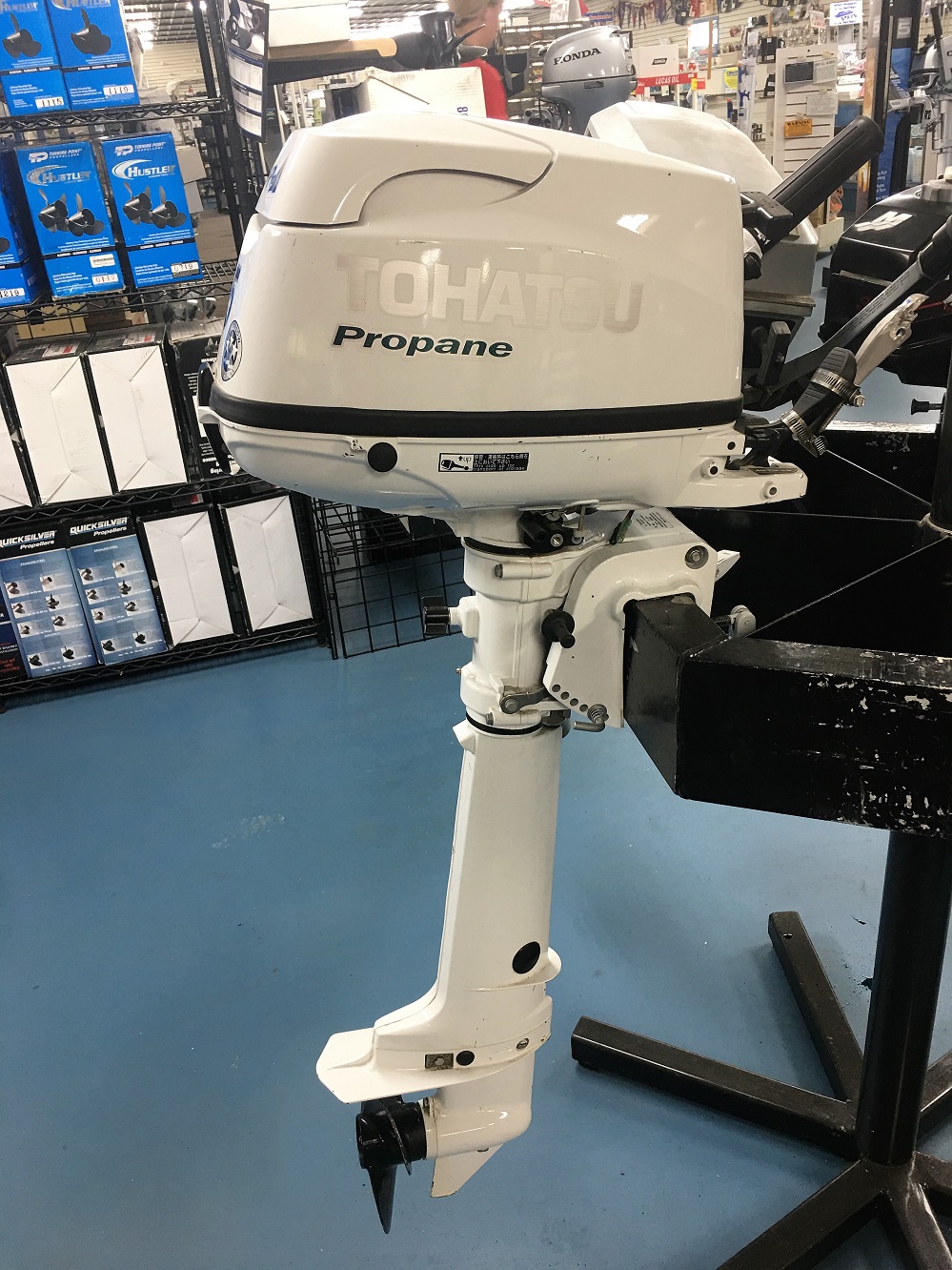 2017 Tohatsu 5 HP outboard engine, propane gas, extra long shaft. Used less than 15 hrs, in very good condition, working well with a clean prop.