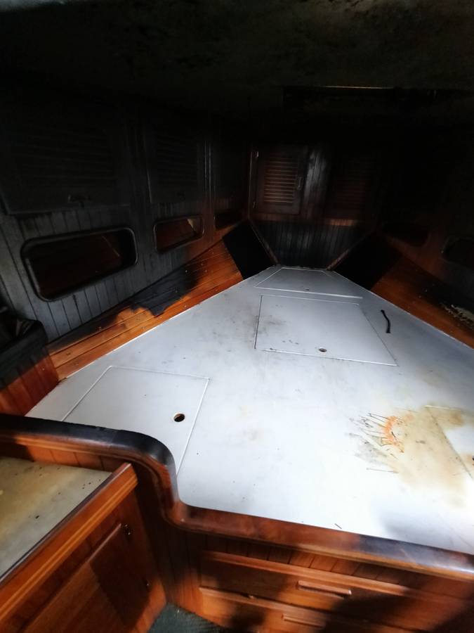 It was recent (August 21st) fire in forecabin (I left a switched-on heater). There is about 5% of forecabin interior (teak planking) is damaged by fire, the rest of the forecabin interior as well as other areas (salon, toilet, galley, machine room) are not affected by the fire but by smoke only. No structural (fiberglass) damage, the teak interior only is suffered. The engine (ISUZU diesel, 95 hours) is not damaged and in fully work conditions; the boat can be motored at any place. All sails were on the deck and were not affected by the fire. Three batteries (one cranking, two - house) as well as a charger work normal. All electric lines (DC and AC) are workable. The boat is 100% operable and you can go to Hawaii next day after purchase if you are OK with smell inside.