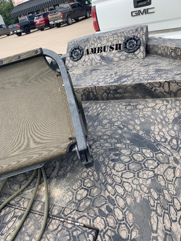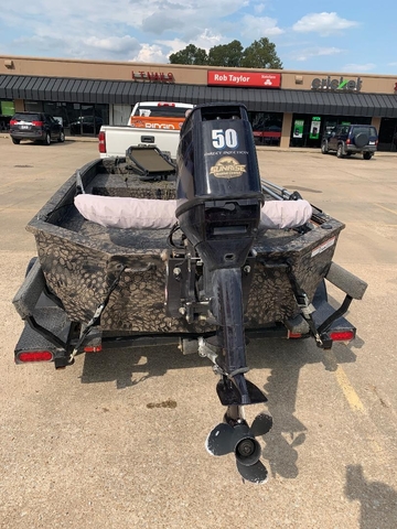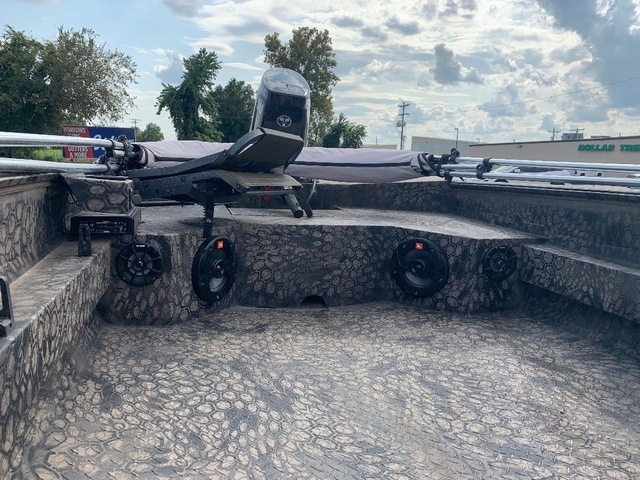 656 Ambush 50 HP Tohatsu w/power tilt-trim 2- 8 inch JBL Marine subs 4- 4 inch Kicker subs 1500 watt Rockville BT Marine amp Interior LEDs Light bars on the front.