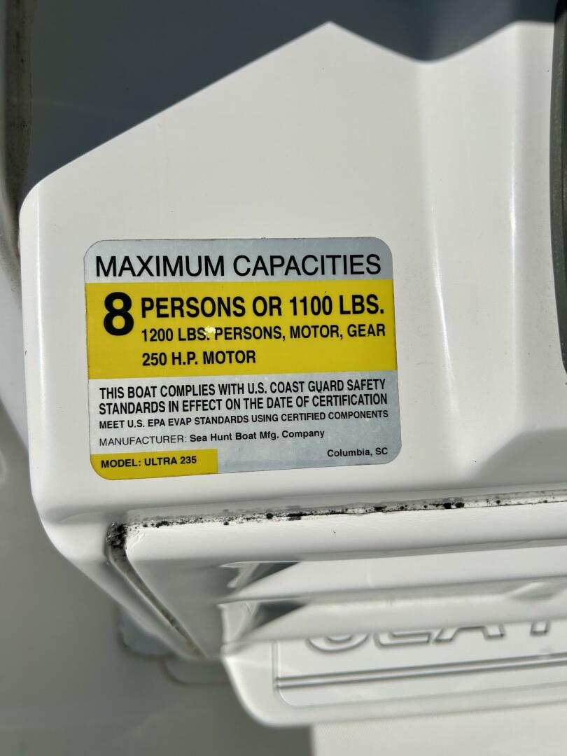 2018 Sea Hunt 235 SE with a Yamaha 250 Four Stroke. Loaded with options including, Fiberglass Hard Top, Stainless Steel Yamaha Prop, Underwater Lights, Trim Tabs, Dive Door with Stainless Steel Ladder, Garmin GPS Fish Finder, Garmin VHF Radio, Stereo with Bluetooth, Flood Lights and full cover. Trailer just serviced and included. The helm is equipped with a 12" Garmin display, delivering clear visuals and advanced features like sonar and chart plotting. The built-in WiFi allows you to monitor and control your systems directly from your smartphone or tablet.Comfort is key with twin Captain's chairs that include folding bolsters. The center console has a well-organized tackle station with ample storage and rocket launchers. leaning postThe transom is well-equipped, featuring a fold-down bench, a 22-quart fish box with a cutting board, and an additional 27-gallon aerated live well. The side access door on the port side makes boarding and handling your catch easy!FEATURESPOWERYamaha F250Yamaha Reliance Series PropLEANING POSTAluminum Leaning Post w/ Captain's ChairsSTEERINGYamaha Hydraulic SteeringSeaStar Tilt HelmELECTRONICSSingle 12" Garmin GPSMAP 943xs Package w/ VHFYamaha Digital Command Link GaugesJL Audio Waterproof Stereo w/BluetoothWireless Phone ChargerUnderwater LED LightsINTERIORWhite InteriorCUSHIONSBow BackrestsBow BolstersBow CushionsCockpit BolstersTopsFiberglass T-Top with Mister SystemPowder Coat packageOtherSide Entry DOORNote: This vessel is sold as is and by the owner, without any promises regarding condition or maintenance. The above description is based on the information provided by the owner and the manufacturer. We recommend that prospective buyers perform a comprehensive inspection before purchase.