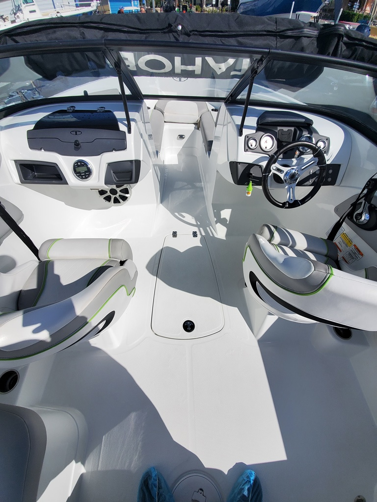 The Tahoe 700 perfectly marries style, comfort and convenience together in perfect harmony. So, grab your anchor from the bow compartment, and tie up in your favorite secluded cove. Drop the changing curtain from the optional Bimini top and change into your swimsuit. Adjust the sunpad backrest to your favorite position, and lay back in comfort. Or, if thats too slow for you, grab a wakeboard from the in-floor storage and have some fun.
