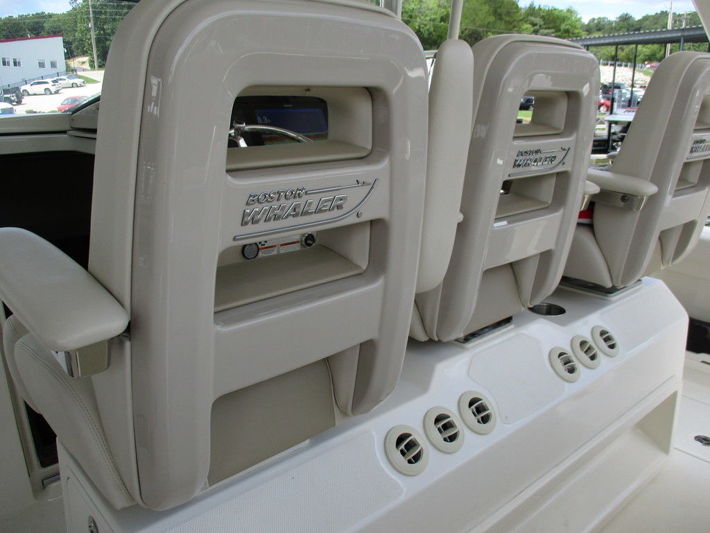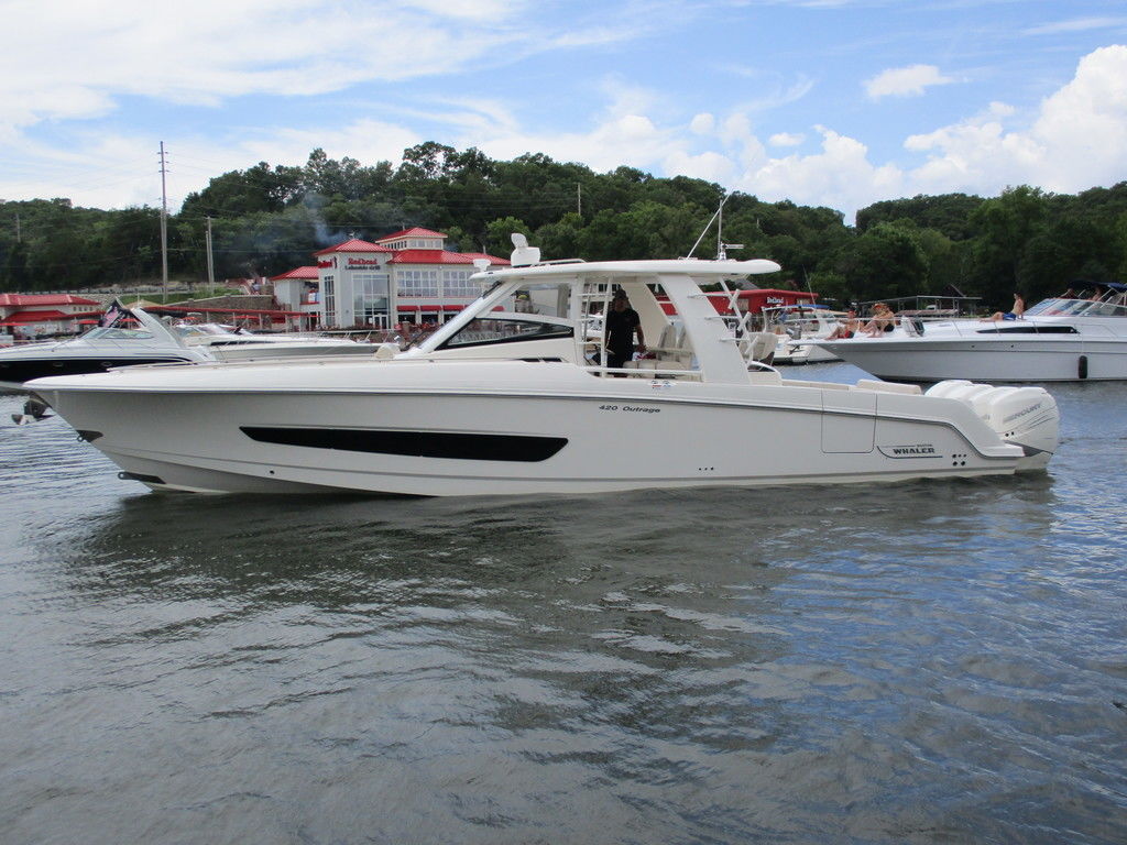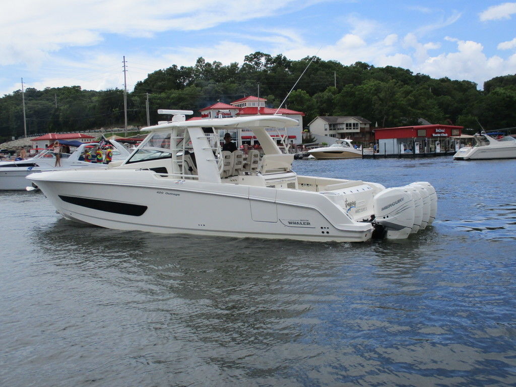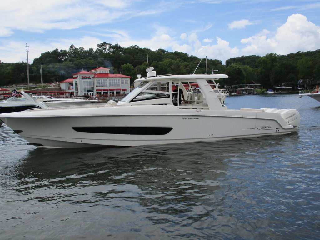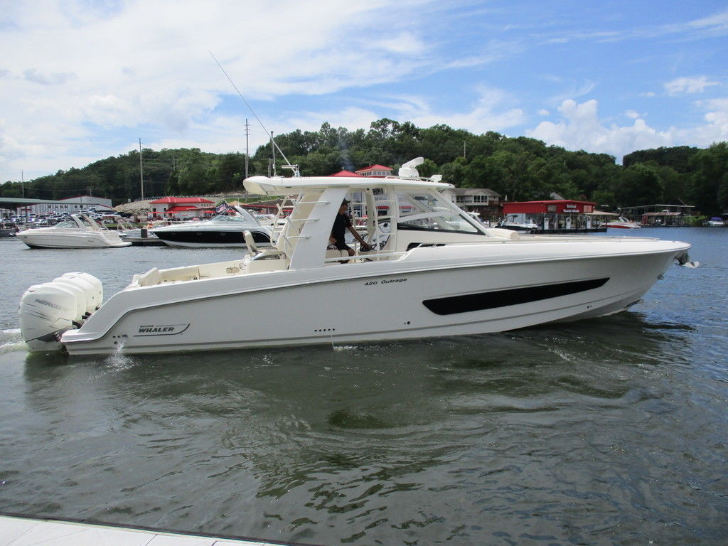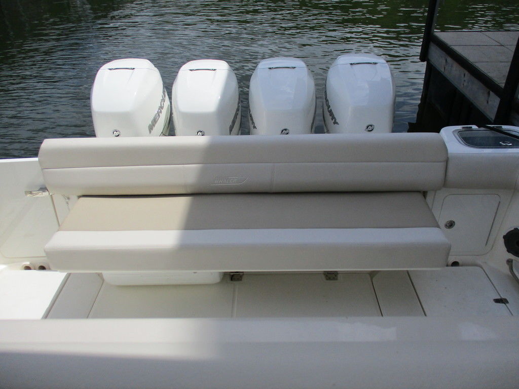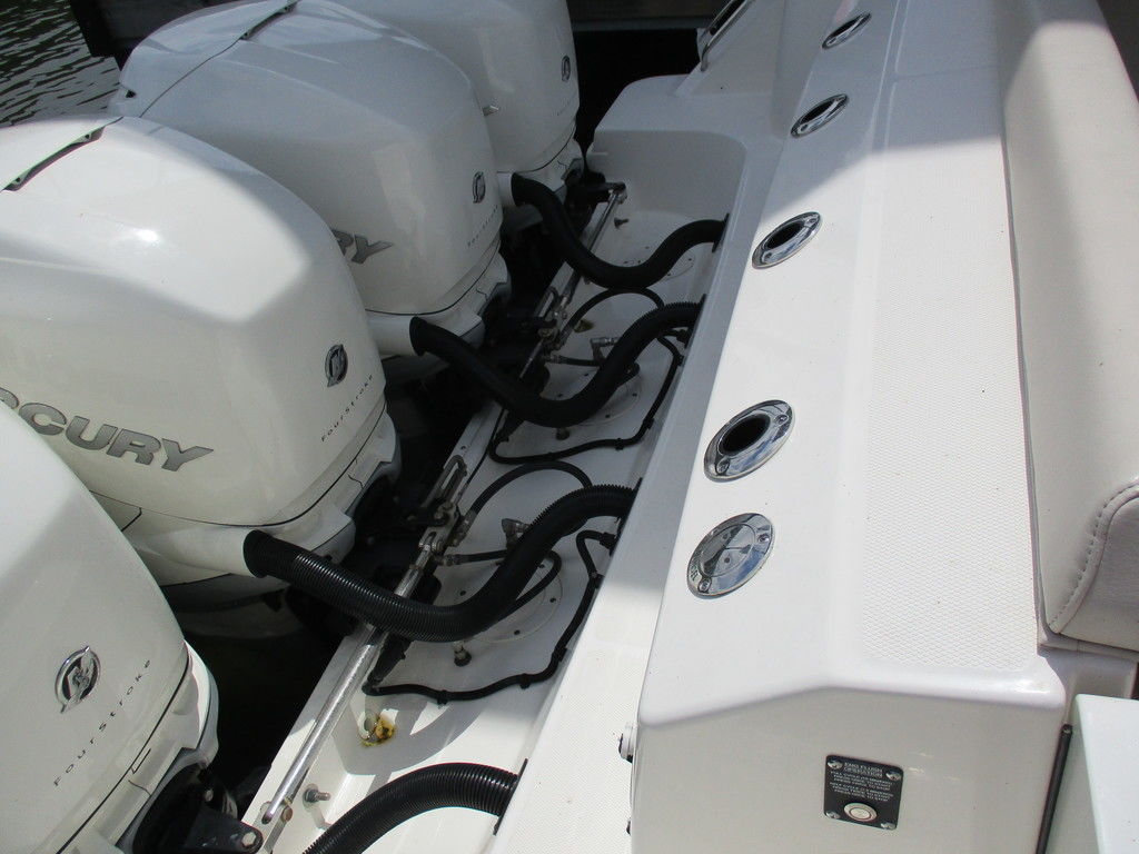 2019 Boston Whaler 420 Outrage powered by 4 Mercury 350 Verados with Joystick piloting, 75 FRESH WATER ONLY hours, 10" stainless cleats, boarding ladder at transom, 2 bow tow eye, drink holders stainless steel, full coaming bolsters, LED courtesy lights, live well, pressurized and insulated, boarding/dive ladder port side, windless with 400 rope and chain, stainless steel anchor, RayMarine 19 Axiom electronics, 1000 watt thru hull transducer b175, Fusion Stereo, theft deterrent system, LED flood lights, LED navigation lights, LED overhead courtesy, Sunshade for cockpit, bow table teak w/cushion, bow sun shade, scuba tank rack, underwater lights blue, 12 volt at transom , 2 downriggers, summer kitchen leaning post, freezer plates in stb fishbox, cockpit folding bench seat stbd, engine flushing system, premium audio package, Sirius/XM satellite radio, SeaKeeper Gyroscope stabilizer, seat canvas cover package, Diesel gen, radial outriggers, active trim.
