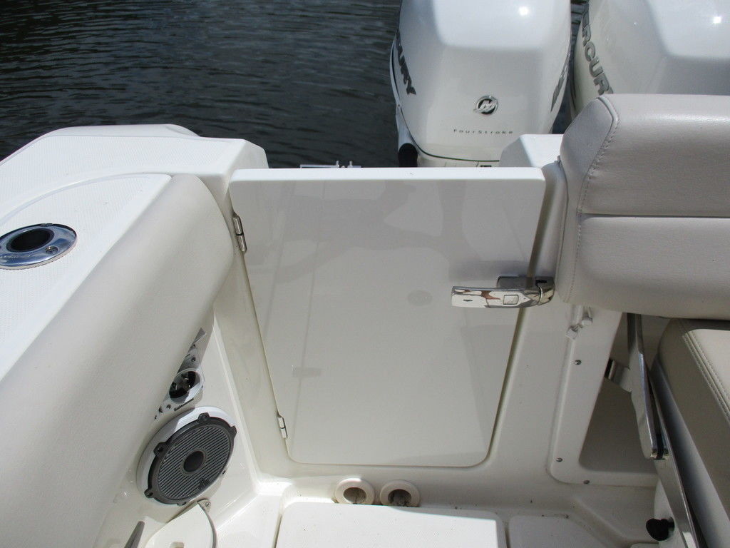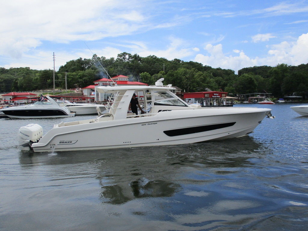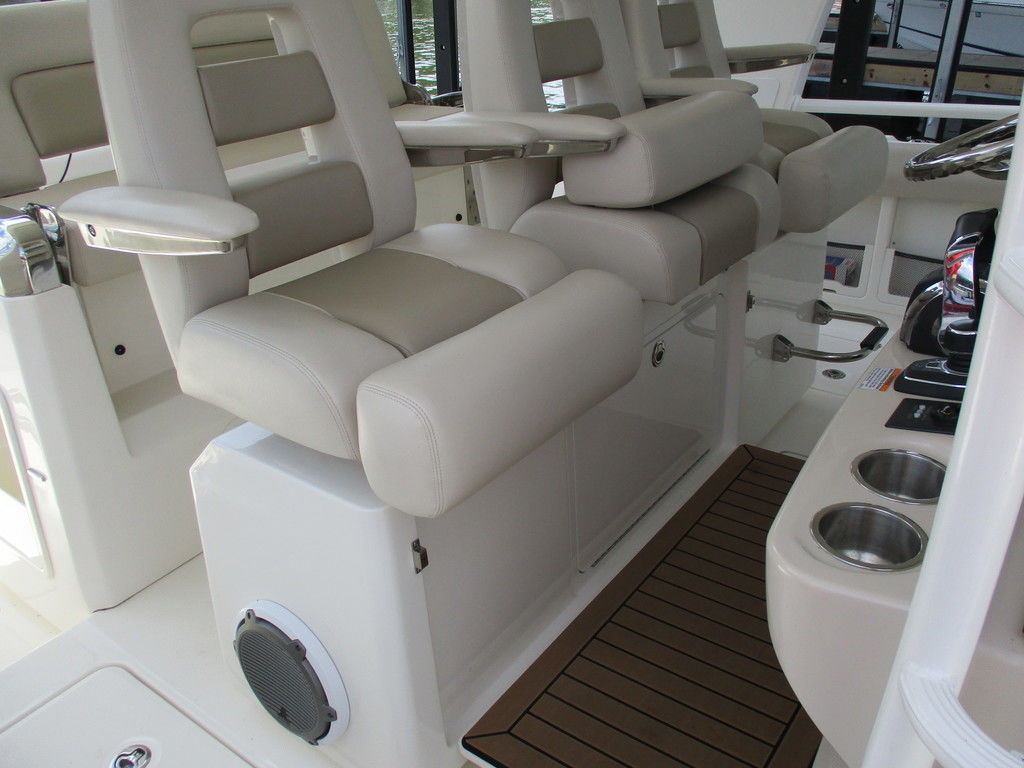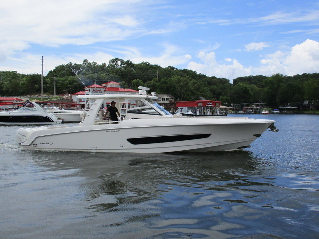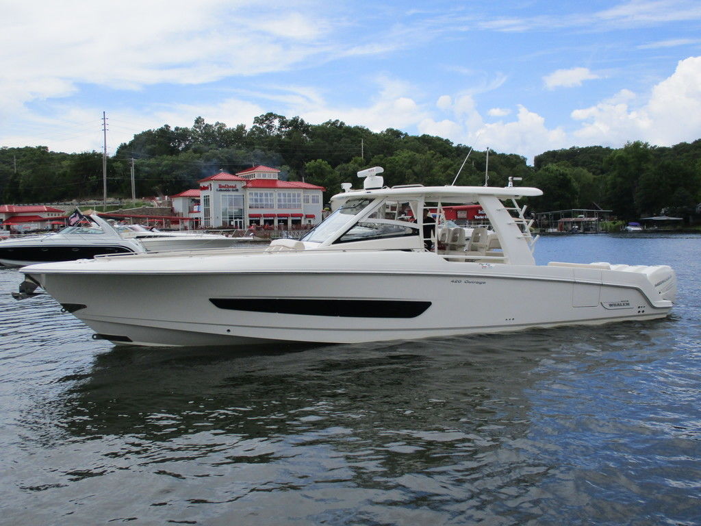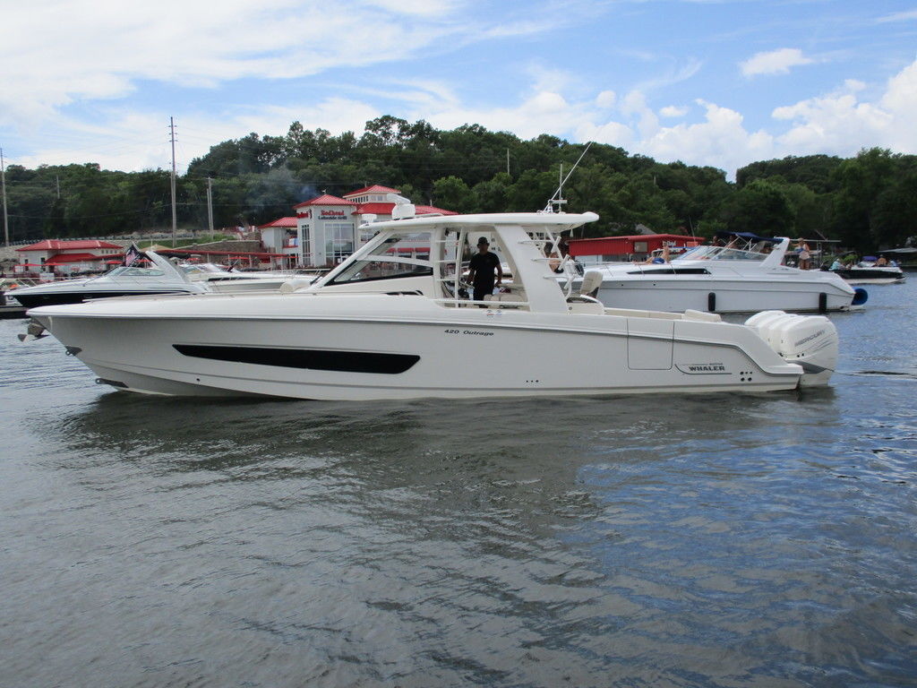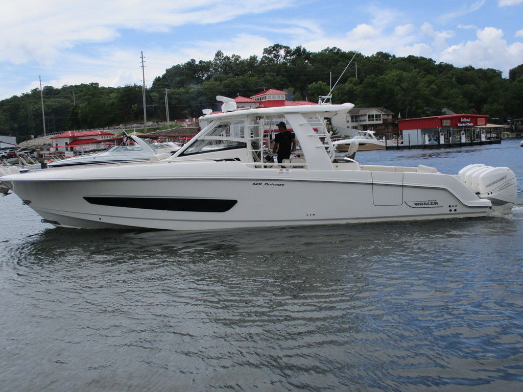 2019 Boston Whaler 420 Outrage powered by 4 Mercury 350 Verados with Joystick piloting, 75 FRESH WATER ONLY hours, 10" stainless cleats, boarding ladder at transom, 2 bow tow eye, drink holders stainless steel, full coaming bolsters, LED courtesy lights, live well, pressurized and insulated, boarding/dive ladder port side, windless with 400 rope and chain, stainless steel anchor, RayMarine 19 Axiom electronics, 1000 watt thru hull transducer b175, Fusion Stereo, theft deterrent system, LED flood lights, LED navigation lights, LED overhead courtesy, Sunshade for cockpit, bow table teak w/cushion, bow sun shade, scuba tank rack, underwater lights blue, 12 volt at transom , 2 downriggers, summer kitchen leaning post, freezer plates in stb fishbox, cockpit folding bench seat stbd, engine flushing system, premium audio package, Sirius/XM satellite radio, SeaKeeper Gyroscope stabilizer, seat canvas cover package, Diesel gen, radial outriggers, active trim.