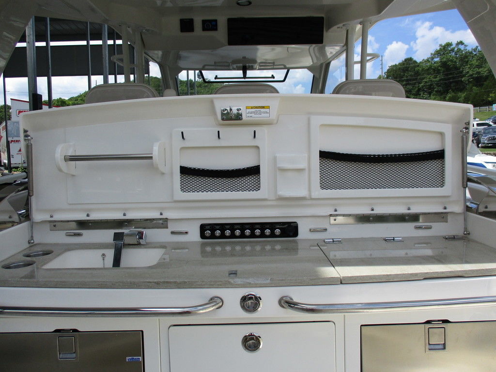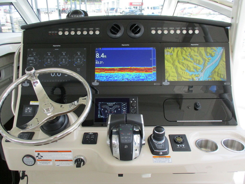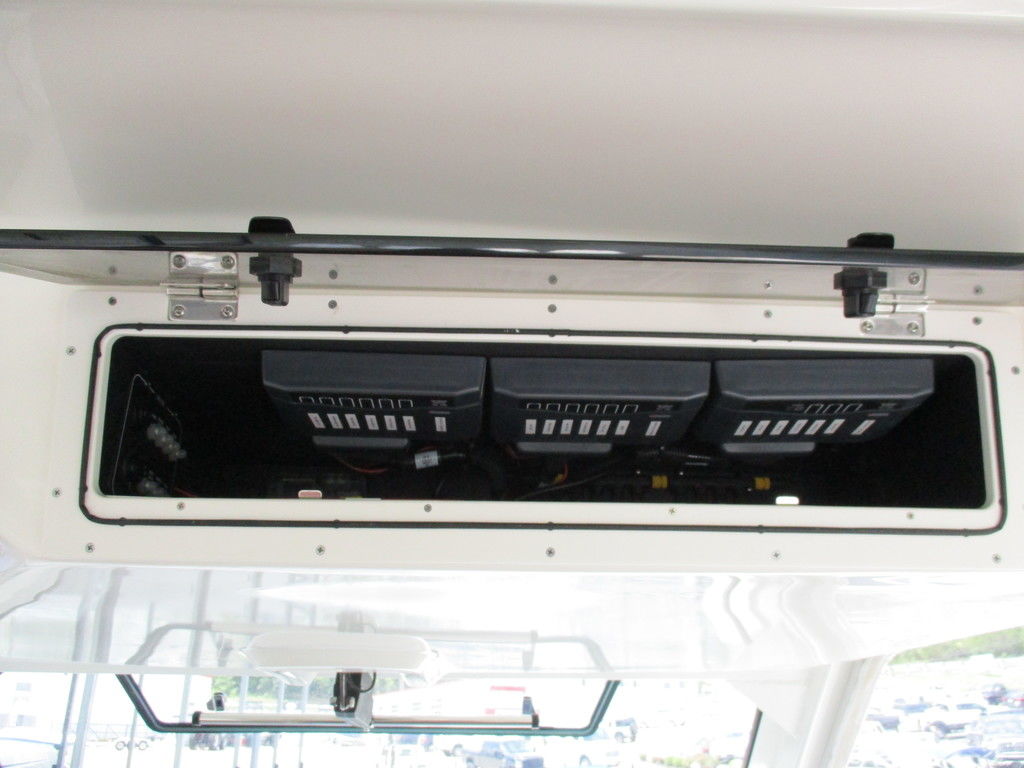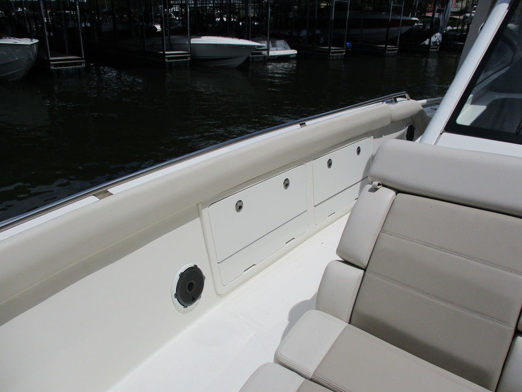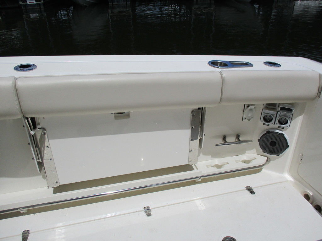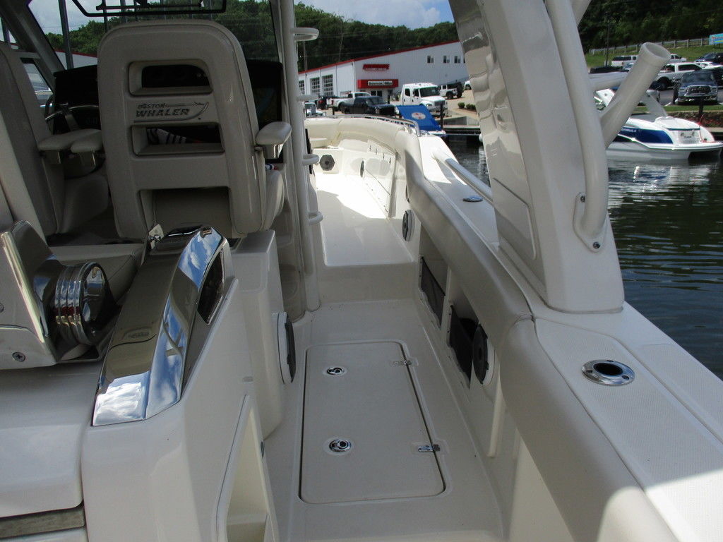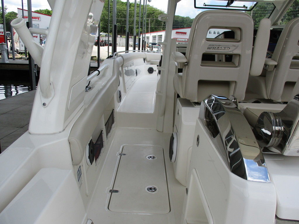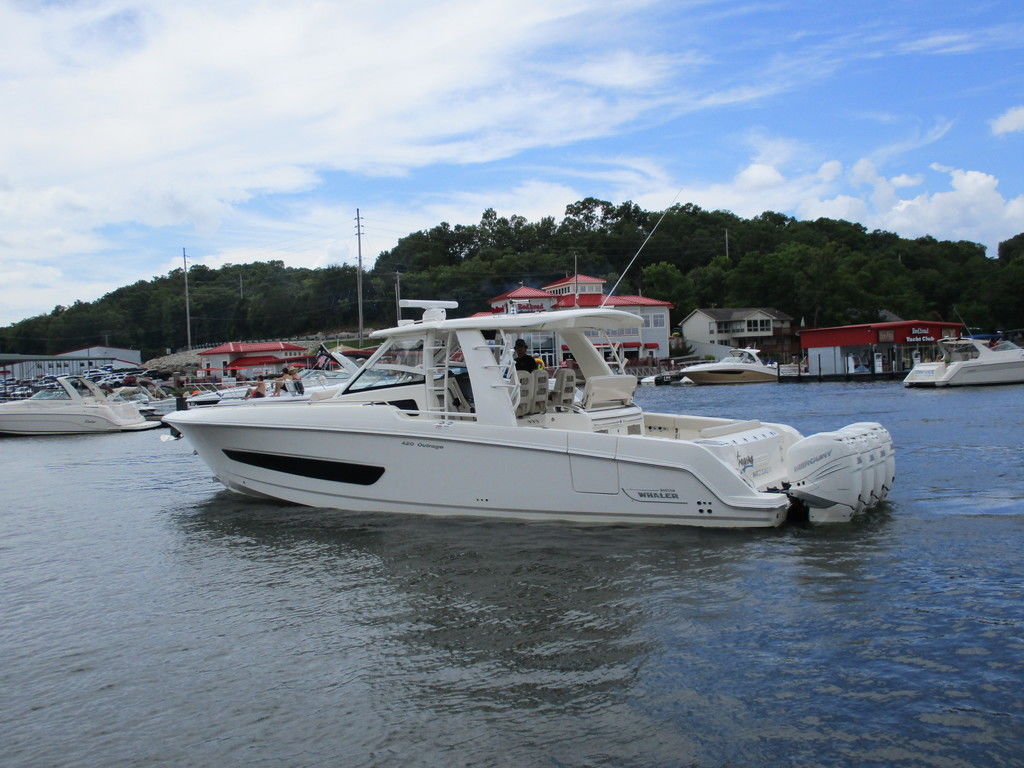 2019 Boston Whaler 420 Outrage powered by 4 Mercury 350 Verados with Joystick piloting, 75 FRESH WATER ONLY hours, 10" stainless cleats, boarding ladder at transom, 2 bow tow eye, drink holders stainless steel, full coaming bolsters, LED courtesy lights, live well, pressurized and insulated, boarding/dive ladder port side, windless with 400 rope and chain, stainless steel anchor, RayMarine 19 Axiom electronics, 1000 watt thru hull transducer b175, Fusion Stereo, theft deterrent system, LED flood lights, LED navigation lights, LED overhead courtesy, Sunshade for cockpit, bow table teak w/cushion, bow sun shade, scuba tank rack, underwater lights blue, 12 volt at transom , 2 downriggers, summer kitchen leaning post, freezer plates in stb fishbox, cockpit folding bench seat stbd, engine flushing system, premium audio package, Sirius/XM satellite radio, SeaKeeper Gyroscope stabilizer, seat canvas cover package, Diesel gen, radial outriggers, active trim.