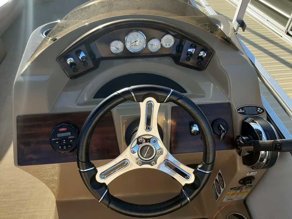 HELM STATION - Integrated helm station includes lit rocker switches, 3 drink holders, 12V power outlet, fuel, tachometer and trim gauges, aluminum polished steering wheel, throw tray, windscreen and additional storage below. (Shown with optional upgraded steering wheel)