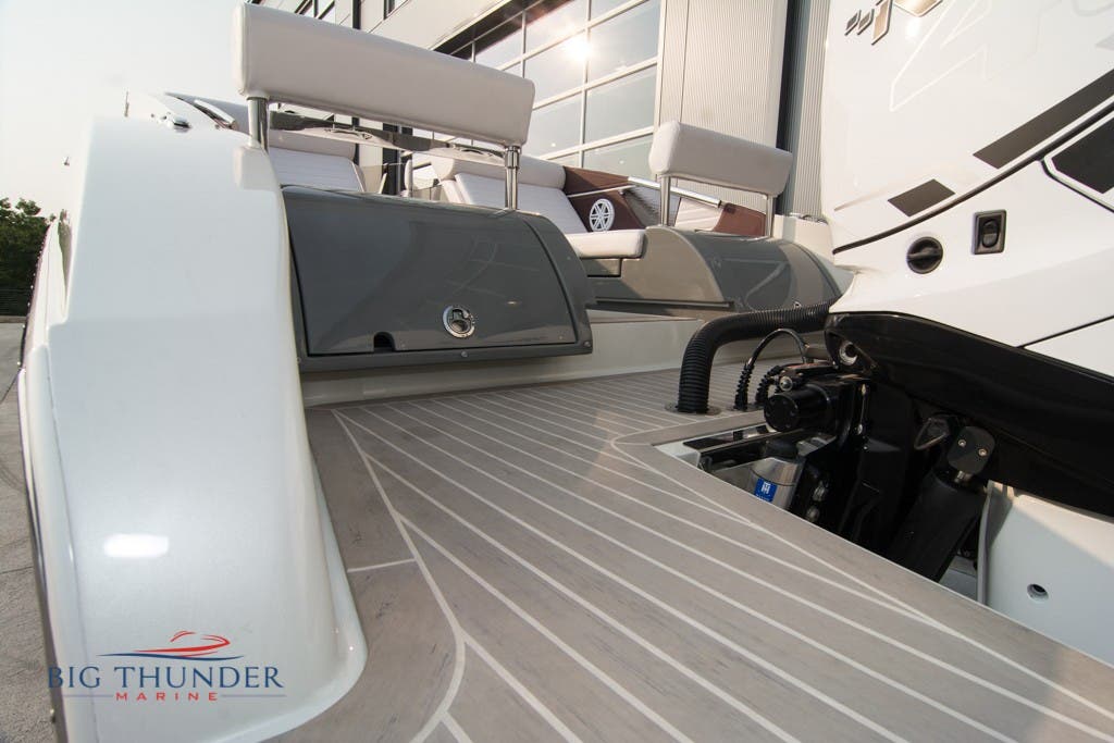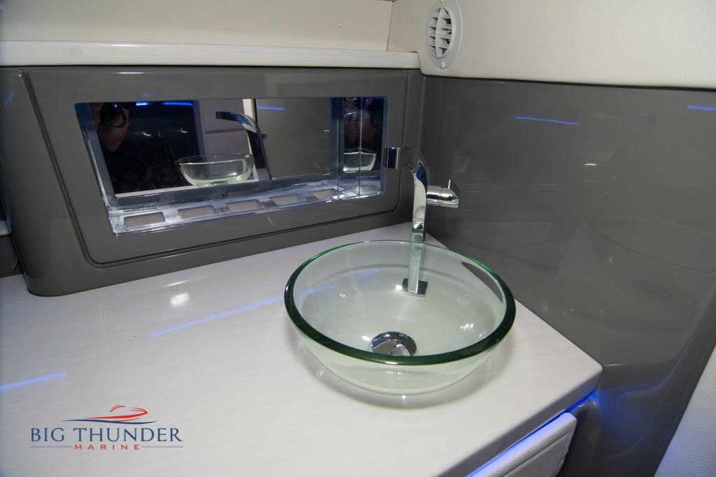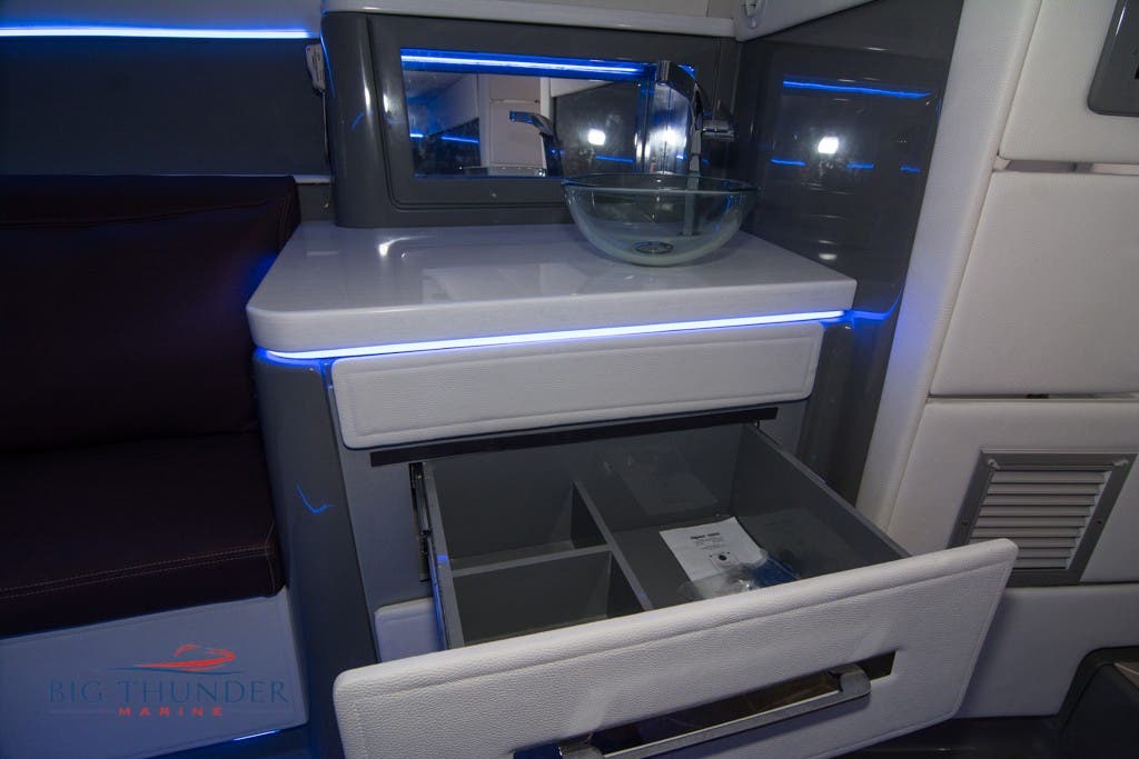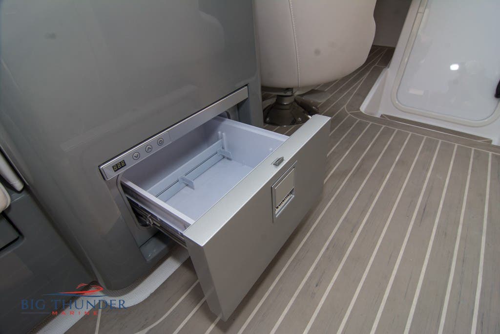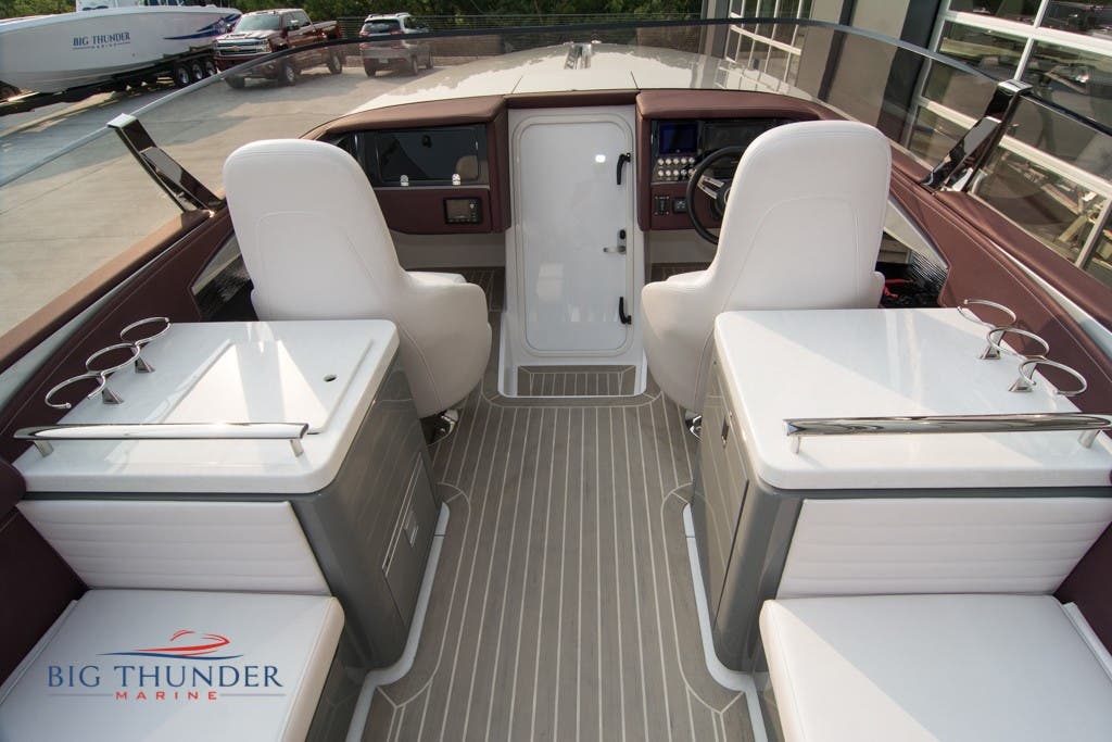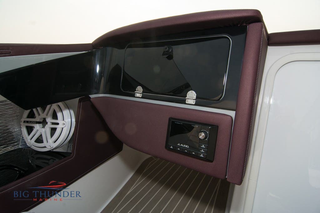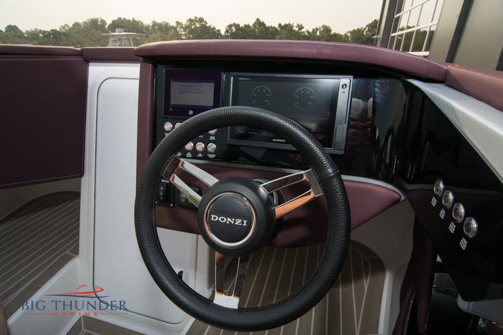 Triple Mercury Racing 400R Verado. Donzi Twin Step Z Plane Hull. Garmin 16"" Screen. Merc Vessel View. JL Audio System. Windlass, Striker Plate, Anchor and Rode. Cockpit Entertainment Center w/ Refrigerator and Sink, Chiller. Easy Drain Bailing Cockpit. Tailored Upholstery. Sport Helm and Companion Seating w/ Bolster. Midship Seat Grouping. Aft Lounges. Solid Surface Countertops. Sliding Door Console/Stateroom Access. Day Cabin w/ Seating, Head, Sink, Vanity, Pantry.