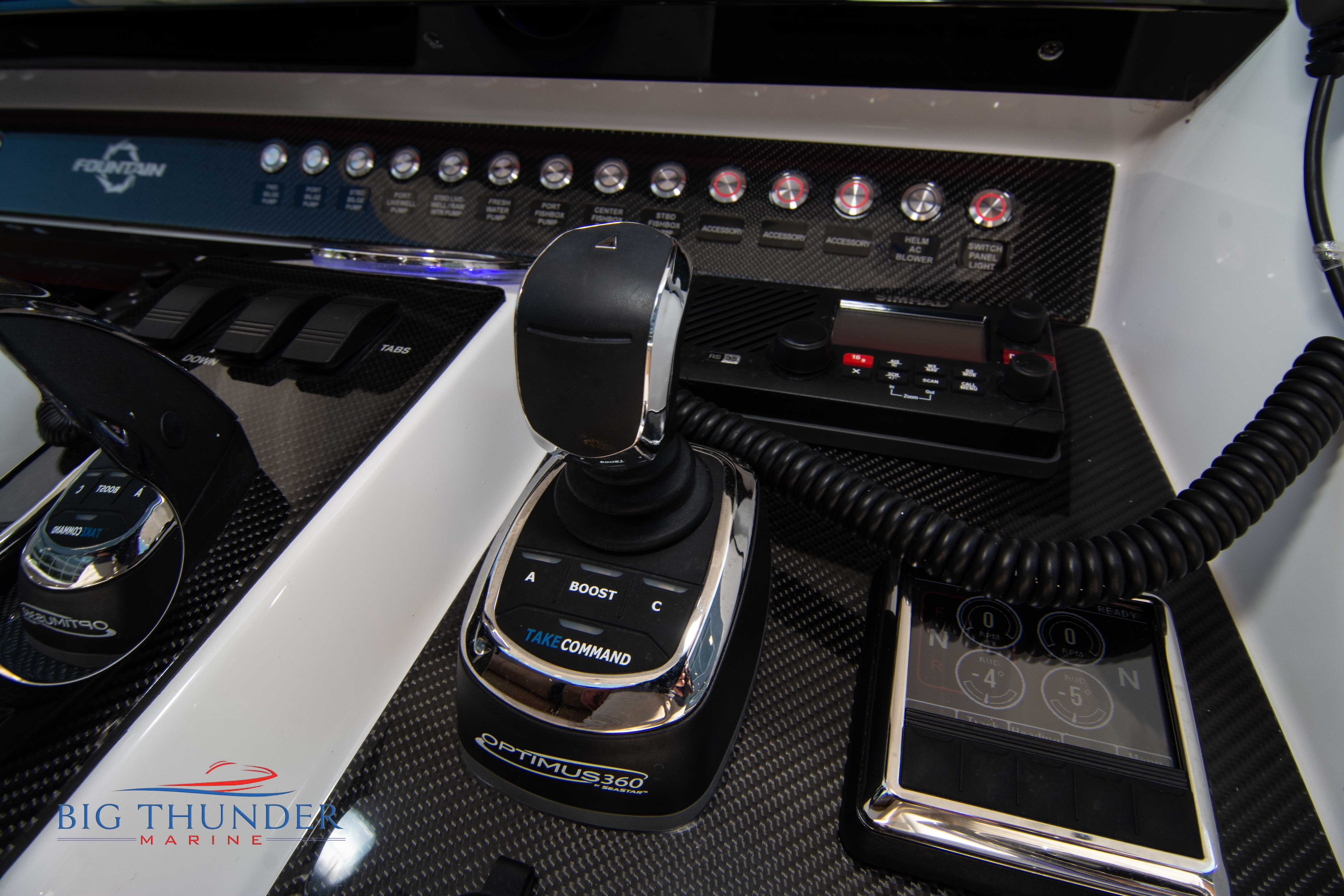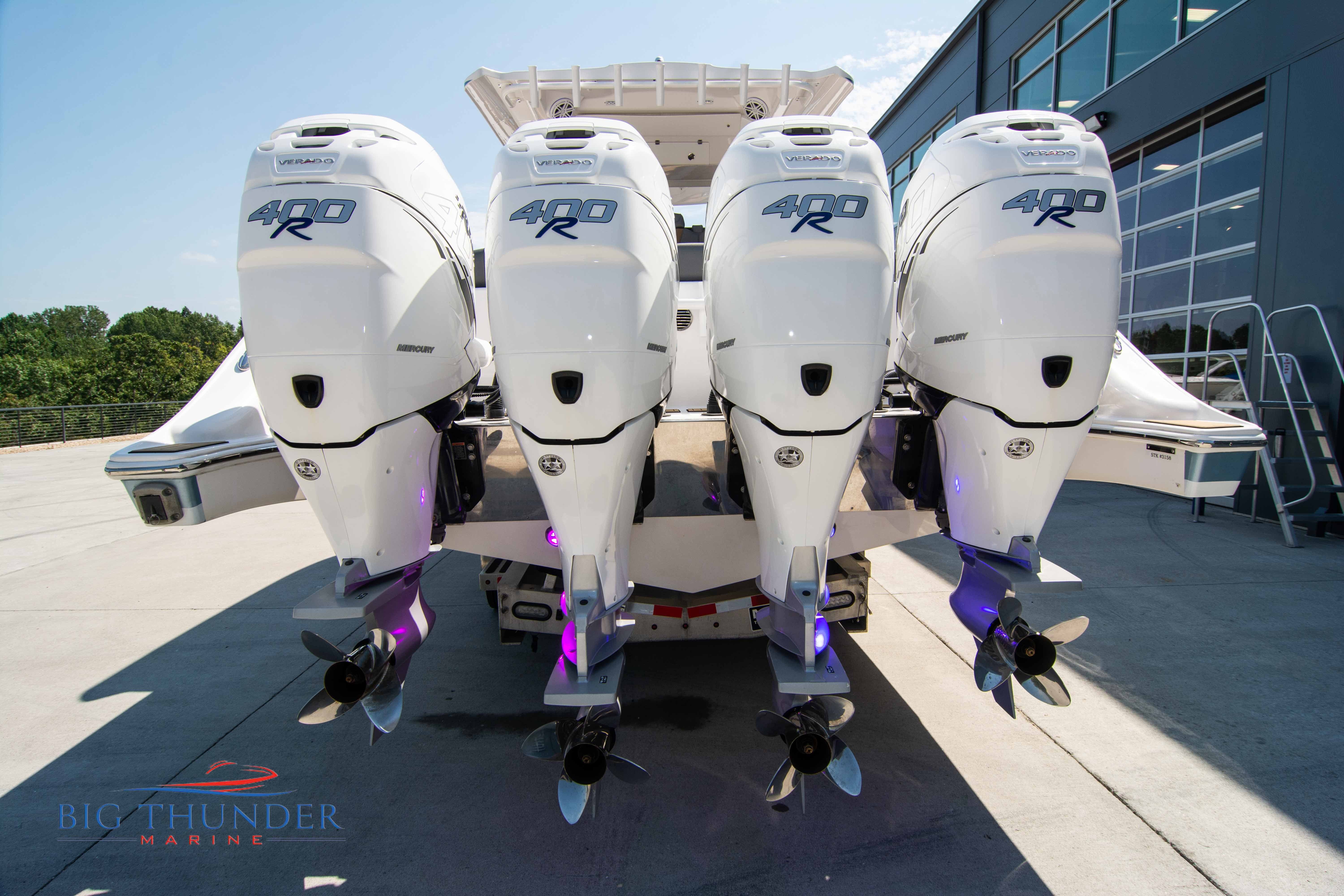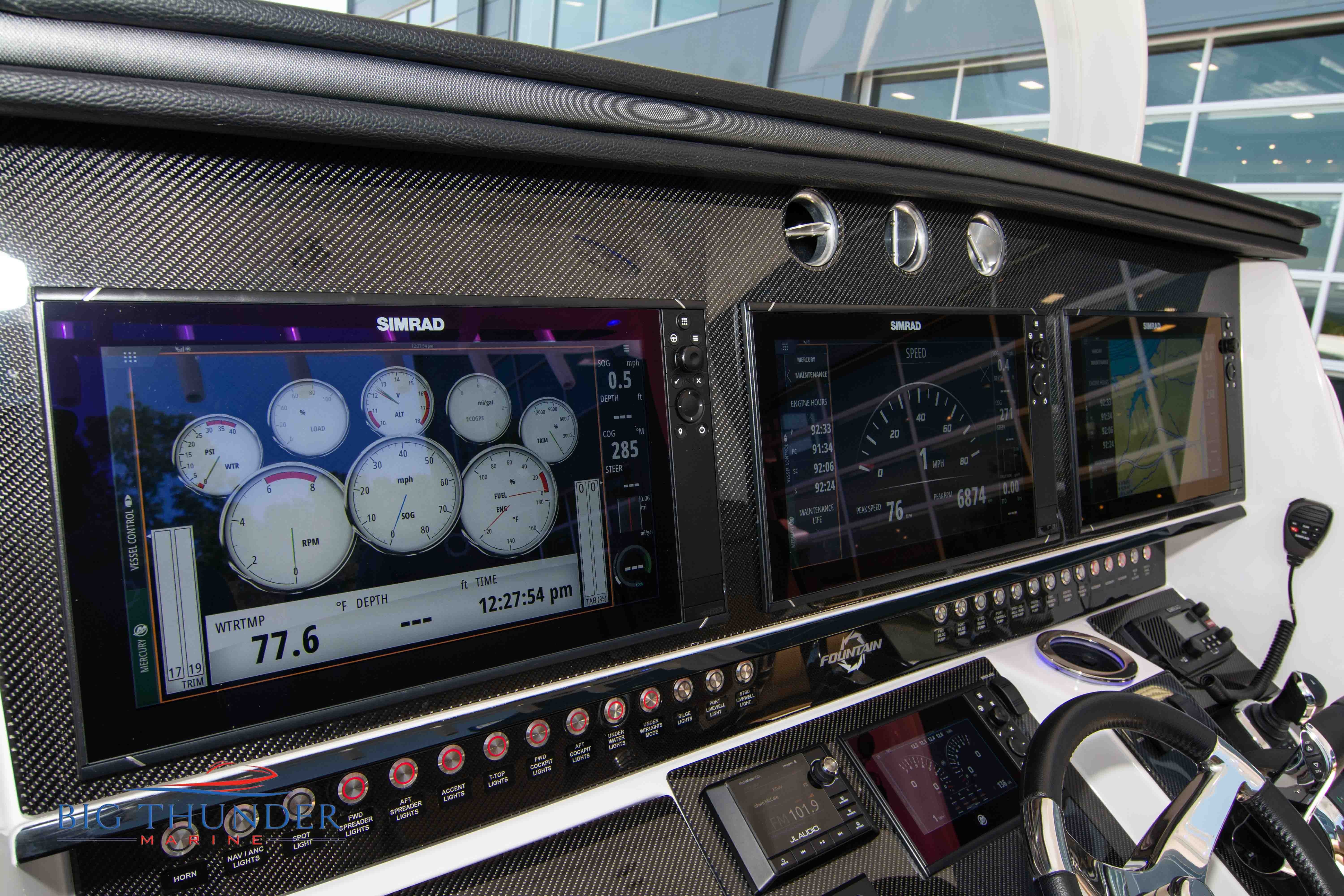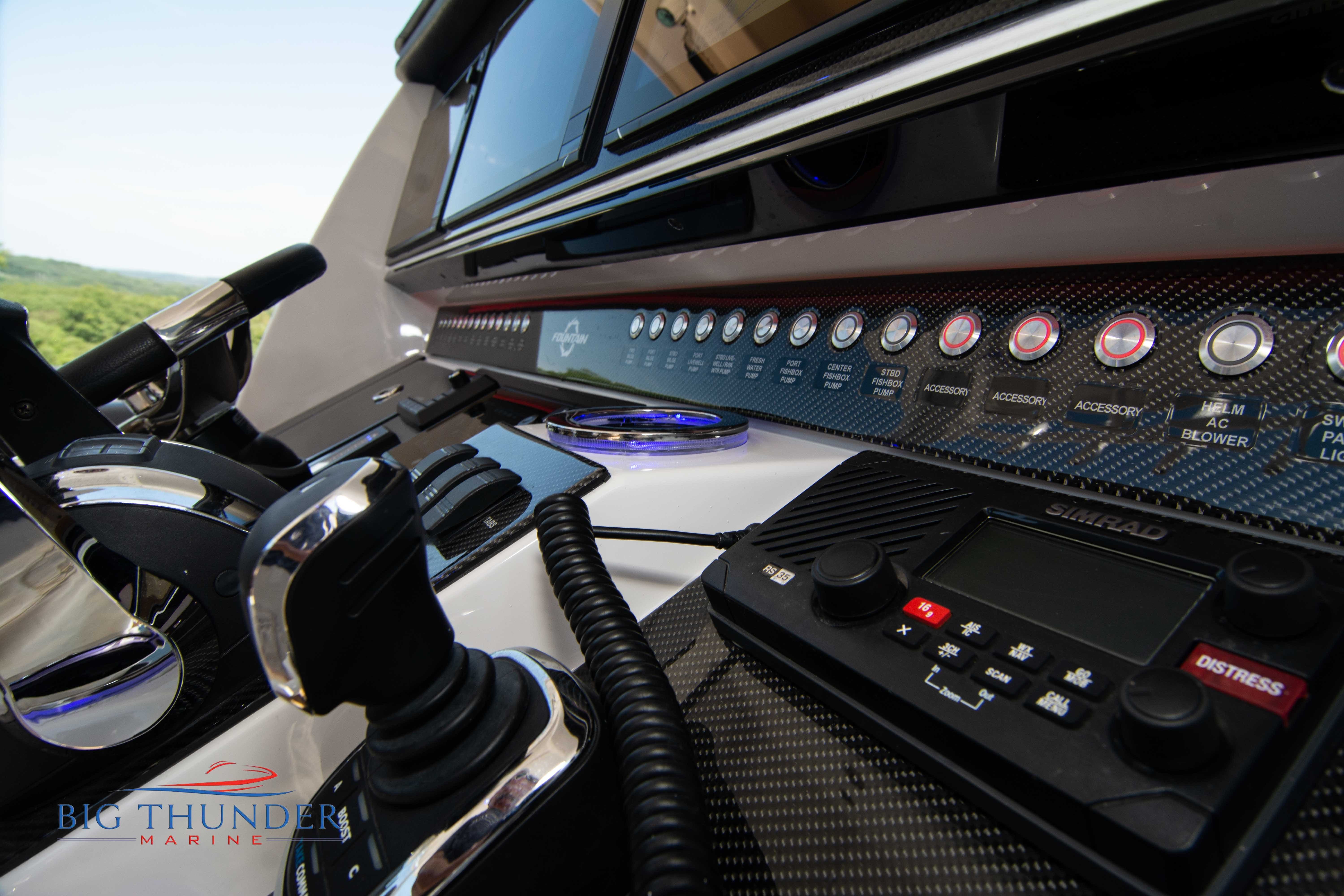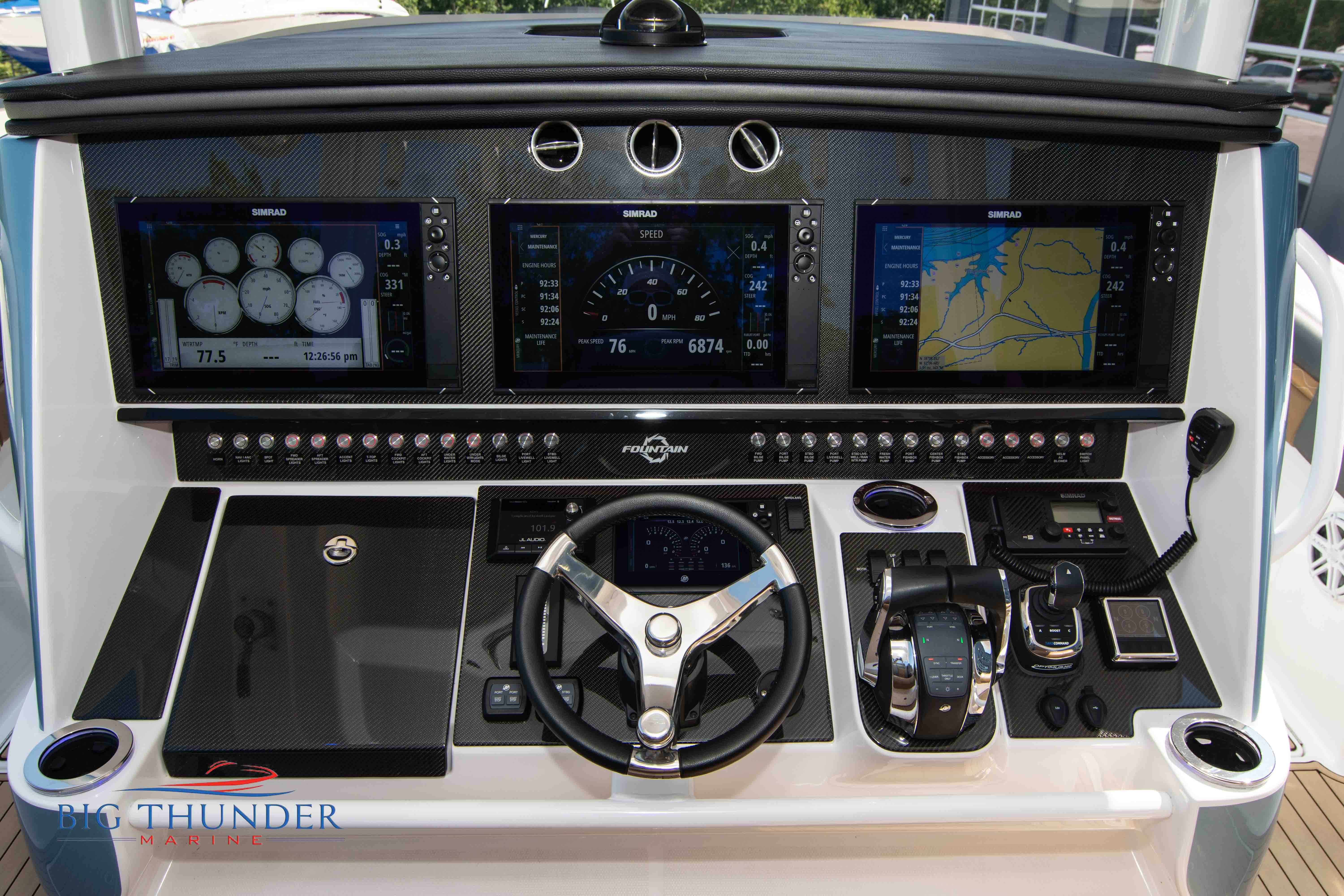 2019 Fountain 43 NX, Quad Verado 400R XM weather, Helm station contains head, sink, large v berth area, AC 30 amp dockside, lithium package w/50’ shore power cable, Mastervolt battery management system, Dive door with telescoping ladder, upgraded JL audio system, marine mat flooring, front lounge area, table, helm seat and dash cover, Triple Simrad 16’ displays, 24 HD domed radar, vhf radio with antenna and auto pilot. XM weather option. Panda diesel 5kw gen. AC/heat in cabin and at helm station. Isotherm refrigerators. Myco aluminium triple axle trailer available.