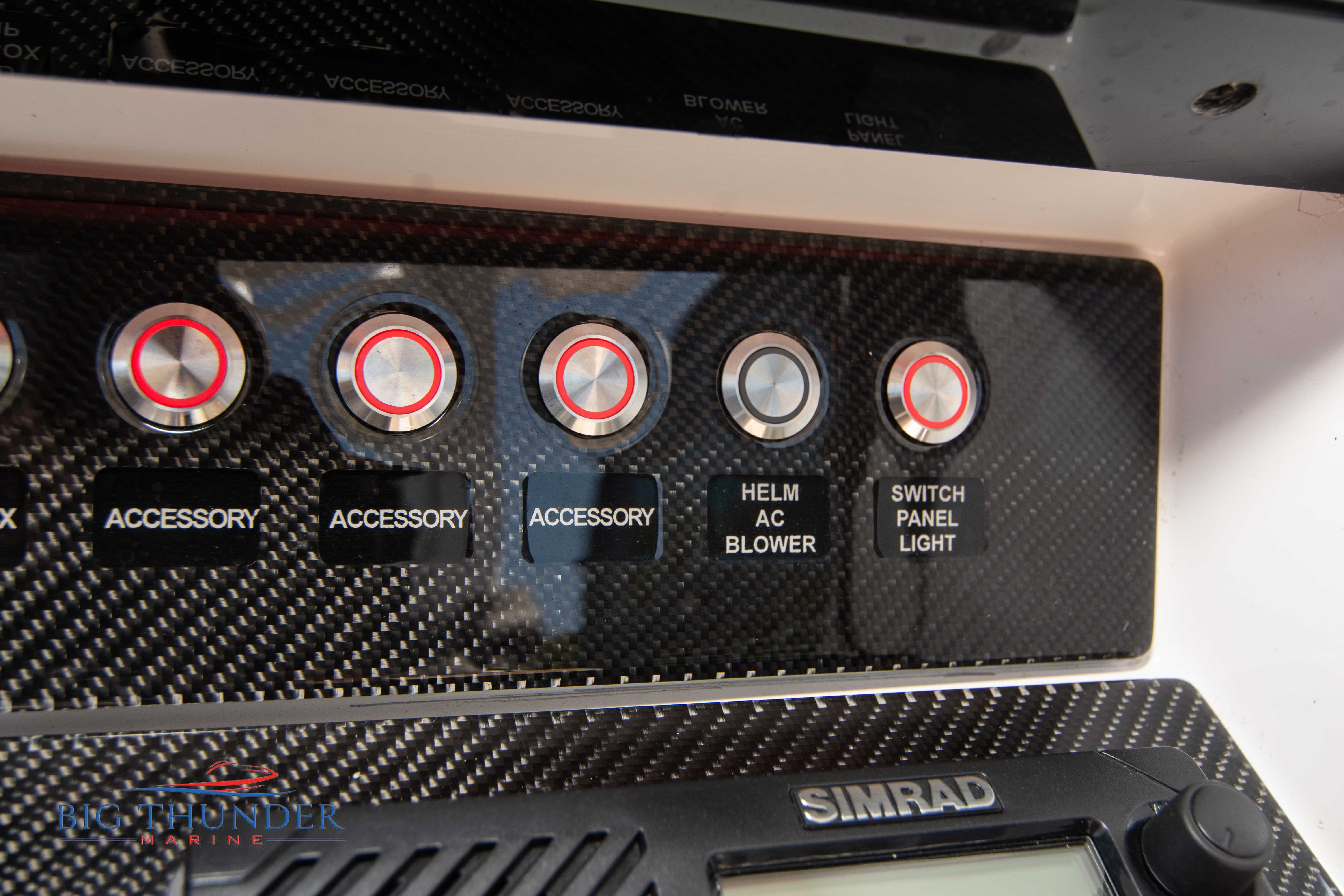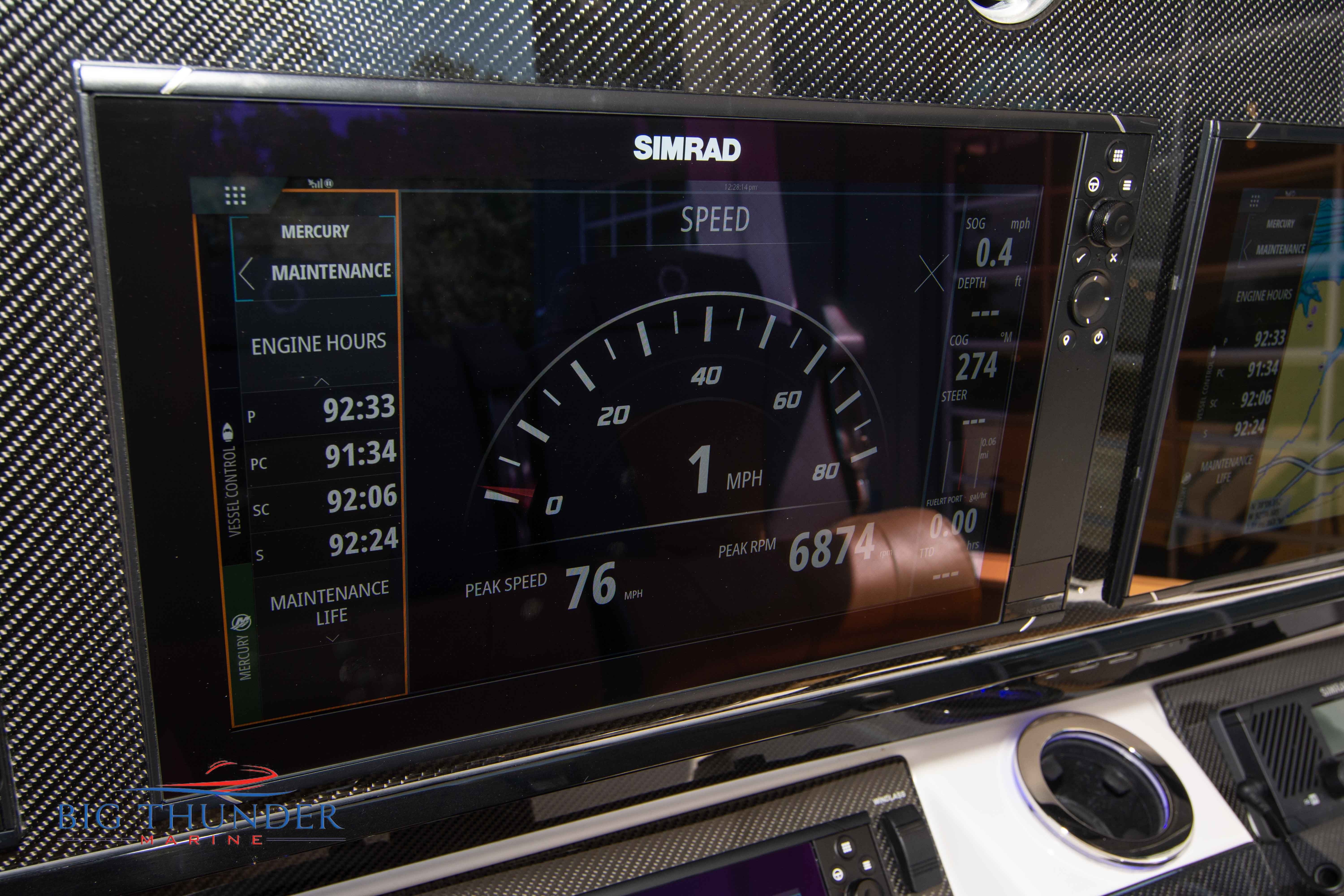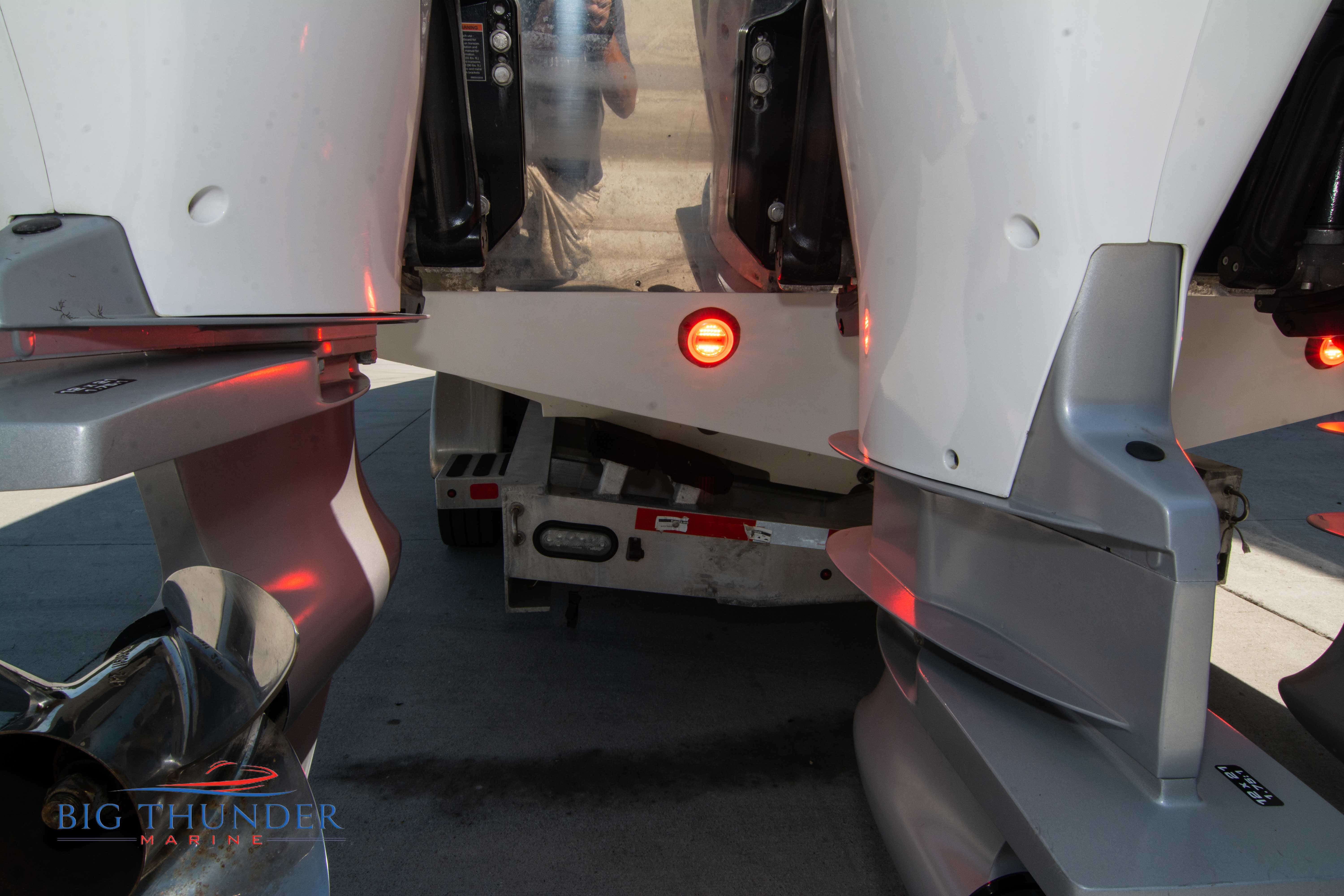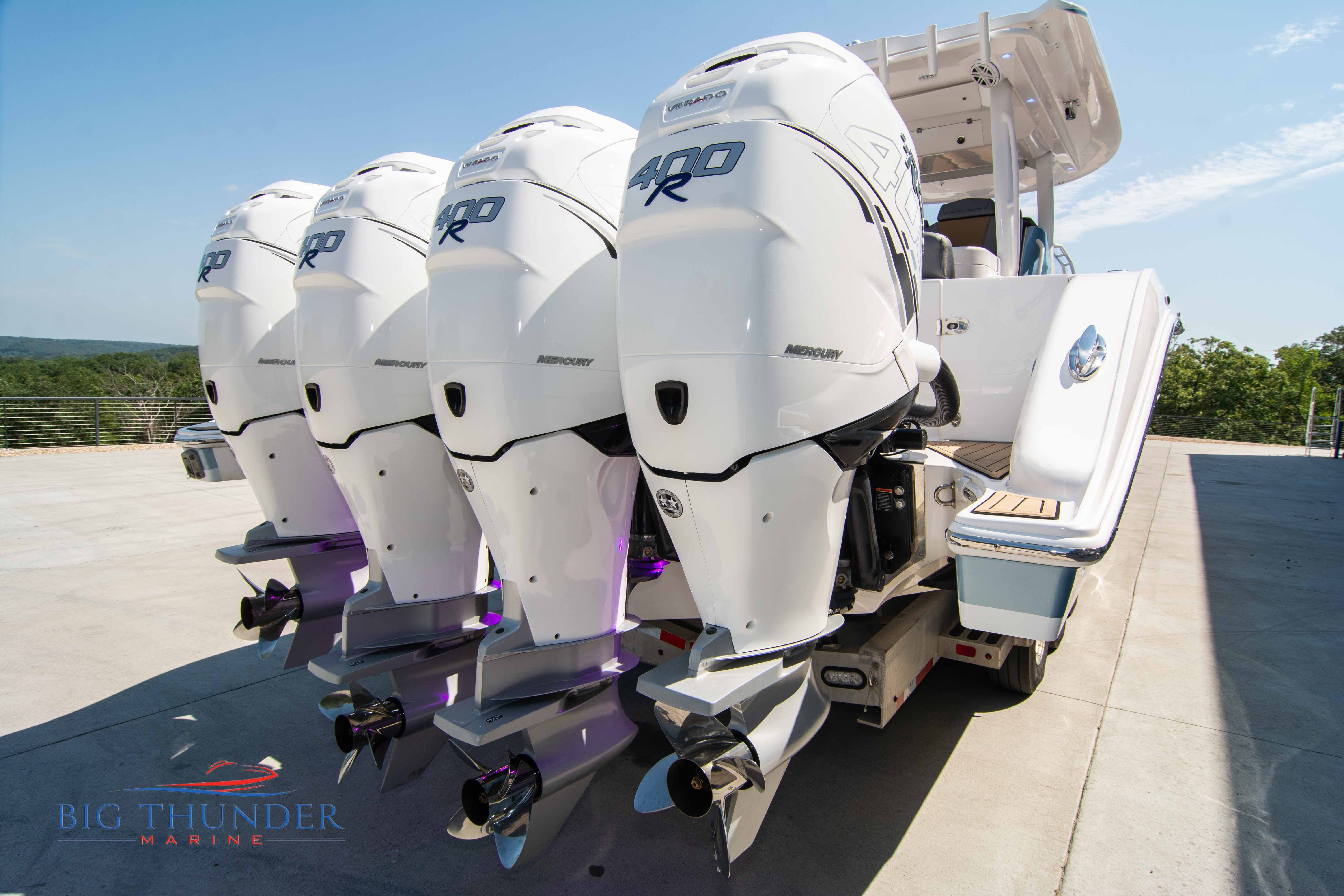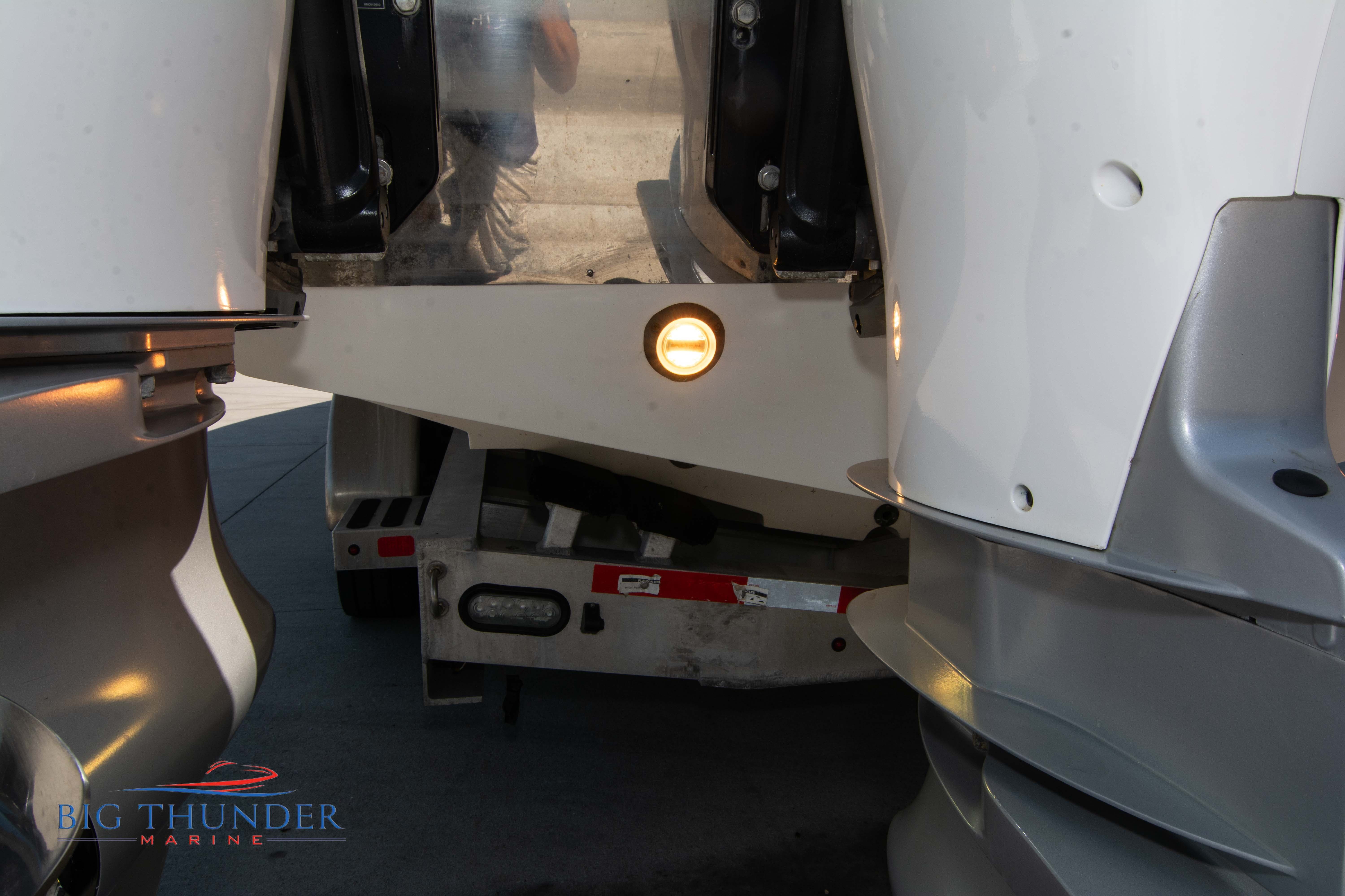 2019 Fountain 43 NX, Quad Verado 400R XM weather, Helm station contains head, sink, large v berth area, AC 30 amp dockside, lithium package w/50’ shore power cable, Mastervolt battery management system, Dive door with telescoping ladder, upgraded JL audio system, marine mat flooring, front lounge area, table, helm seat and dash cover, Triple Simrad 16’ displays, 24 HD domed radar, vhf radio with antenna and auto pilot. XM weather option. Panda diesel 5kw gen. AC/heat in cabin and at helm station. Isotherm refrigerators. Myco aluminium triple axle trailer available.