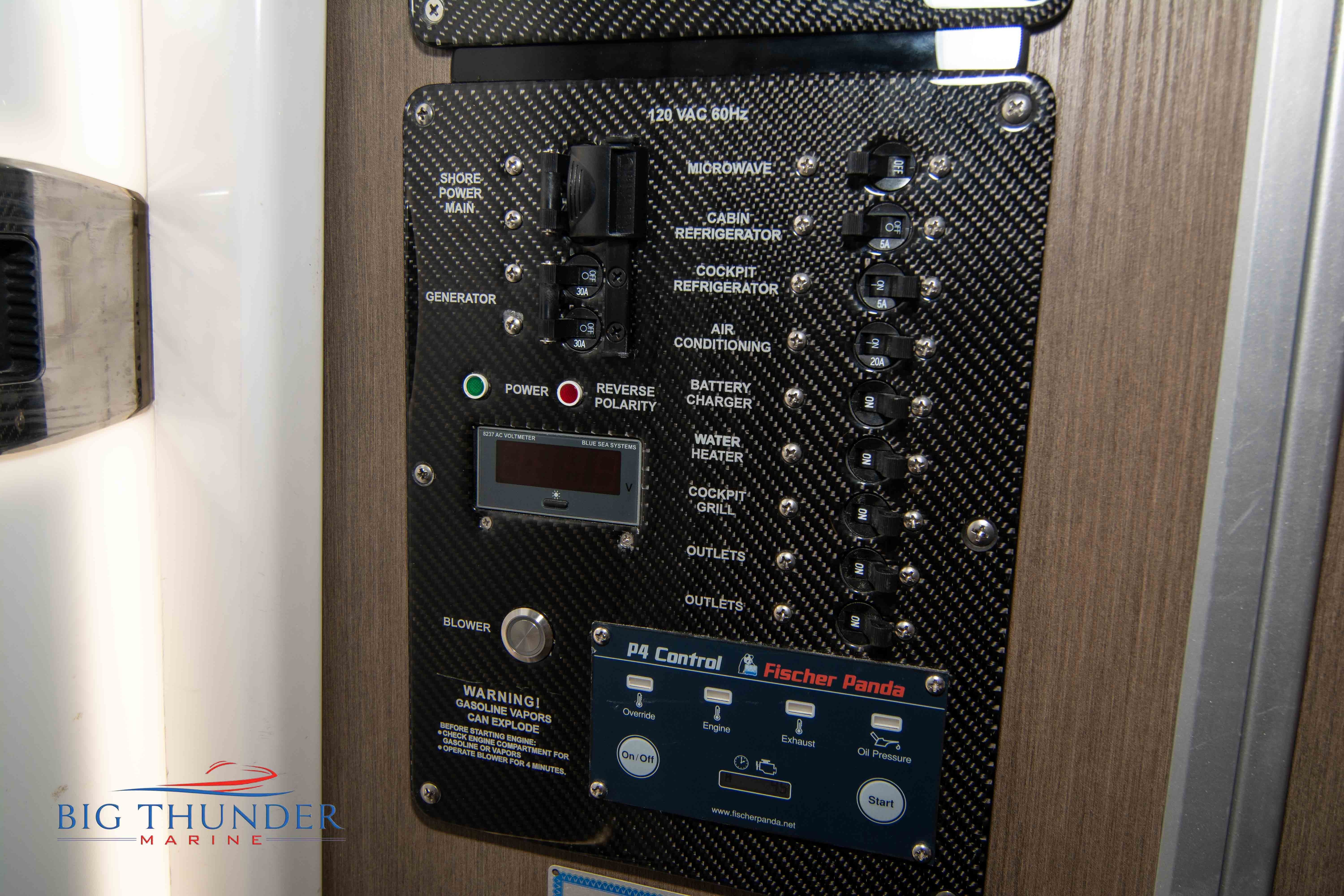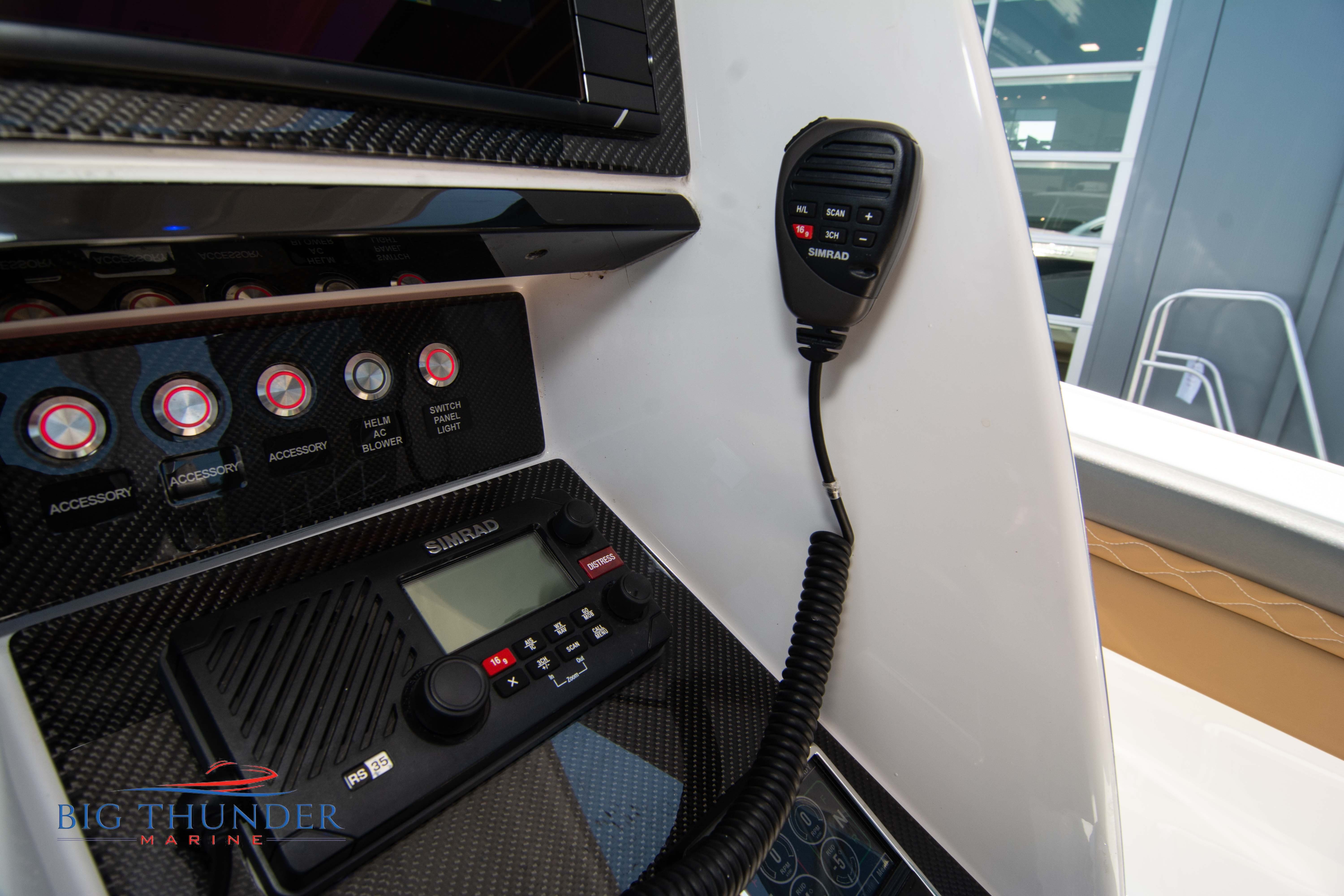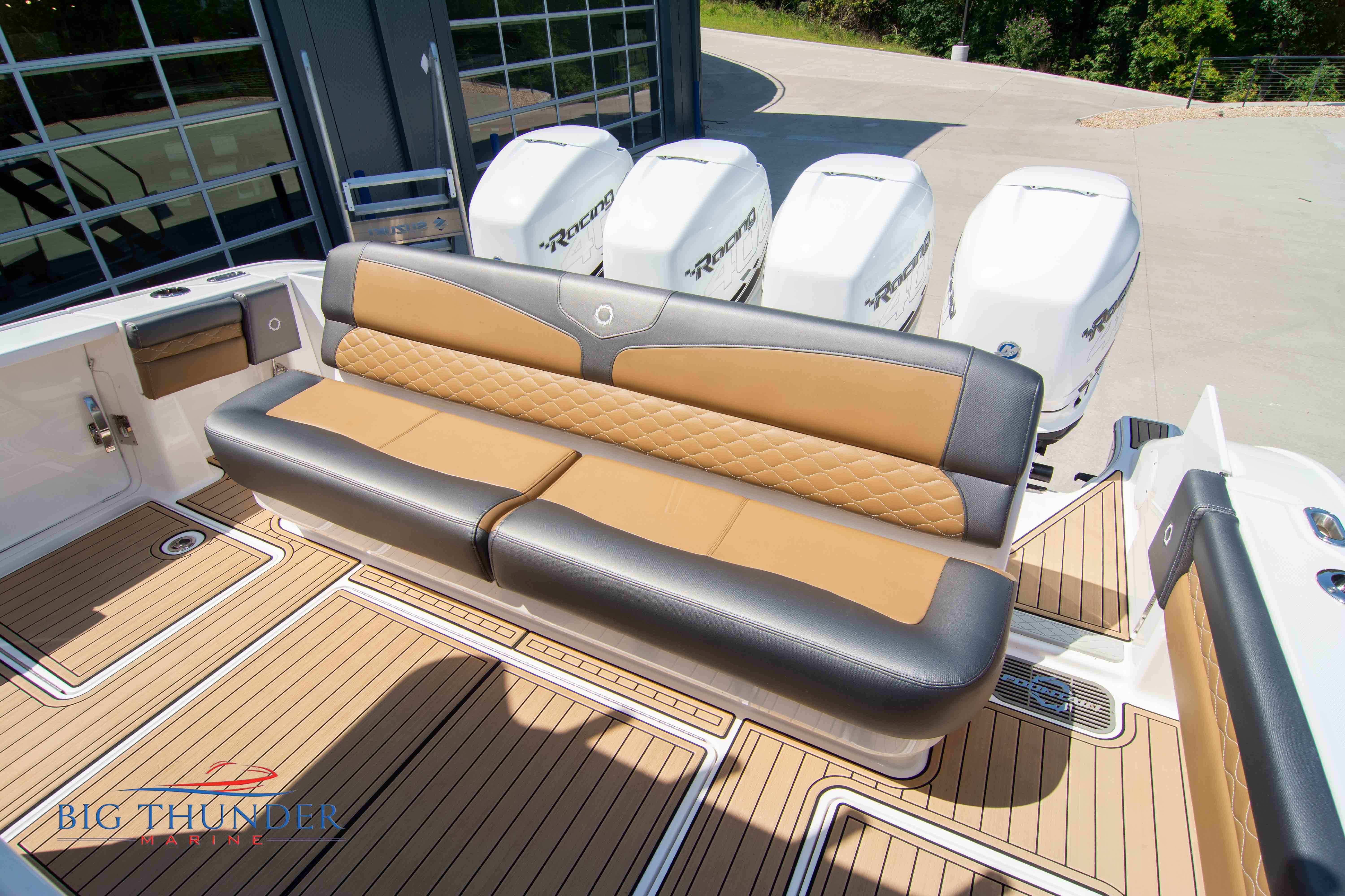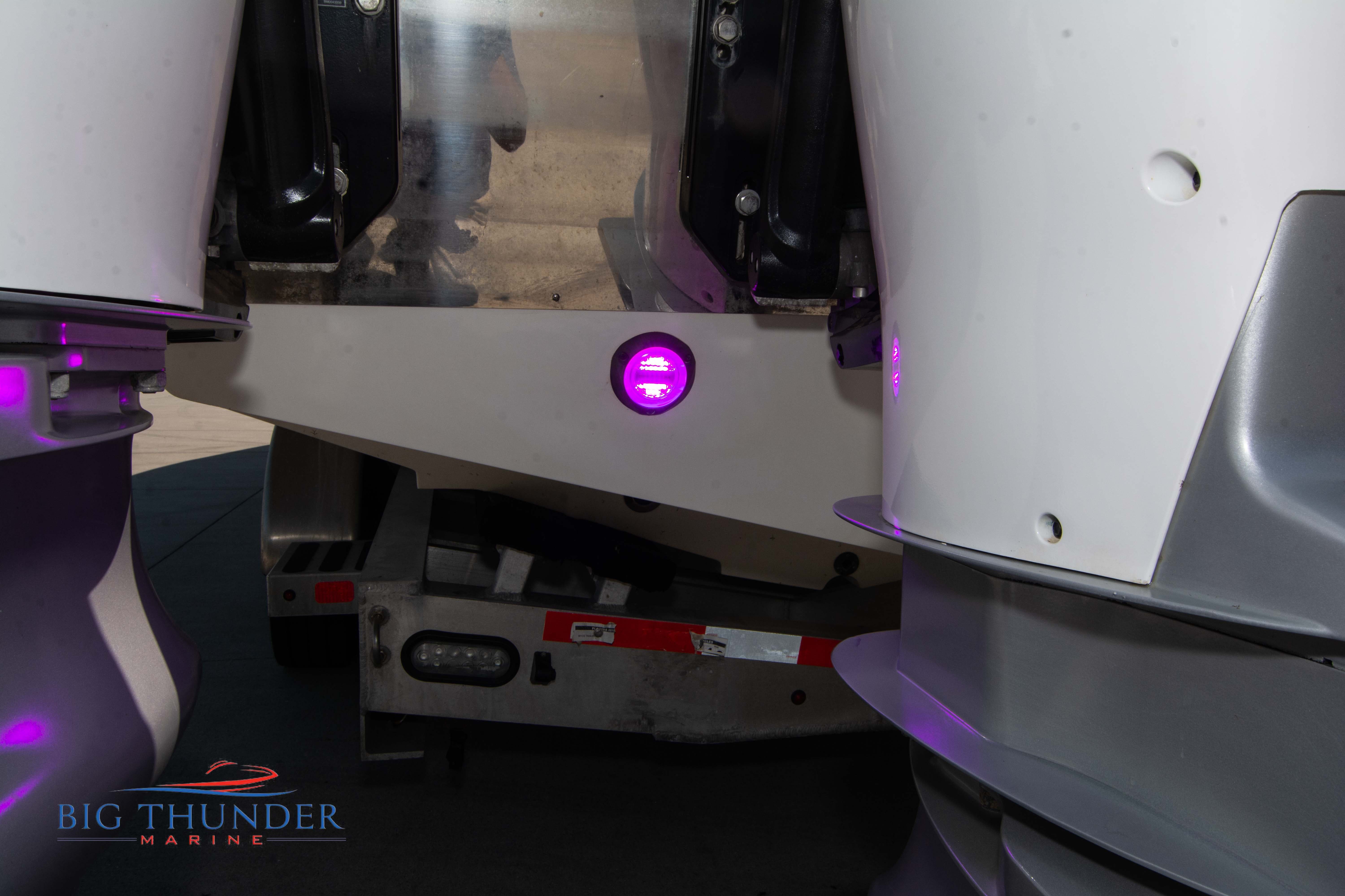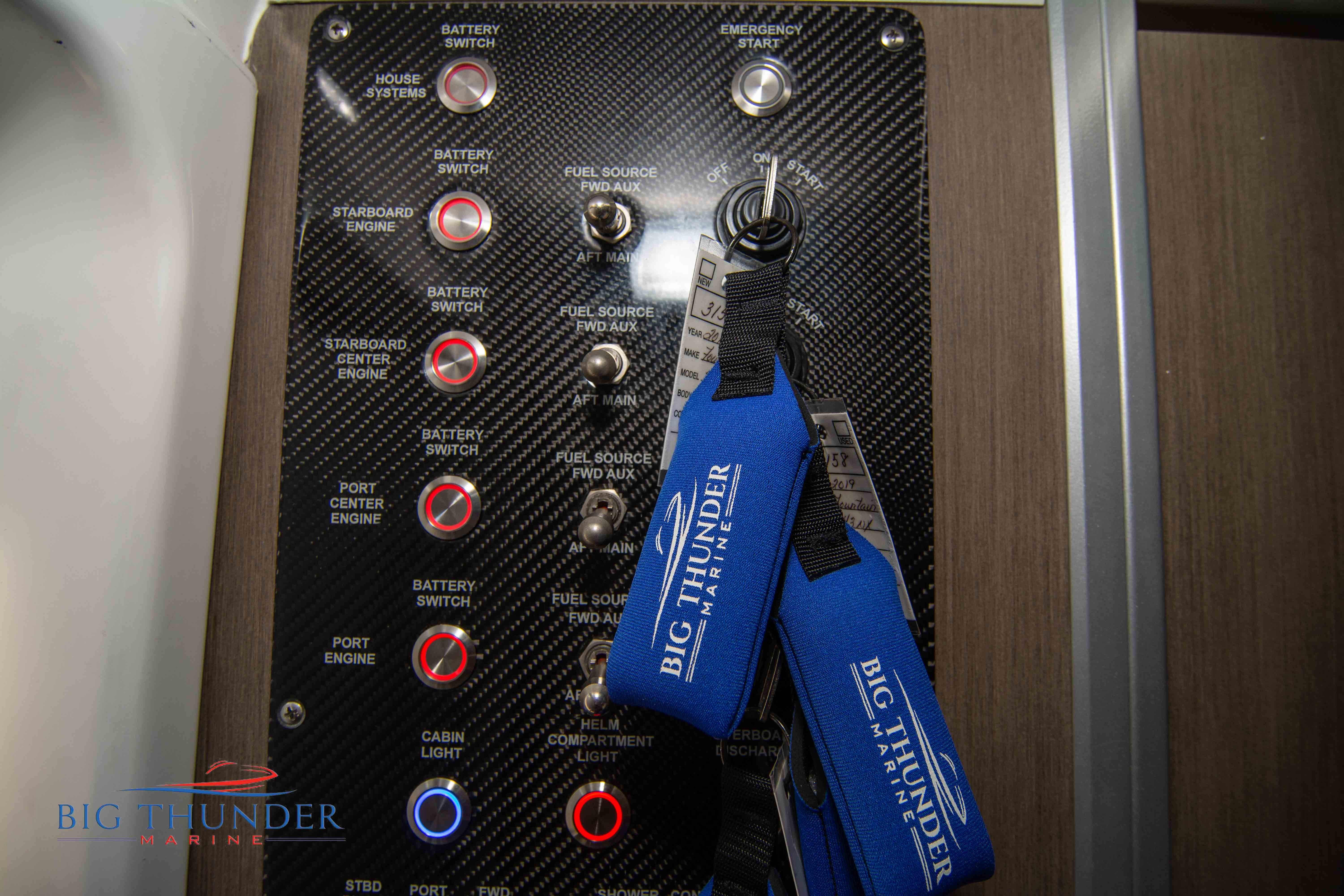 2019 Fountain 43 NX, Quad Verado 400R XM weather, Helm station contains head, sink, large v berth area, AC 30 amp dockside, lithium package w/50’ shore power cable, Mastervolt battery management system, Dive door with telescoping ladder, upgraded JL audio system, marine mat flooring, front lounge area, table, helm seat and dash cover, Triple Simrad 16’ displays, 24 HD domed radar, vhf radio with antenna and auto pilot. XM weather option. Panda diesel 5kw gen. AC/heat in cabin and at helm station. Isotherm refrigerators. Myco aluminium triple axle trailer available.