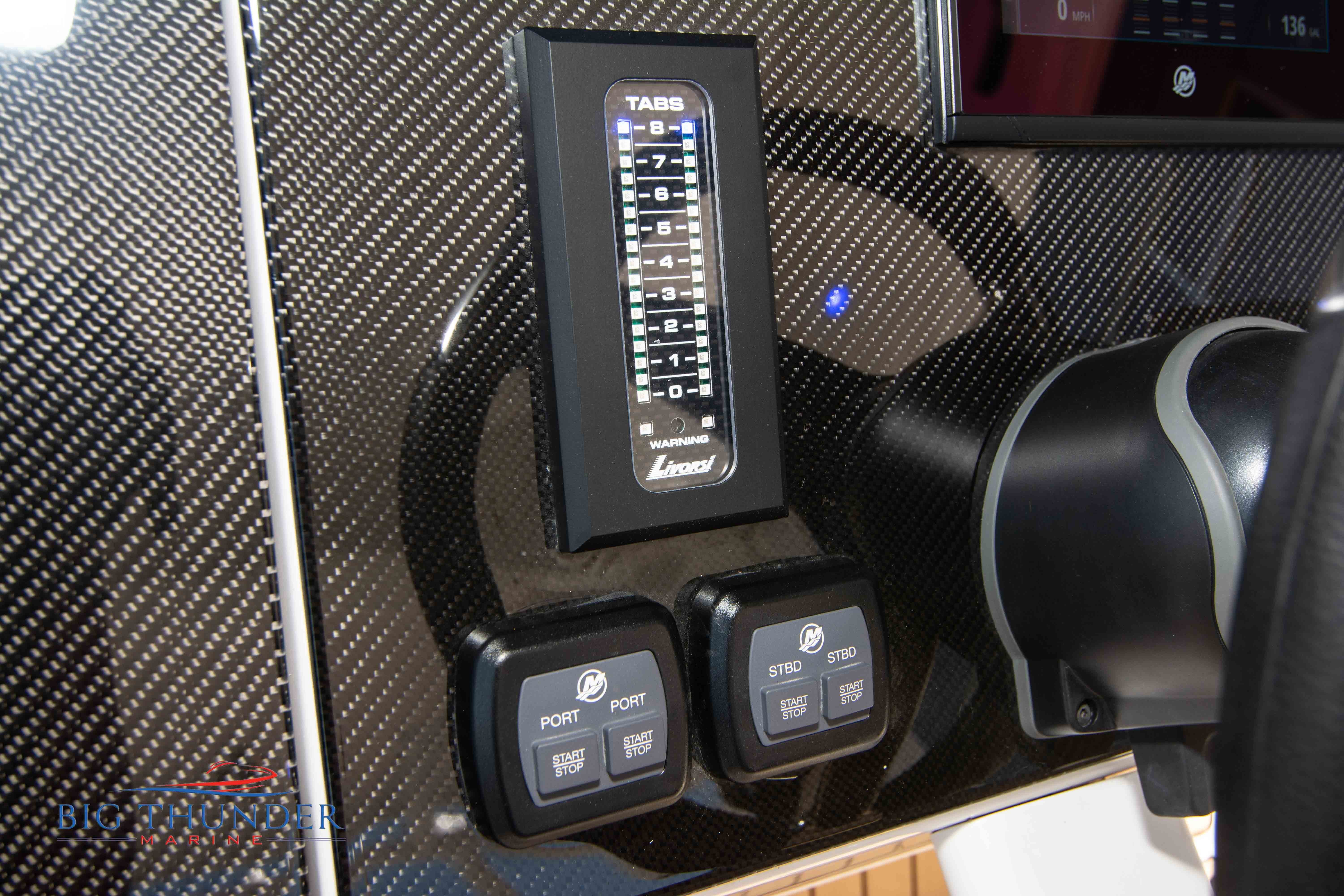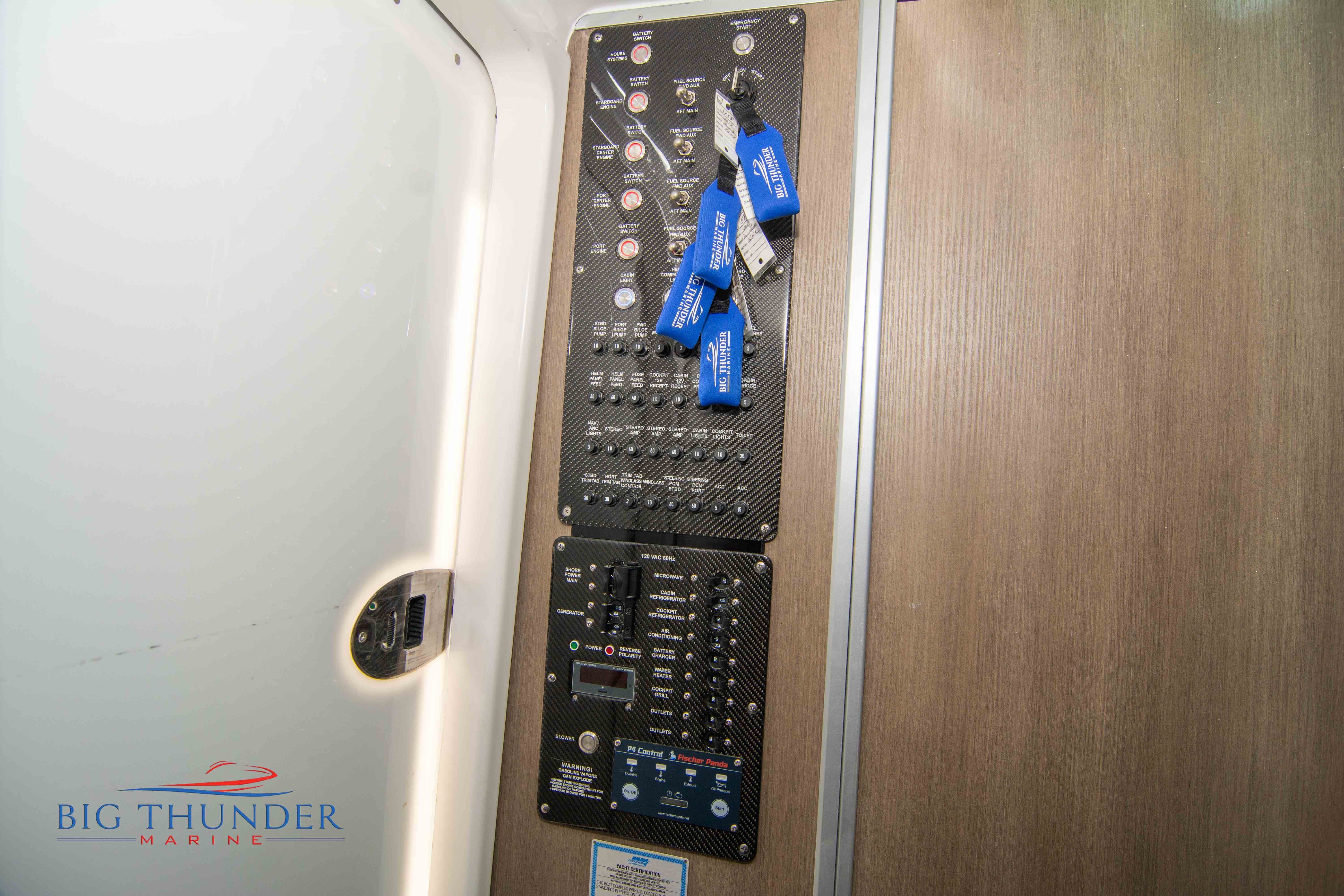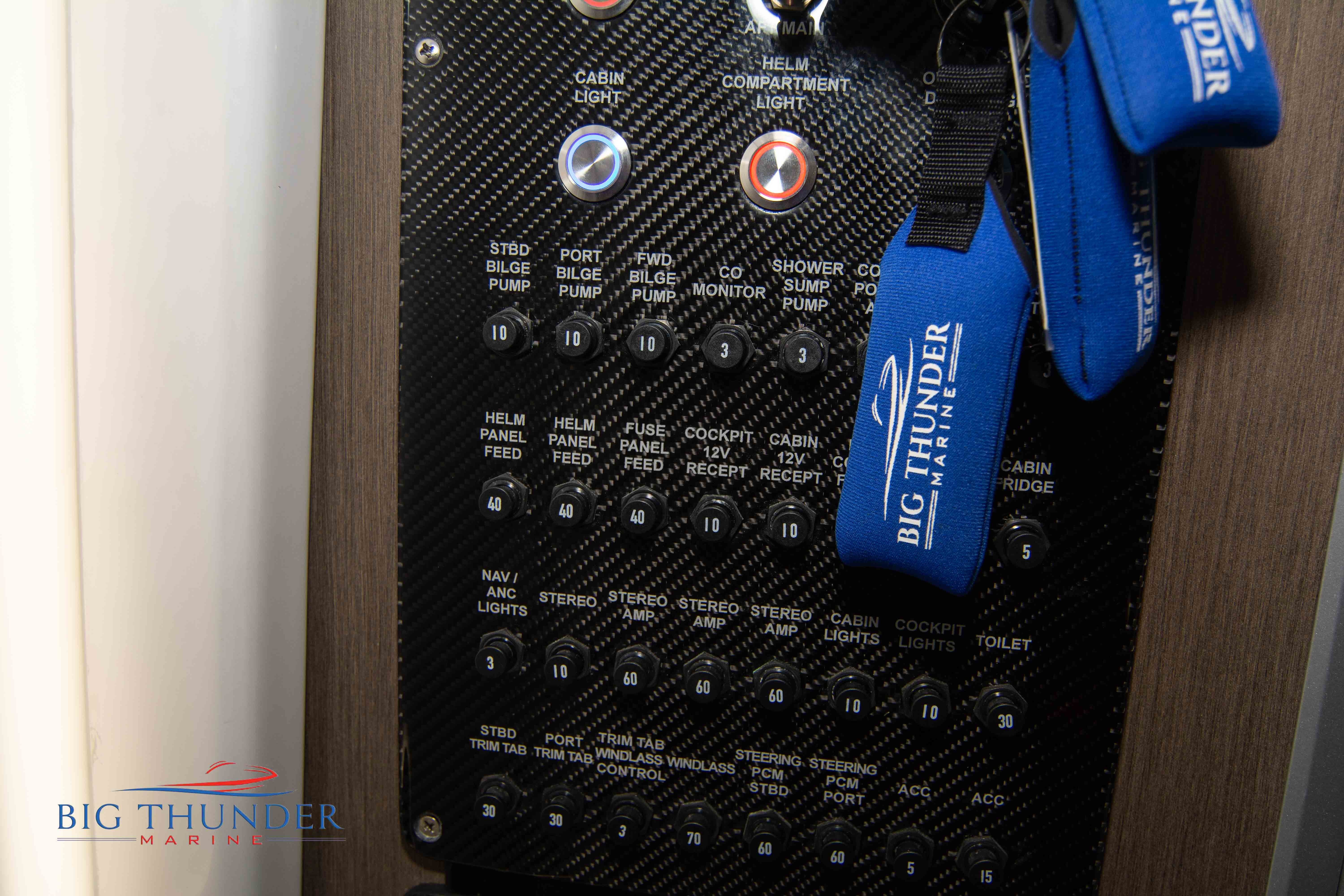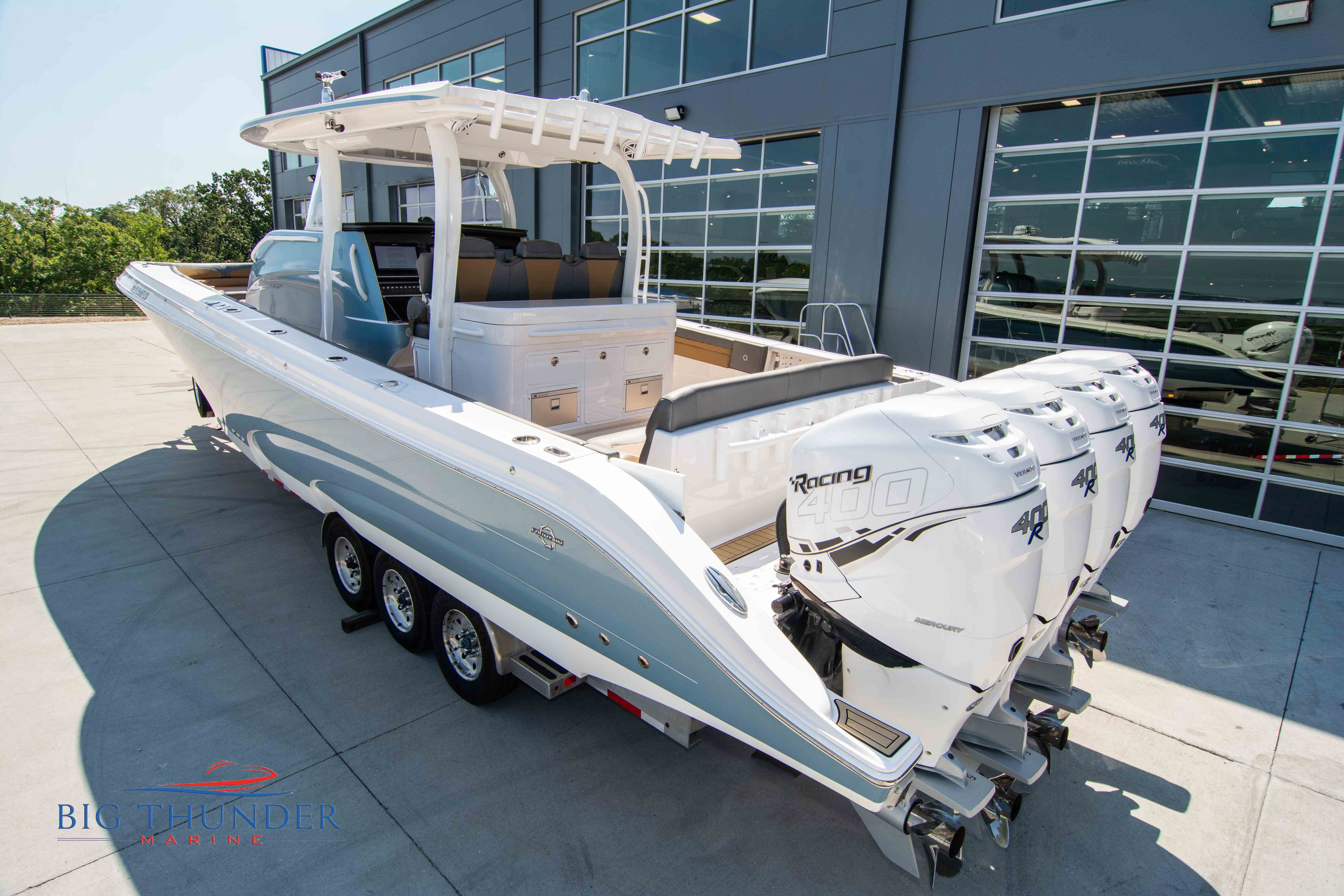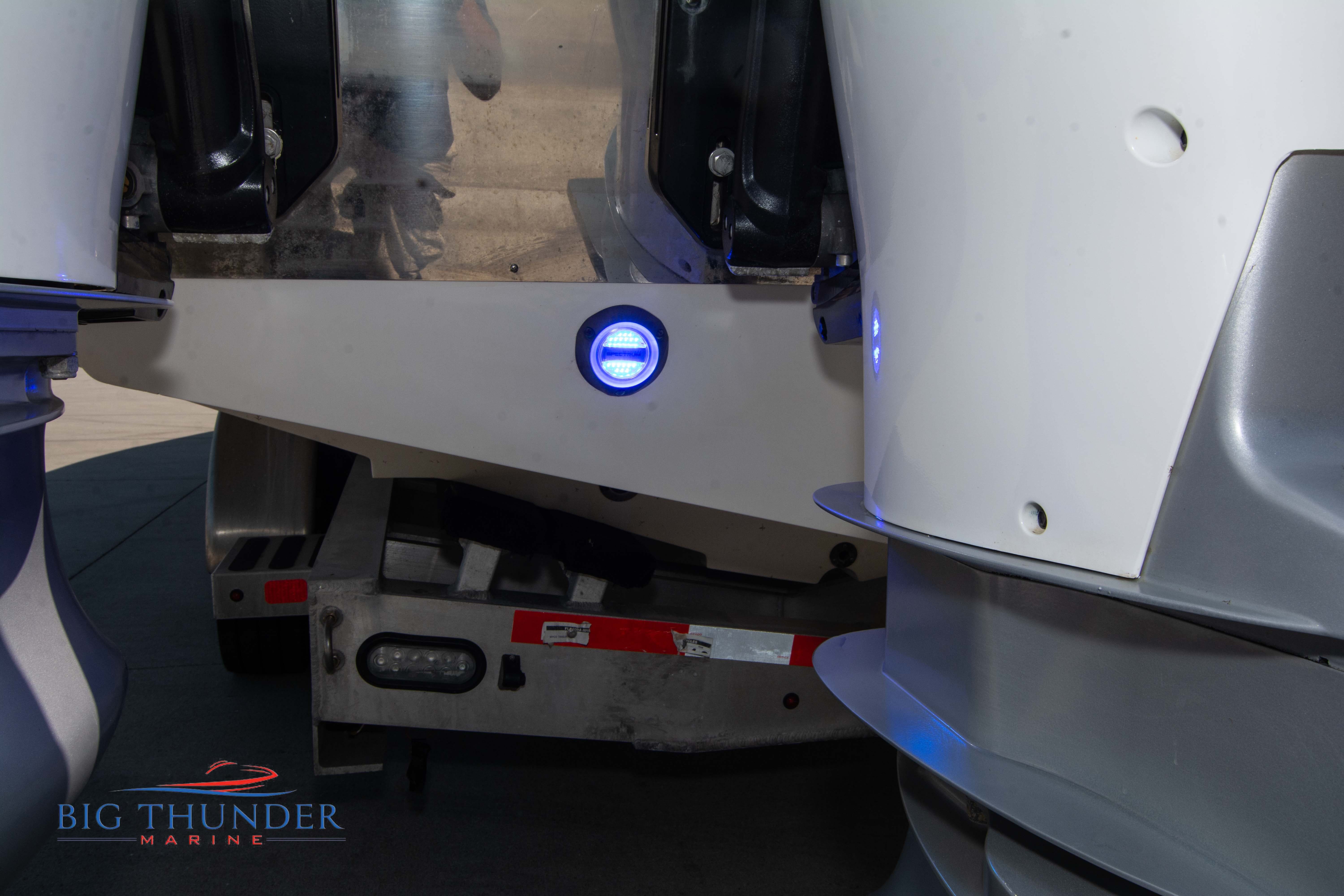 2019 Fountain 43 NX, Quad Verado 400R XM weather, Helm station contains head, sink, large v berth area, AC 30 amp dockside, lithium package w/50’ shore power cable, Mastervolt battery management system, Dive door with telescoping ladder, upgraded JL audio system, marine mat flooring, front lounge area, table, helm seat and dash cover, Triple Simrad 16’ displays, 24 HD domed radar, vhf radio with antenna and auto pilot. XM weather option. Panda diesel 5kw gen. AC/heat in cabin and at helm station. Isotherm refrigerators. Myco aluminium triple axle trailer available.