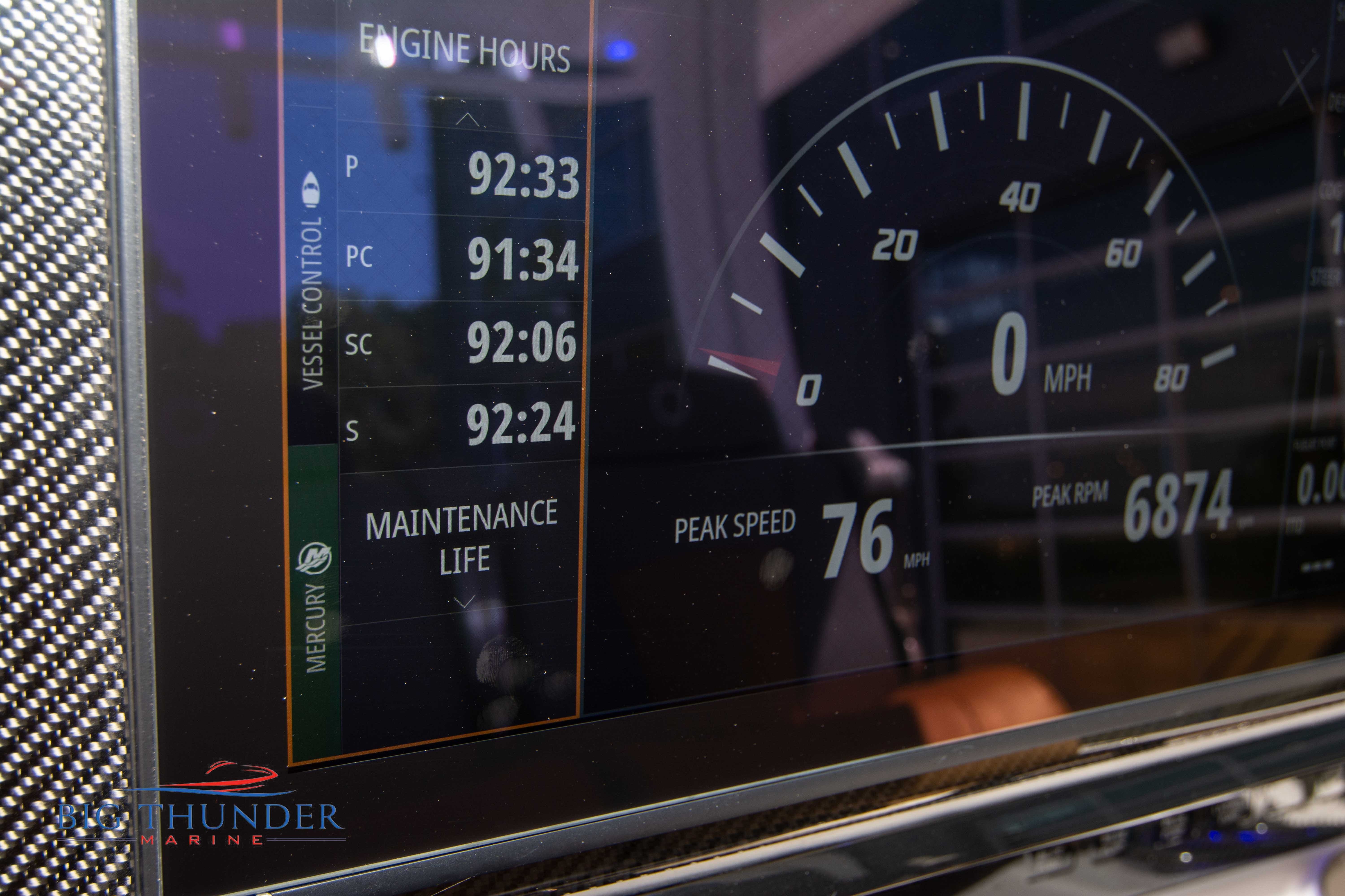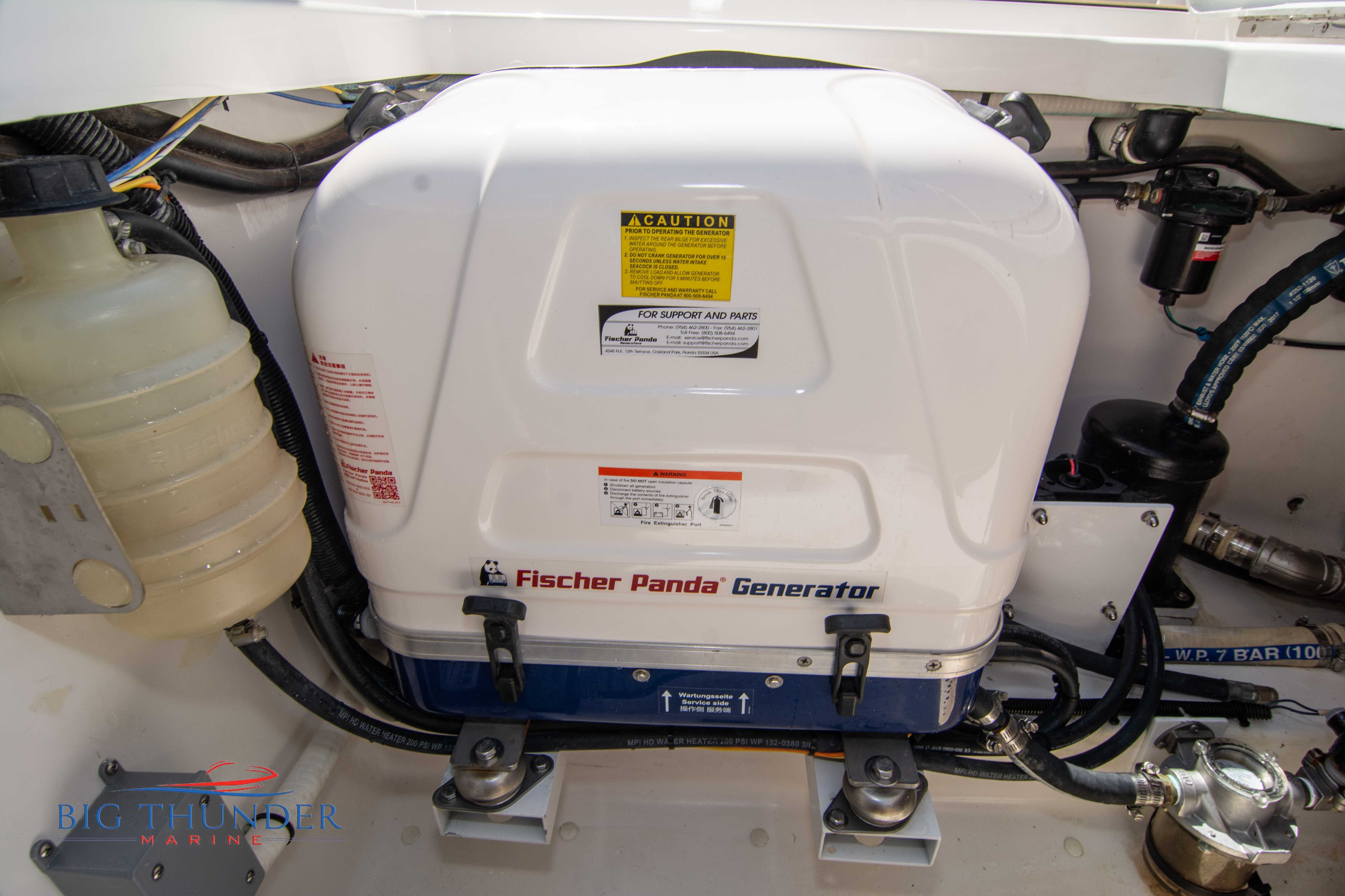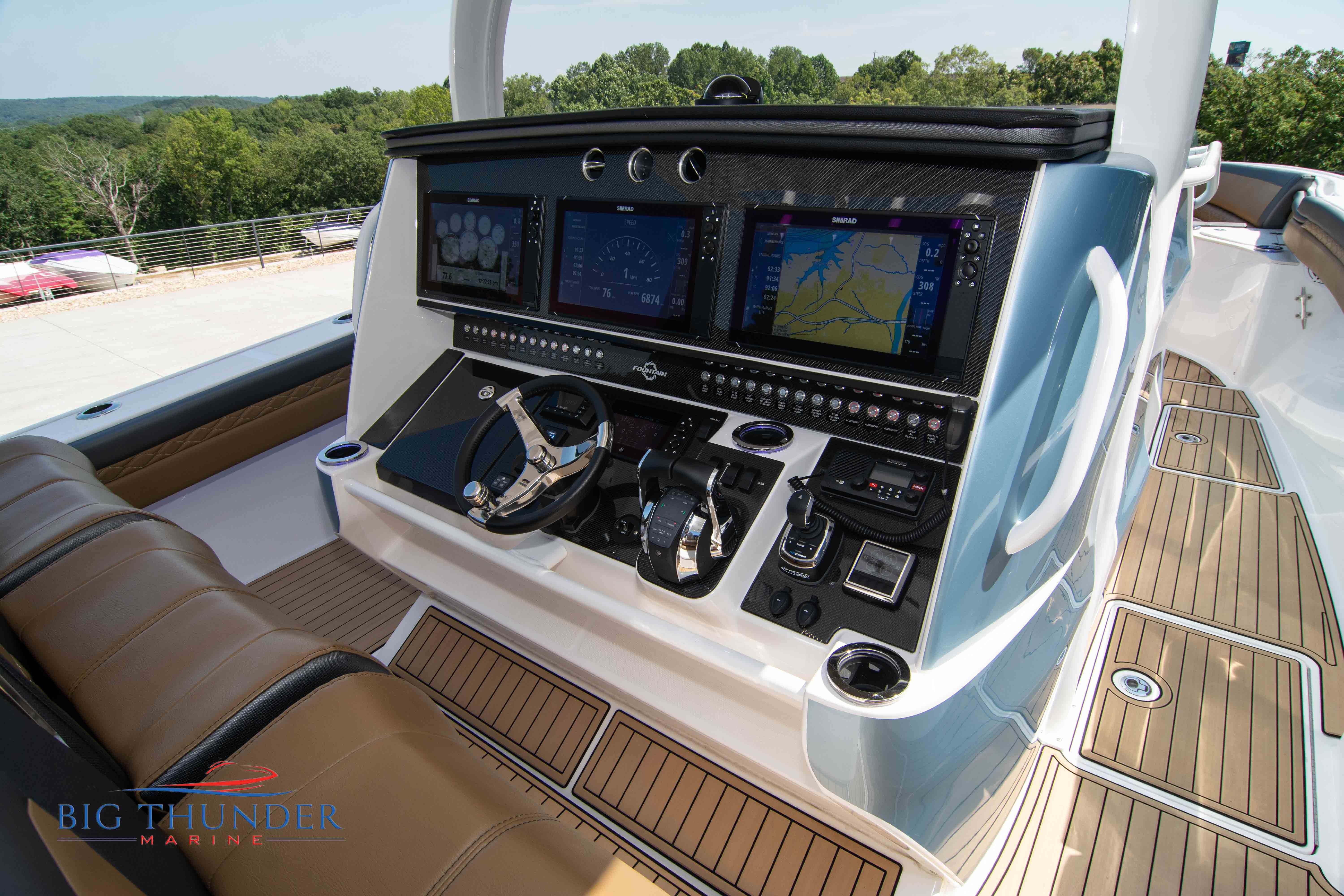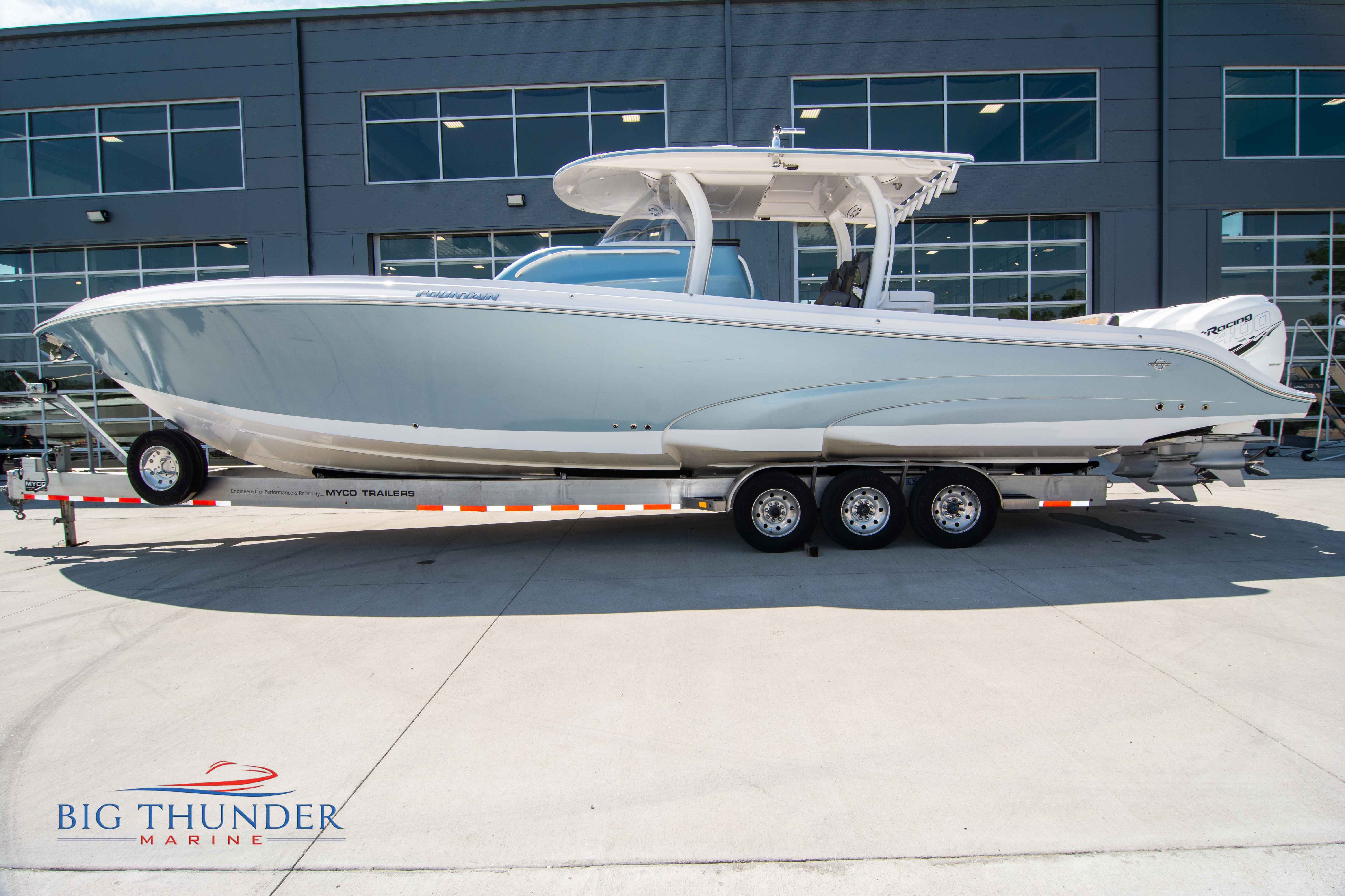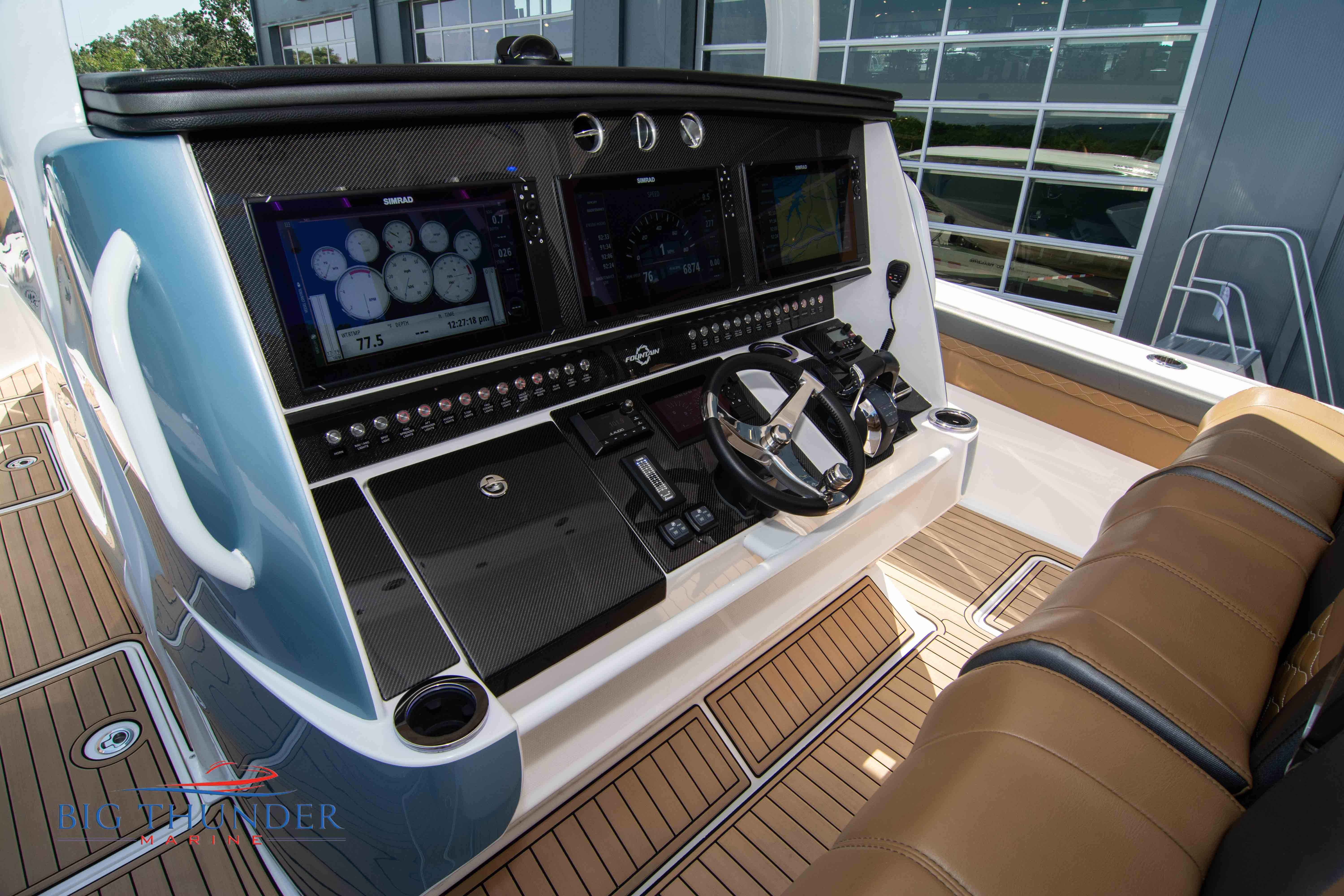 2019 Fountain 43 NX, Quad Verado 400R XM weather, Helm station contains head, sink, large v berth area, AC 30 amp dockside, lithium package w/50’ shore power cable, Mastervolt battery management system, Dive door with telescoping ladder, upgraded JL audio system, marine mat flooring, front lounge area, table, helm seat and dash cover, Triple Simrad 16’ displays, 24 HD domed radar, vhf radio with antenna and auto pilot. XM weather option. Panda diesel 5kw gen. AC/heat in cabin and at helm station. Isotherm refrigerators. Myco aluminium triple axle trailer available.