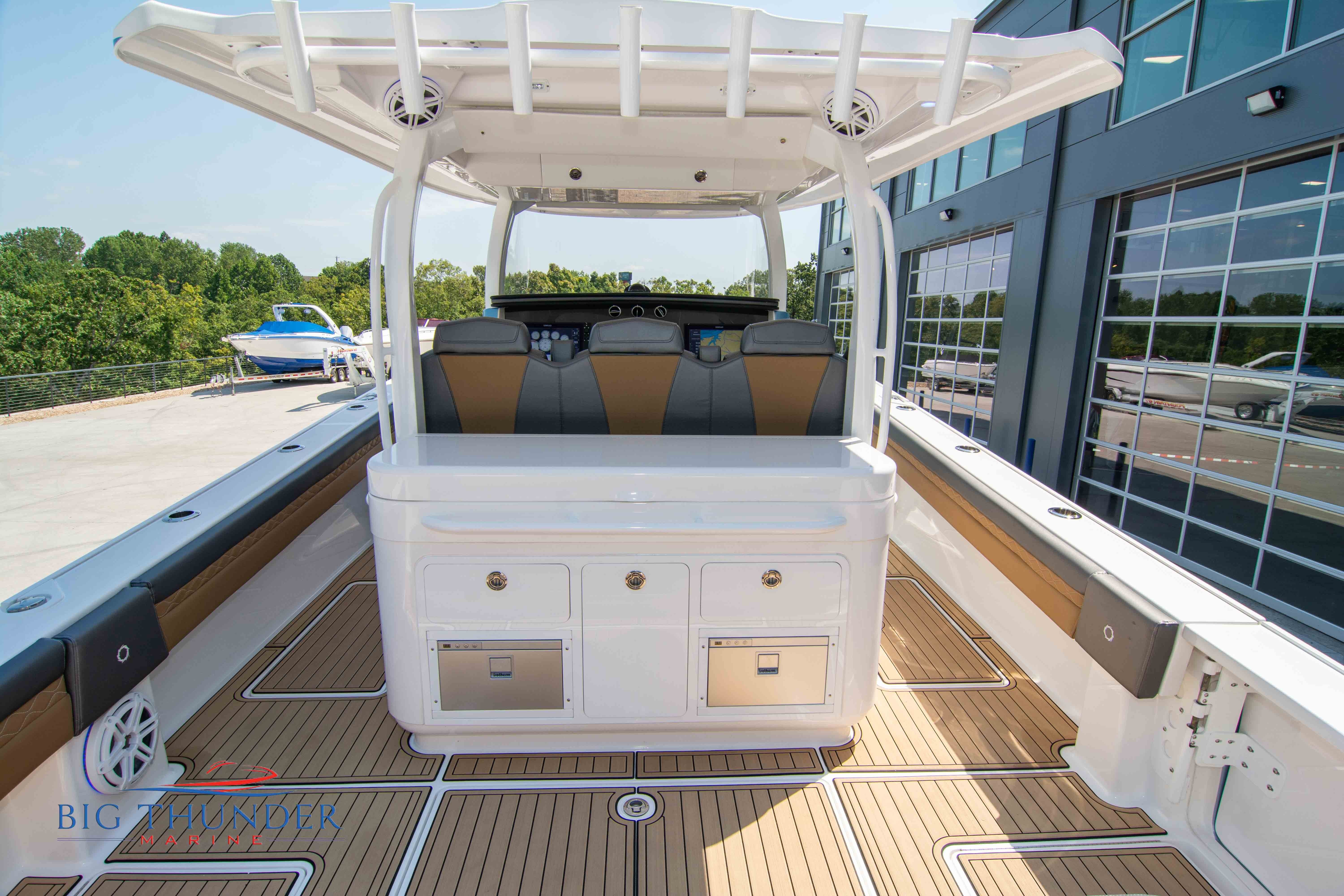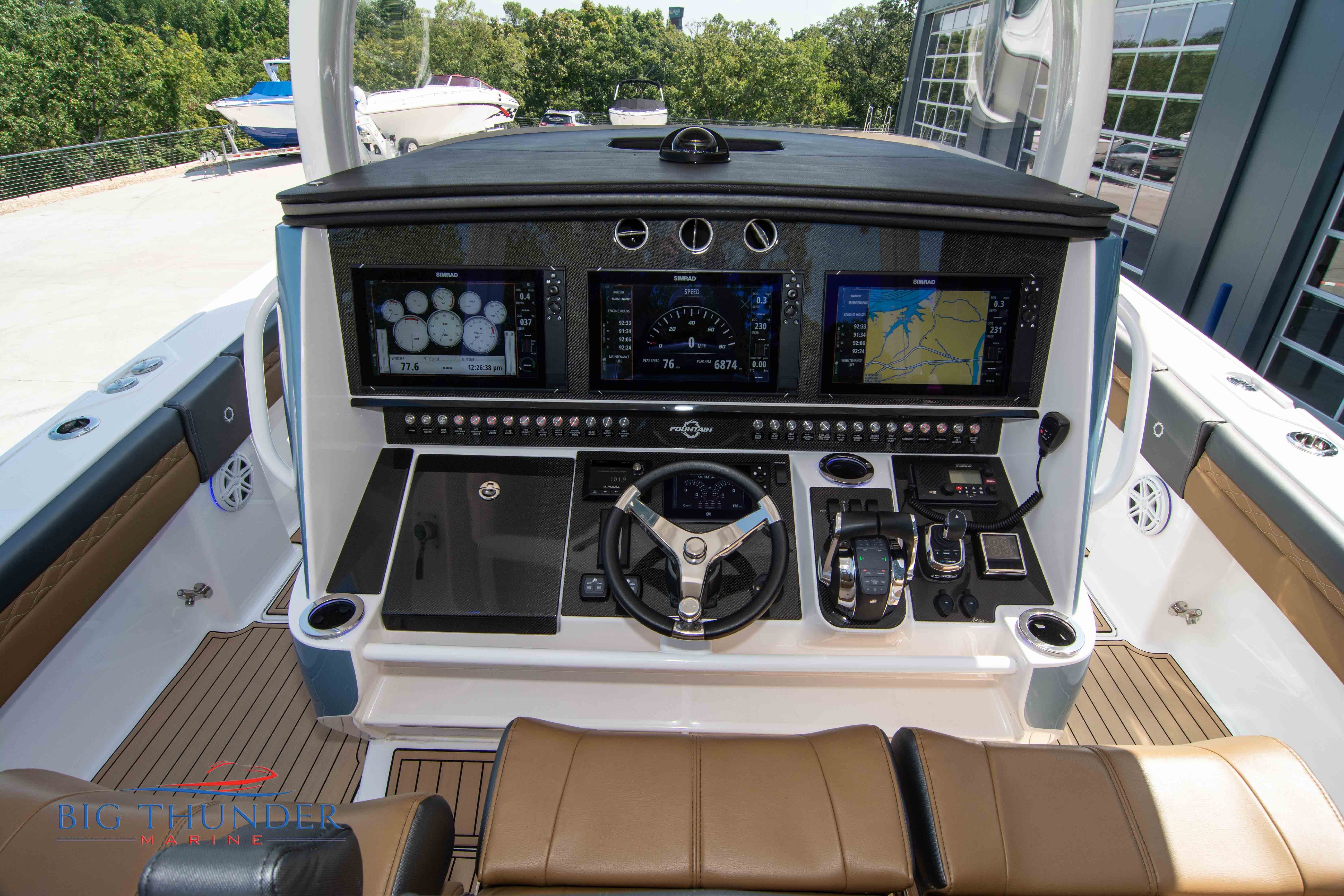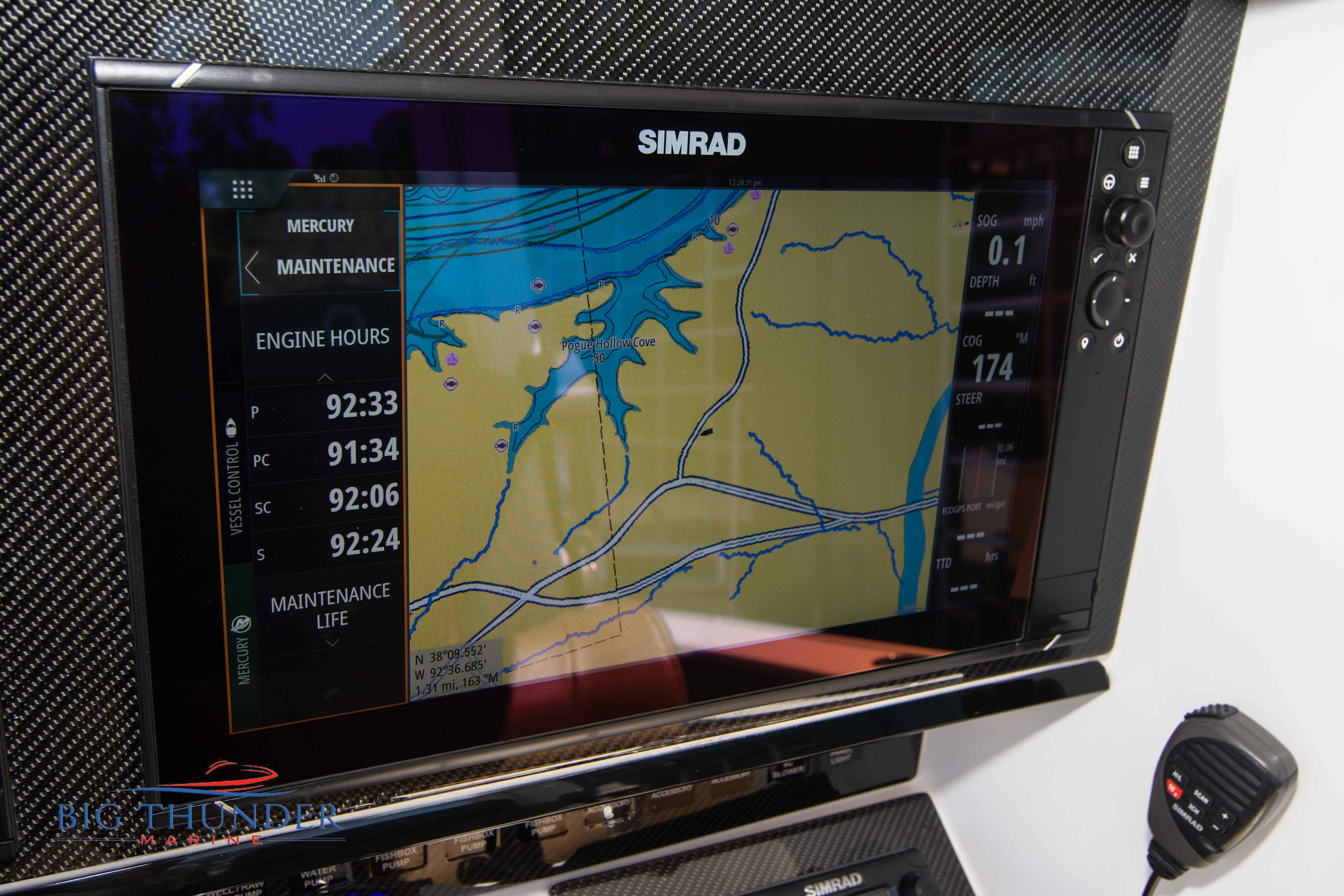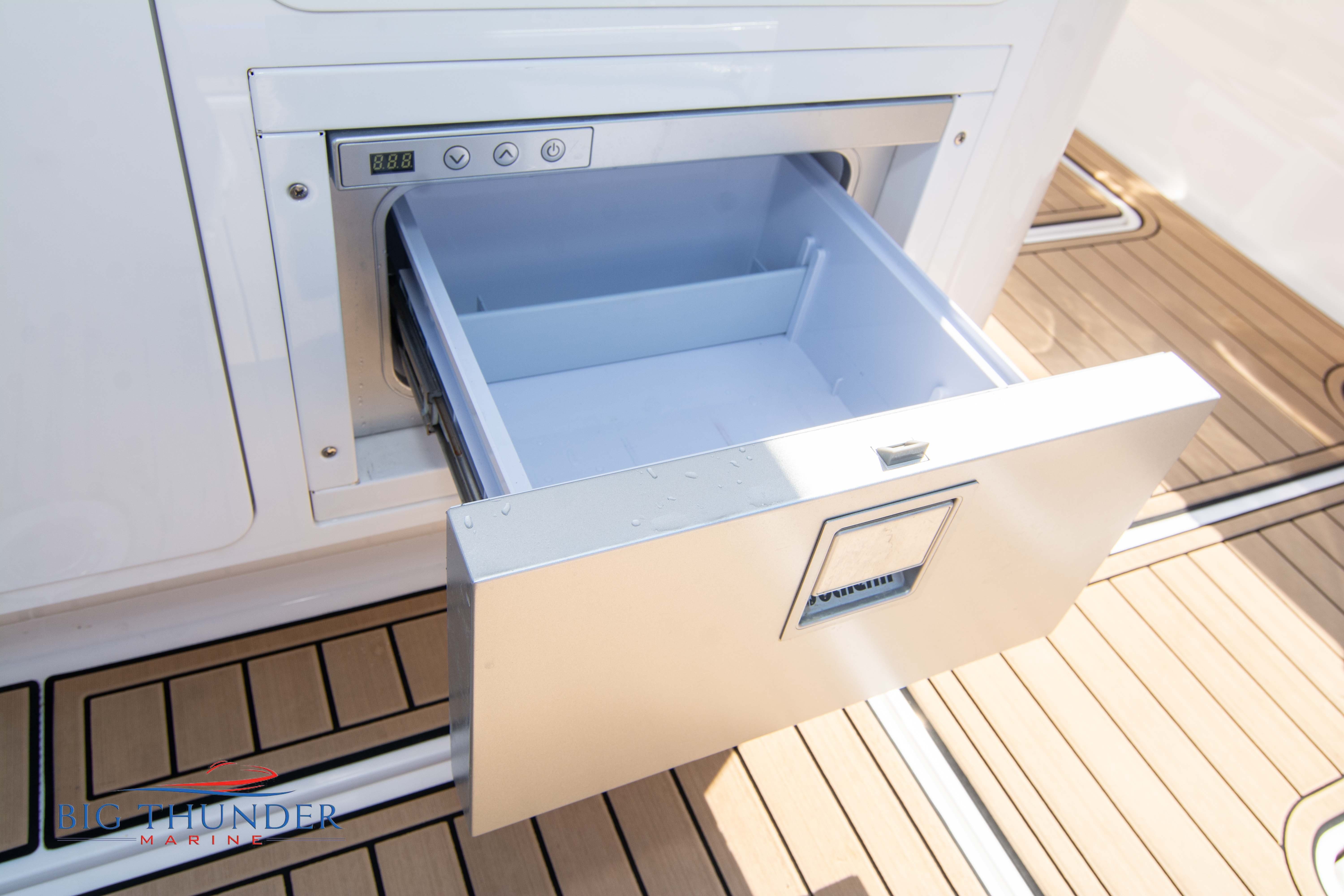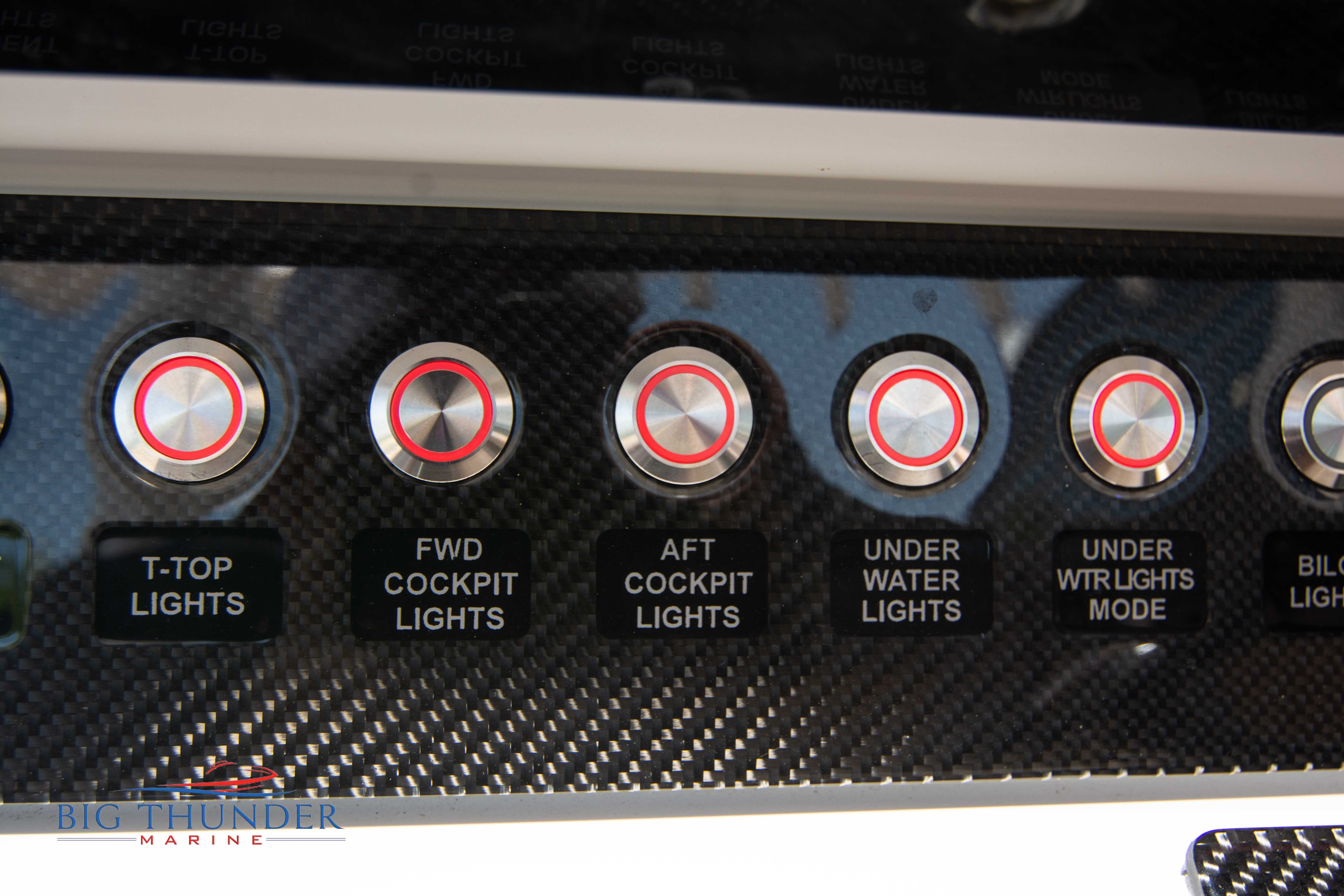 2019 Fountain 43 NX, Quad Verado 400R XM weather, Helm station contains head, sink, large v berth area, AC 30 amp dockside, lithium package w/50’ shore power cable, Mastervolt battery management system, Dive door with telescoping ladder, upgraded JL audio system, marine mat flooring, front lounge area, table, helm seat and dash cover, Triple Simrad 16’ displays, 24 HD domed radar, vhf radio with antenna and auto pilot. XM weather option. Panda diesel 5kw gen. AC/heat in cabin and at helm station. Isotherm refrigerators. Myco aluminium triple axle trailer available.
