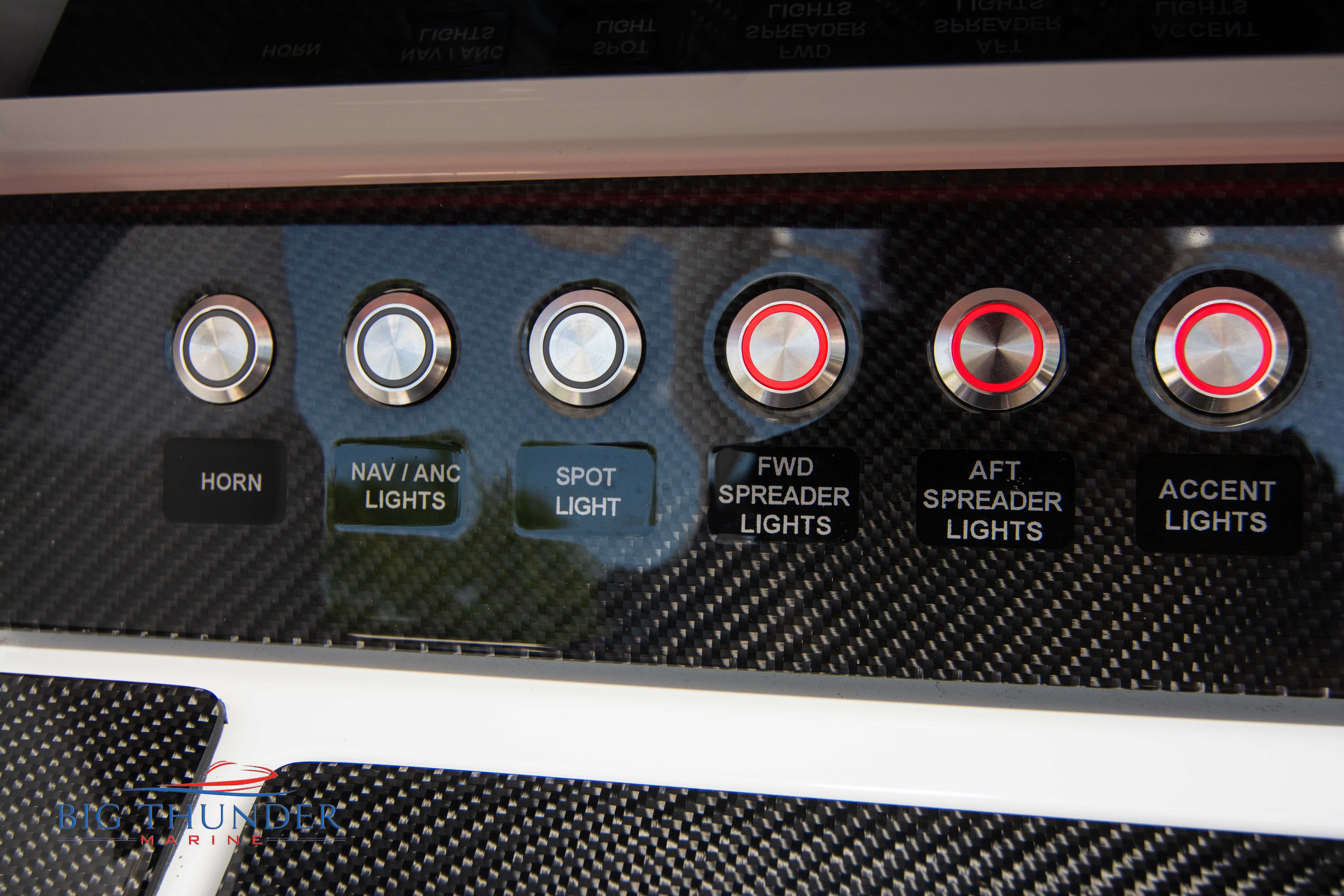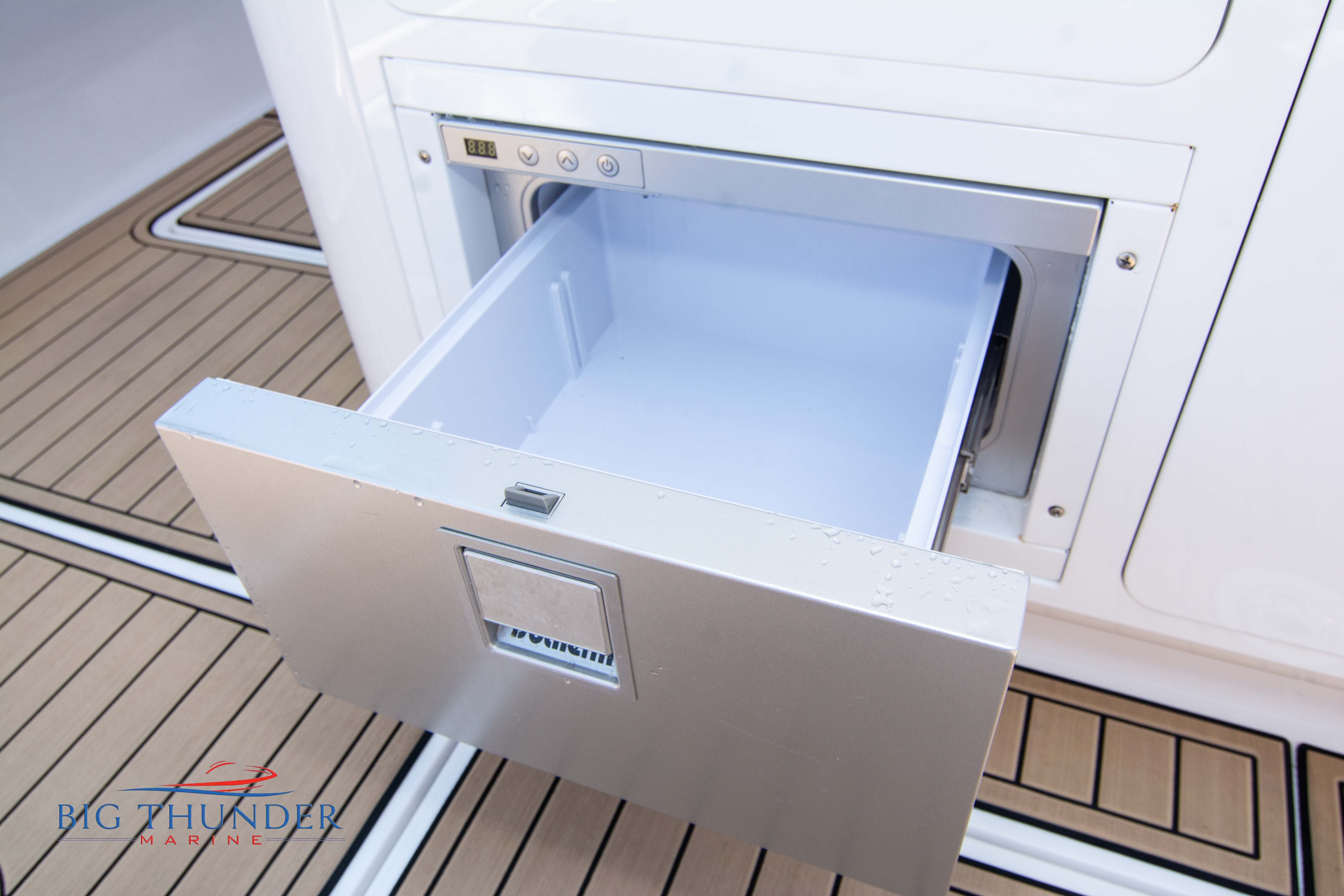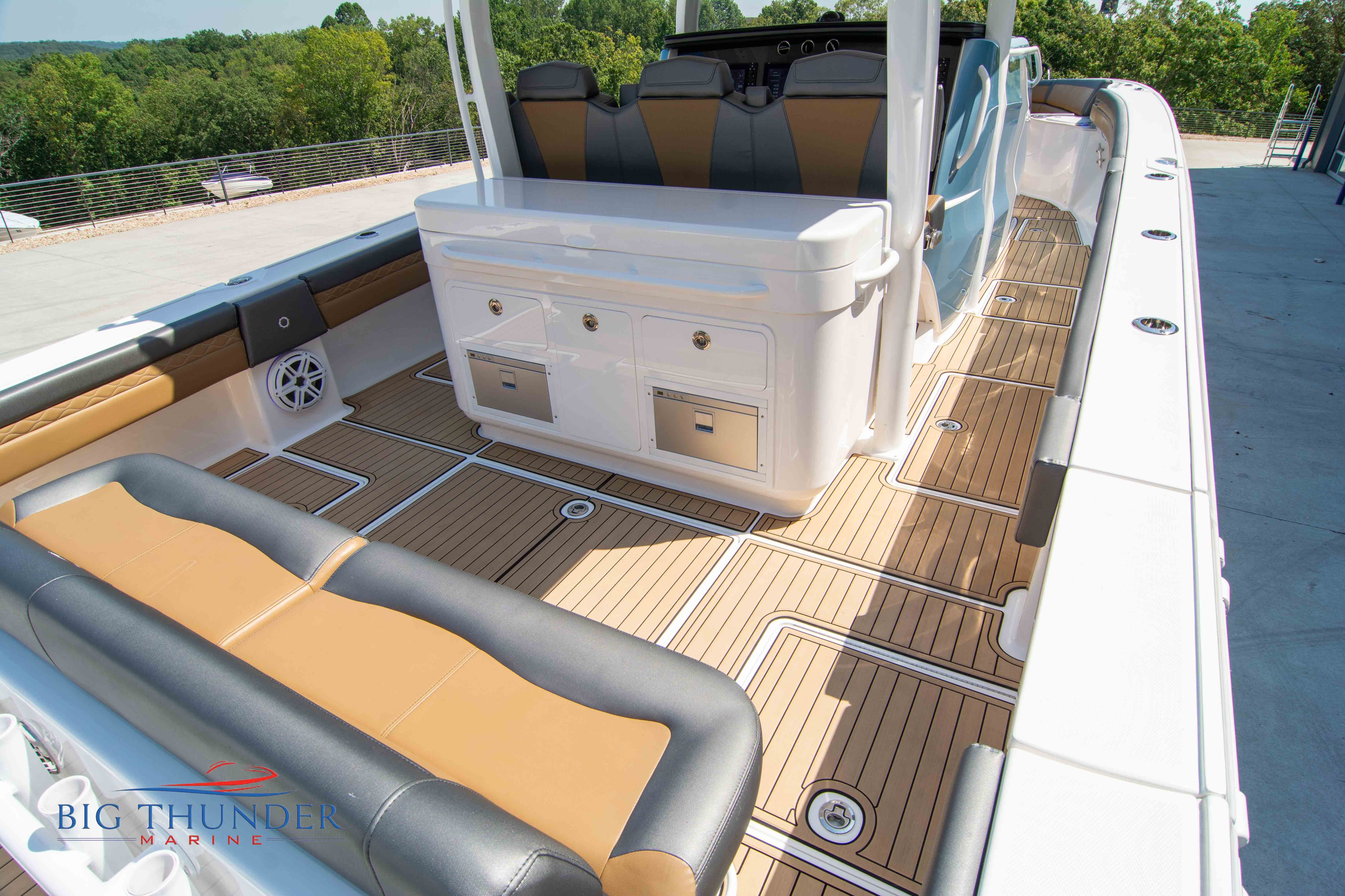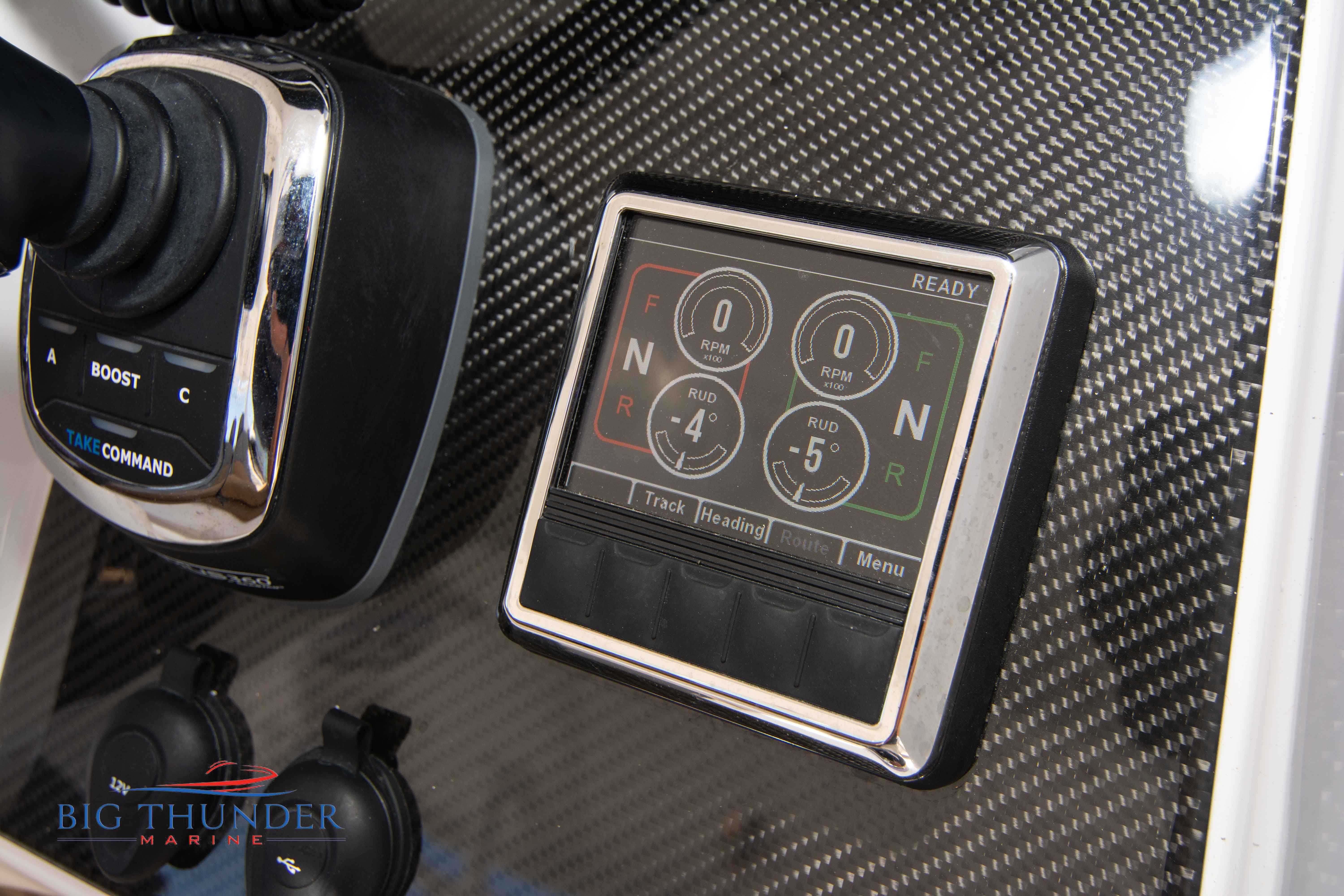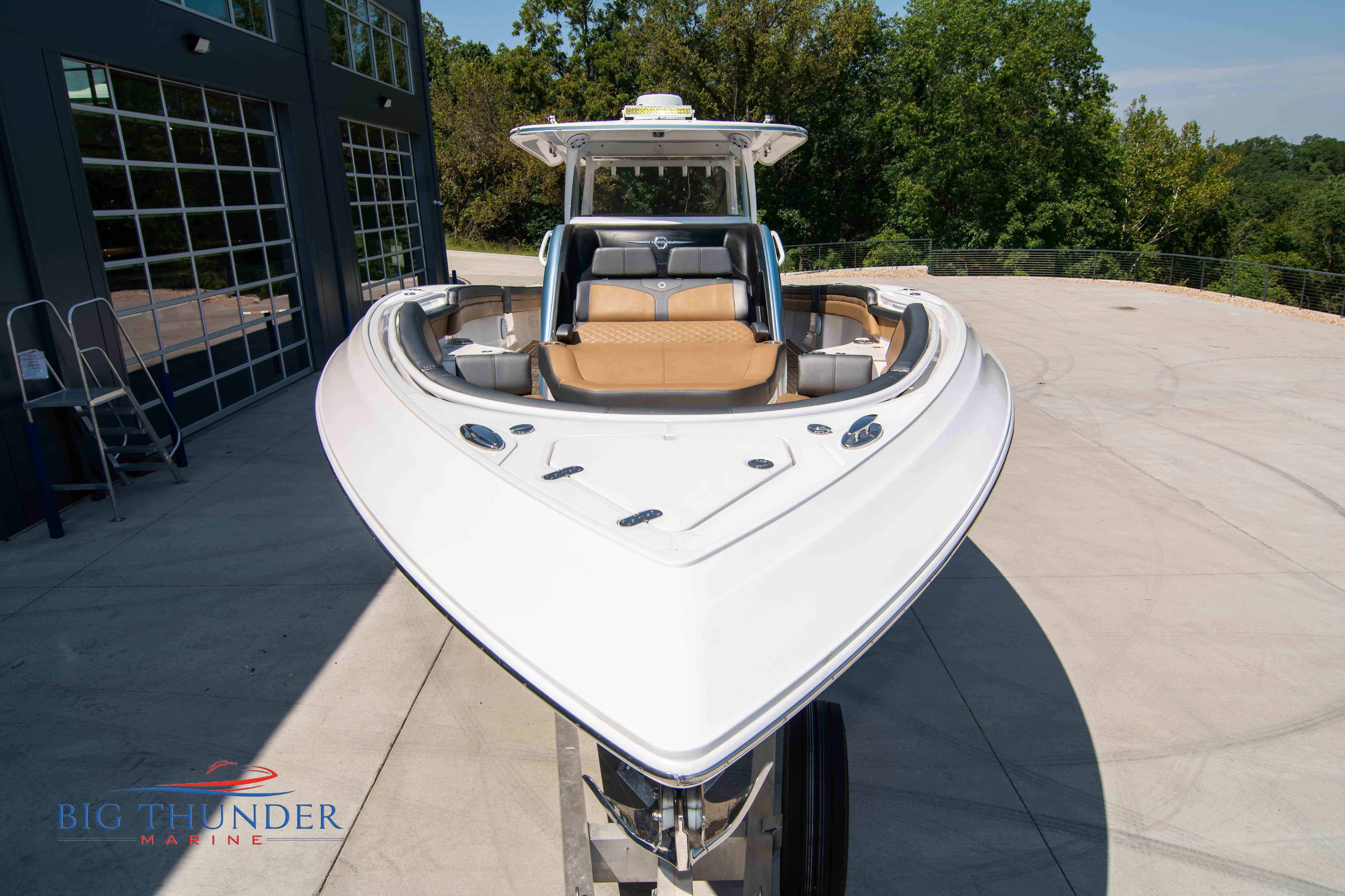 2019 Fountain 43 NX, Quad Verado 400R XM weather, Helm station contains head, sink, large v berth area, AC 30 amp dockside, lithium package w/50’ shore power cable, Mastervolt battery management system, Dive door with telescoping ladder, upgraded JL audio system, marine mat flooring, front lounge area, table, helm seat and dash cover, Triple Simrad 16’ displays, 24 HD domed radar, vhf radio with antenna and auto pilot. XM weather option. Panda diesel 5kw gen. AC/heat in cabin and at helm station. Isotherm refrigerators. Myco aluminium triple axle trailer available.