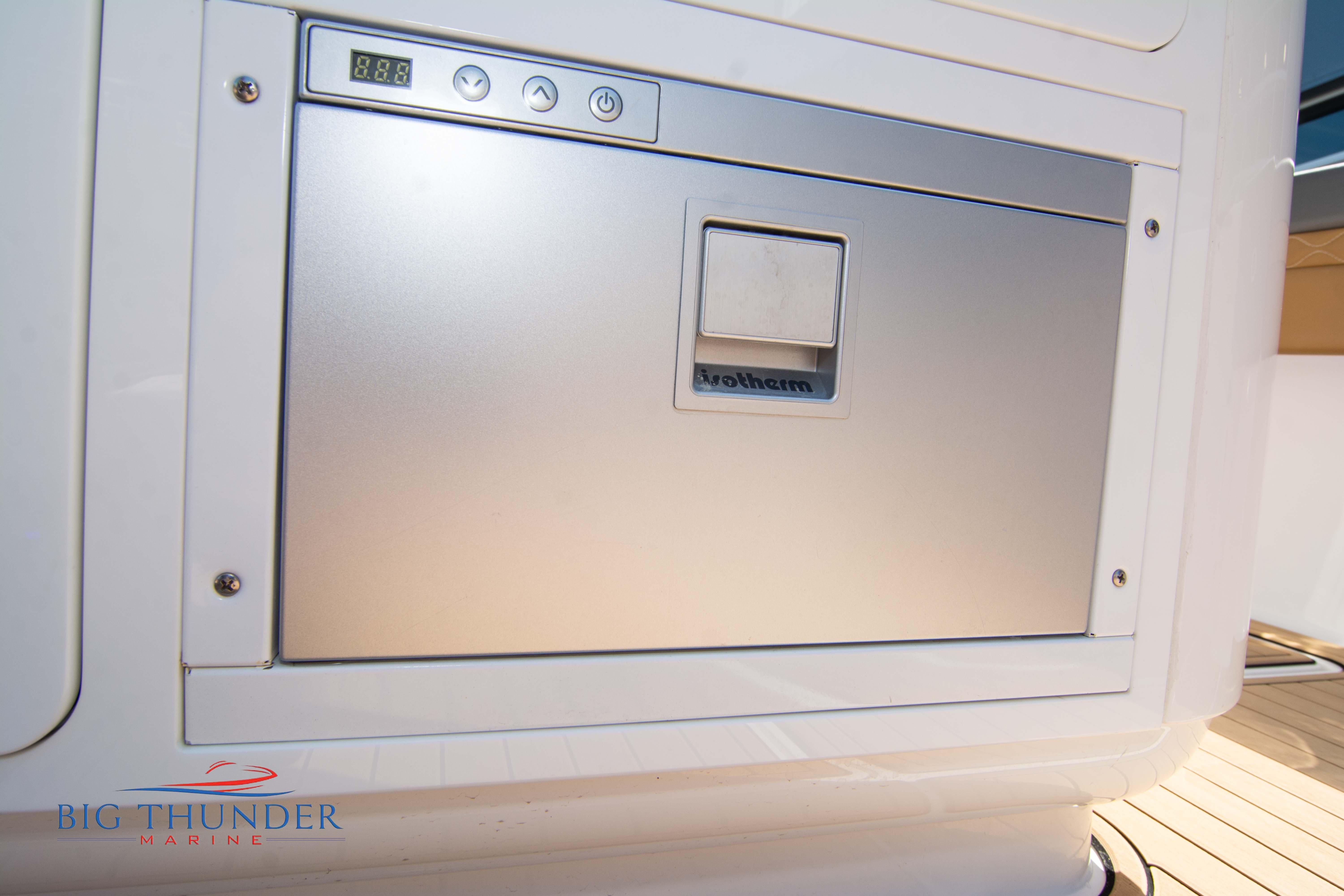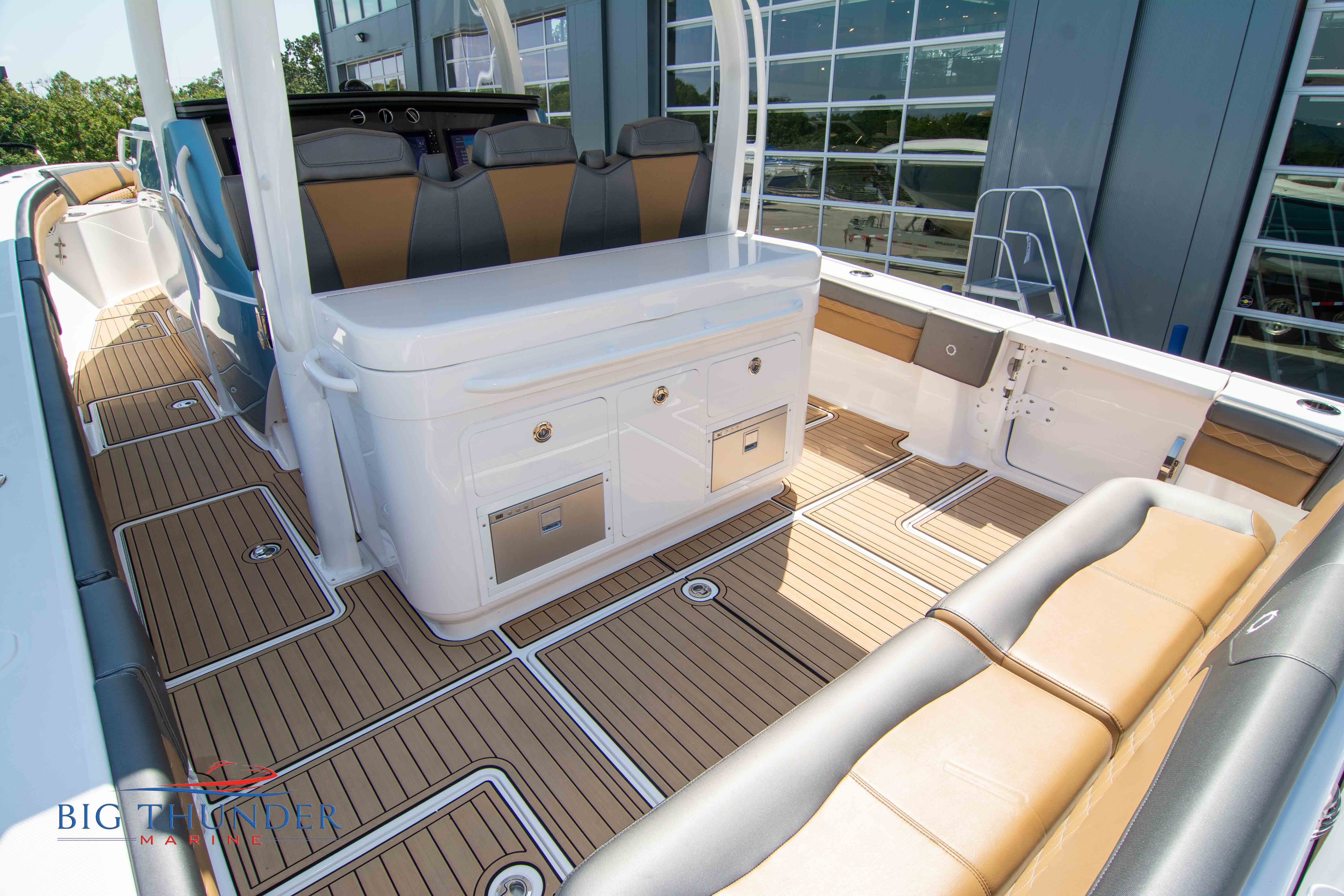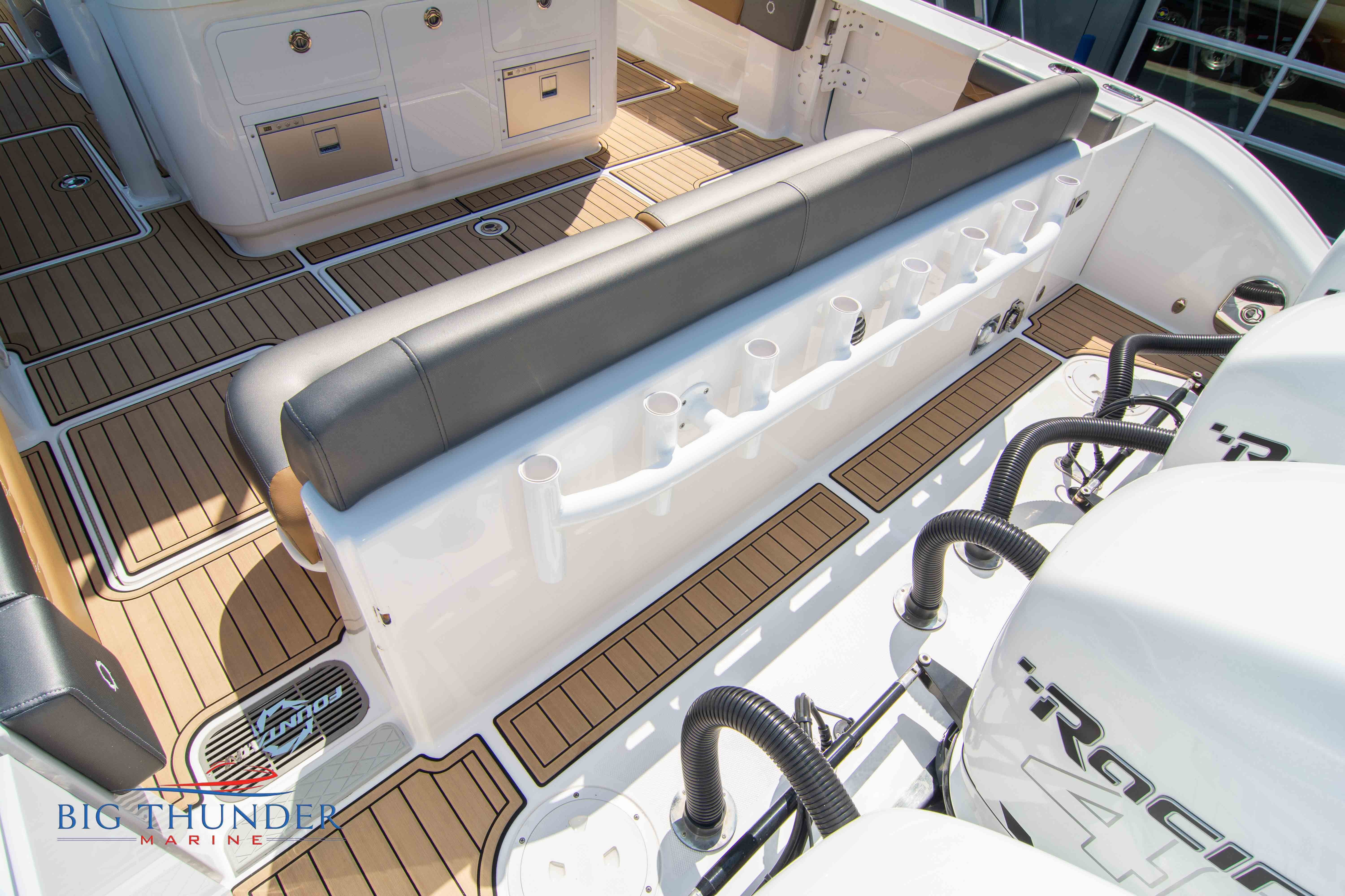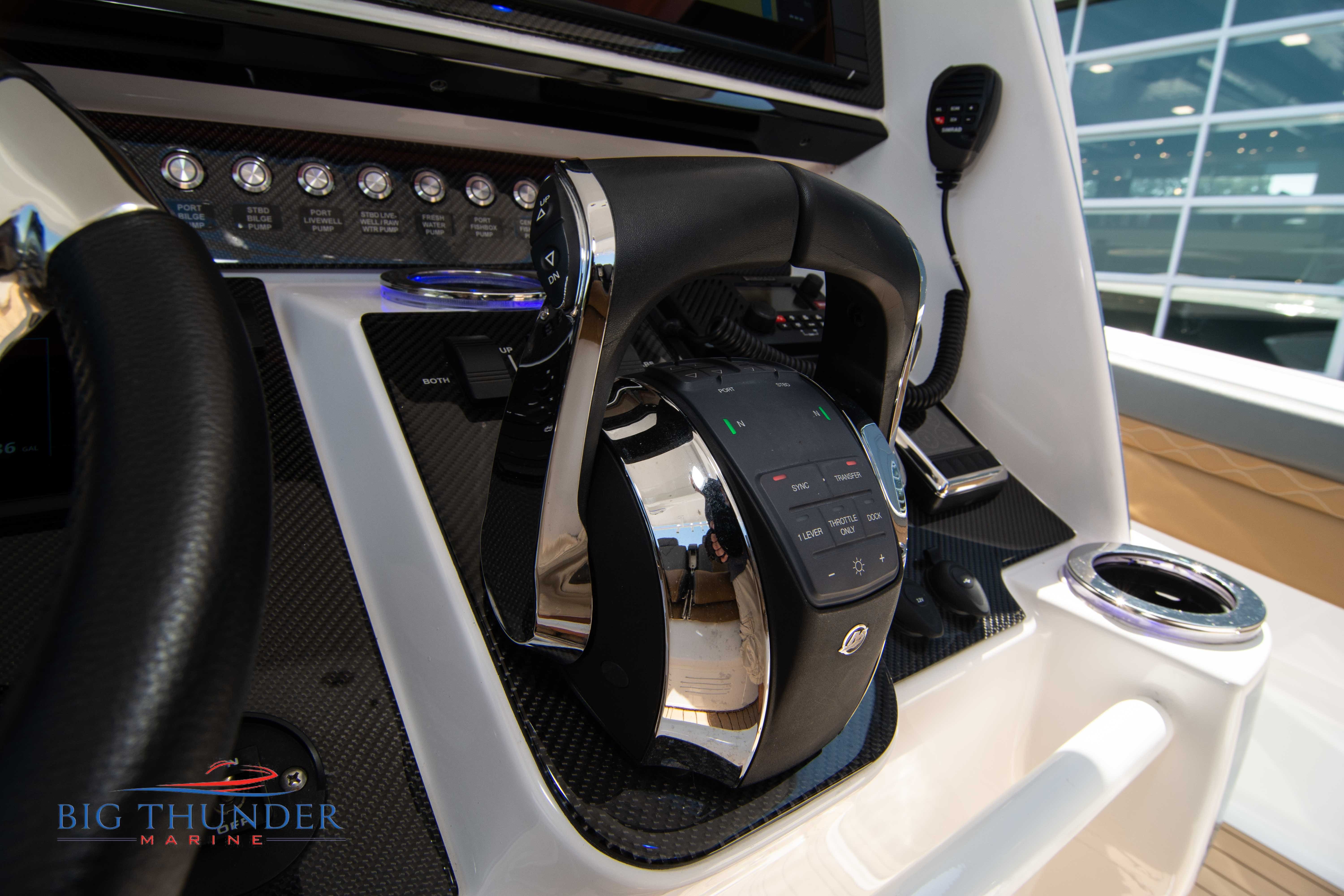 2019 Fountain 43 NX, Quad Verado 400R XM weather, Helm station contains head, sink, large v berth area, AC 30 amp dockside, lithium package w/50’ shore power cable, Mastervolt battery management system, Dive door with telescoping ladder, upgraded JL audio system, marine mat flooring, front lounge area, table, helm seat and dash cover, Triple Simrad 16’ displays, 24 HD domed radar, vhf radio with antenna and auto pilot. XM weather option. Panda diesel 5kw gen. AC/heat in cabin and at helm station. Isotherm refrigerators. Myco aluminium triple axle trailer available.