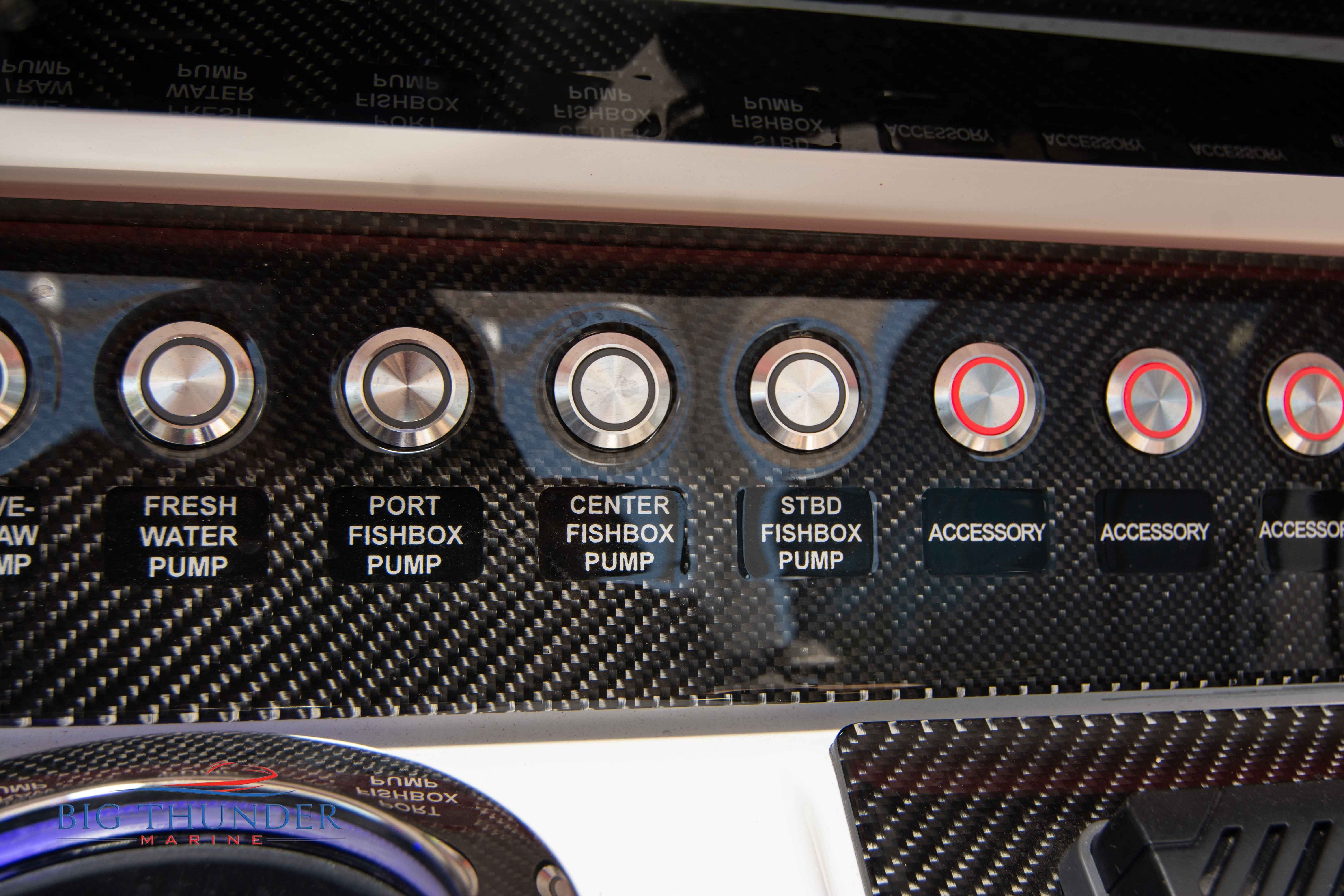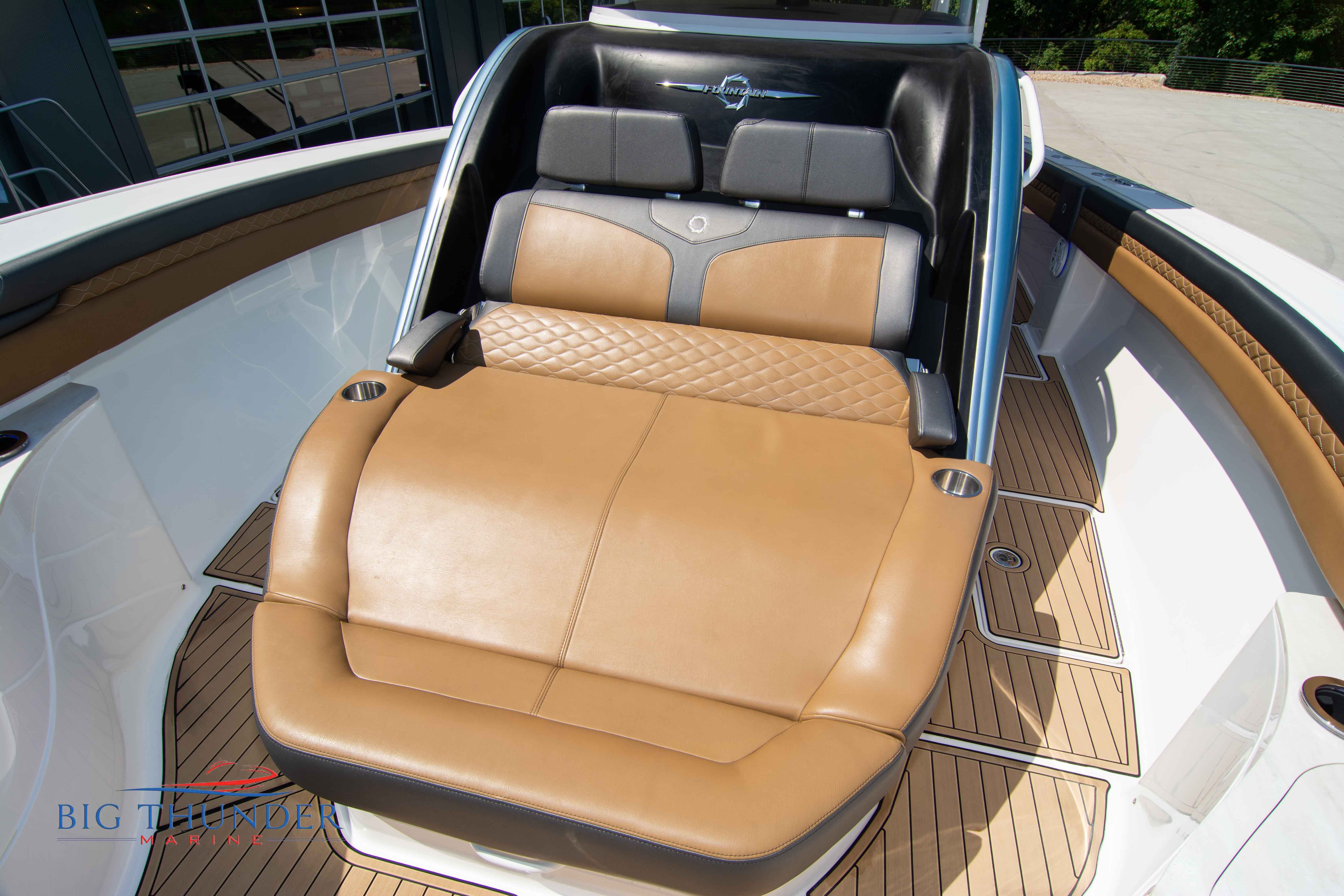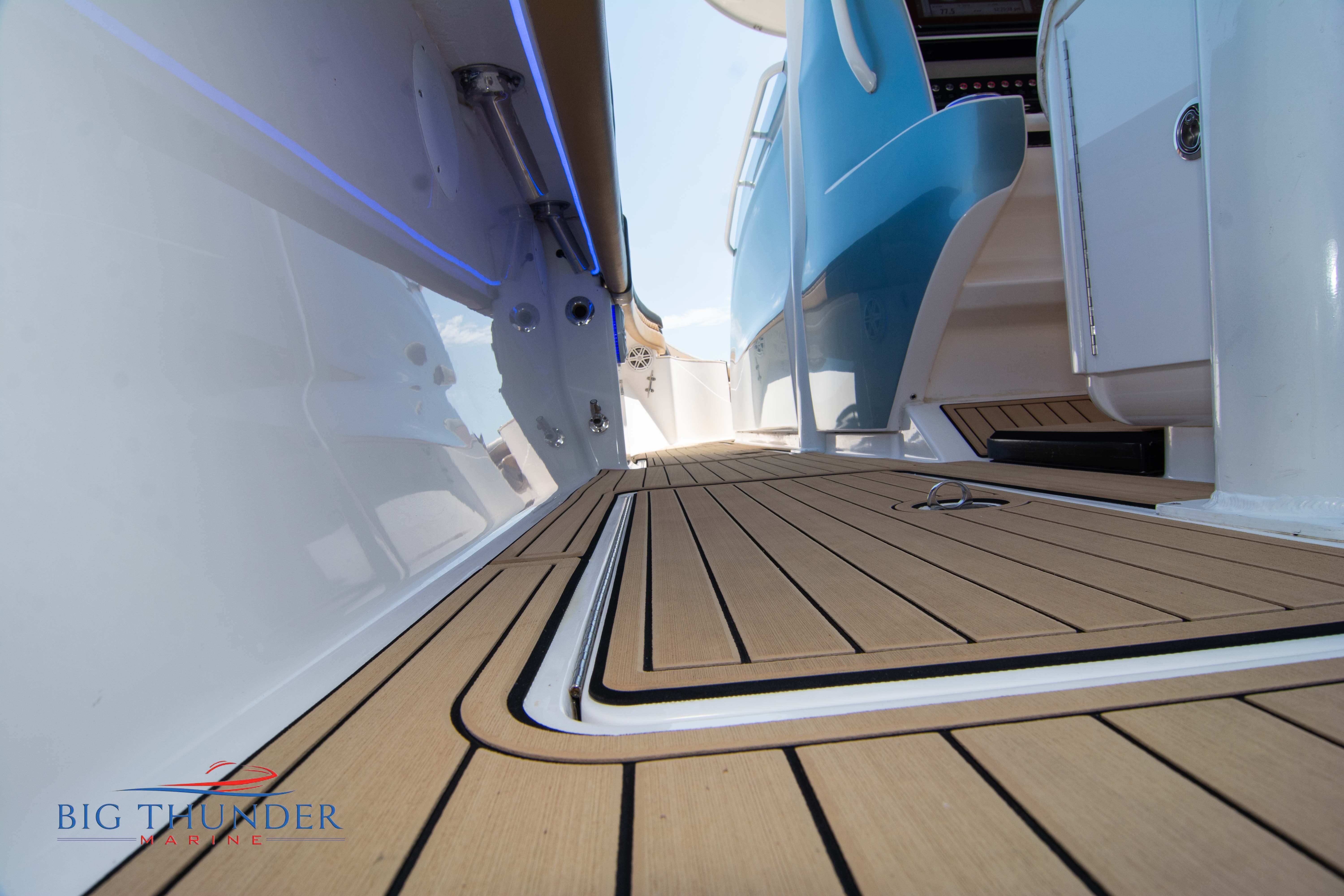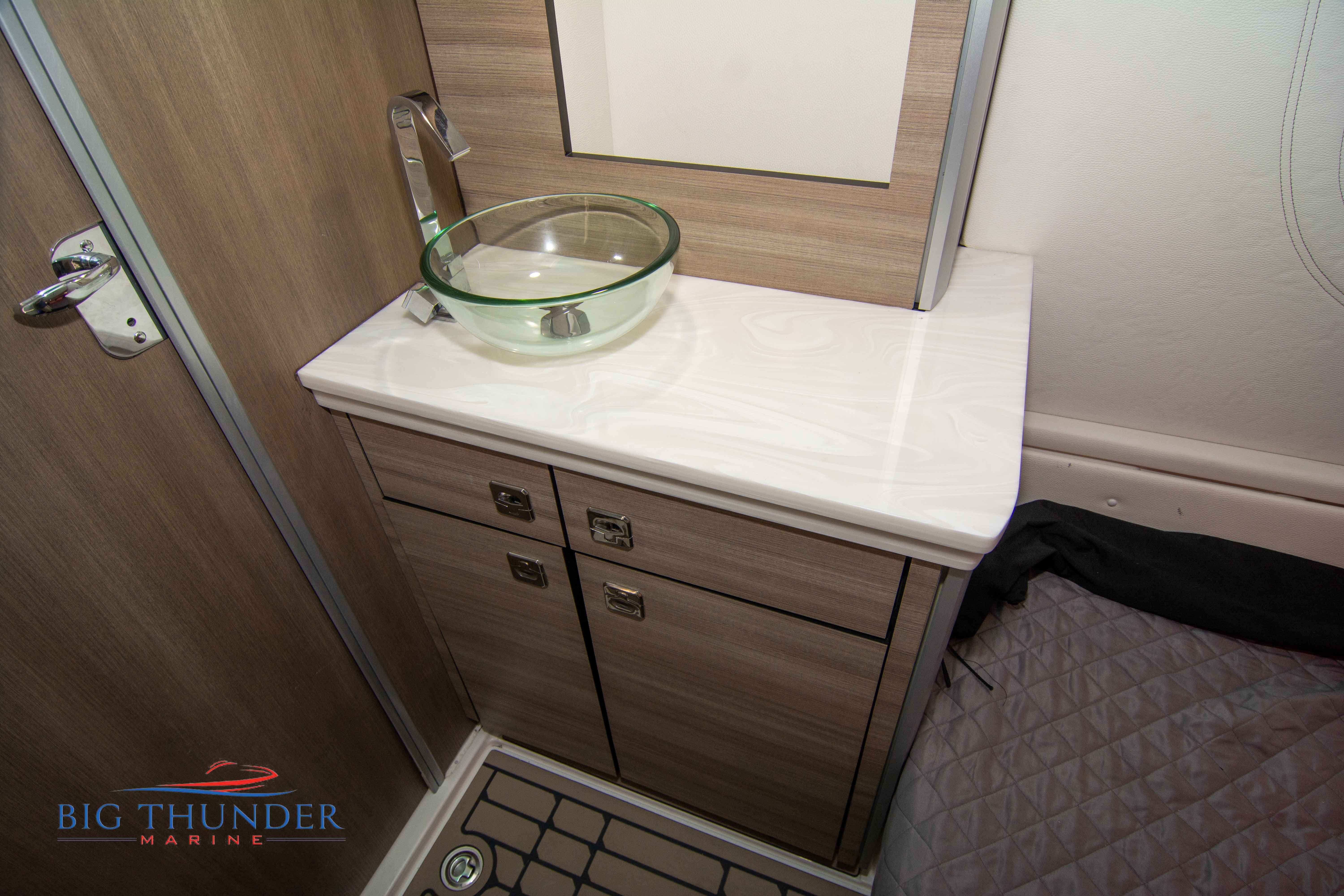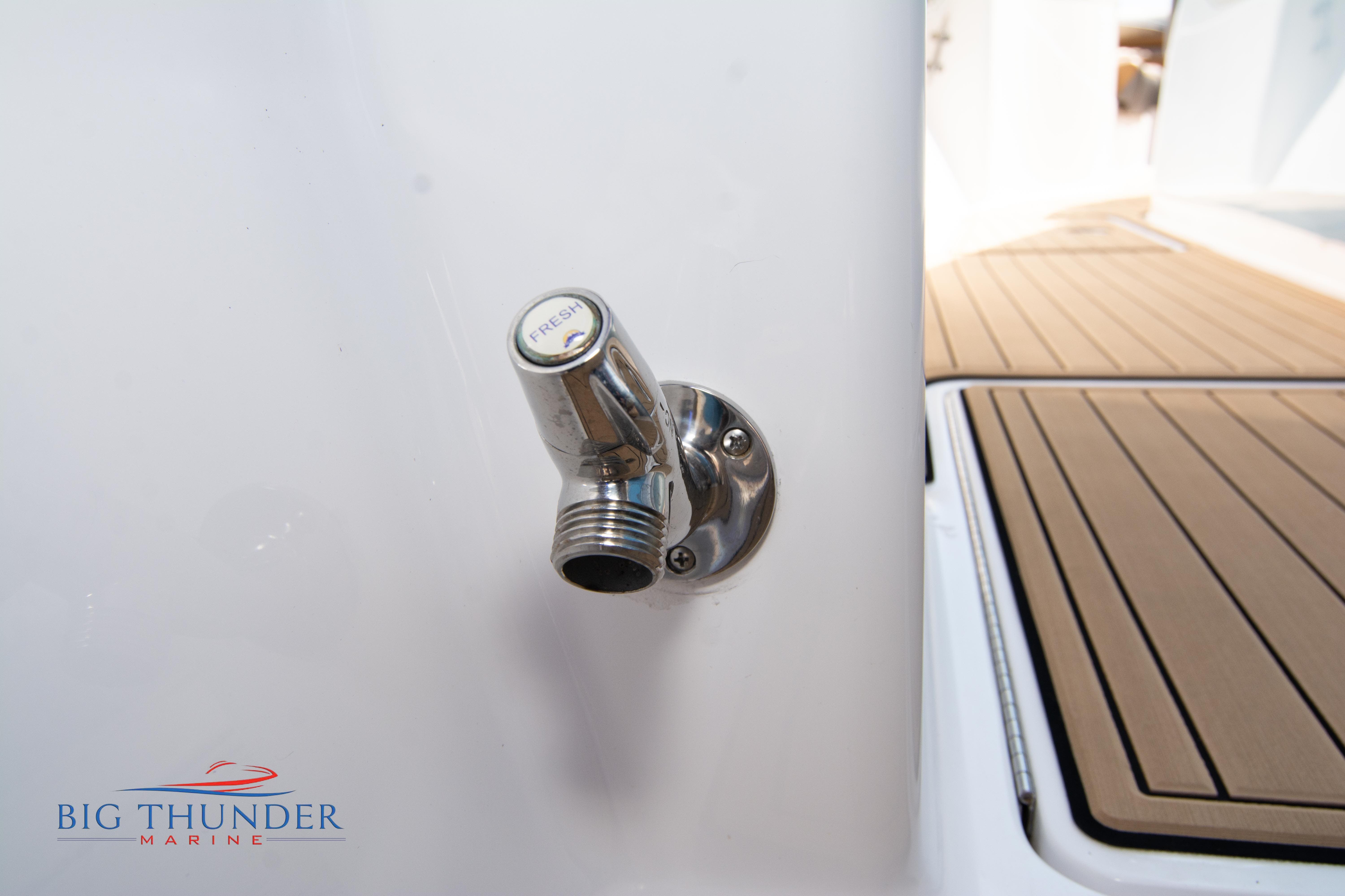2019 Fountain 43 NX, Quad Verado 400R XM weather, Helm station contains head, sink, large v berth area, AC 30 amp dockside, lithium package w/50’ shore power cable, Mastervolt battery management system, Dive door with telescoping ladder, upgraded JL audio system, marine mat flooring, front lounge area, table, helm seat and dash cover, Triple Simrad 16’ displays, 24 HD domed radar, vhf radio with antenna and auto pilot. XM weather option. Panda diesel 5kw gen. AC/heat in cabin and at helm station. Isotherm refrigerators. Myco aluminium triple axle trailer available.