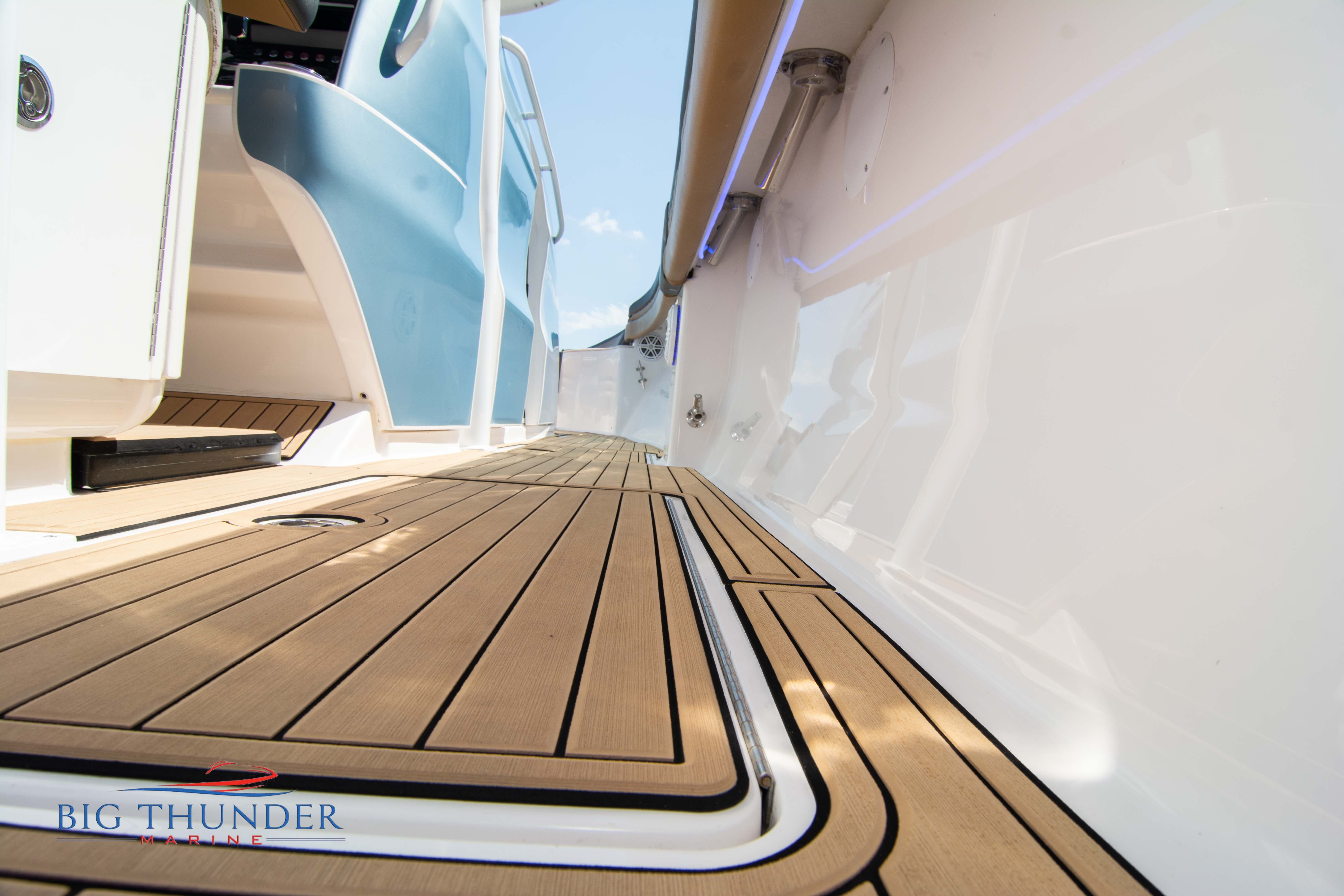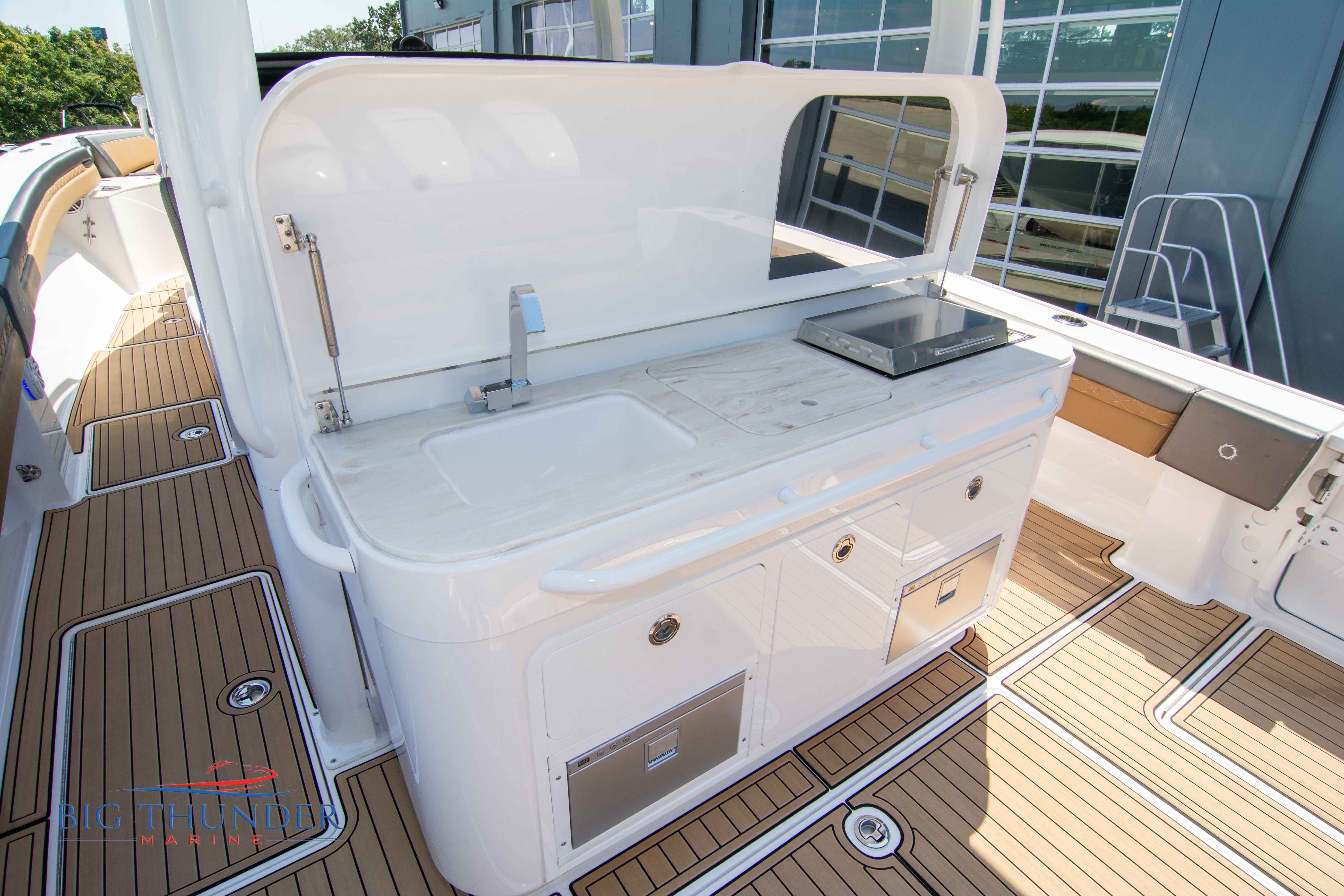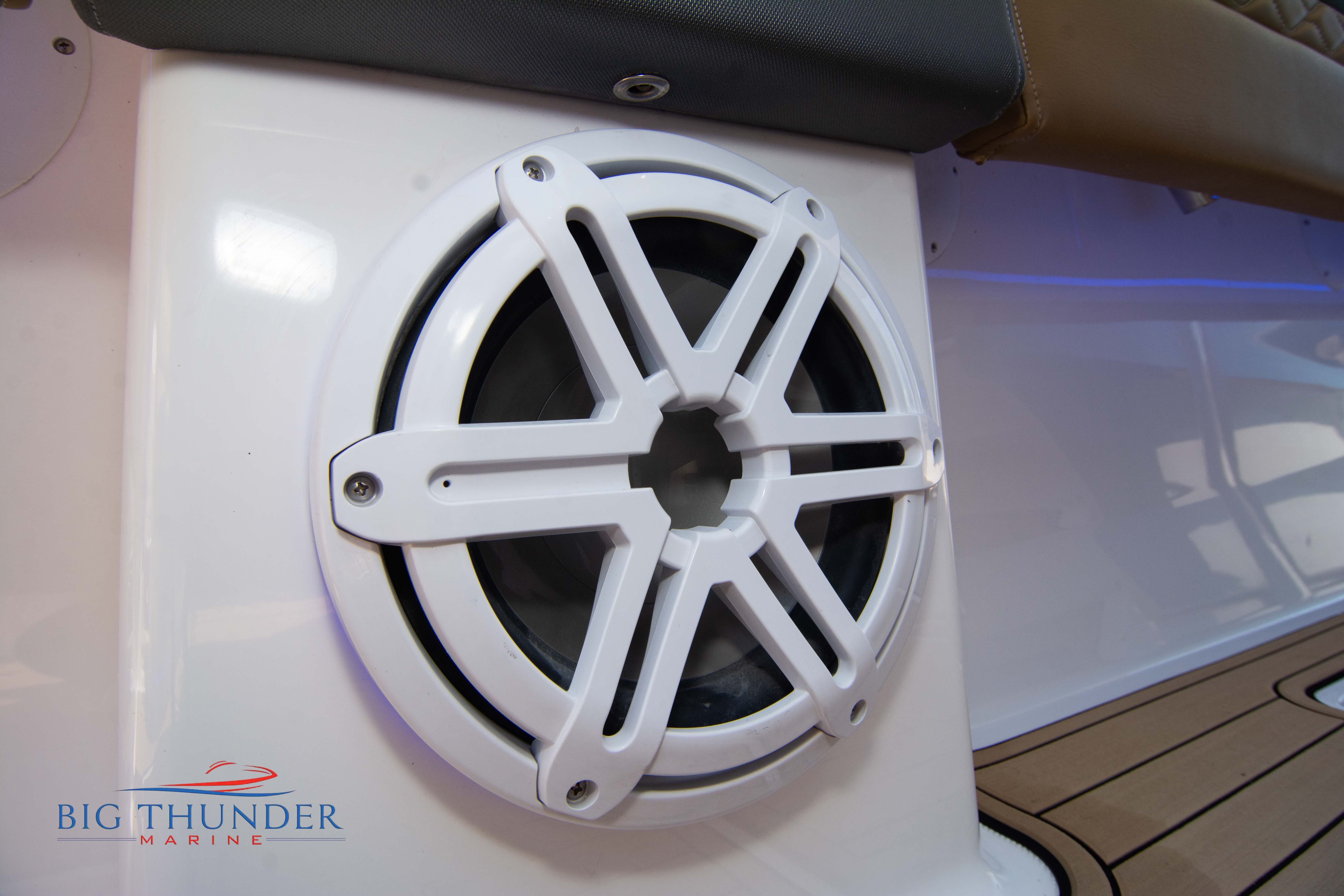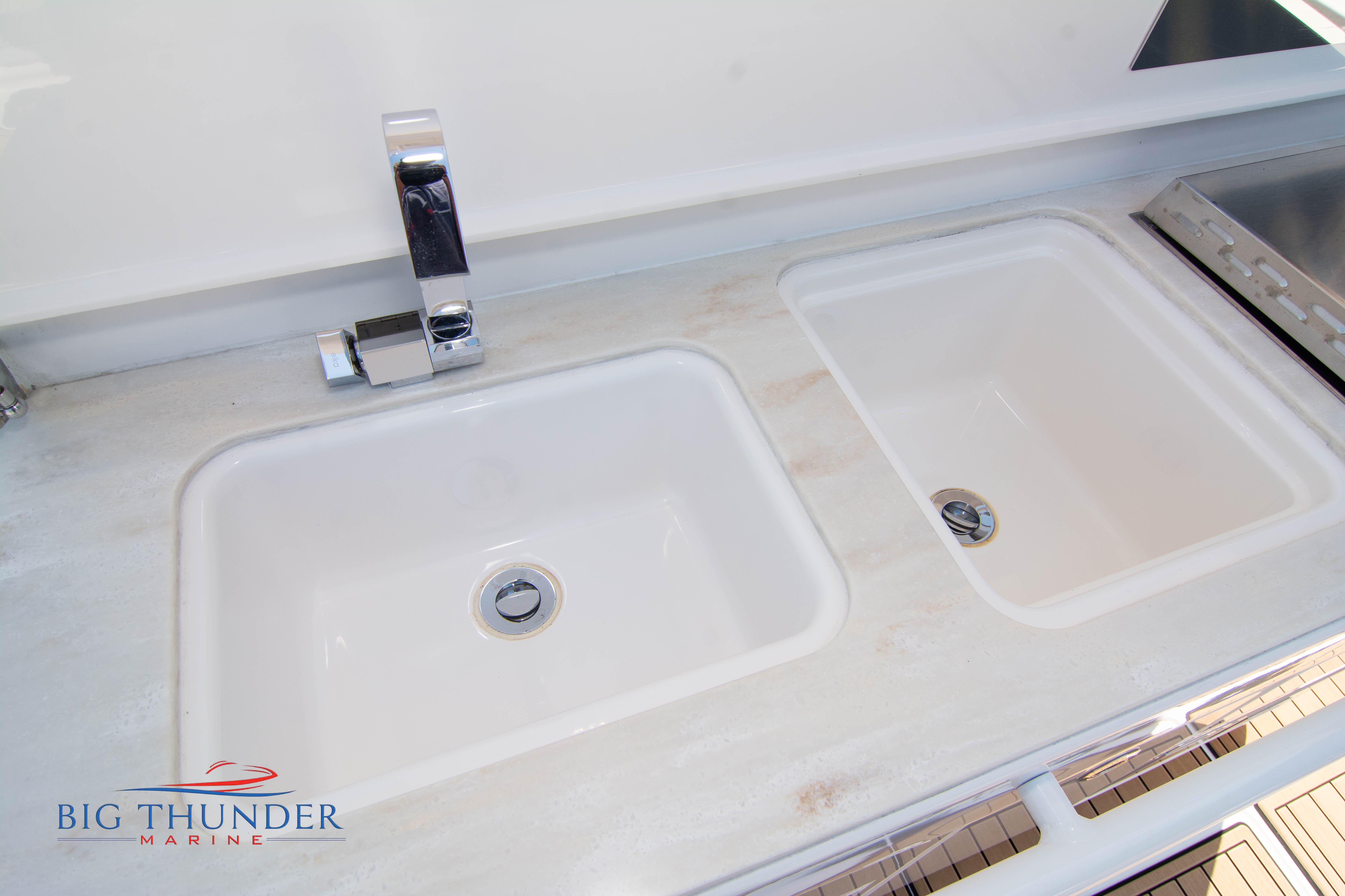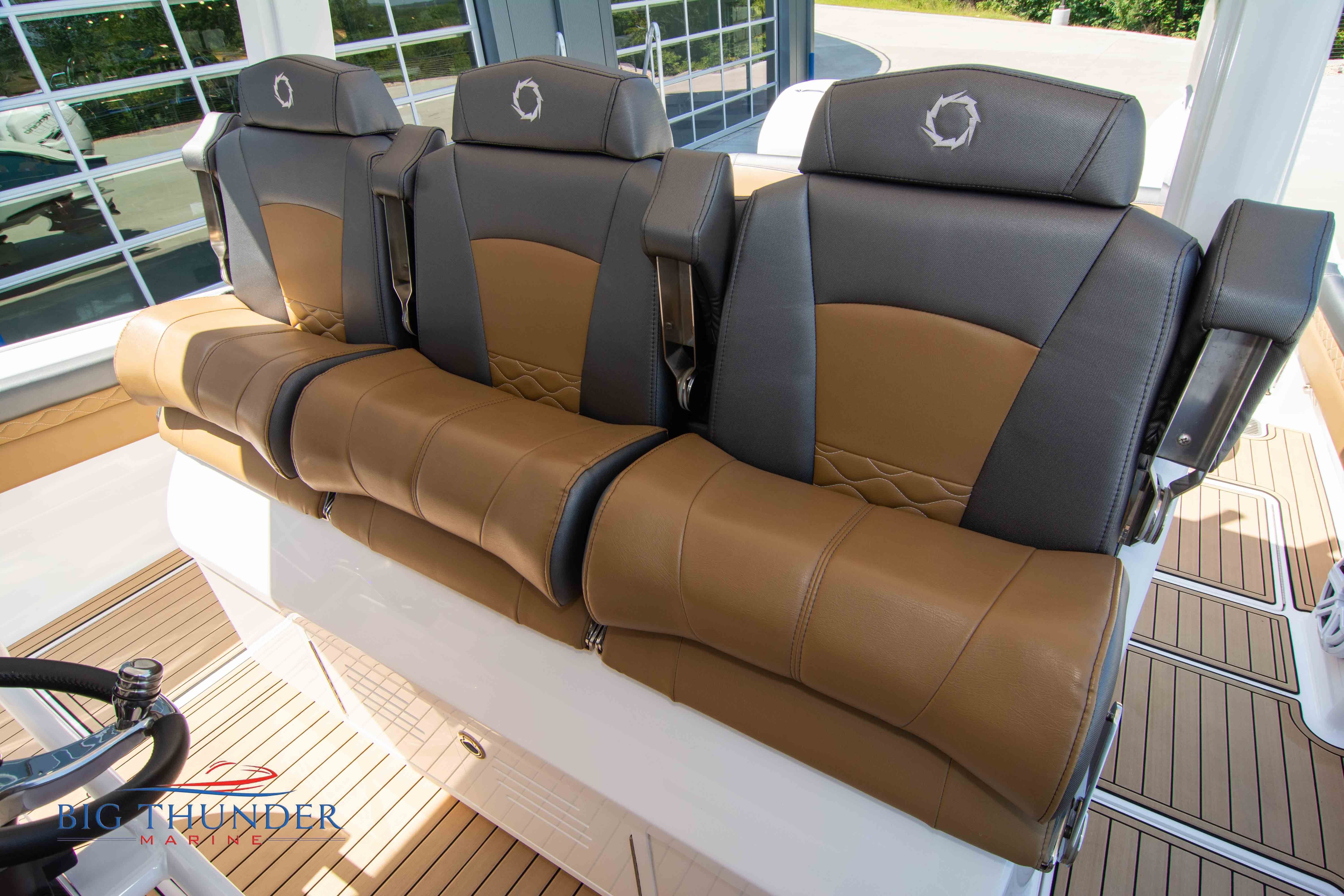 2019 Fountain 43 NX, Quad Verado 400R XM weather, Helm station contains head, sink, large v berth area, AC 30 amp dockside, lithium package w/50’ shore power cable, Mastervolt battery management system, Dive door with telescoping ladder, upgraded JL audio system, marine mat flooring, front lounge area, table, helm seat and dash cover, Triple Simrad 16’ displays, 24 HD domed radar, vhf radio with antenna and auto pilot. XM weather option. Panda diesel 5kw gen. AC/heat in cabin and at helm station. Isotherm refrigerators. Myco aluminium triple axle trailer available.