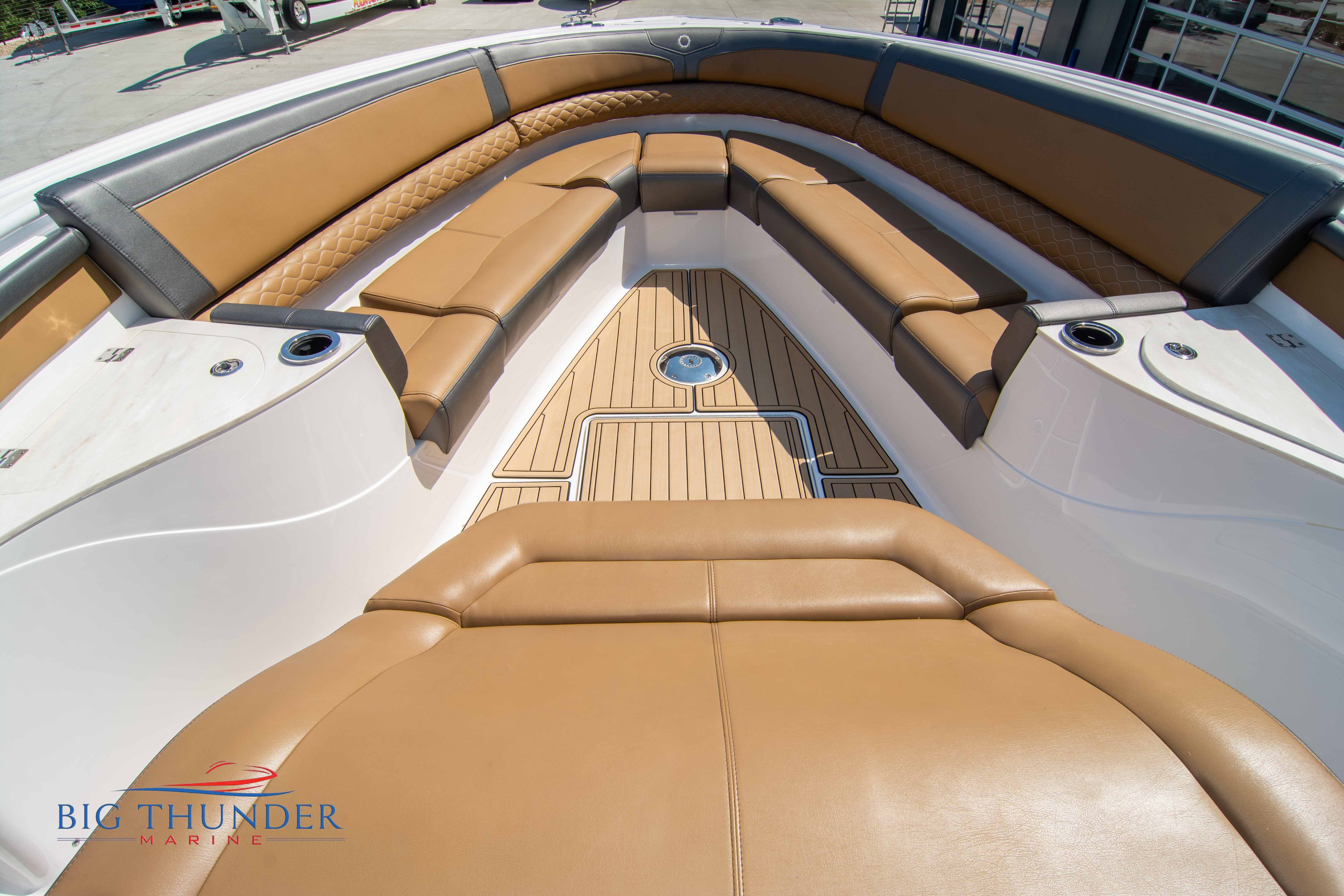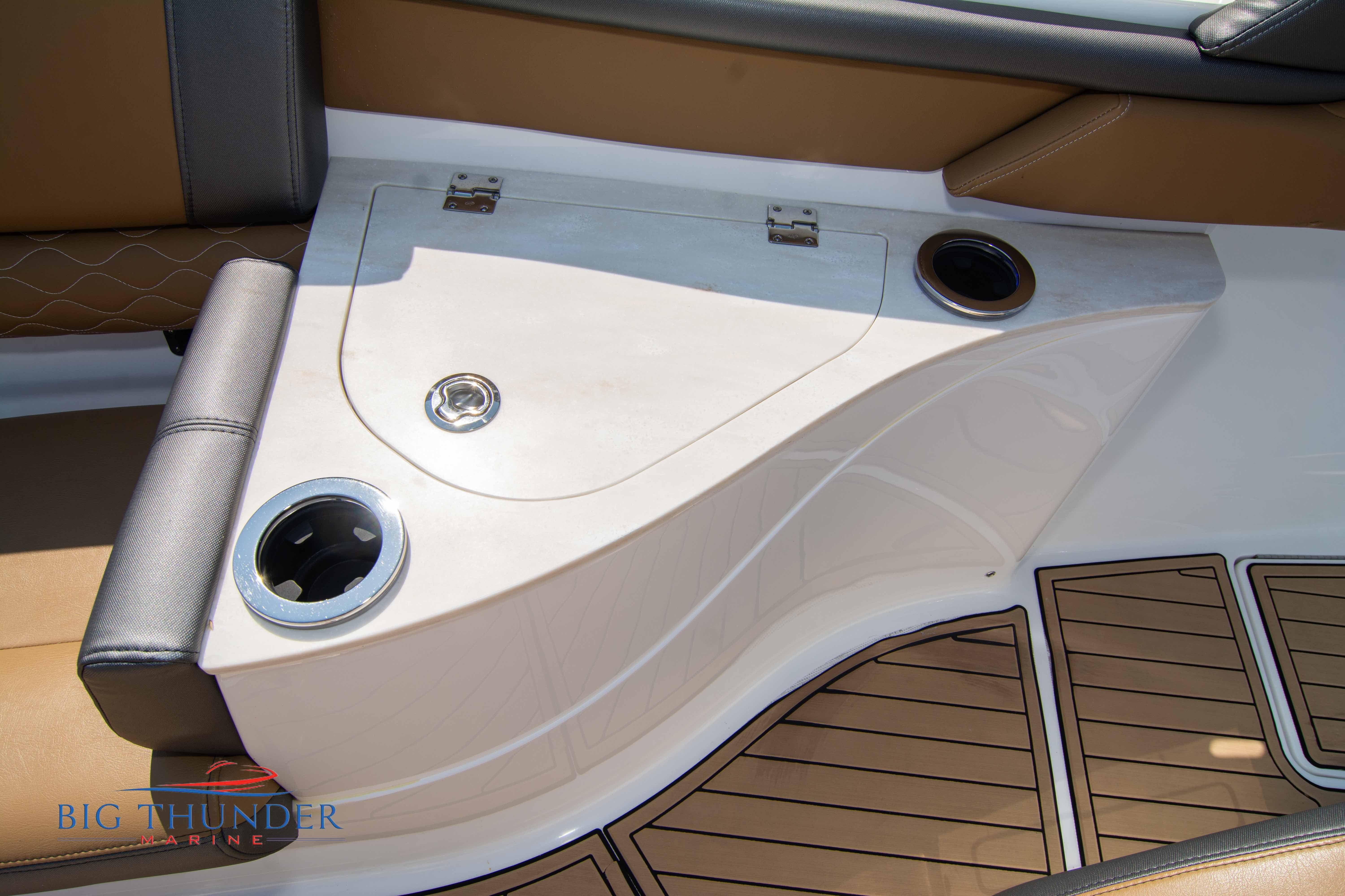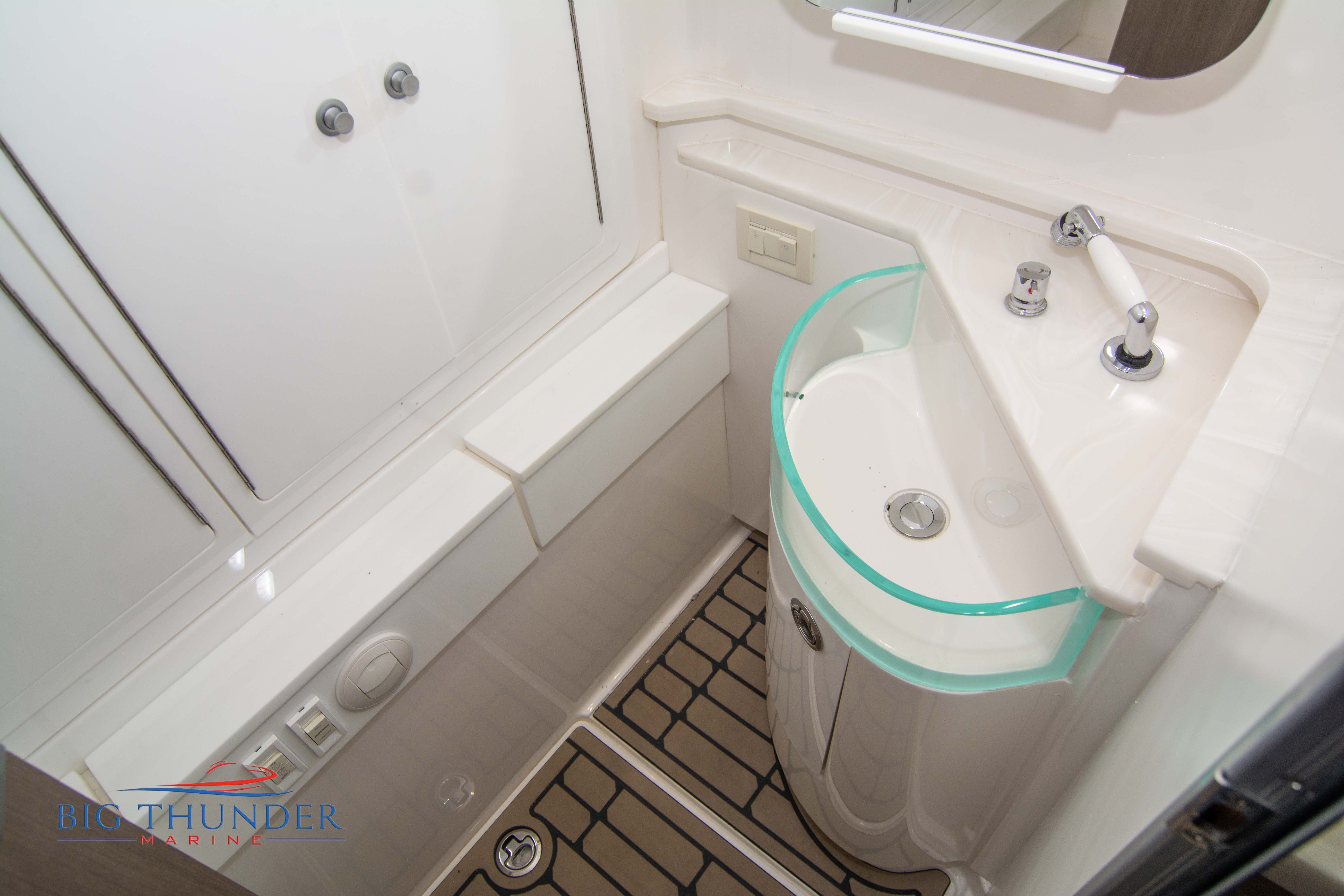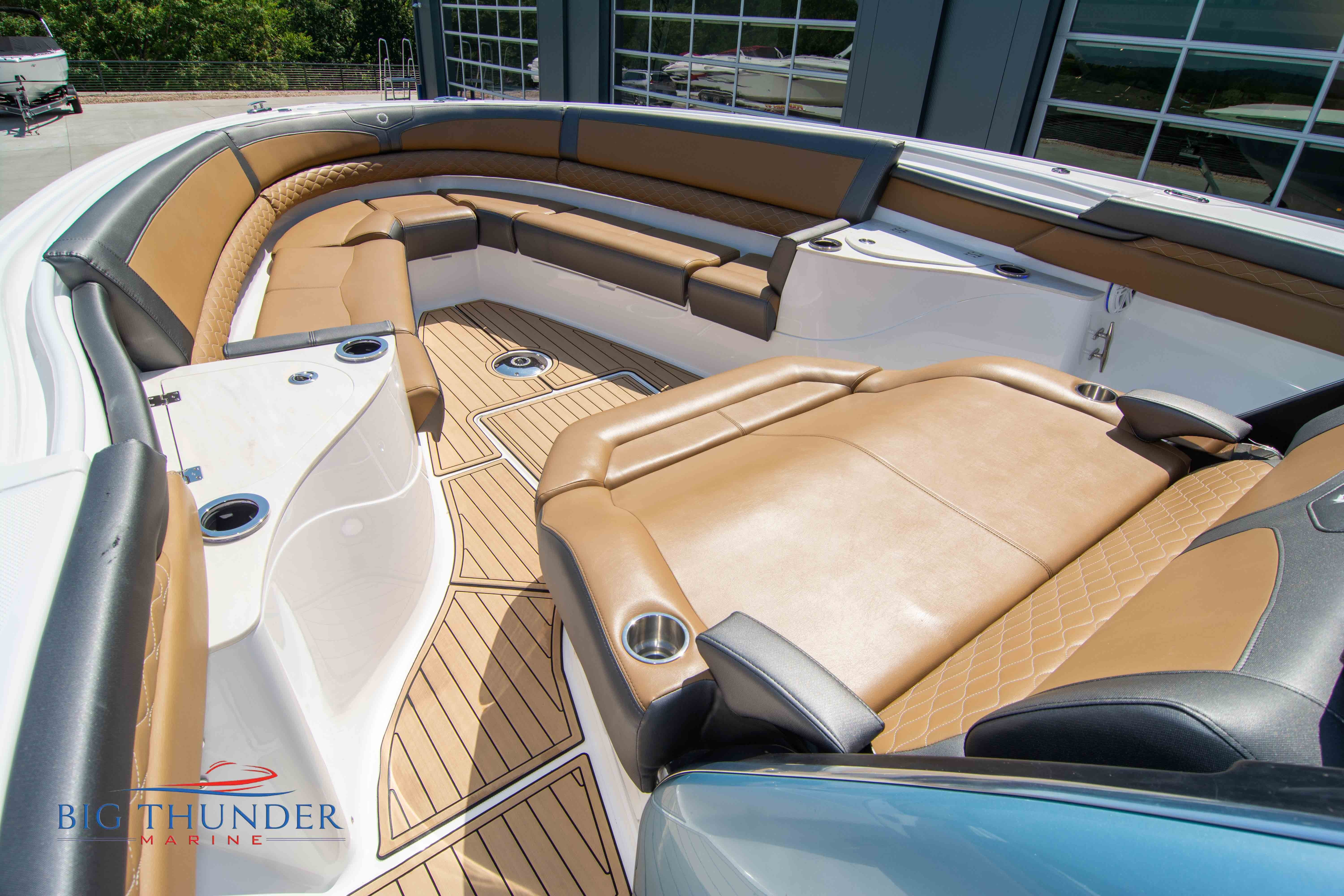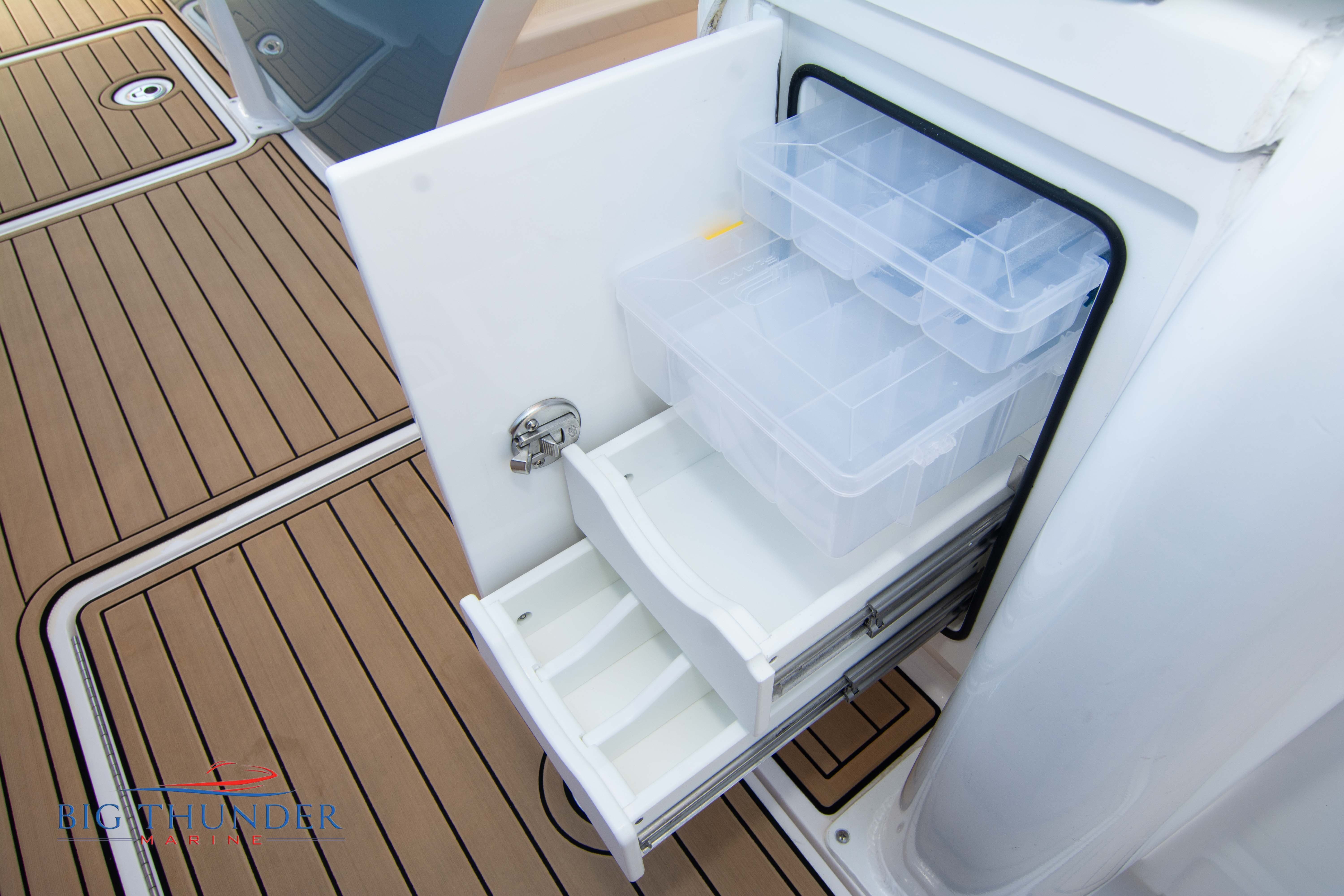 2019 Fountain 43 NX, Quad Verado 400R XM weather, Helm station contains head, sink, large v berth area, AC 30 amp dockside, lithium package w/50’ shore power cable, Mastervolt battery management system, Dive door with telescoping ladder, upgraded JL audio system, marine mat flooring, front lounge area, table, helm seat and dash cover, Triple Simrad 16’ displays, 24 HD domed radar, vhf radio with antenna and auto pilot. XM weather option. Panda diesel 5kw gen. AC/heat in cabin and at helm station. Isotherm refrigerators. Myco aluminium triple axle trailer available.