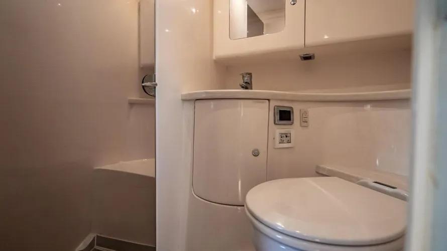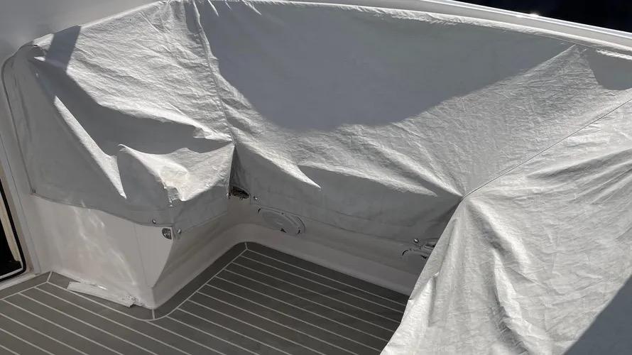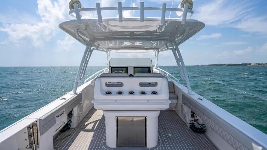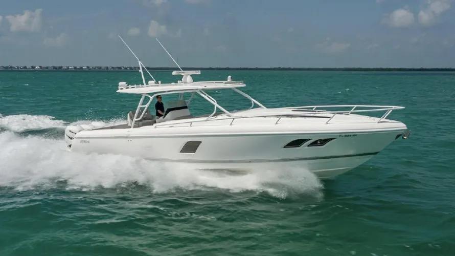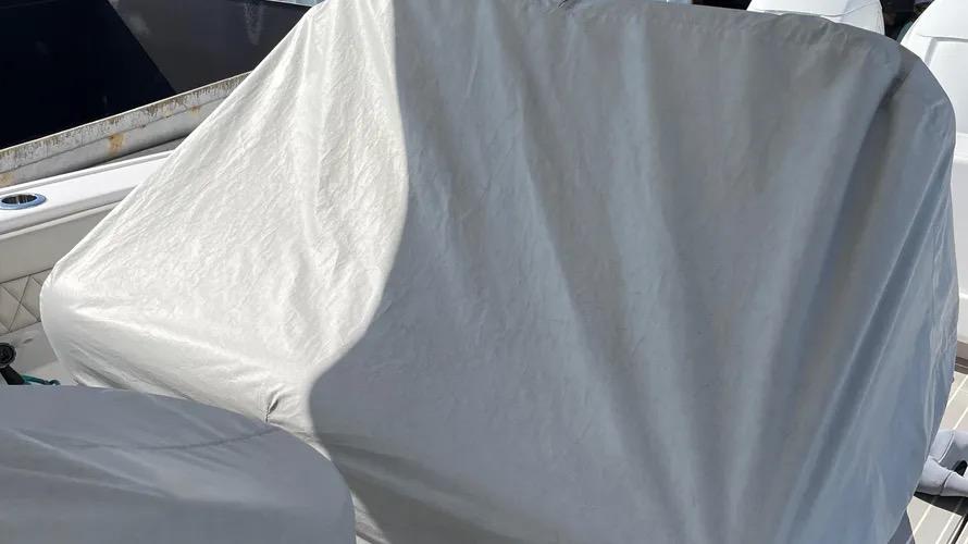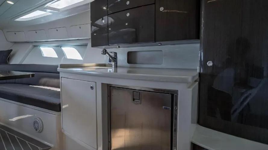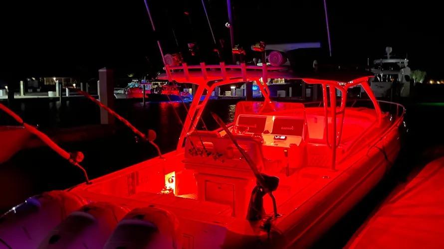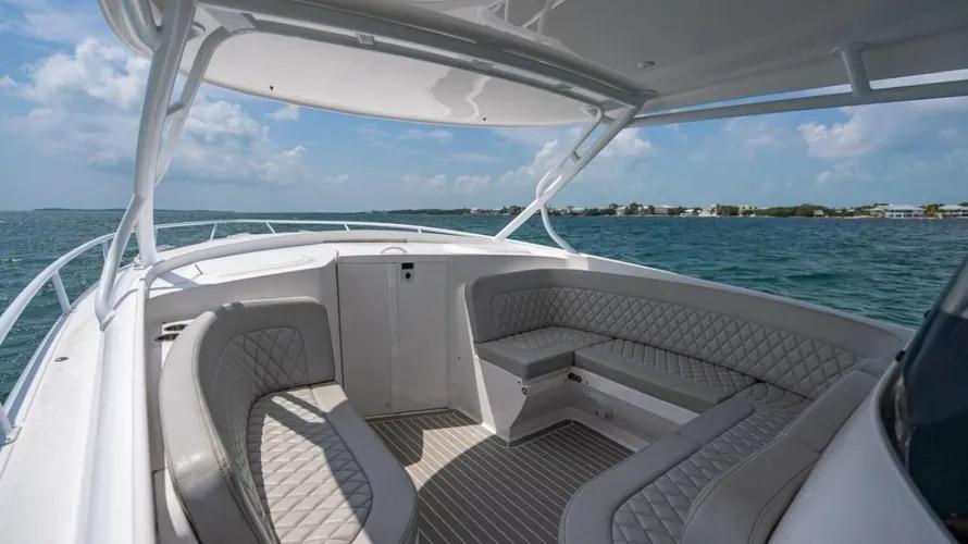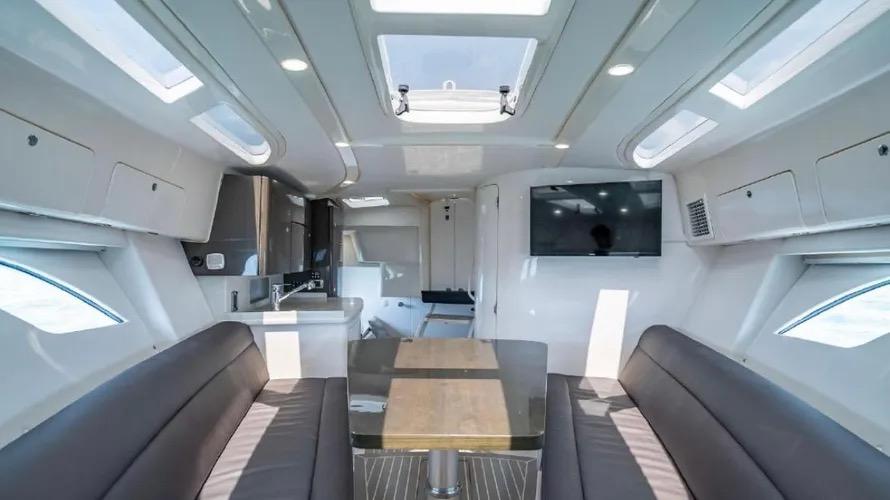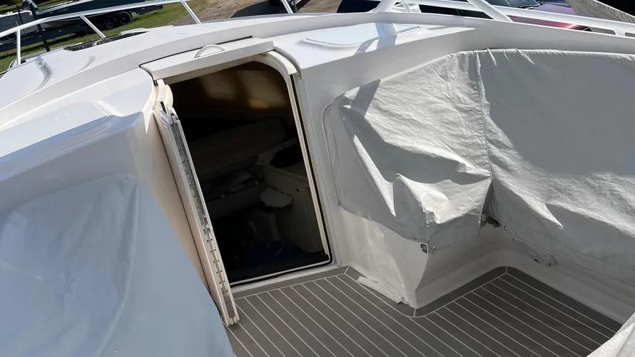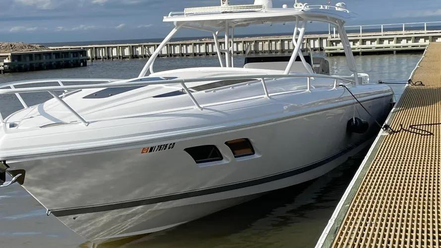All the enhanced accommodations you would expect in a luxury performance cruiser. From a private head with shower stall and separate master berth with queen bed and hullside windows to a forward cabin section that easily converts to a large double berth. But none of it comes at the expense of the most advanced technology and fabrication techniques that deliver an incomparably smooth, dry ride with unparalleled performance. For divers and swimmers, it’s packed with thoughtful design features like a hullside dive door with step ladder and grab rails. Entertaining is elevated with cozy, custom seating and while serious sport fishermen will take note of the rod holders, freshwater and raw water washdown.