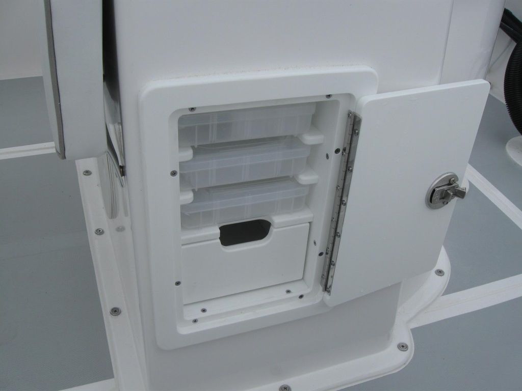 • FRP leaning post w/ backrest, tackle drawers, Full Transom with Blue Live Well w/ light