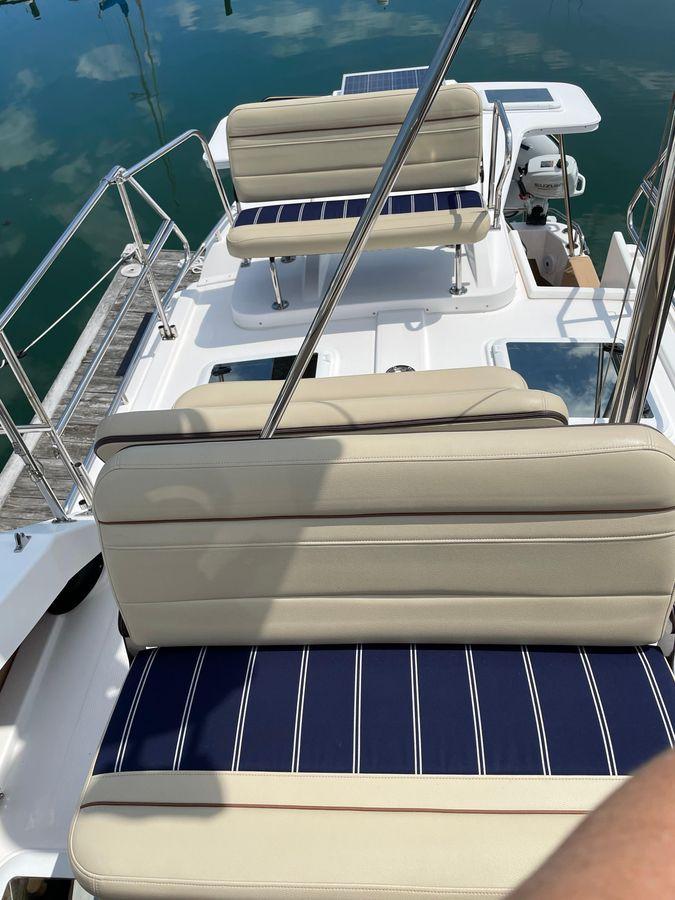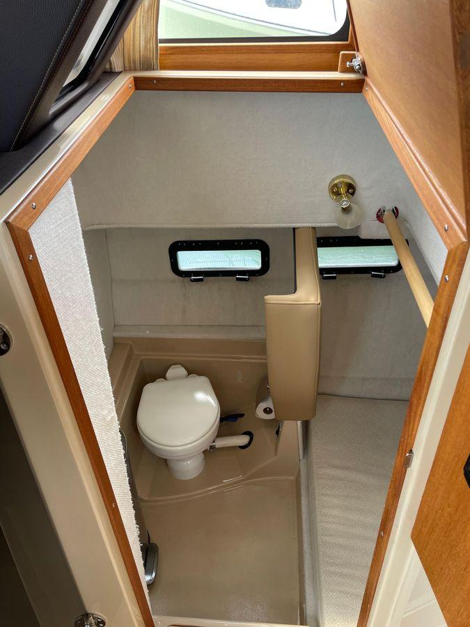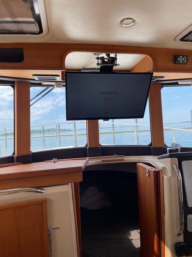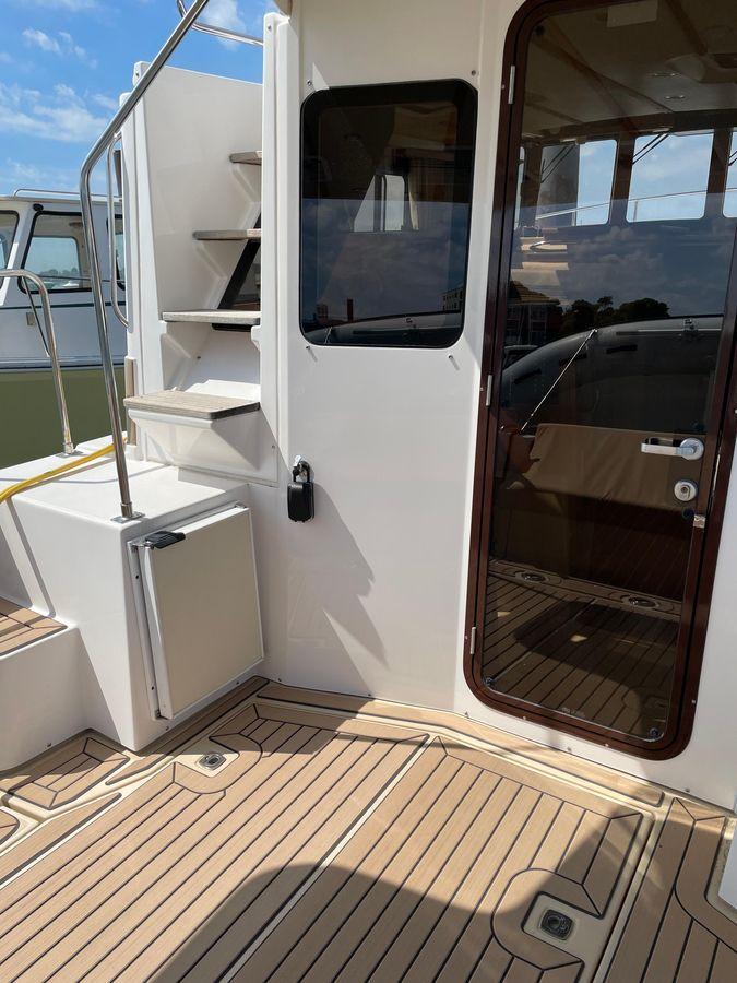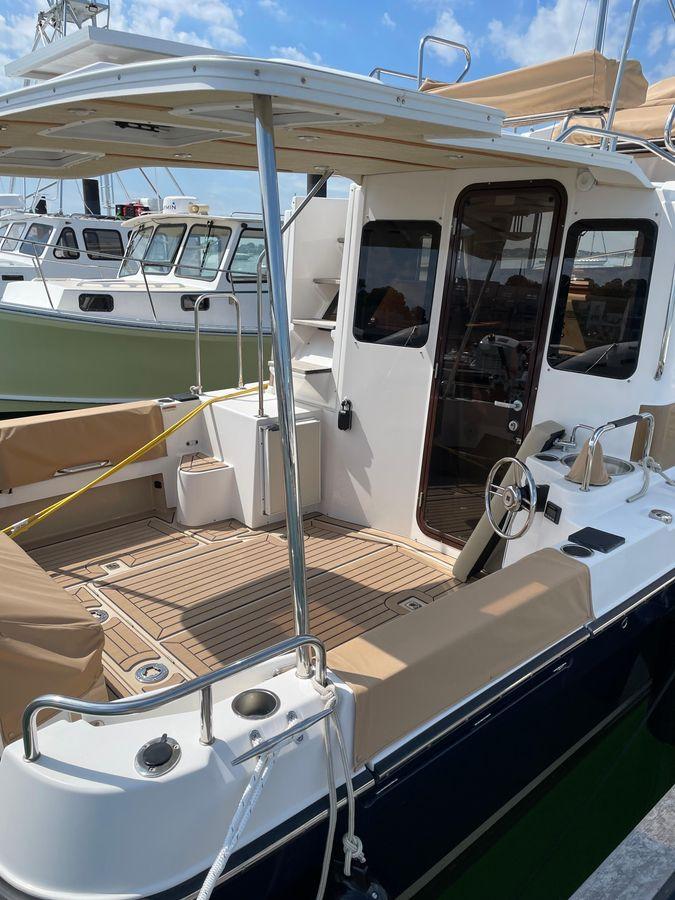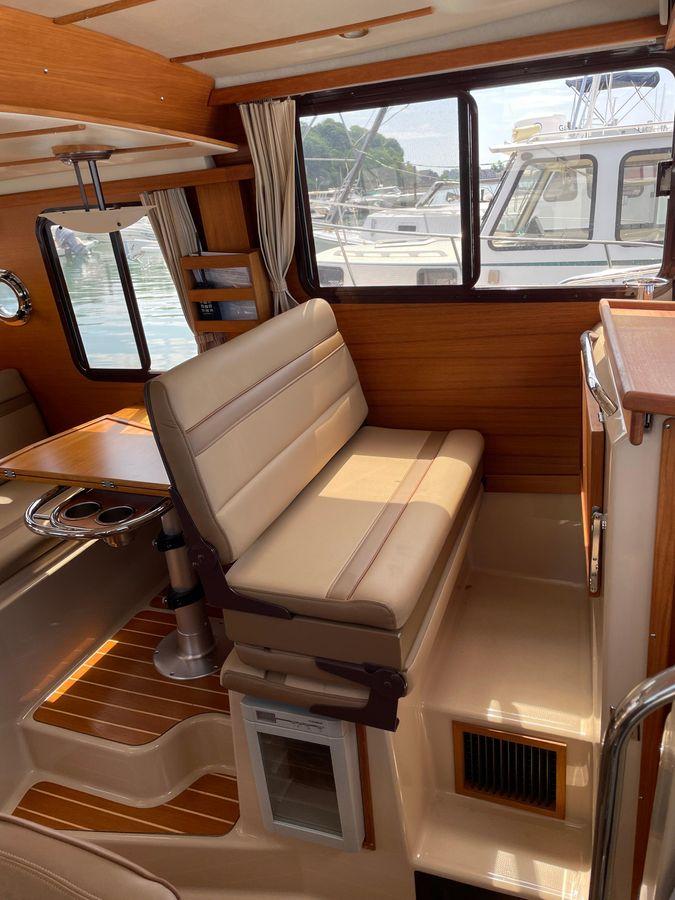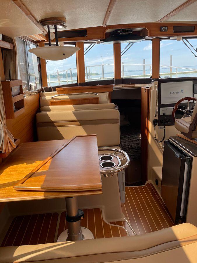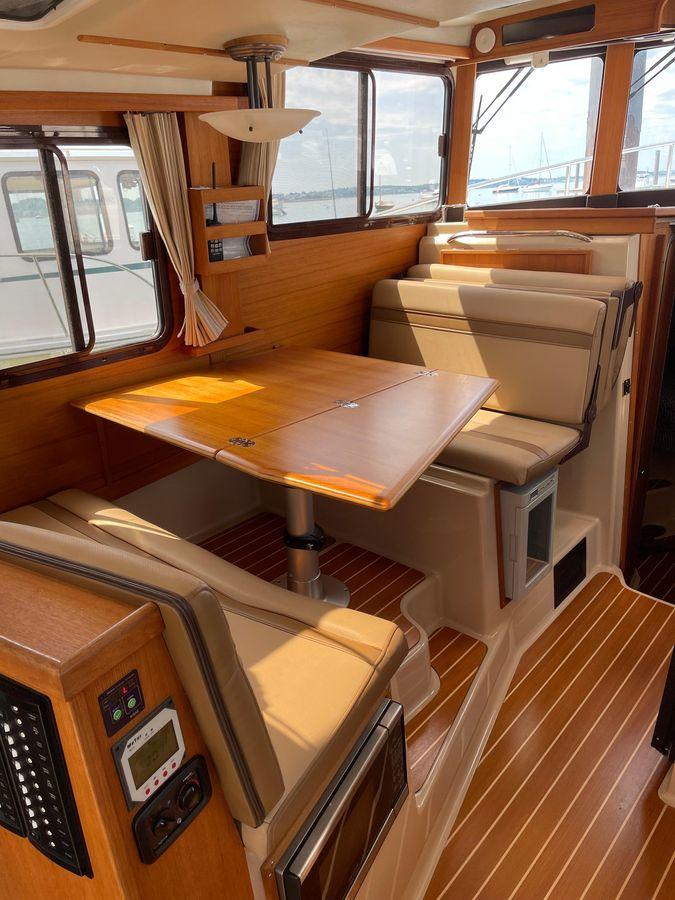 The R-31 Command Bridge shares many of the features and qualities of her smaller sisterships but some notable additions to this larger model make her ideal for extended cruising while still being a trailerable trawler. The R-31 CB is the first Ranger Tug to feature a flybridge equipped with electronic controls at both the upper and lower helm. The flybridge also retracts to allow for trailering the 31’. The builders at Ranger Tugs also equipped the foredeck with seating and a table that can be raised or lowered depending on whether the boat is under way or at anchor or dock for entertaining. In addition to the extra seating now available on the flybridge and foredeck the R-31 CB allows for a larger cockpit area with wraparound seating and extra seating that folds out of the gunwale. When not entertaining, seats are folded leaving the cockpit unencumbered.