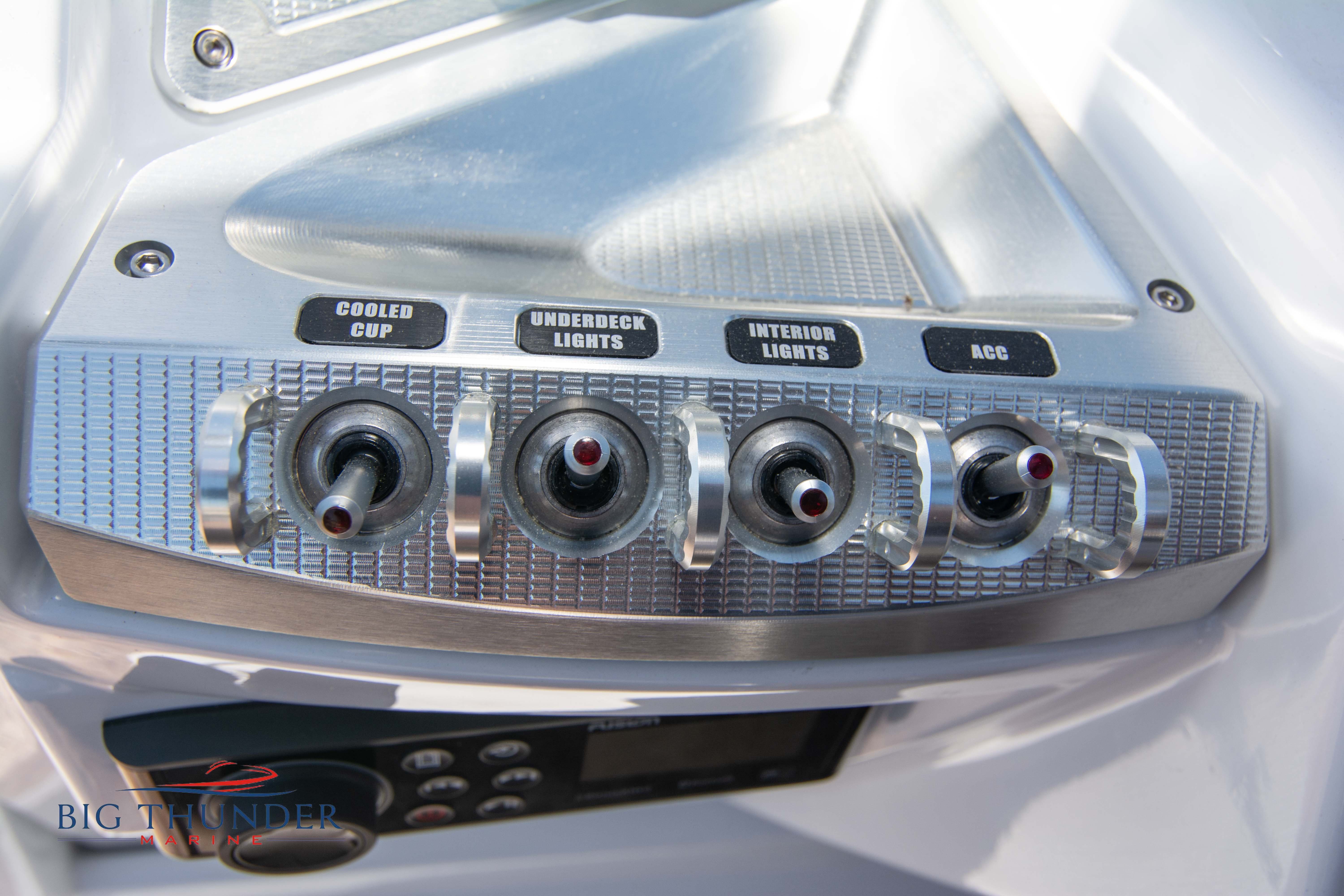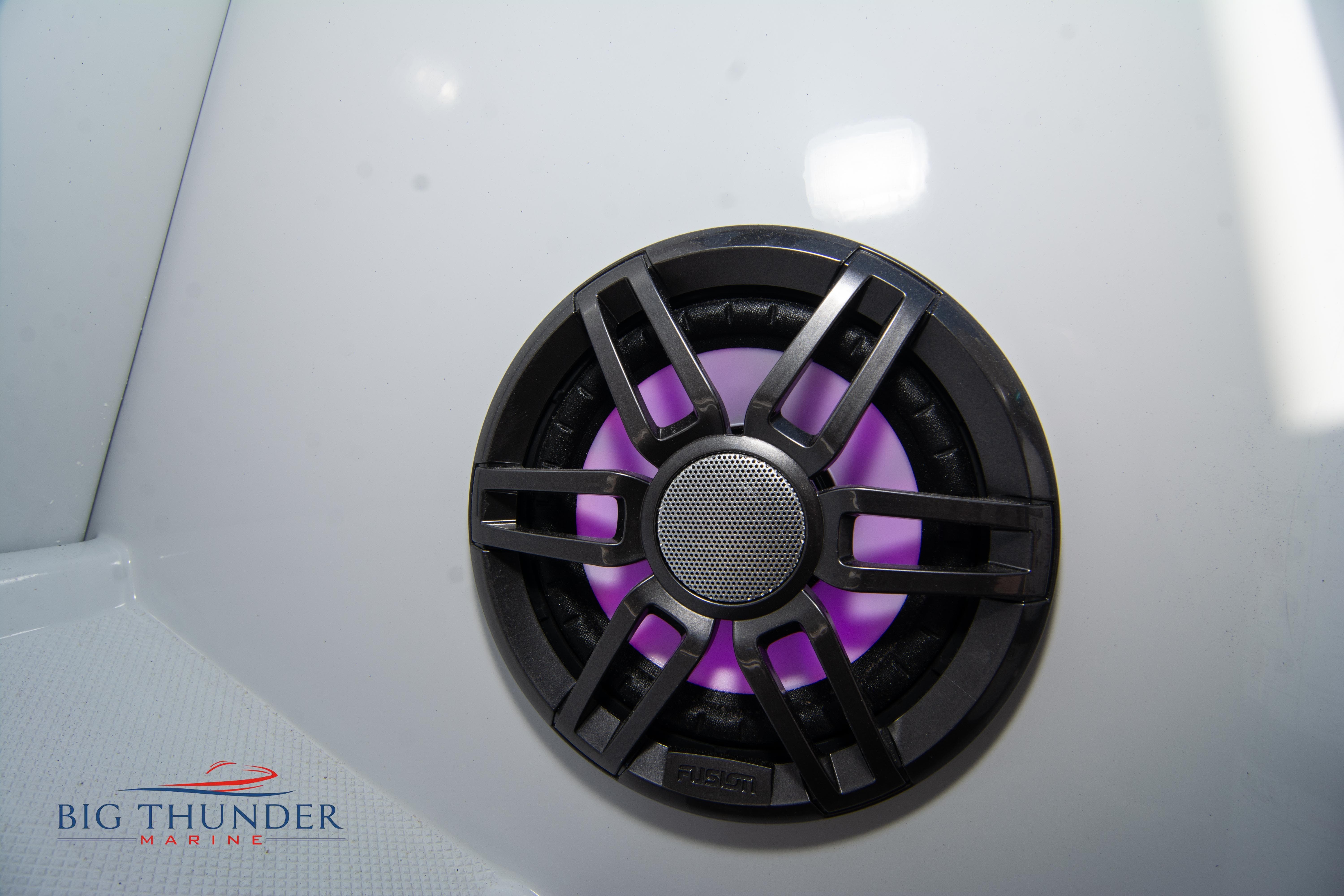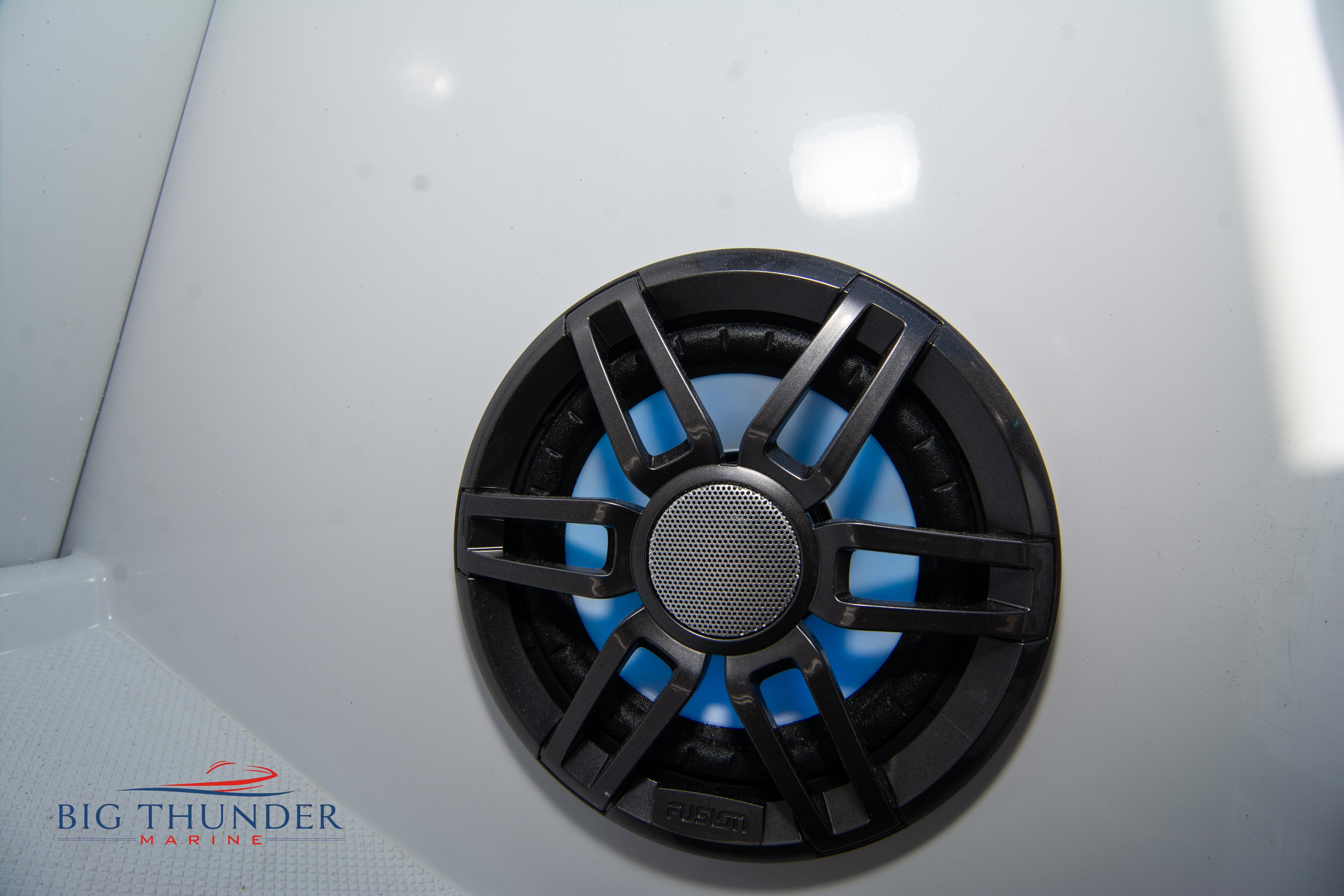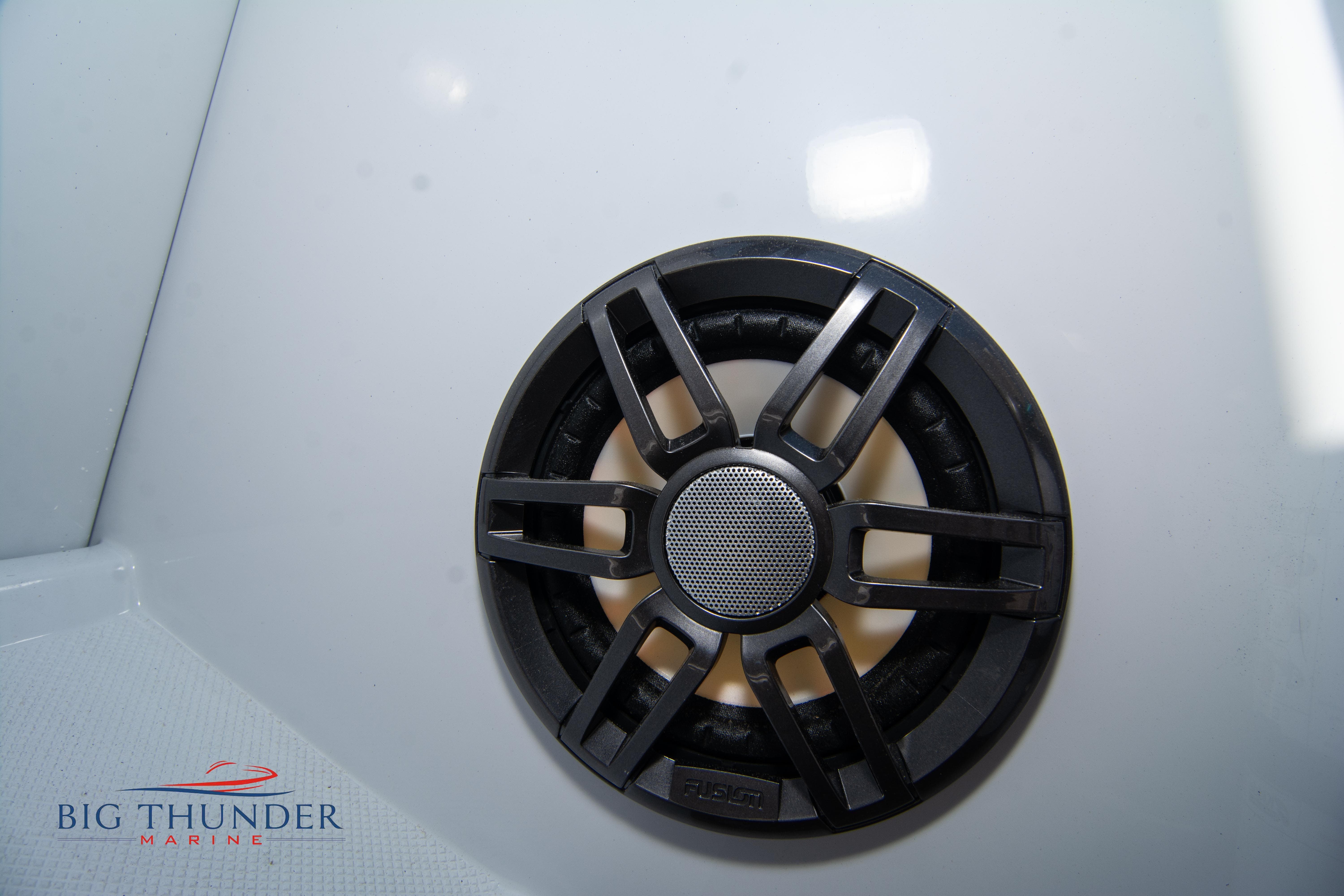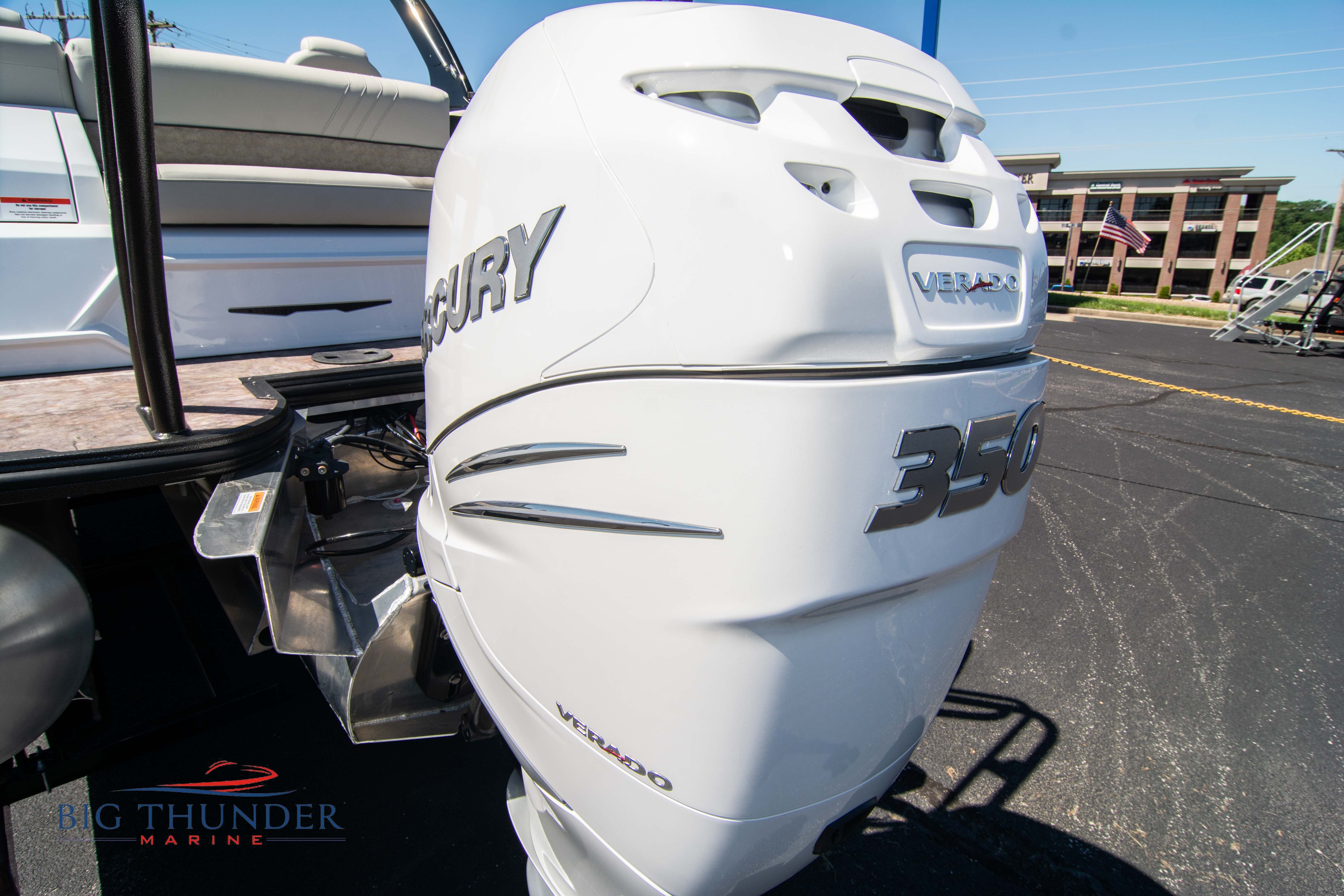 Mercury Verado w/ DTS & SmartCraft Digital Pre-Rig. Mercury 350L Verado Cold Fusion White 5.44"" 1.75HD (I-6 SC 4S). White Metallic Side Panels w/ Steel Accents. Textured HD Graphite Powder Coated Rails & Deck Trim. SS Rub Rail Insert. Slate Deluxe Poly Vinyl Flooring. Gray/White Gelcoat Interior. Black Bimini & Mooring Cover. Cladded Arch w/ Gas Assist. CP3 Performance Package ((2) 25? Round Tubes, (1) 26? Round Center Tube, Aluminum Underskin, Lifting Strakes, Electronic Power Steering, Dual Battery Switch and Battery Boxes, Battery Charger, Integrated Transom & 80-Gallon Fuel Tank). Custom Aluminum Billet Instrument & Switch Panel. 29"" High Back Helm Chair w/ Flip Up Bolster. Captain’s Cooled Drink Holder. RGB Cupholders. Mid Ship 3-Drawer Storage Unit. Premium Audio Package (Fusion MS-BB300R Head Unit, (8) Fusion MS-FR6520 6 3/4?, Fusion MS-FR6520 10? subwoofer and MS-DA51600 1600W Amplifier). Powder Coated Aluminum Deluxe ""Junior Beast"" Ski Tow Bar. Oval Dinette Table. (2) Portable Cupholders.