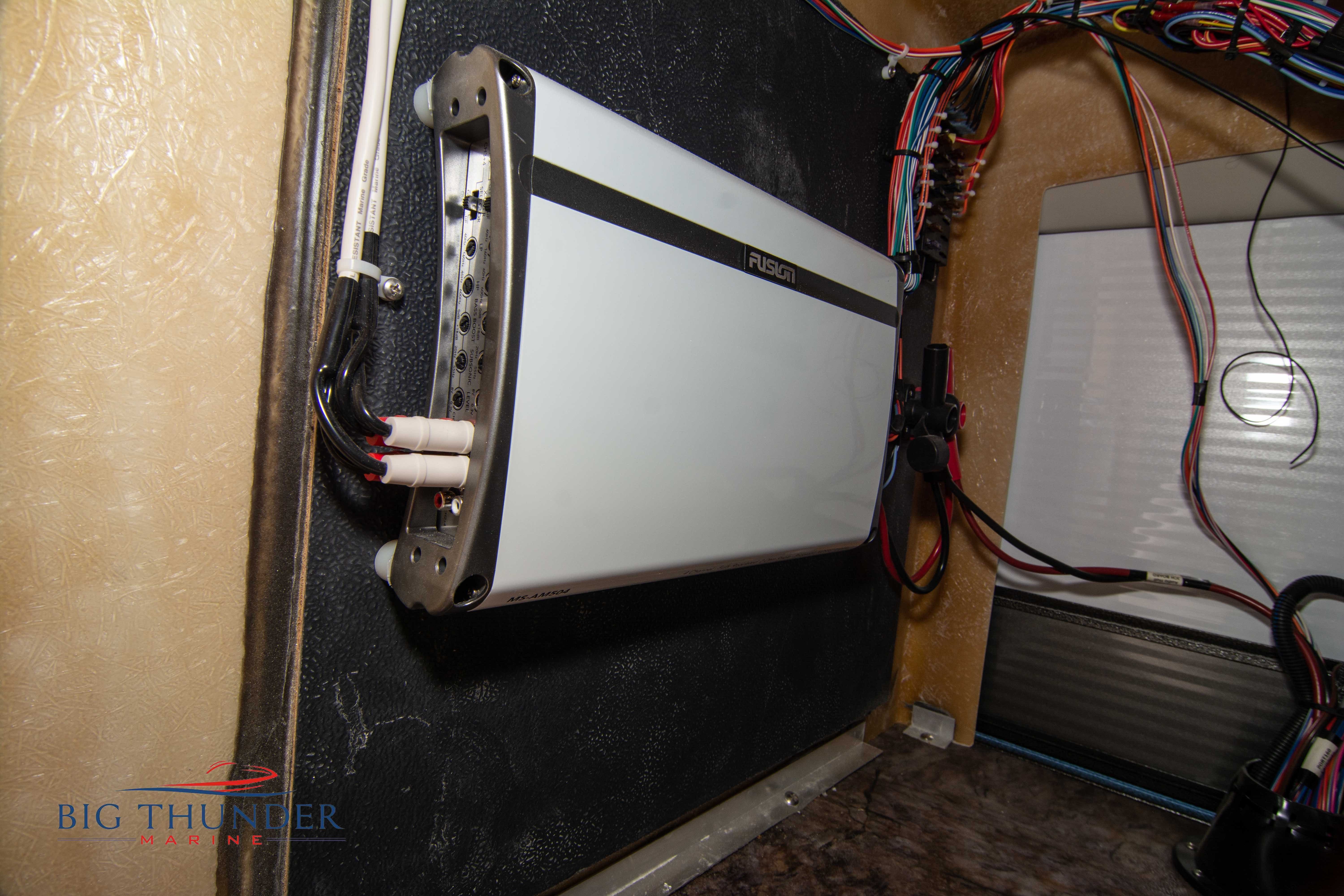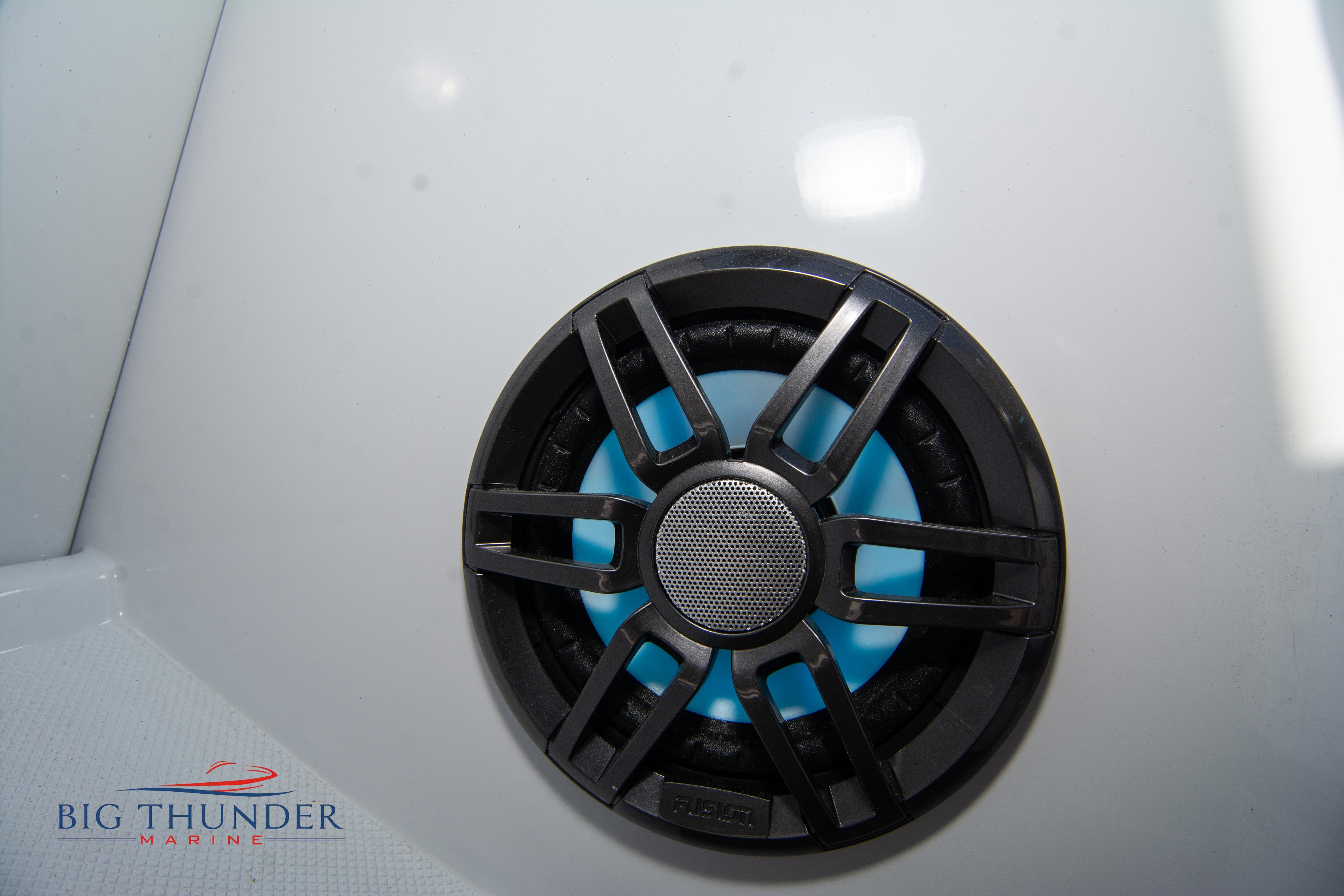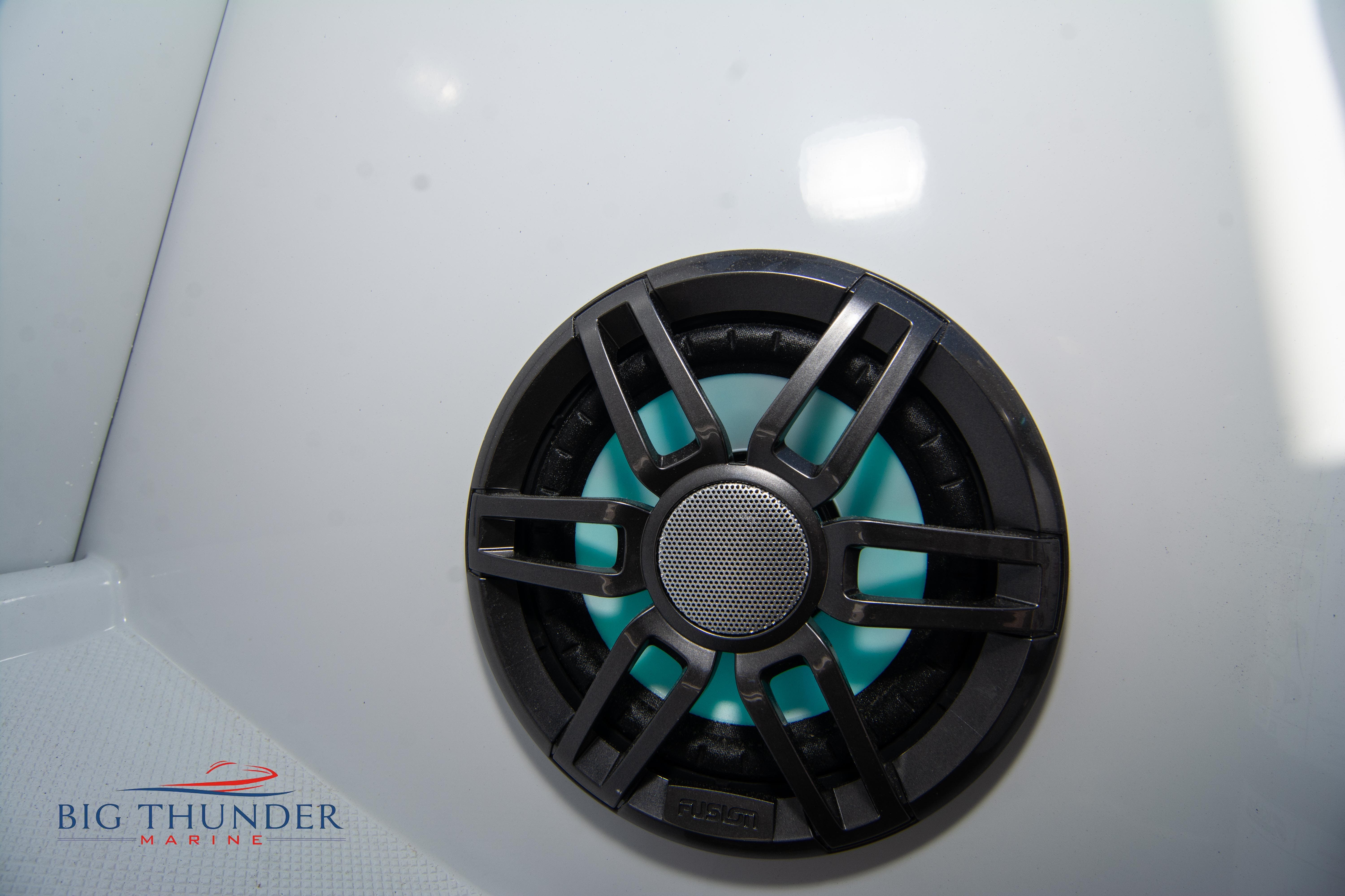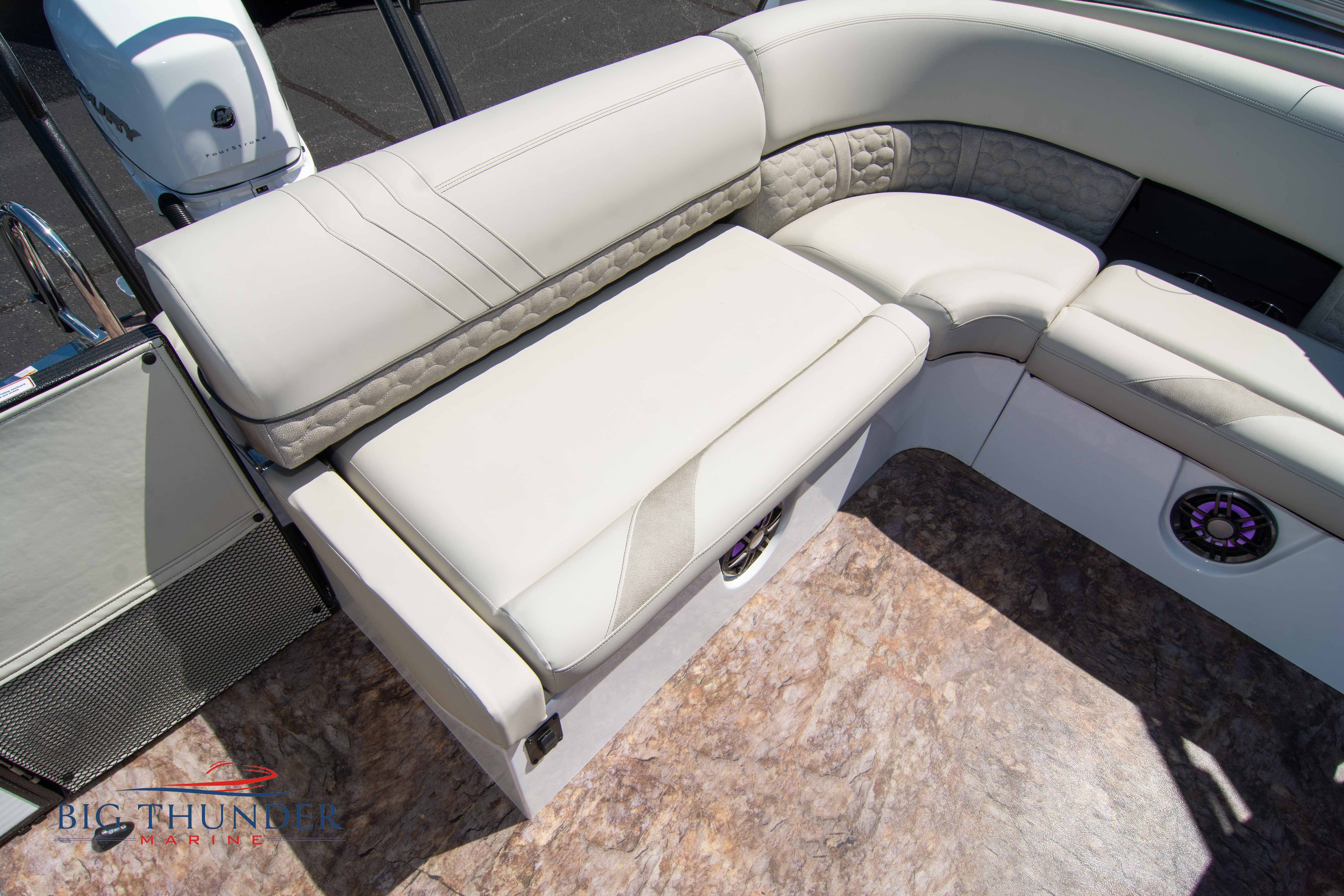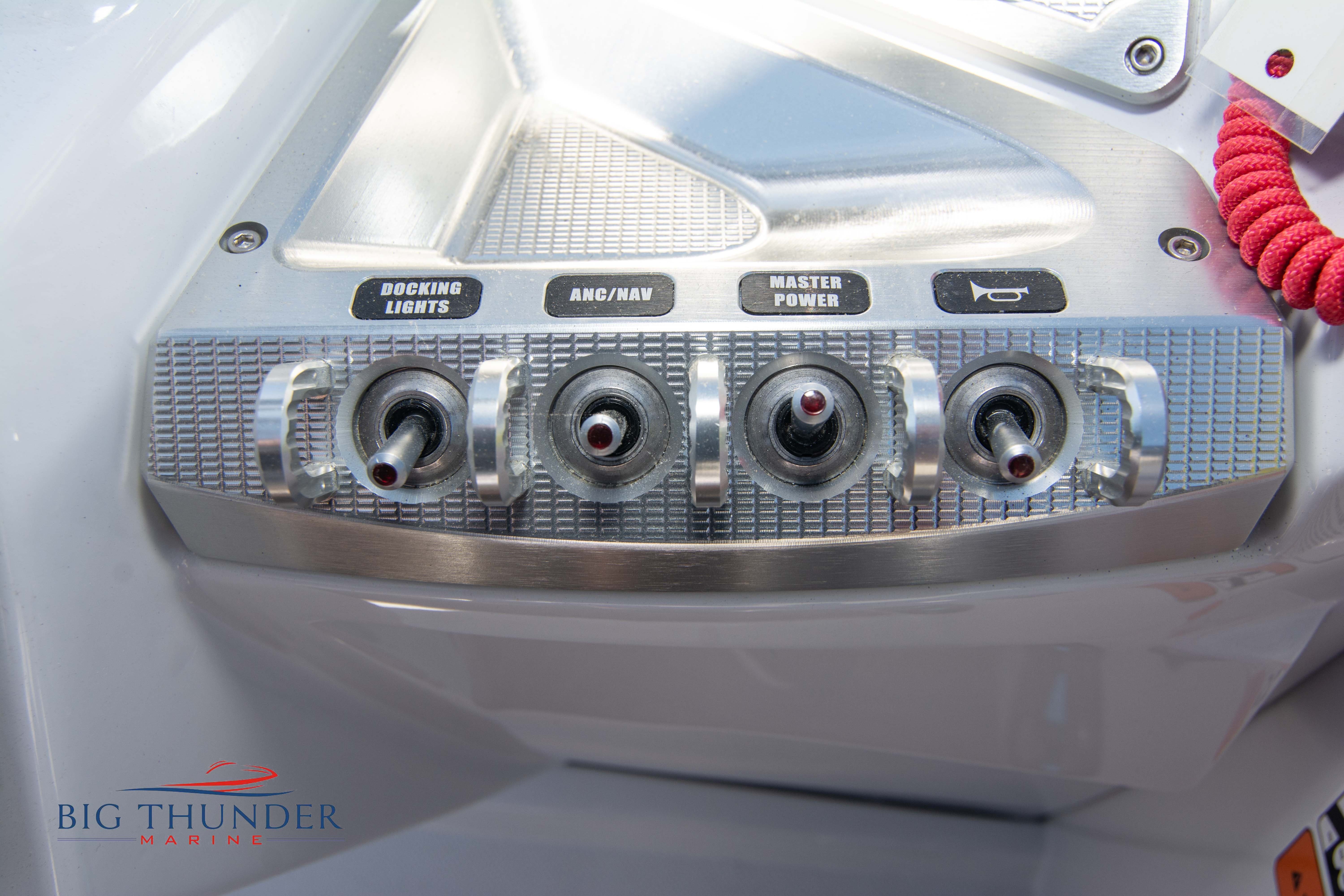 Mercury Verado w/ DTS & SmartCraft Digital Pre-Rig. Mercury 350L Verado Cold Fusion White 5.44"" 1.75HD (I-6 SC 4S). White Metallic Side Panels w/ Steel Accents. Textured HD Graphite Powder Coated Rails & Deck Trim. SS Rub Rail Insert. Slate Deluxe Poly Vinyl Flooring. Gray/White Gelcoat Interior. Black Bimini & Mooring Cover. Cladded Arch w/ Gas Assist. CP3 Performance Package ((2) 25? Round Tubes, (1) 26? Round Center Tube, Aluminum Underskin, Lifting Strakes, Electronic Power Steering, Dual Battery Switch and Battery Boxes, Battery Charger, Integrated Transom & 80-Gallon Fuel Tank). Custom Aluminum Billet Instrument & Switch Panel. 29"" High Back Helm Chair w/ Flip Up Bolster. Captain’s Cooled Drink Holder. RGB Cupholders. Mid Ship 3-Drawer Storage Unit. Premium Audio Package (Fusion MS-BB300R Head Unit, (8) Fusion MS-FR6520 6 3/4?, Fusion MS-FR6520 10? subwoofer and MS-DA51600 1600W Amplifier). Powder Coated Aluminum Deluxe ""Junior Beast"" Ski Tow Bar. Oval Dinette Table. (2) Portable Cupholders.
