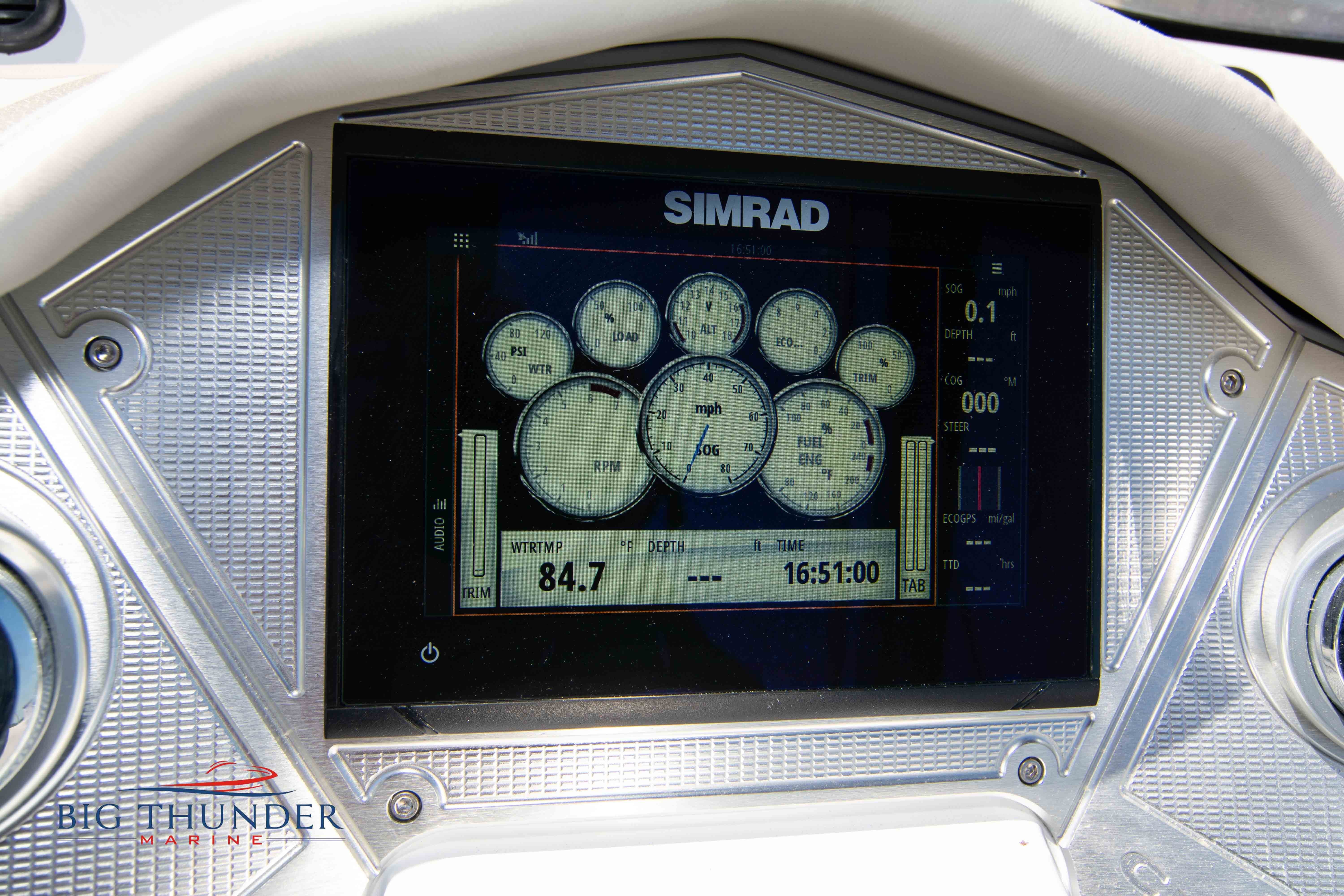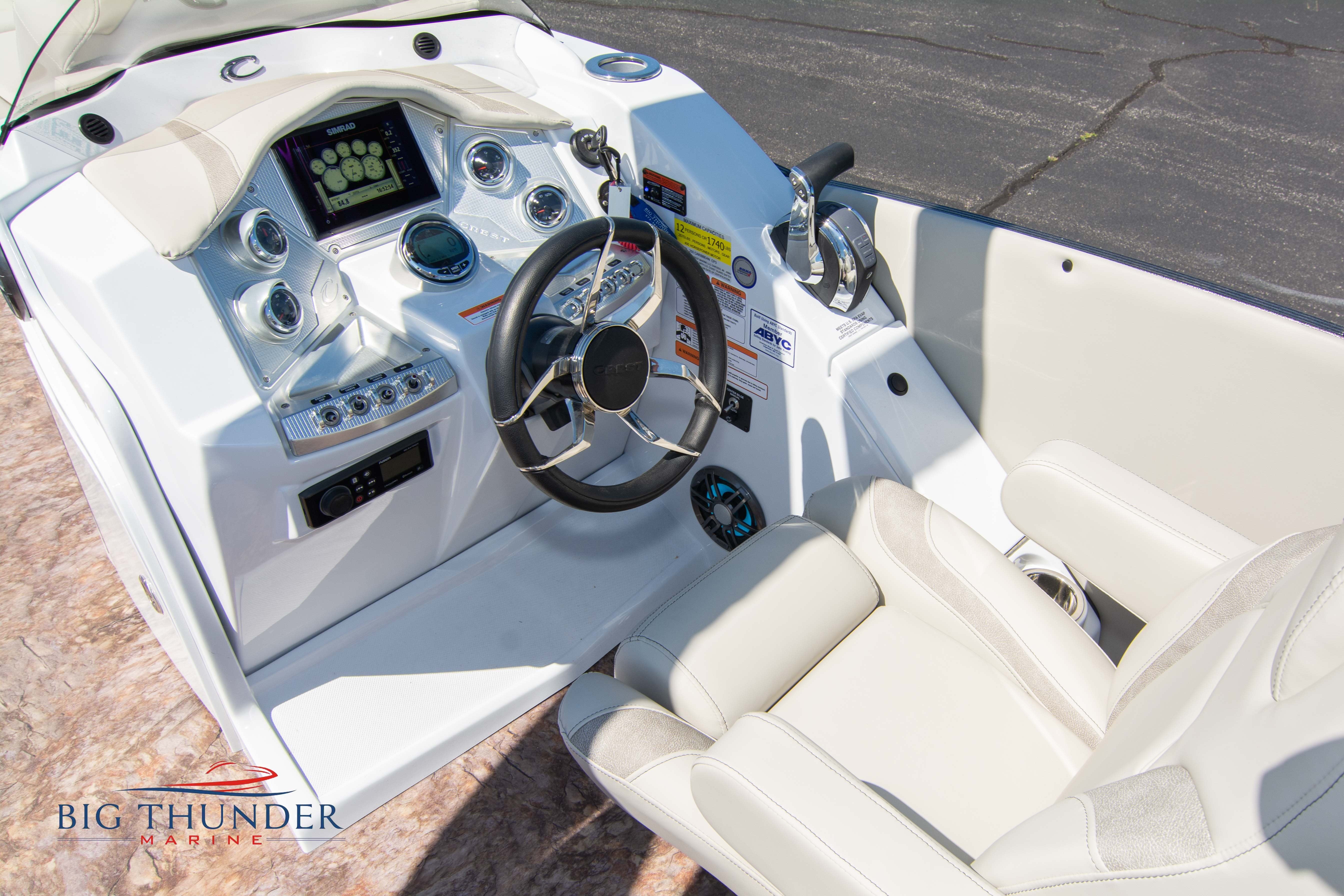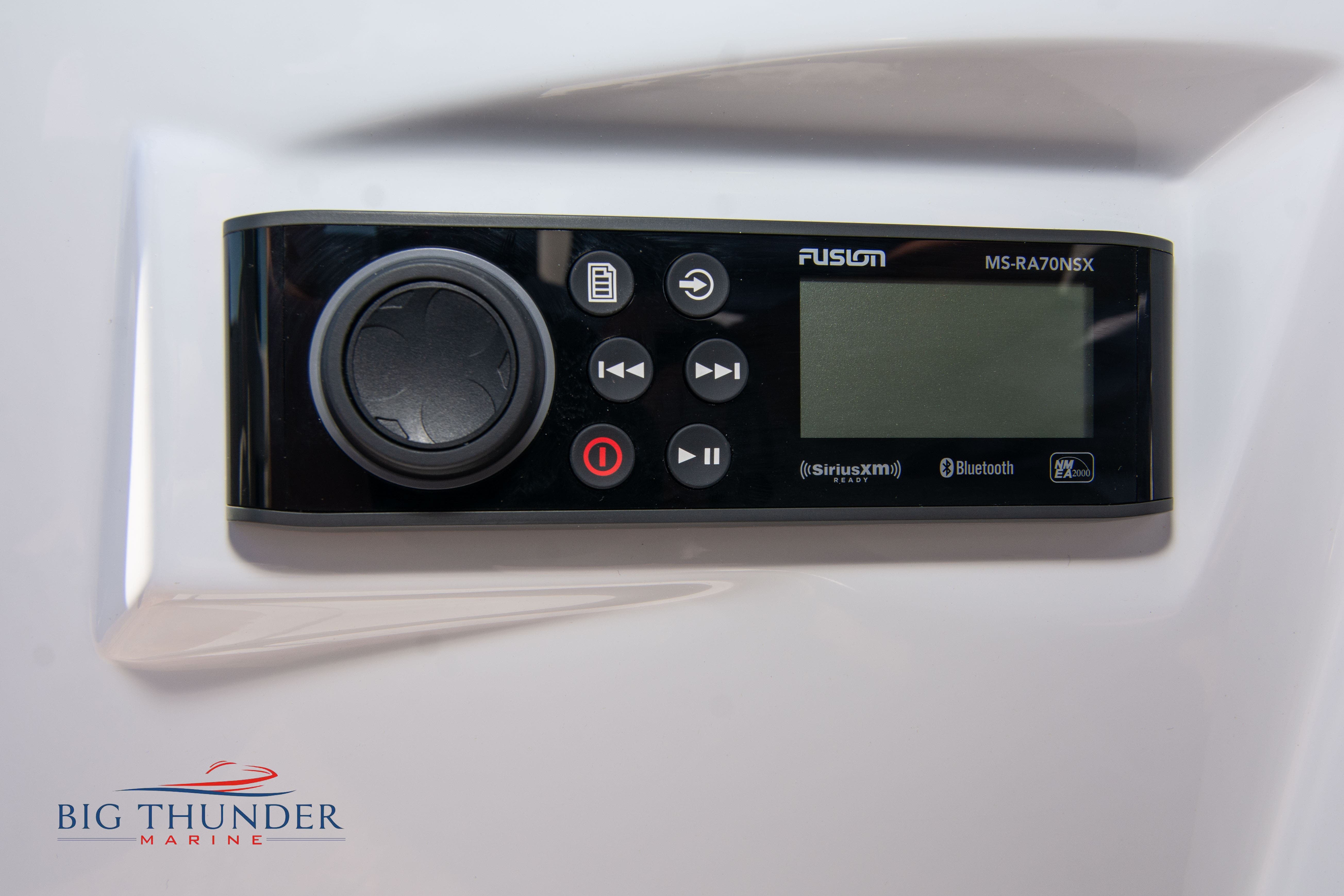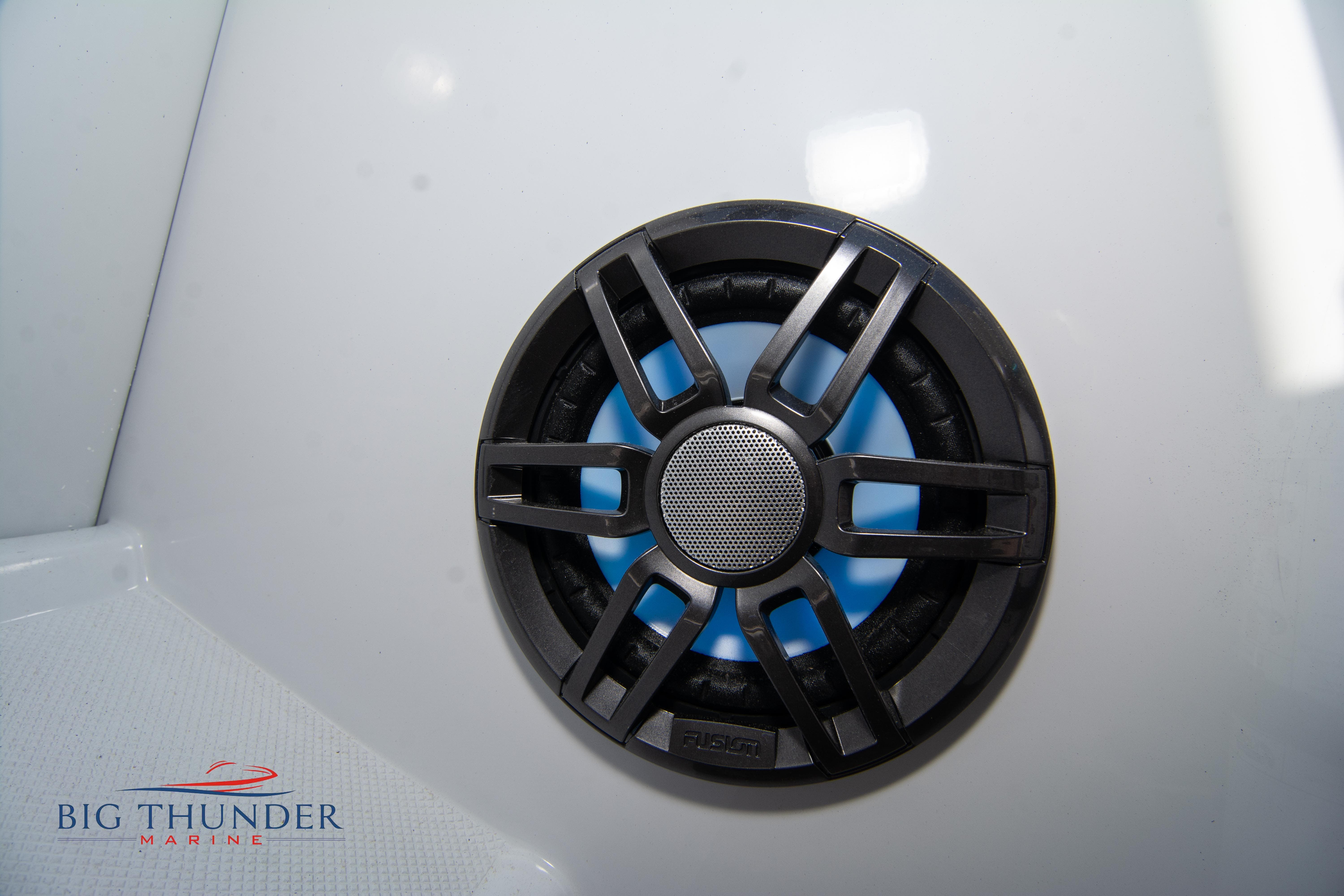 Mercury Verado w/ DTS & SmartCraft Digital Pre-Rig. Mercury 350L Verado Cold Fusion White 5.44"" 1.75HD (I-6 SC 4S). White Metallic Side Panels w/ Steel Accents. Textured HD Graphite Powder Coated Rails & Deck Trim. SS Rub Rail Insert. Slate Deluxe Poly Vinyl Flooring. Gray/White Gelcoat Interior. Black Bimini & Mooring Cover. Cladded Arch w/ Gas Assist. CP3 Performance Package ((2) 25? Round Tubes, (1) 26? Round Center Tube, Aluminum Underskin, Lifting Strakes, Electronic Power Steering, Dual Battery Switch and Battery Boxes, Battery Charger, Integrated Transom & 80-Gallon Fuel Tank). Custom Aluminum Billet Instrument & Switch Panel. 29"" High Back Helm Chair w/ Flip Up Bolster. Captain’s Cooled Drink Holder. RGB Cupholders. Mid Ship 3-Drawer Storage Unit. Premium Audio Package (Fusion MS-BB300R Head Unit, (8) Fusion MS-FR6520 6 3/4?, Fusion MS-FR6520 10? subwoofer and MS-DA51600 1600W Amplifier). Powder Coated Aluminum Deluxe ""Junior Beast"" Ski Tow Bar. Oval Dinette Table. (2) Portable Cupholders.