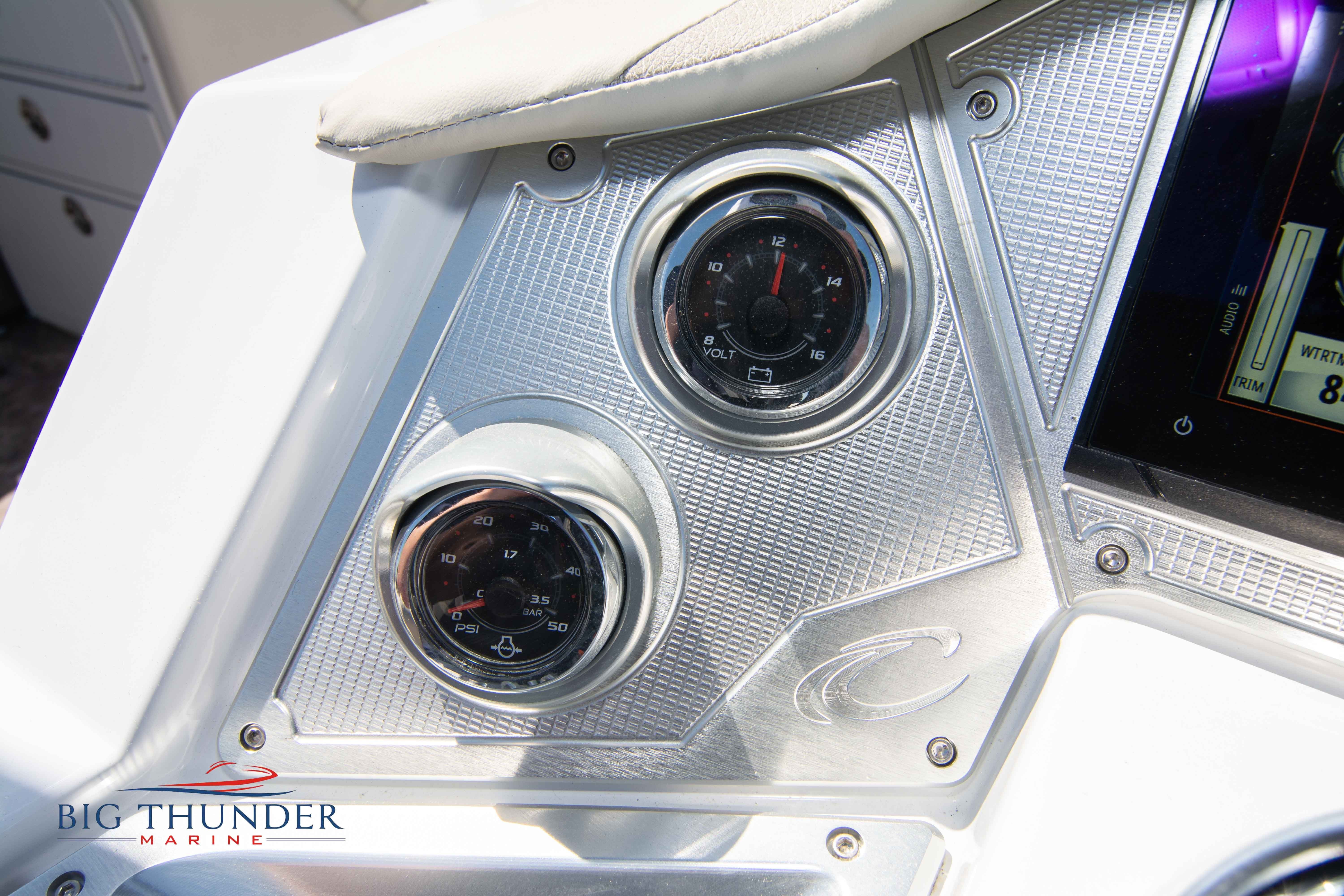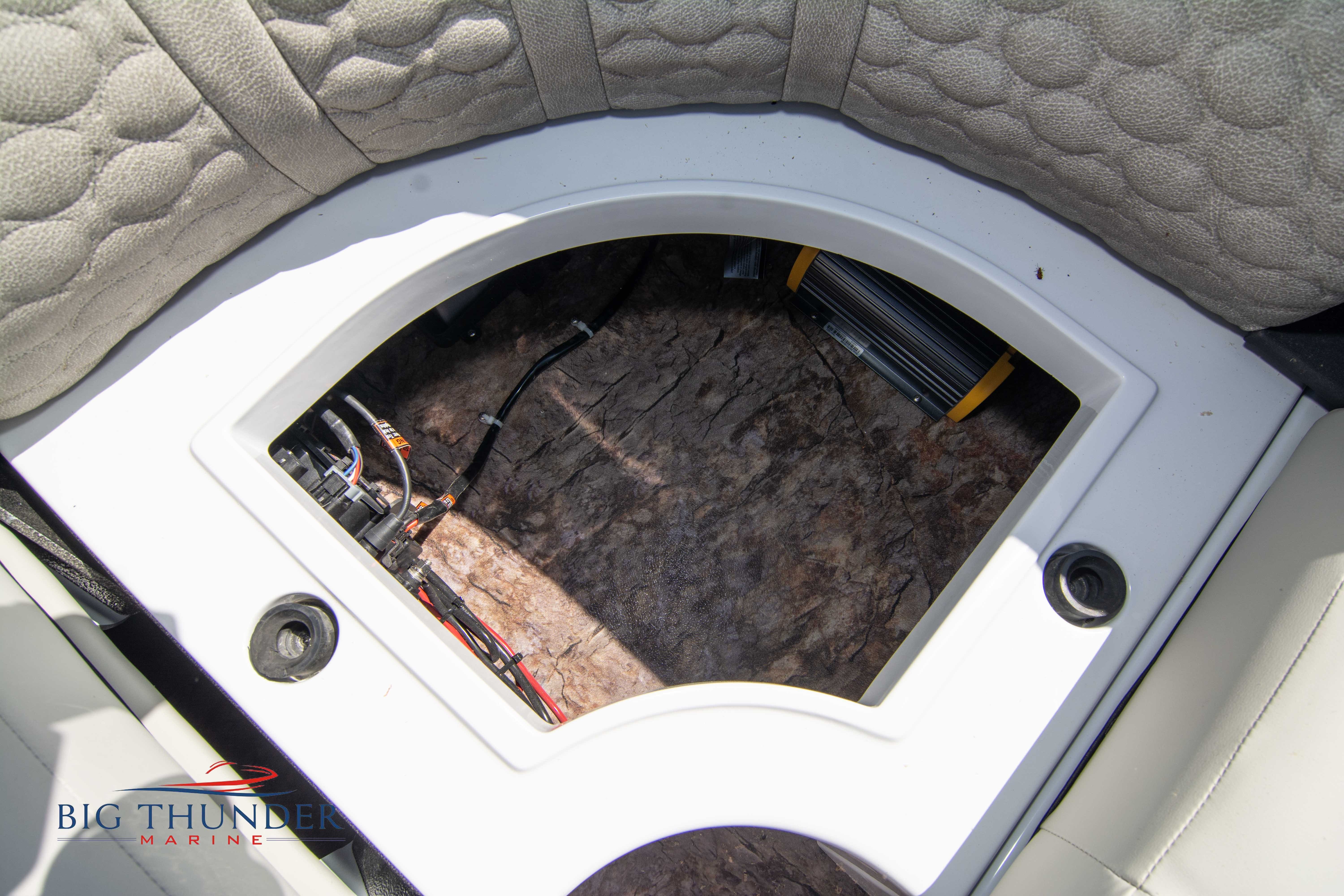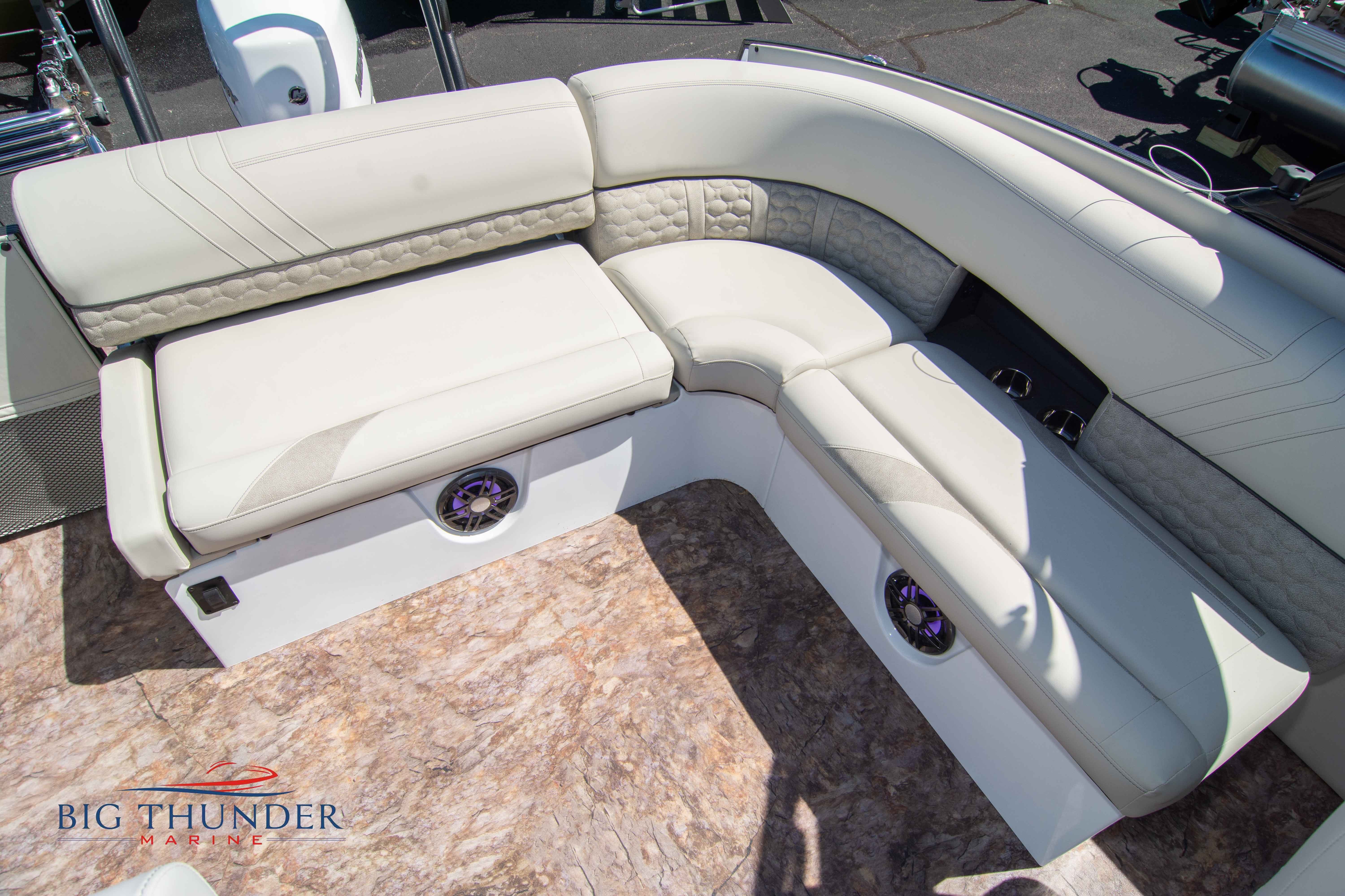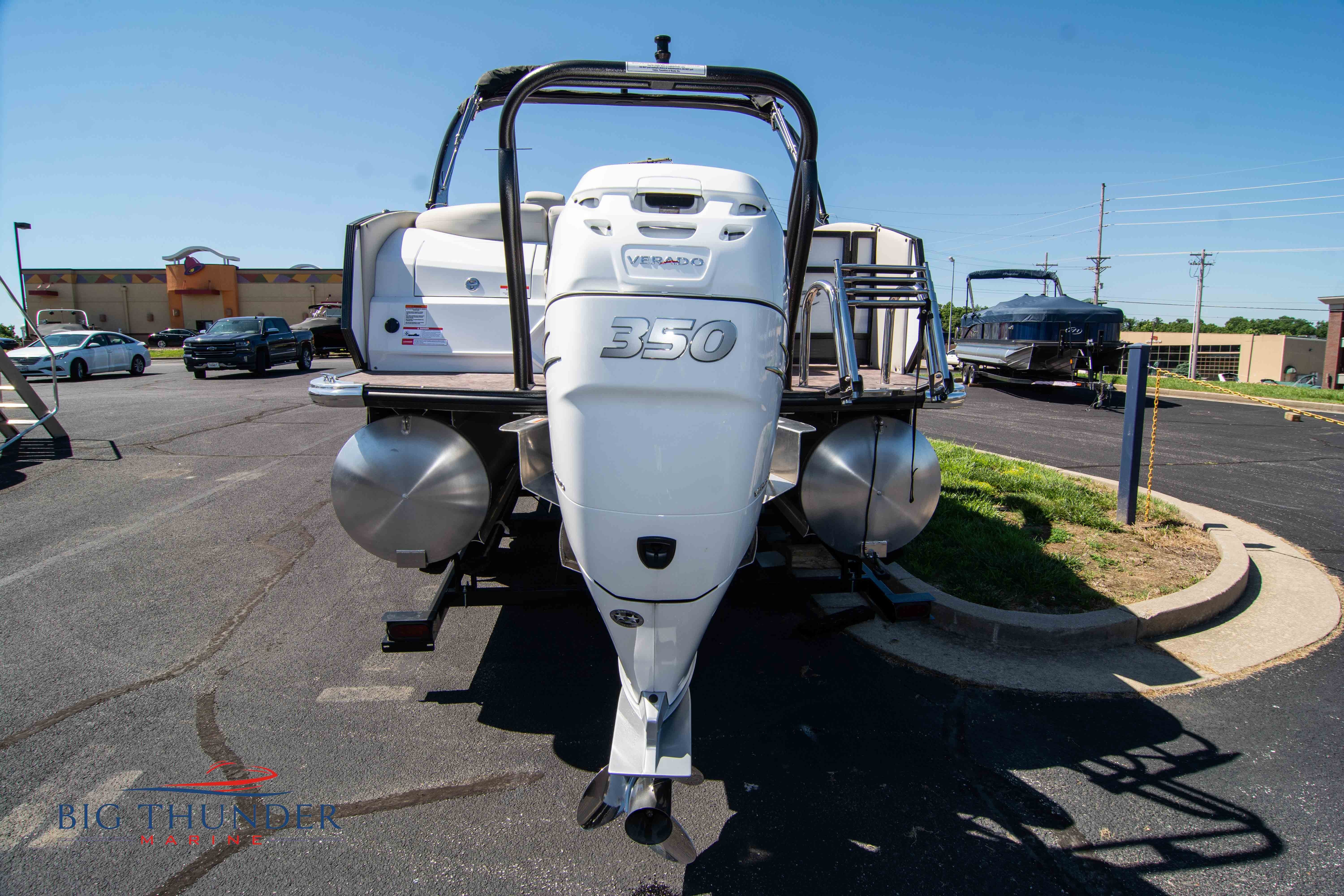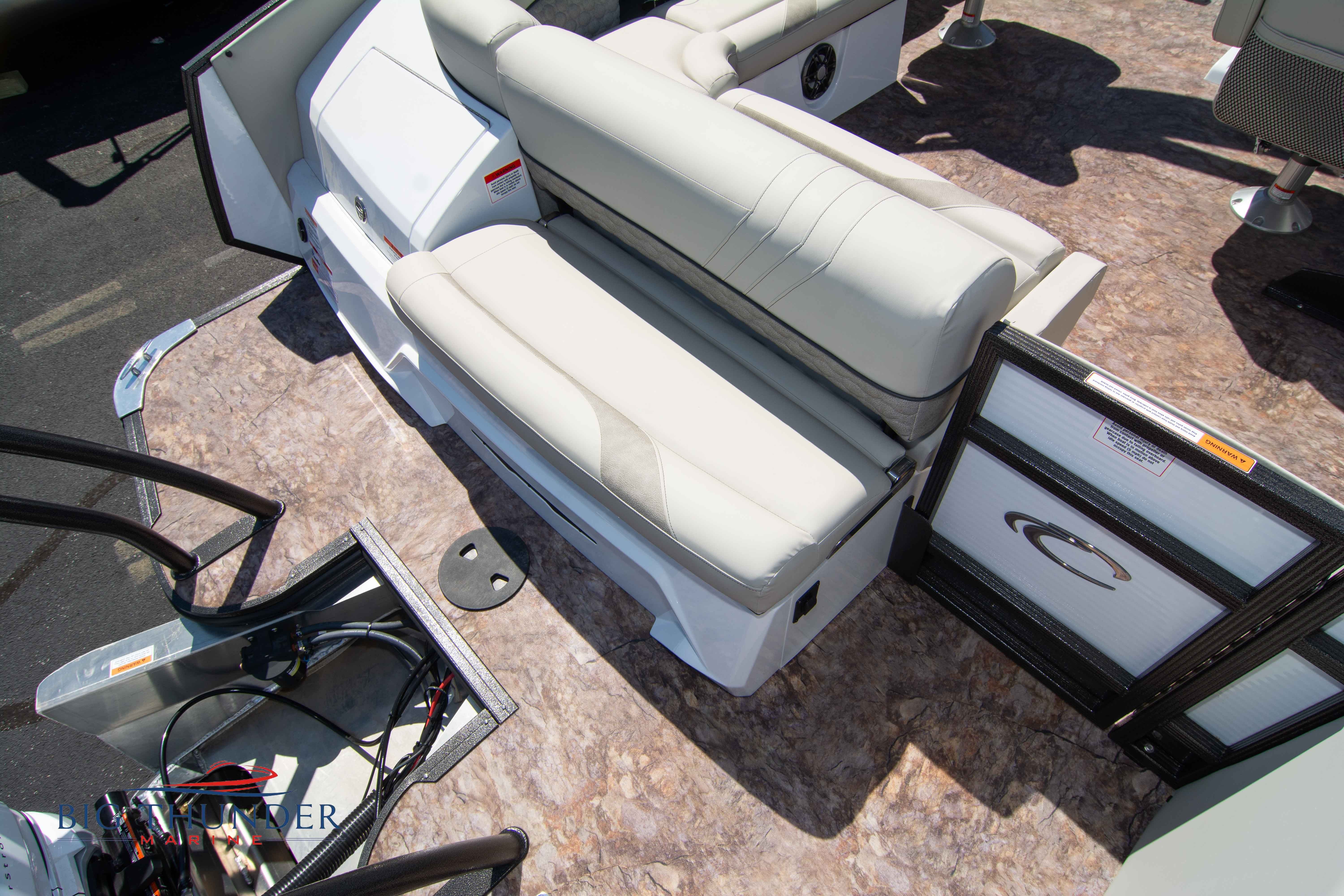 Mercury Verado w/ DTS & SmartCraft Digital Pre-Rig. Mercury 350L Verado Cold Fusion White 5.44"" 1.75HD (I-6 SC 4S). White Metallic Side Panels w/ Steel Accents. Textured HD Graphite Powder Coated Rails & Deck Trim. SS Rub Rail Insert. Slate Deluxe Poly Vinyl Flooring. Gray/White Gelcoat Interior. Black Bimini & Mooring Cover. Cladded Arch w/ Gas Assist. CP3 Performance Package ((2) 25? Round Tubes, (1) 26? Round Center Tube, Aluminum Underskin, Lifting Strakes, Electronic Power Steering, Dual Battery Switch and Battery Boxes, Battery Charger, Integrated Transom & 80-Gallon Fuel Tank). Custom Aluminum Billet Instrument & Switch Panel. 29"" High Back Helm Chair w/ Flip Up Bolster. Captain’s Cooled Drink Holder. RGB Cupholders. Mid Ship 3-Drawer Storage Unit. Premium Audio Package (Fusion MS-BB300R Head Unit, (8) Fusion MS-FR6520 6 3/4?, Fusion MS-FR6520 10? subwoofer and MS-DA51600 1600W Amplifier). Powder Coated Aluminum Deluxe ""Junior Beast"" Ski Tow Bar. Oval Dinette Table. (2) Portable Cupholders.