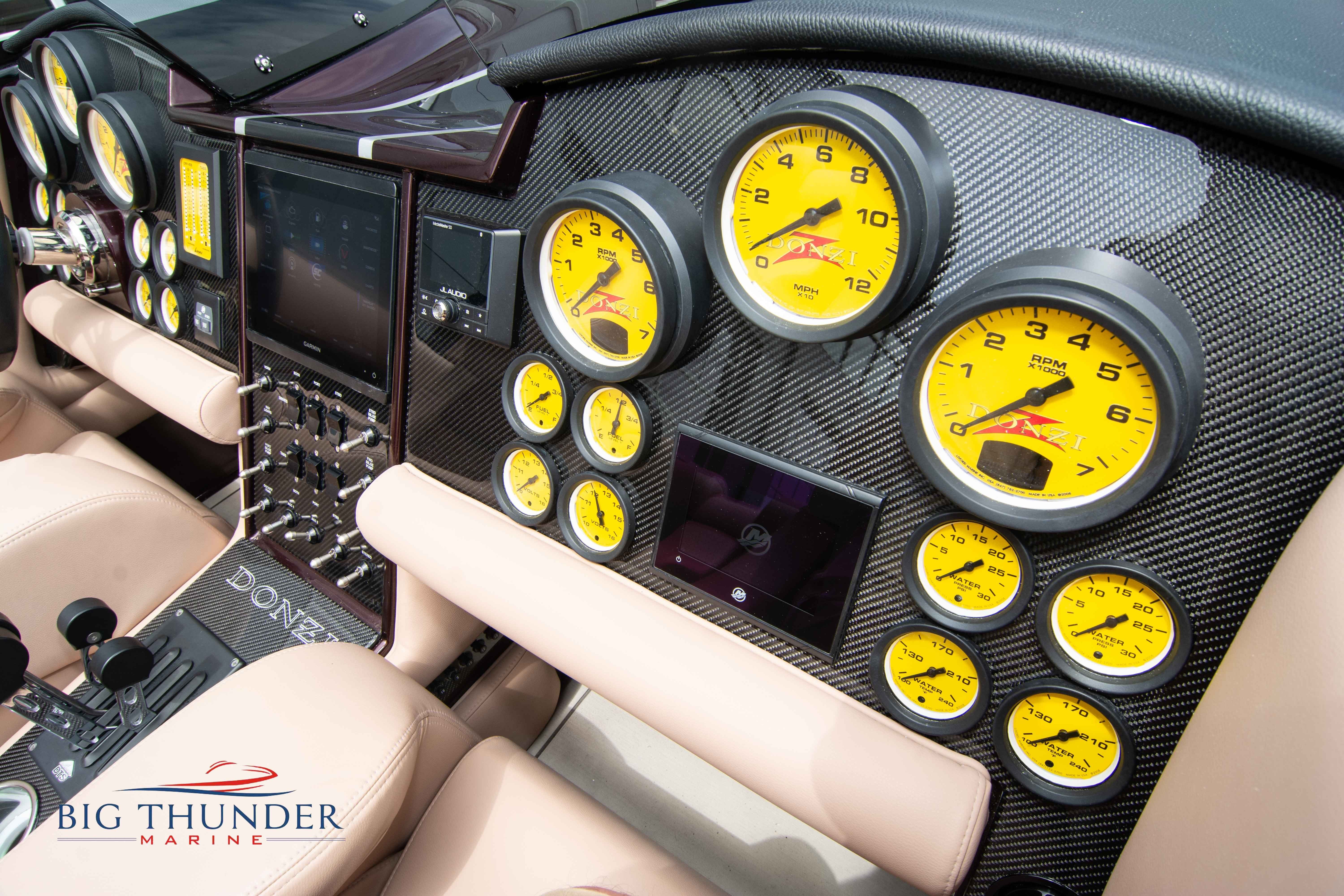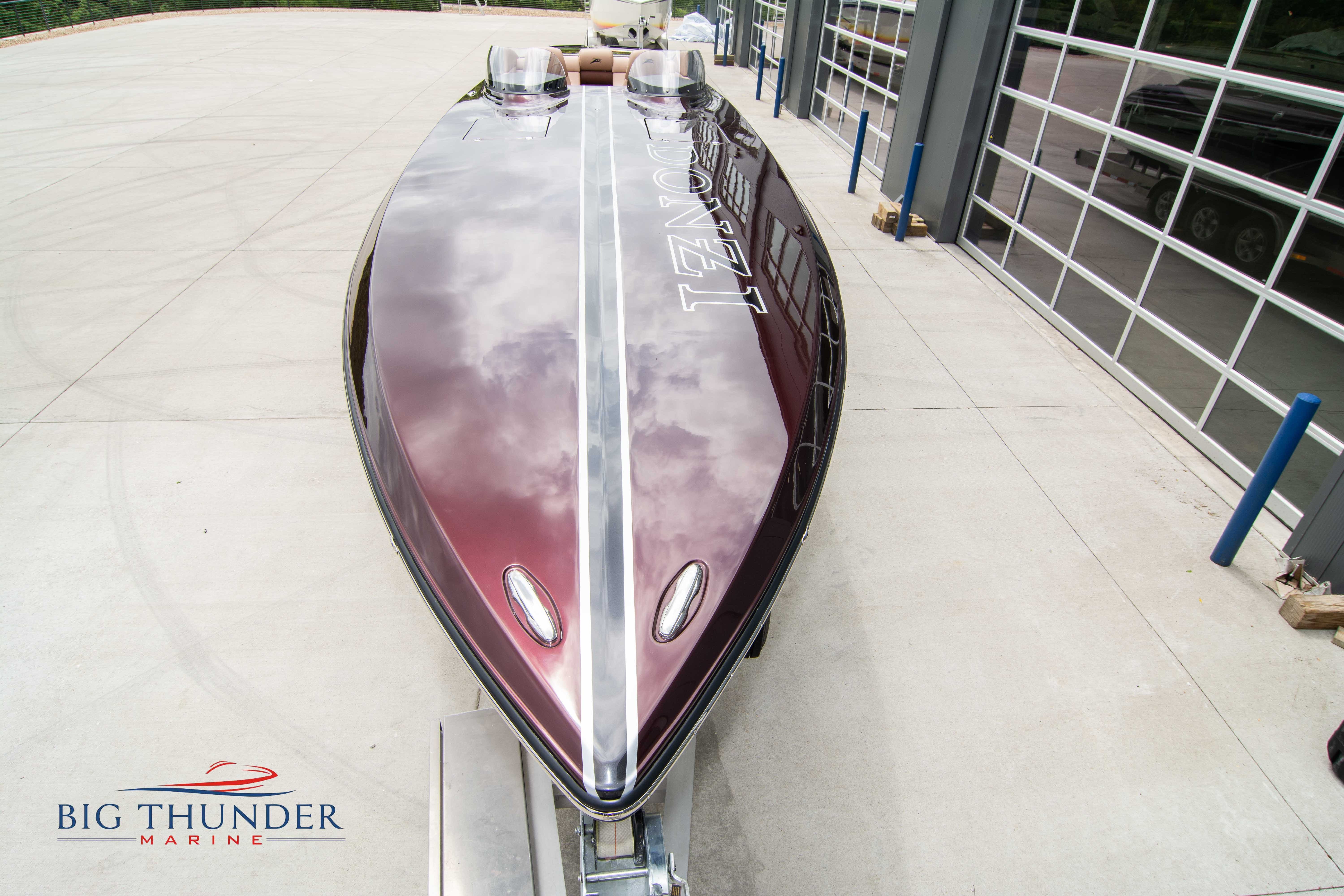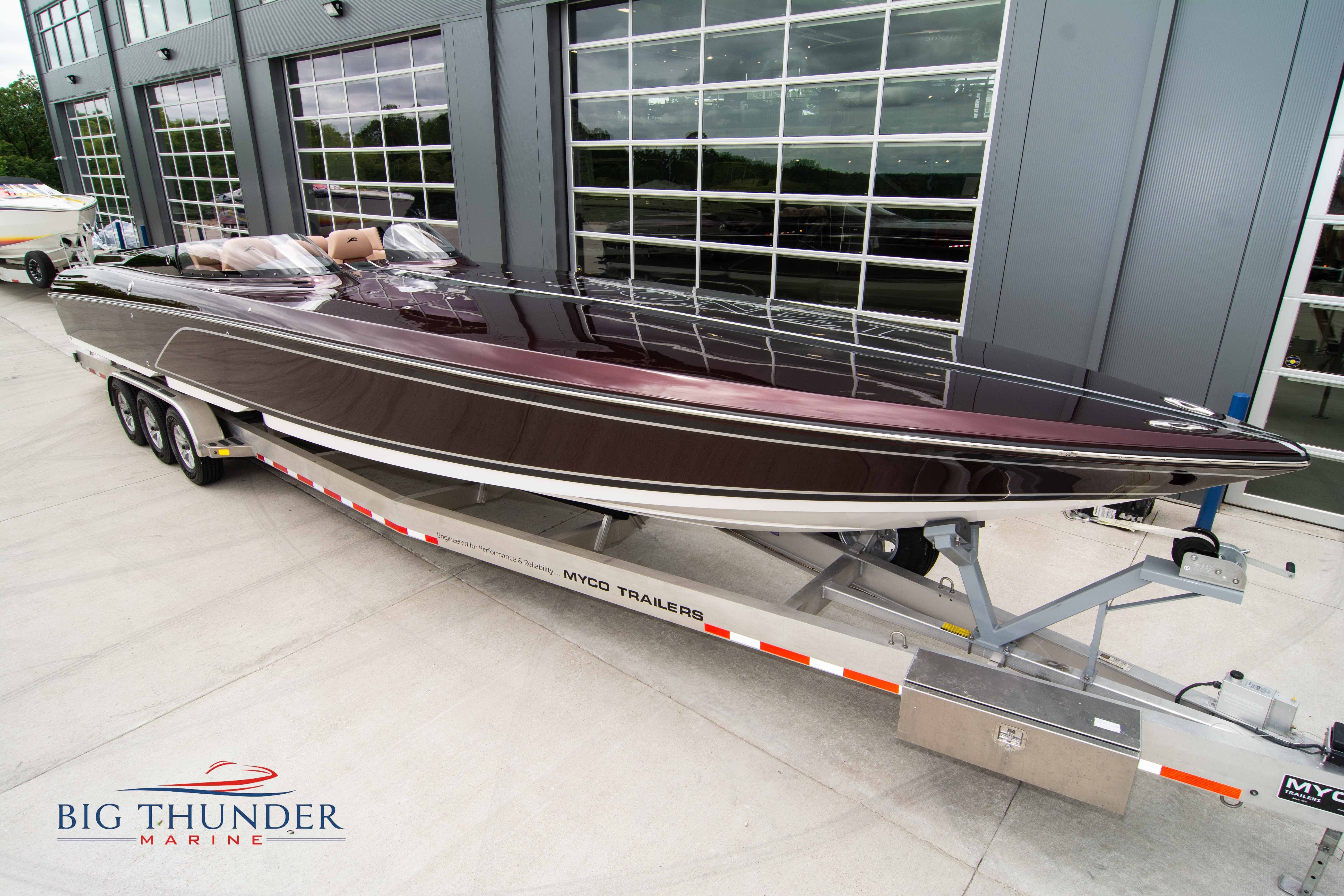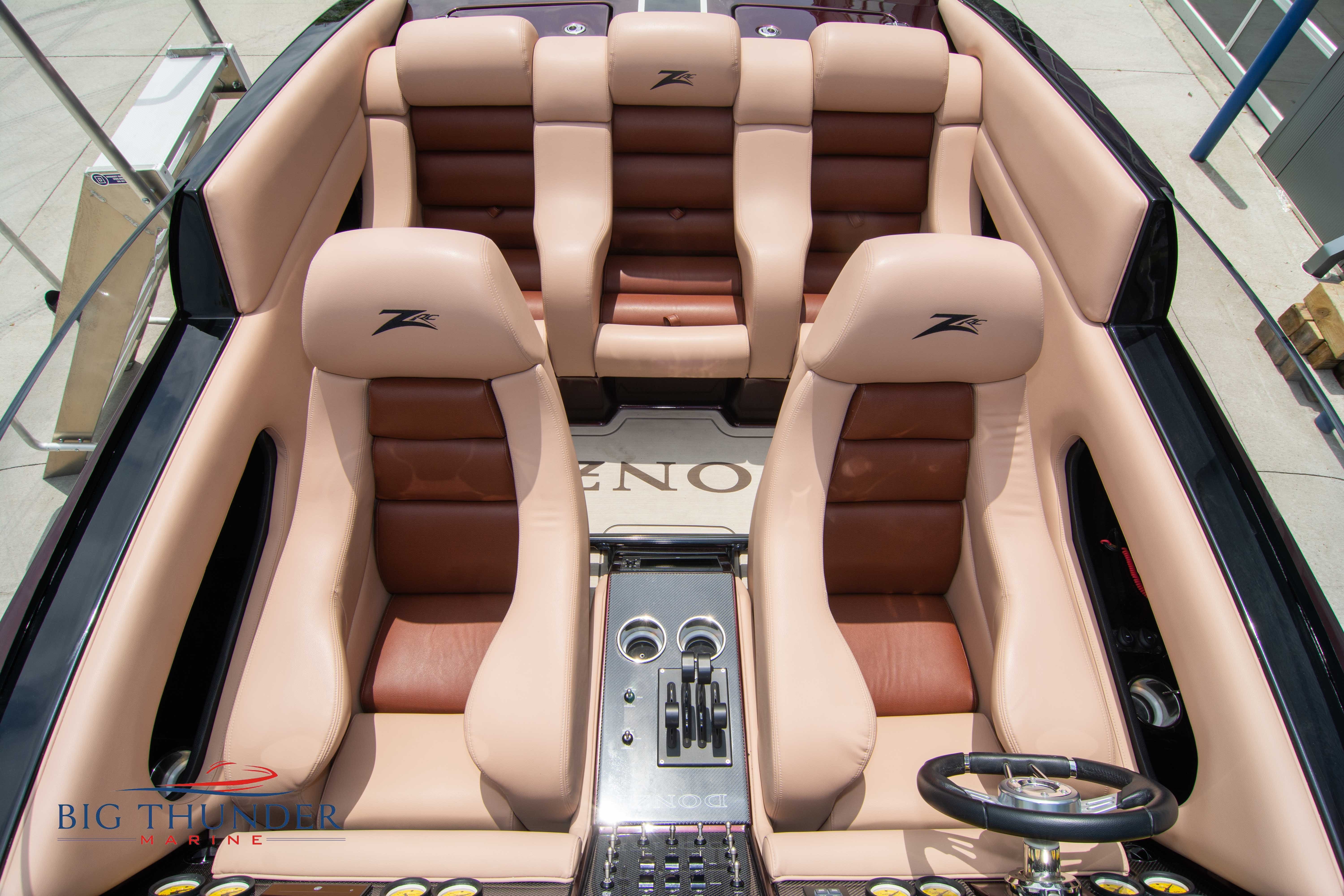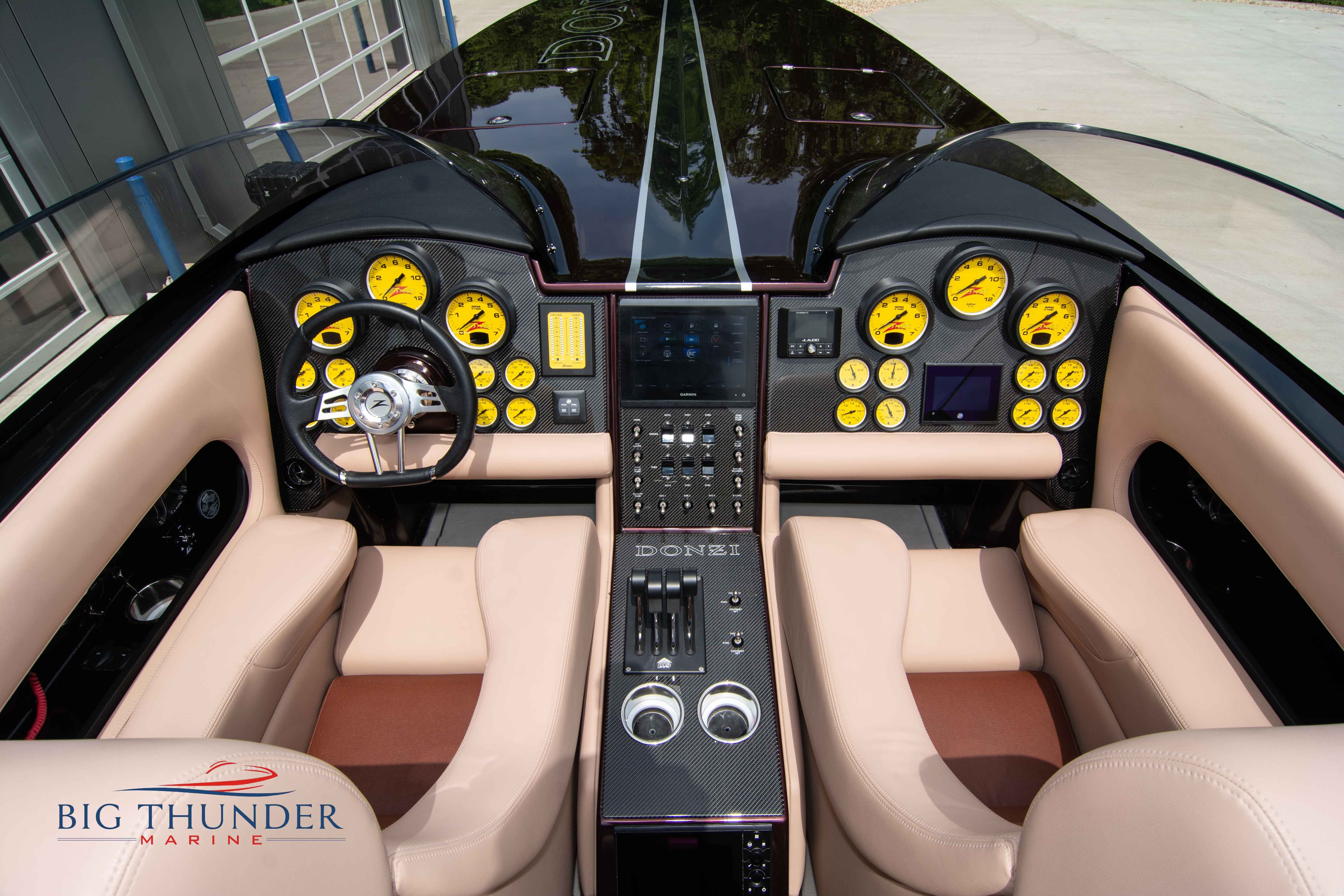2020 Donzi 38 ZRC Twin Staggered Mercury Racing 860’s w/ #6 Drives Mercury Racing 5 Blade 17.5 x 32 Stainless Steel Props. The newest edition in the Donzi high performance lineup is a revival of the iconic 38 ZRC, back by popular demand. Sleek and loaded with the latest tech. Donzi Positive Lift Double Step Hull, Livorsi 1050 High Performance Hydraulic Trim Tabs, Three Battery Bank w/ House Bank Switches & Charging System, Shadowcaster RGB LED Underwater & Interior Lighting, LED Nav Lights, Sport Bucket Seats w/ Electrically Actuated Footrests, Aft Cockpit Seating w/ Dry Storage Below, Upholstered Side Panels w/ 12v Power Outlets & Phone Chargers (4 ea.), Carbon Dash Panel w/ Toggle Switches, Mercury Vessel View 502 & 703 Instrumentation w/ 2 Additional 502’s in Cockpit, Garmin GPSMap 8610, Livorsi Sport Controls, Custom Steering Wheel w/ Leather Trim, Premium JL Audio System-MediaMaster MM50 Source Unit, RGB LED 7.7 Speakers (2 ea.), RGB LED 8.8 Speakers (2 ea.), 600W 6 Ch. Amp.
