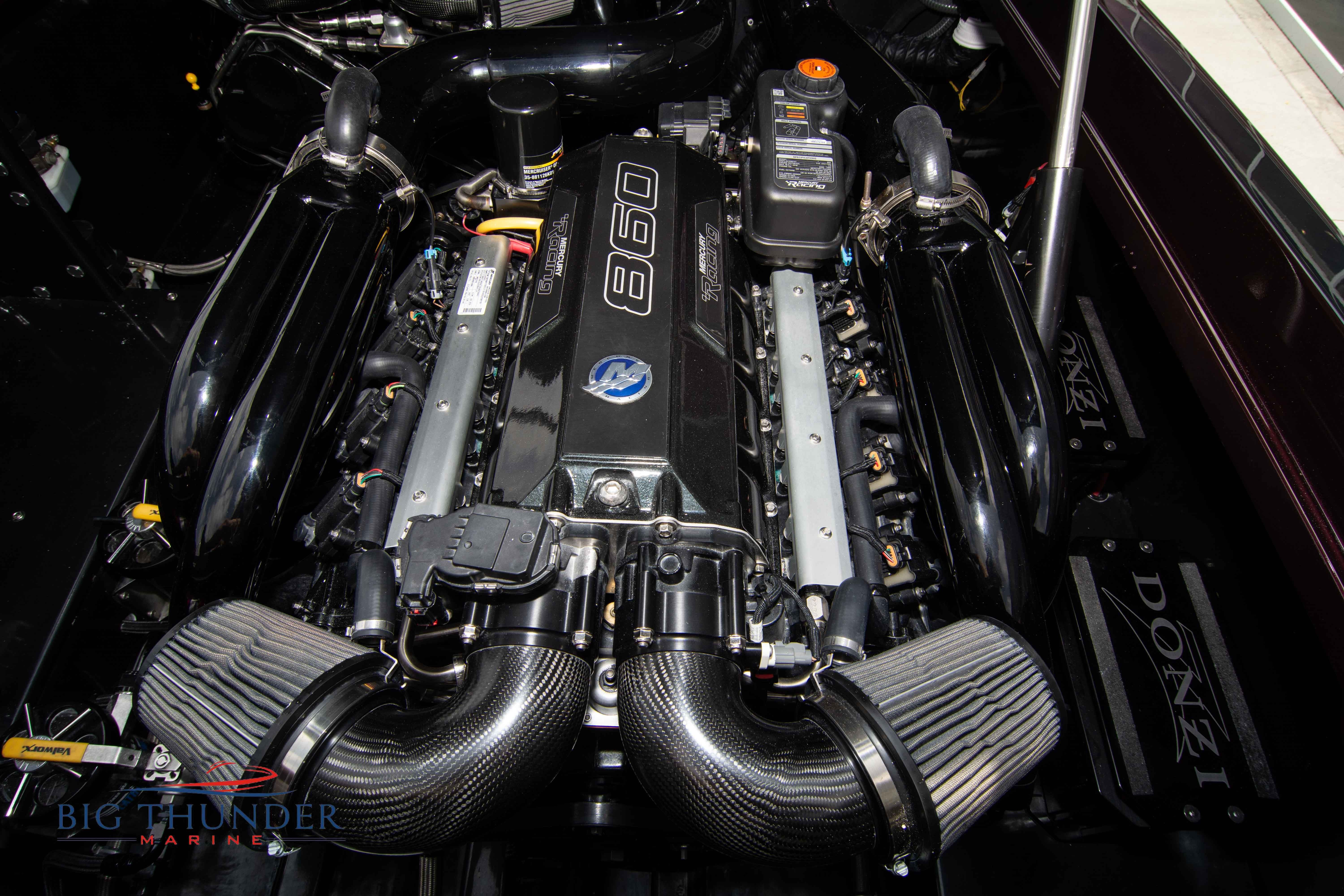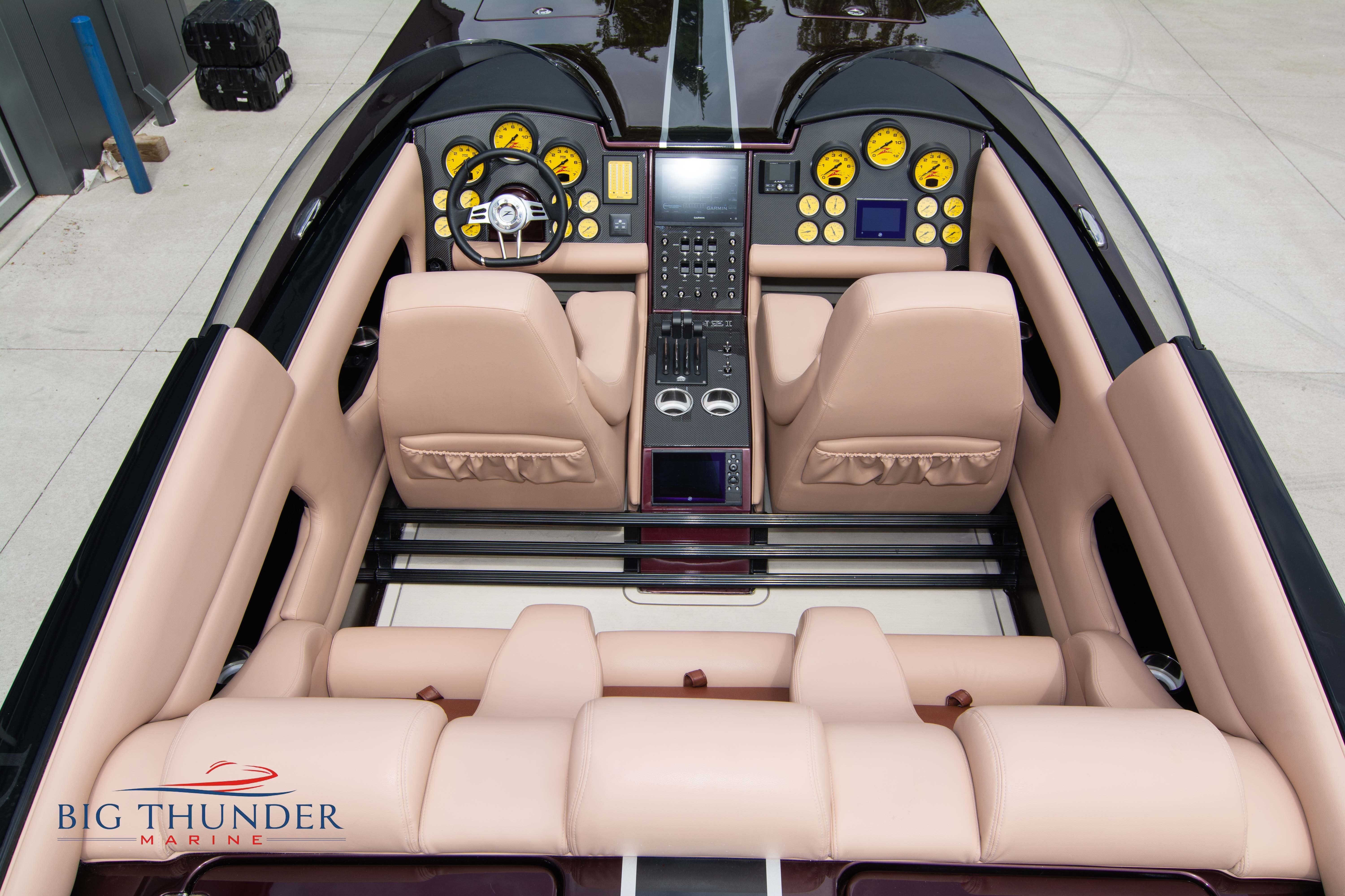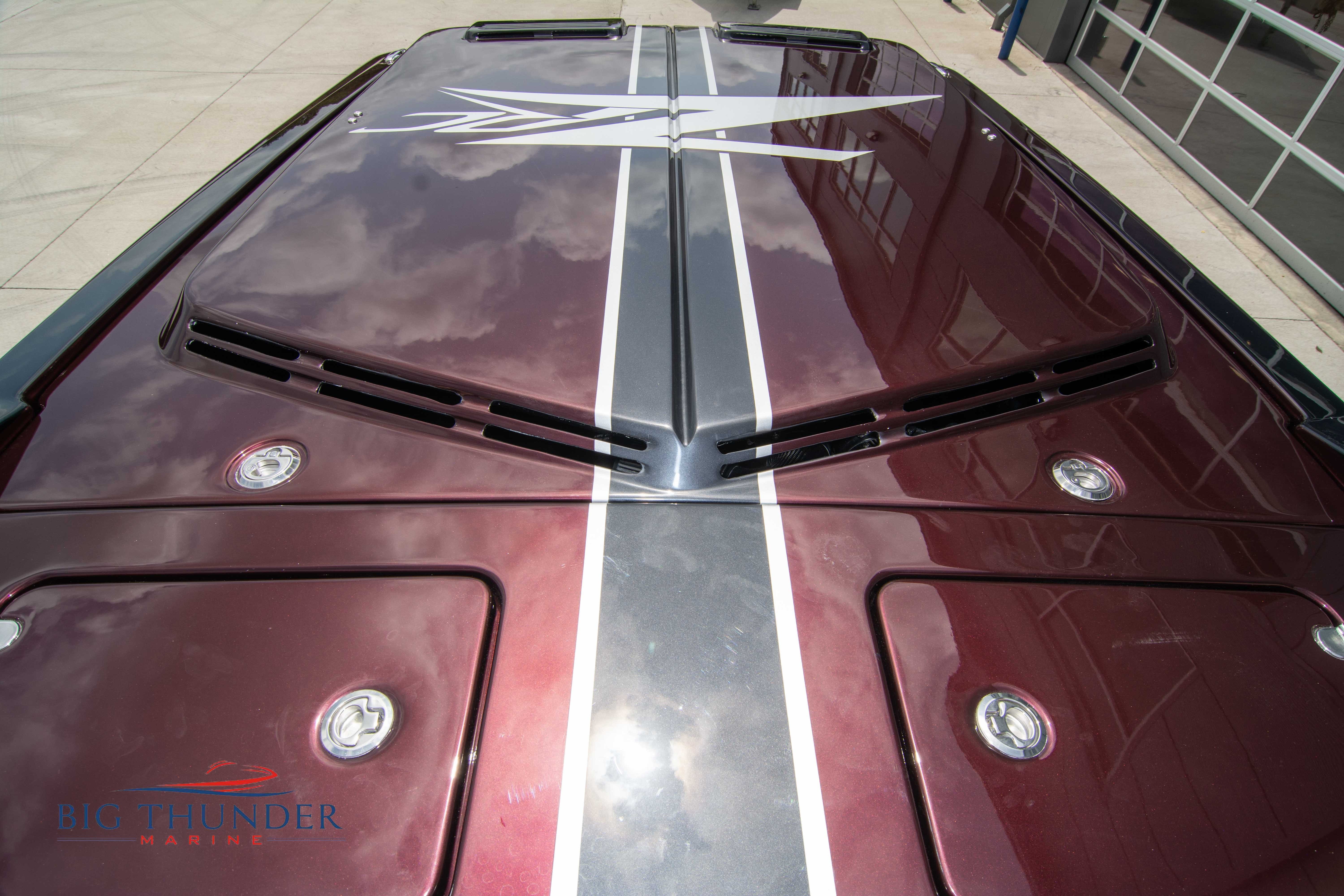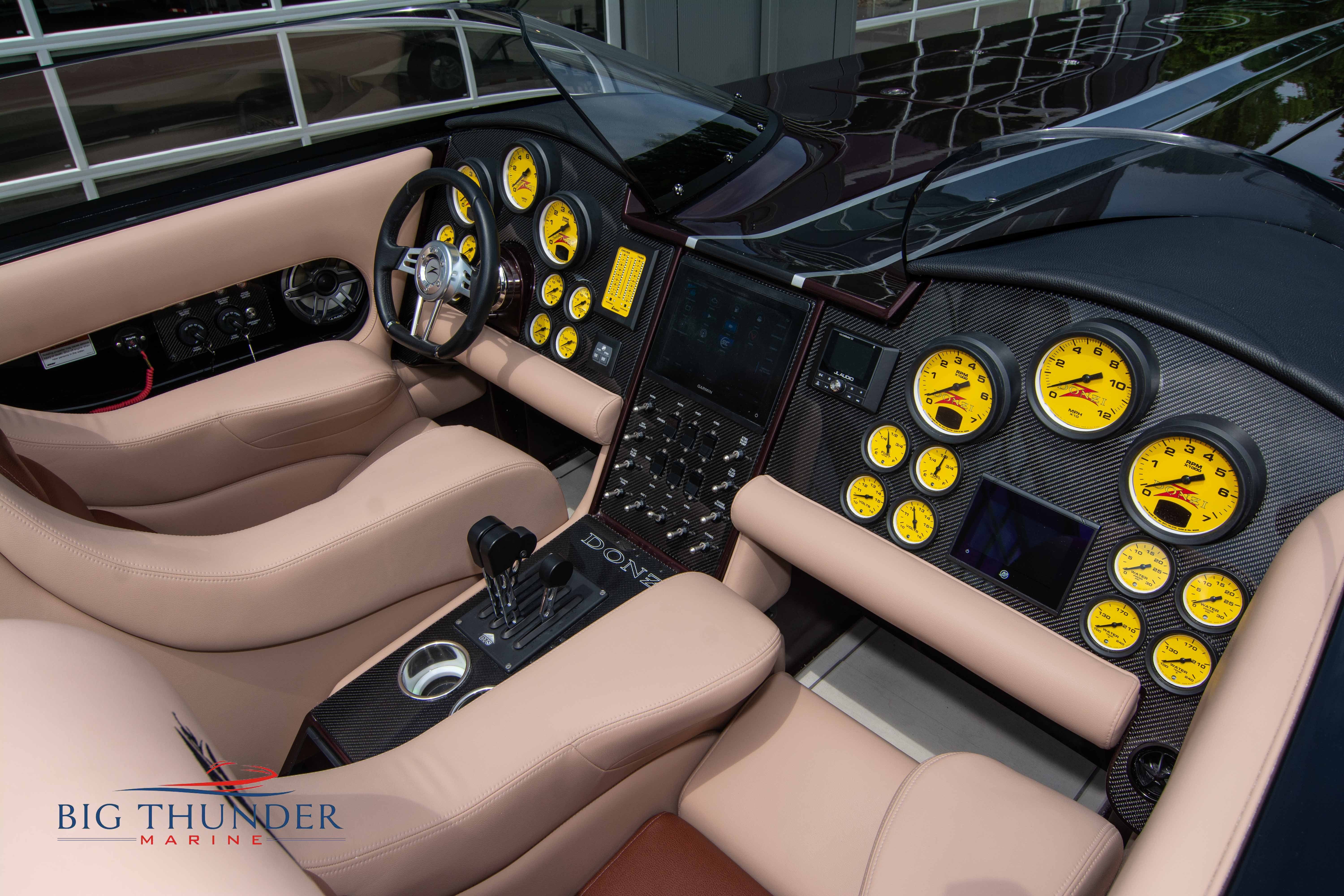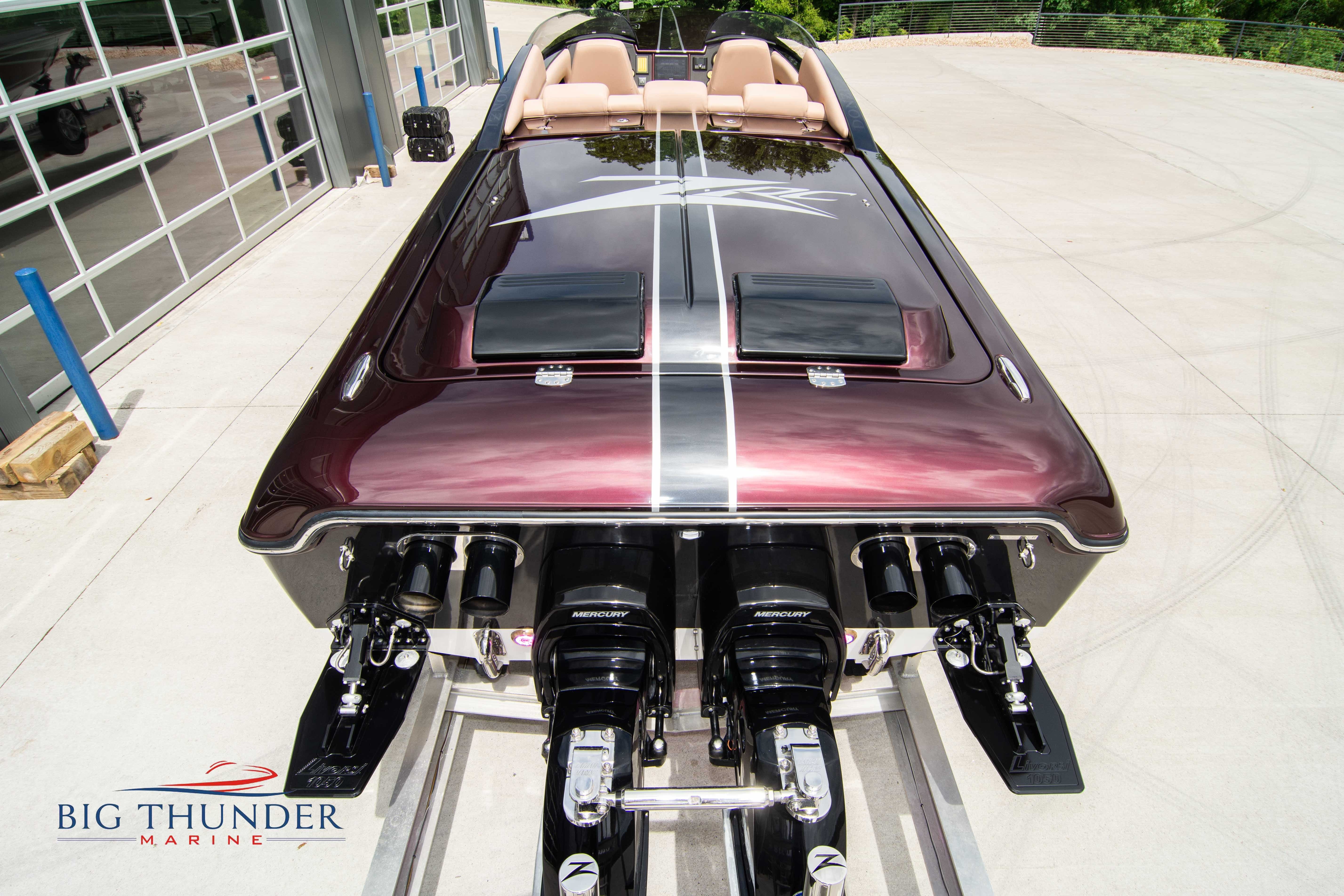 2020 Donzi 38 ZRC Twin Staggered Mercury Racing 860’s w/ #6 Drives Mercury Racing 5 Blade 17.5 x 32 Stainless Steel Props. The newest edition in the Donzi high performance lineup is a revival of the iconic 38 ZRC, back by popular demand. Sleek and loaded with the latest tech. Donzi Positive Lift Double Step Hull, Livorsi 1050 High Performance Hydraulic Trim Tabs, Three Battery Bank w/ House Bank Switches & Charging System, Shadowcaster RGB LED Underwater & Interior Lighting, LED Nav Lights, Sport Bucket Seats w/ Electrically Actuated Footrests, Aft Cockpit Seating w/ Dry Storage Below, Upholstered Side Panels w/ 12v Power Outlets & Phone Chargers (4 ea.), Carbon Dash Panel w/ Toggle Switches, Mercury Vessel View 502 & 703 Instrumentation w/ 2 Additional 502’s in Cockpit, Garmin GPSMap 8610, Livorsi Sport Controls, Custom Steering Wheel w/ Leather Trim, Premium JL Audio System-MediaMaster MM50 Source Unit, RGB LED 7.7 Speakers (2 ea.), RGB LED 8.8 Speakers (2 ea.), 600W 6 Ch. Amp.