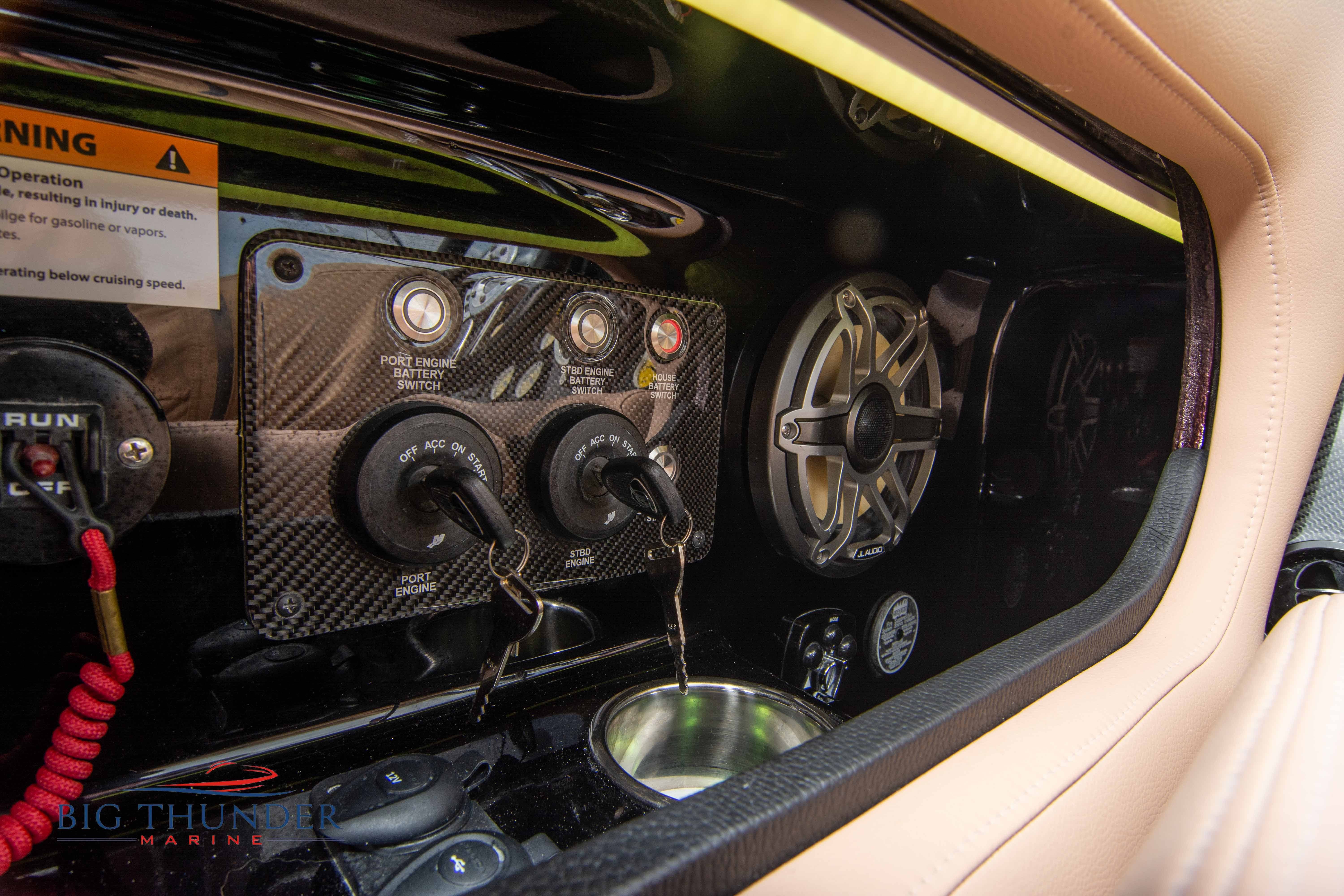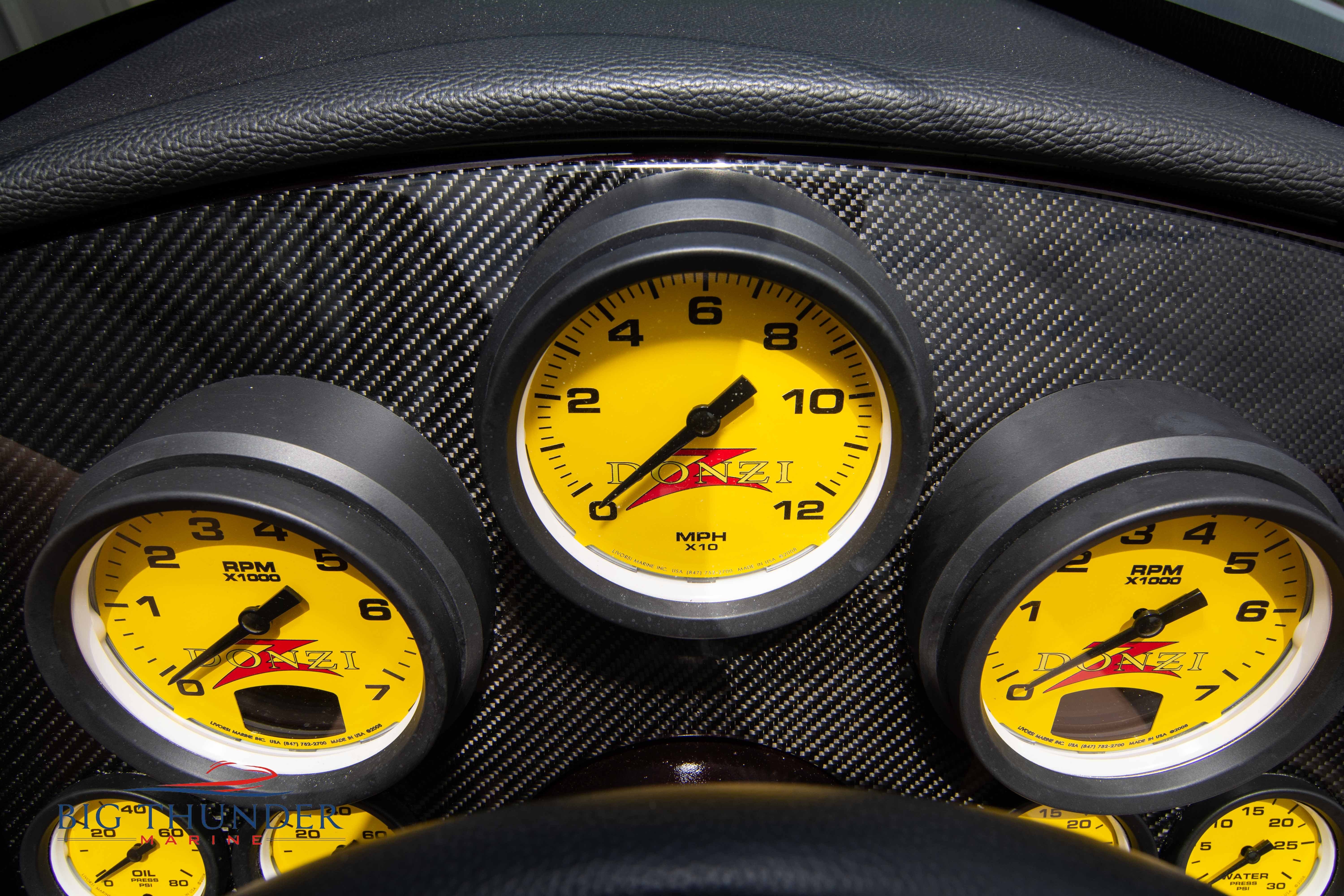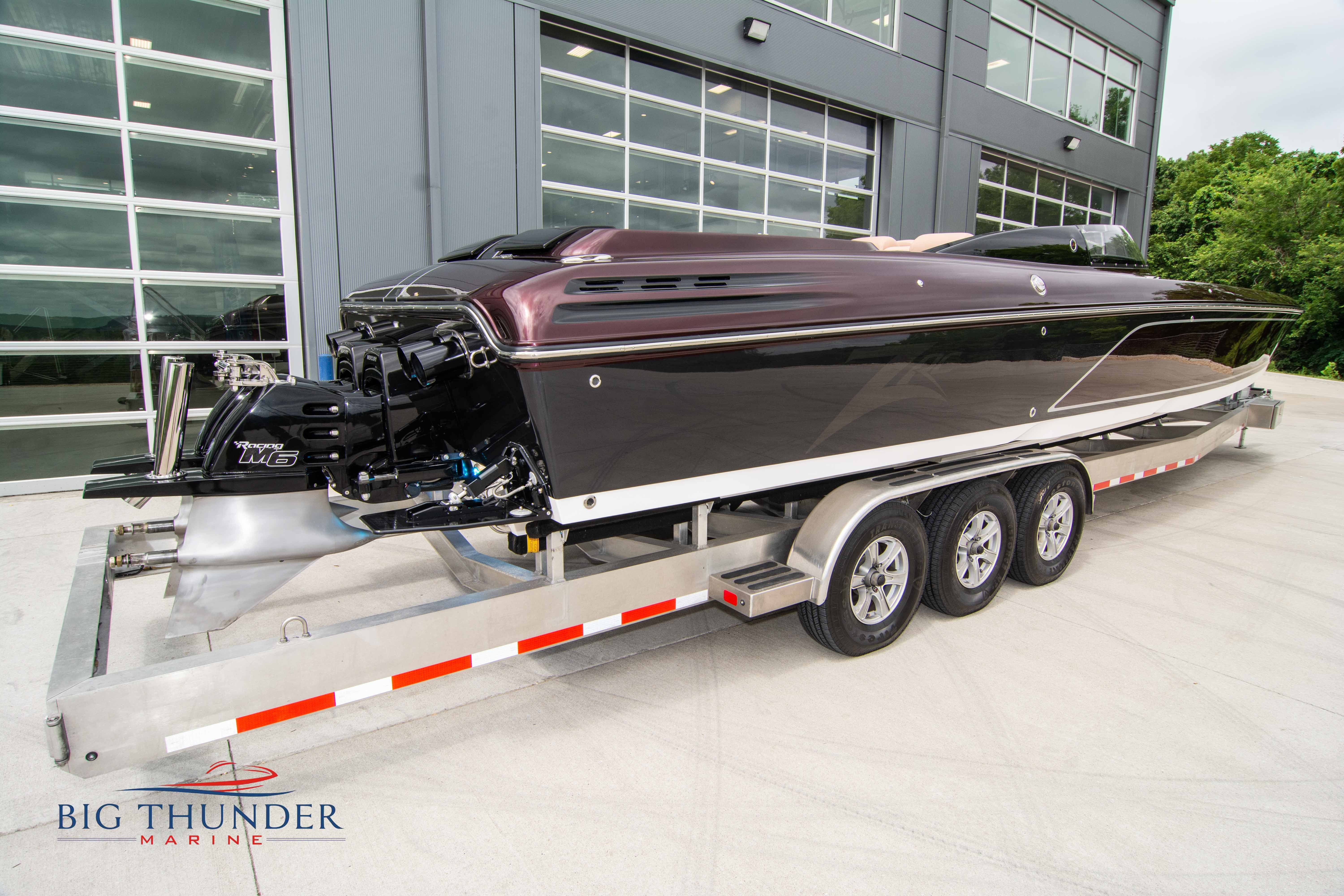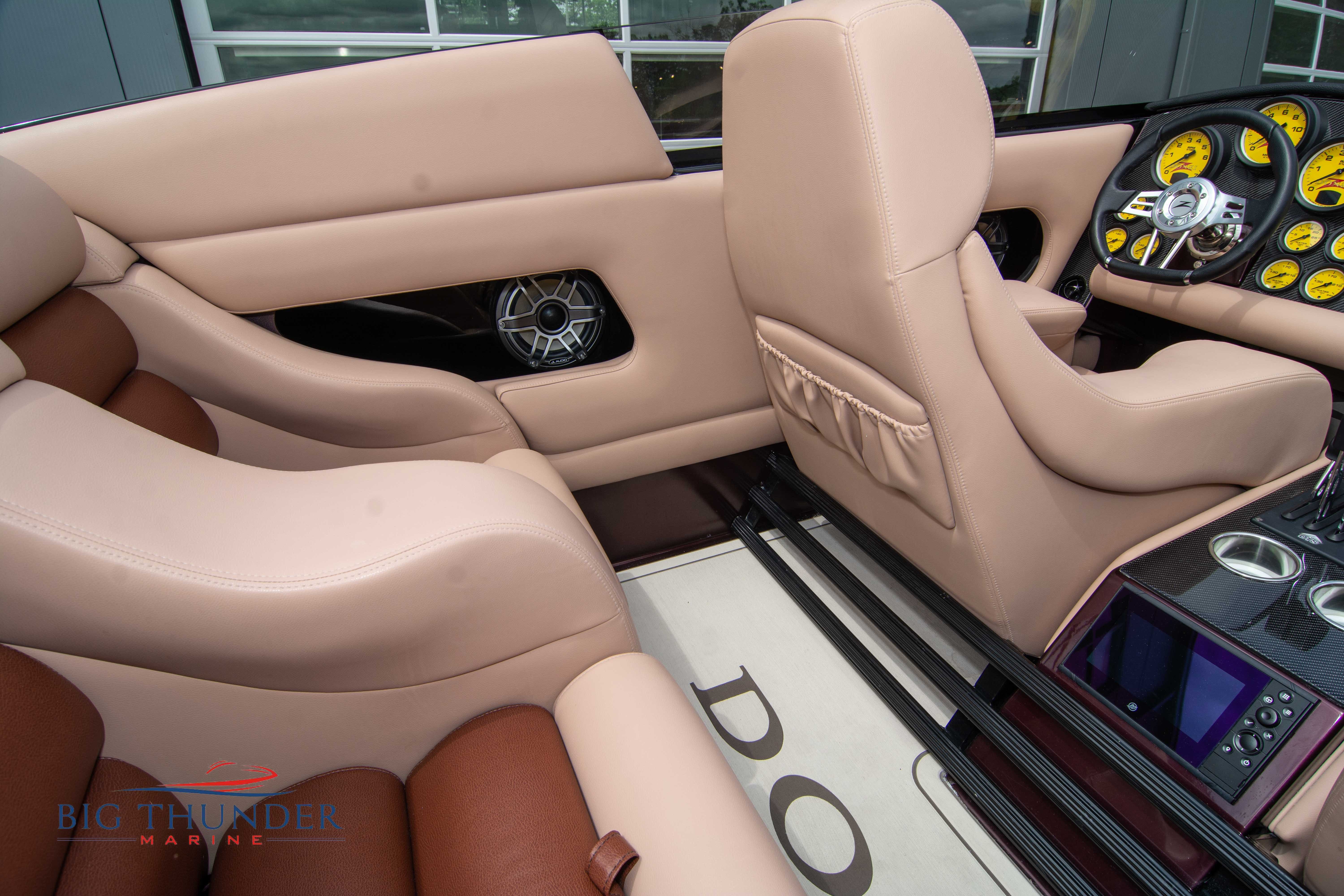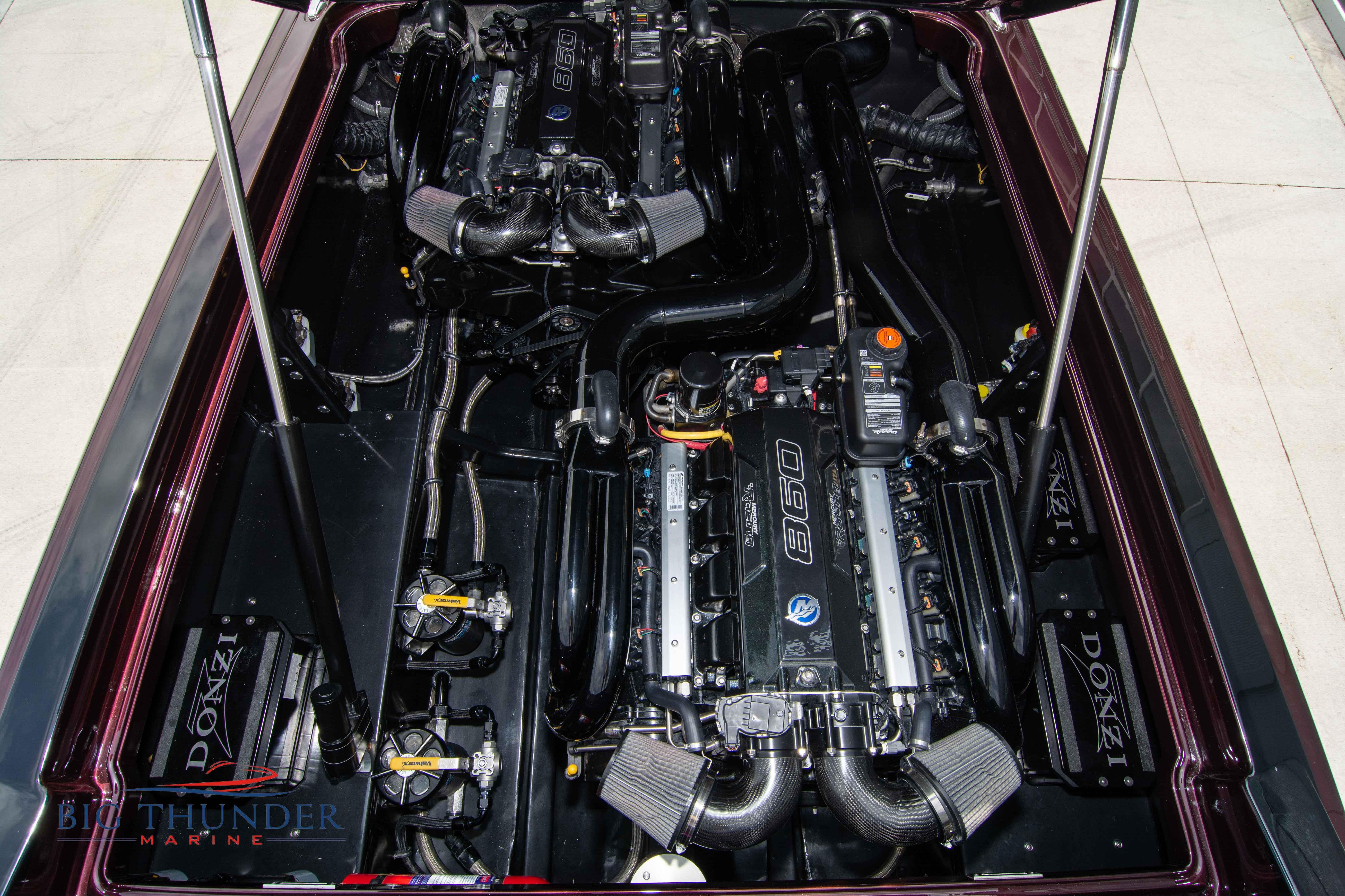 2020 Donzi 38 ZRC Twin Staggered Mercury Racing 860’s w/ #6 Drives Mercury Racing 5 Blade 17.5 x 32 Stainless Steel Props. The newest edition in the Donzi high performance lineup is a revival of the iconic 38 ZRC, back by popular demand. Sleek and loaded with the latest tech. Donzi Positive Lift Double Step Hull, Livorsi 1050 High Performance Hydraulic Trim Tabs, Three Battery Bank w/ House Bank Switches & Charging System, Shadowcaster RGB LED Underwater & Interior Lighting, LED Nav Lights, Sport Bucket Seats w/ Electrically Actuated Footrests, Aft Cockpit Seating w/ Dry Storage Below, Upholstered Side Panels w/ 12v Power Outlets & Phone Chargers (4 ea.), Carbon Dash Panel w/ Toggle Switches, Mercury Vessel View 502 & 703 Instrumentation w/ 2 Additional 502’s in Cockpit, Garmin GPSMap 8610, Livorsi Sport Controls, Custom Steering Wheel w/ Leather Trim, Premium JL Audio System-MediaMaster MM50 Source Unit, RGB LED 7.7 Speakers (2 ea.), RGB LED 8.8 Speakers (2 ea.), 600W 6 Ch. Amp.