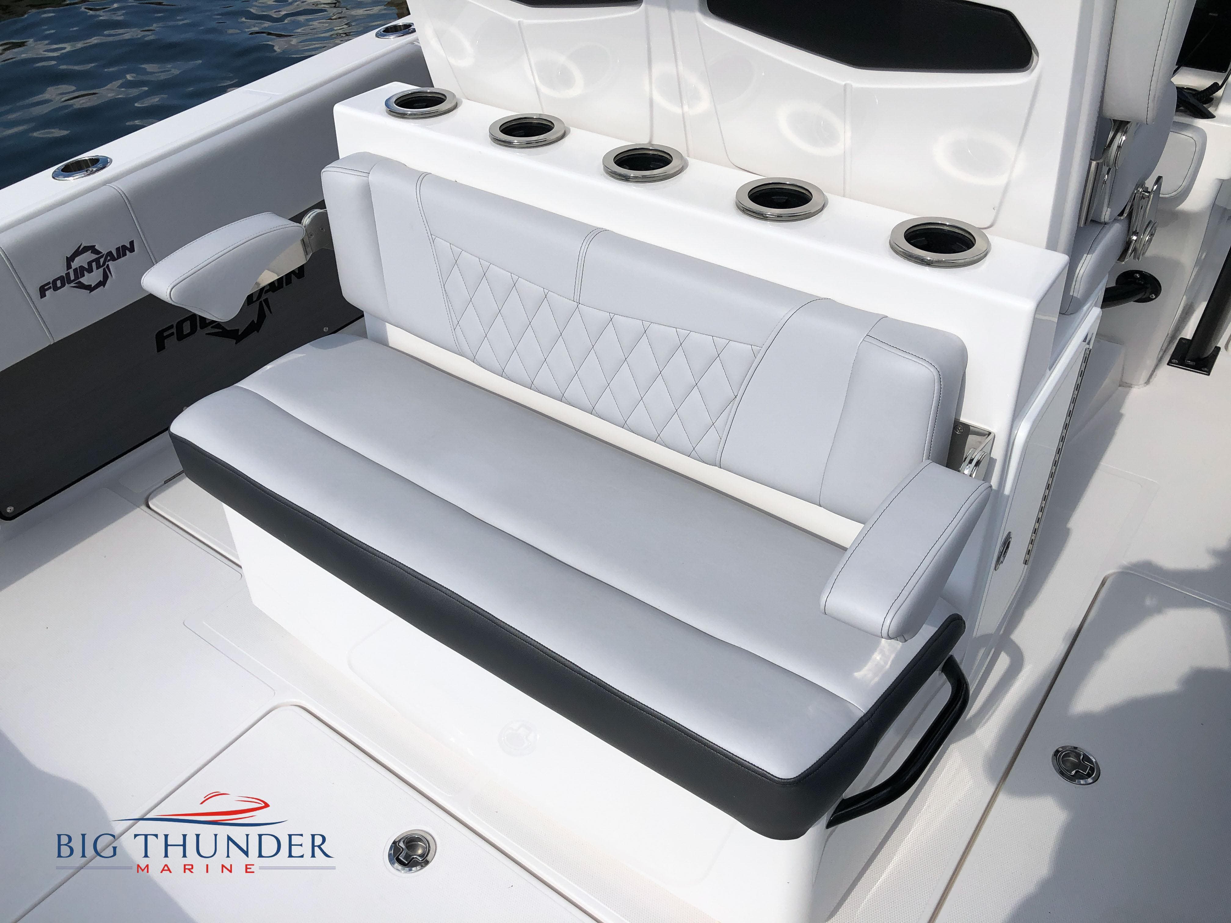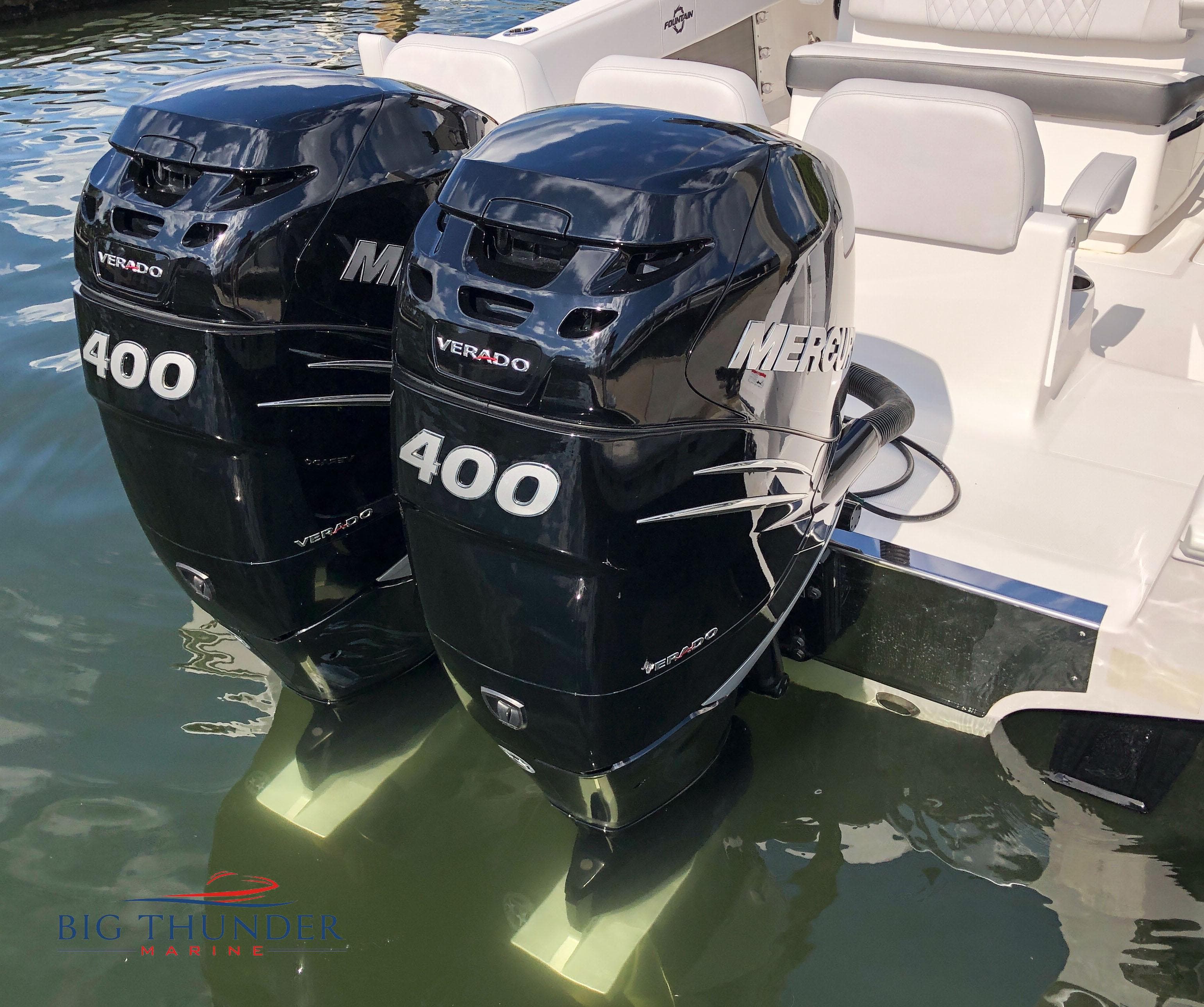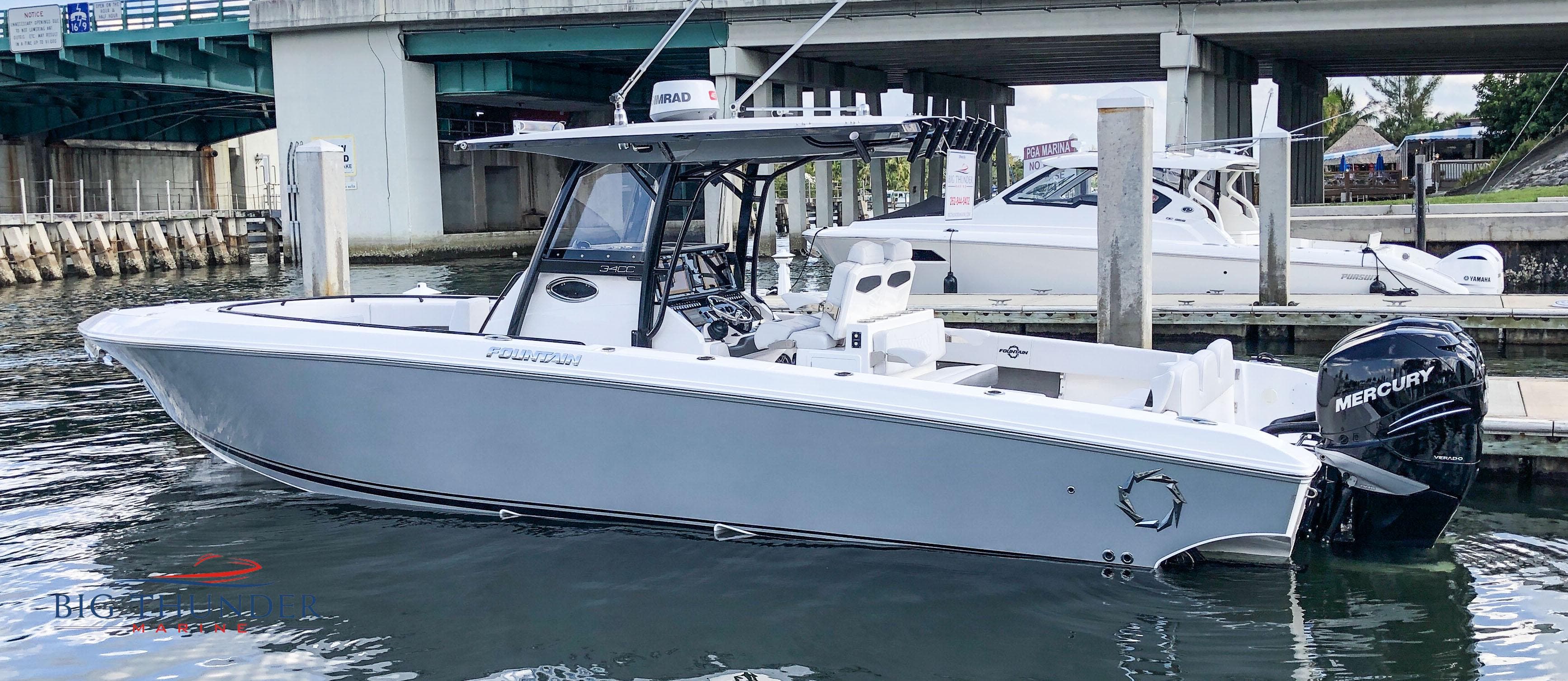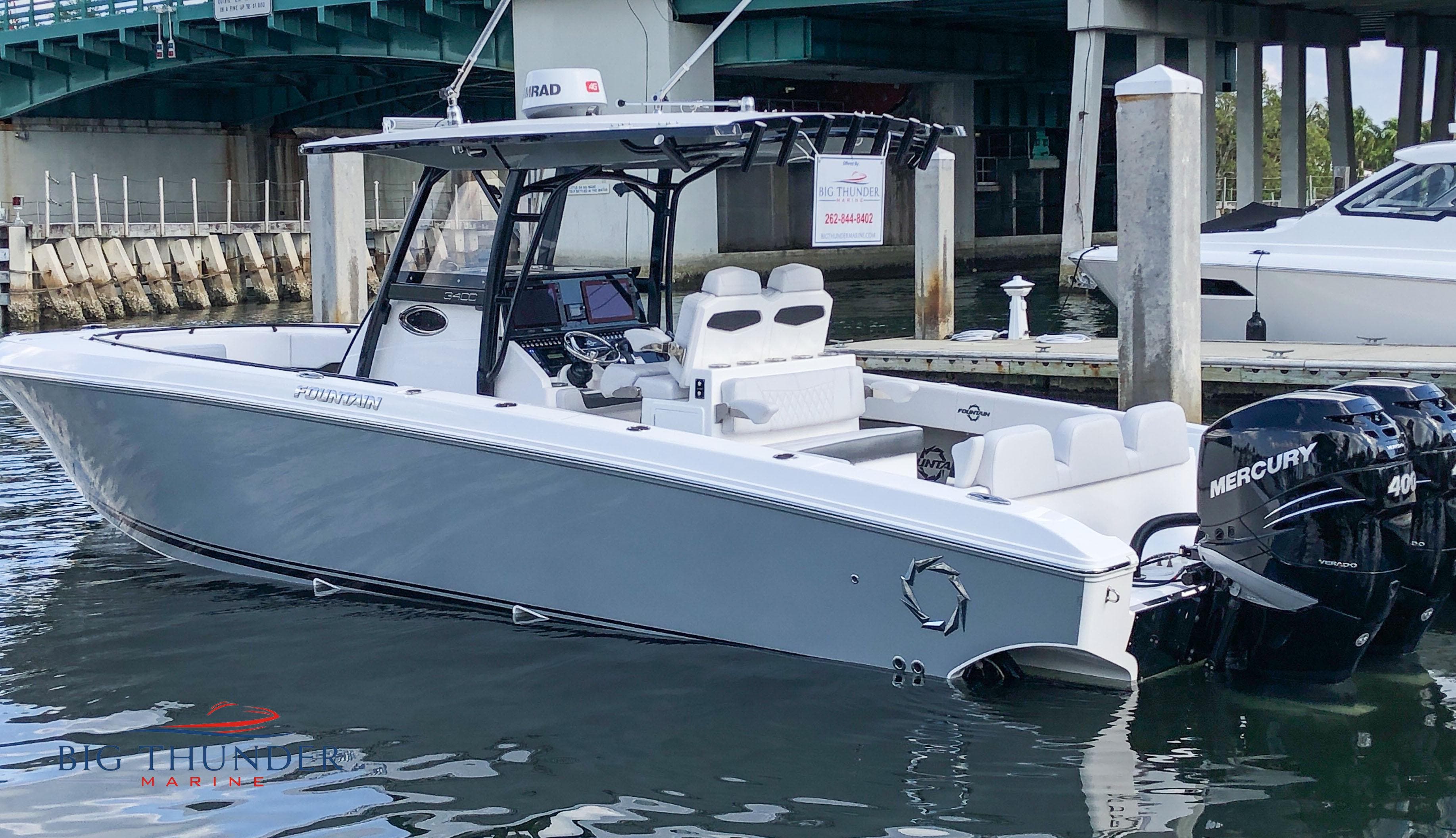2020 Fountain 34CC LS Twin Mercury 400 Verado DTS. Livorsi 1150 Trim Tabs. White Gelcoat. Custom Gray Hull Paint w/ Black Pin Stripe. Black Powder Coat Aluminum & SS Components. Gray T-Top Underside Paint. Sky Gray Upholstery. Gray & Black Composite Marine Mat Flooring. Underwater Lights. JL Premium Audio System w/ (8) 7.7"" LED Spkrs, (2) 10"" Subs & Mono-Block Amp. Rear Livewell Under Rear Facing Seat. 18’ Aluminum Outriggers w/ GS 280 Base. Portlight. Dual Simrad 16"" NSS Evo3 Displays. Mercury VesselView 903. HALO Technology 24"" Dome w/ 48mi. Range. Broadband Sonar w/ Chirp Technology. VHF Radio w/ Antenna. Go Free Wifi. Simrad Full Function Autopilot. Cabin w/ Head & Fresh Water Sink. Fresh & Raw Water Washdown. Pressurized Shower.