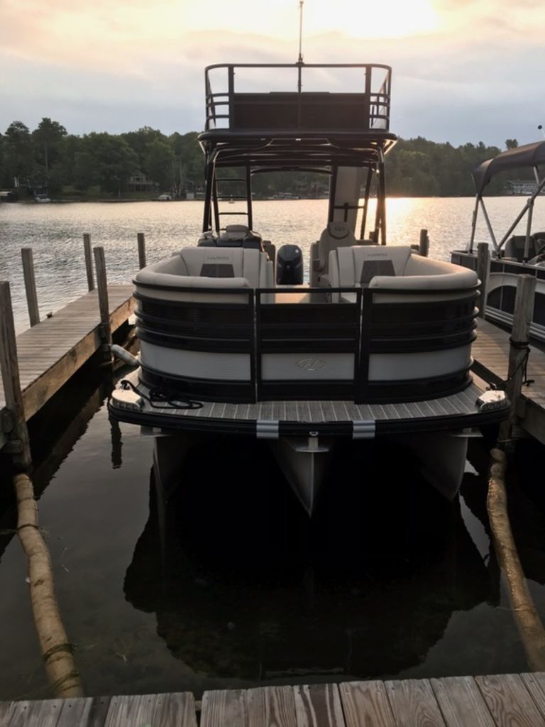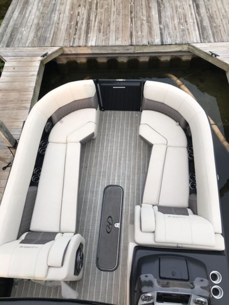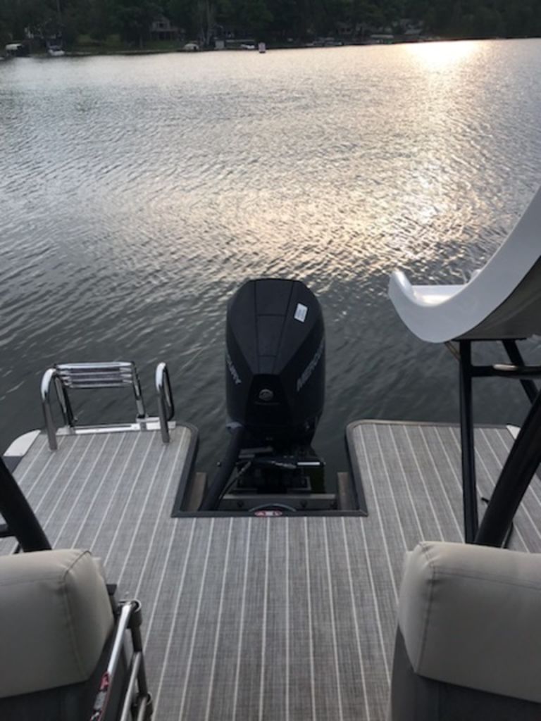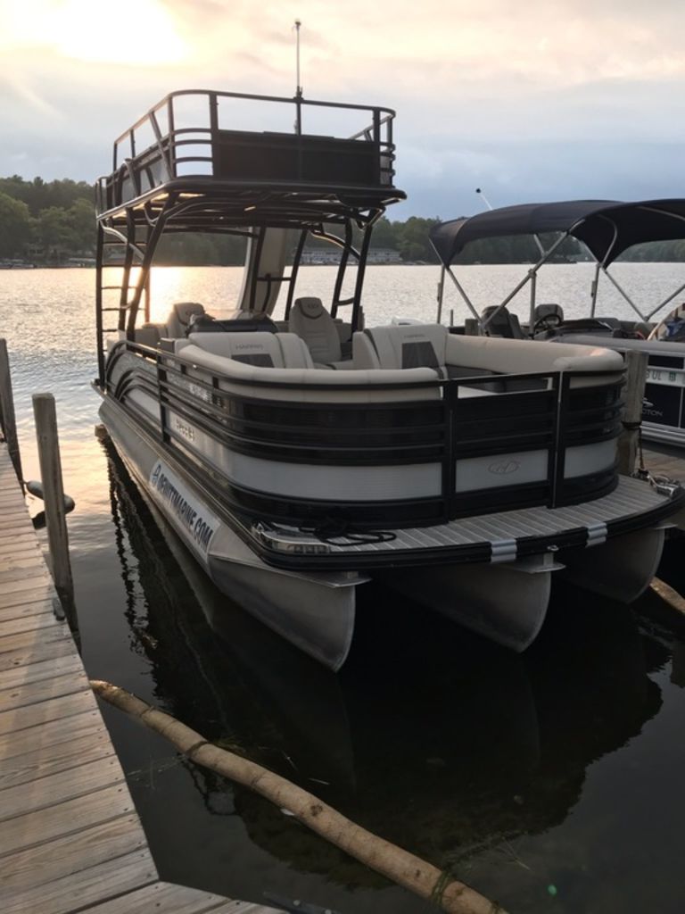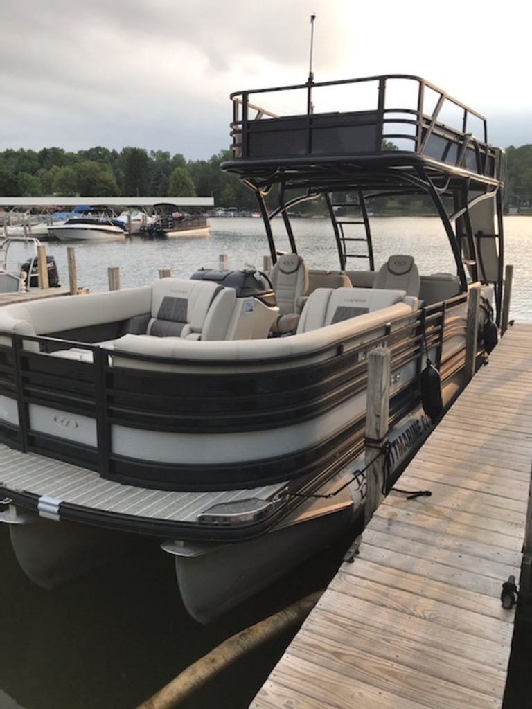 Here is by far the best way to hit the water in the summers! This 26ft double decker tritoon has a capacity for 15 people and can take them anywhere in ultra comfort! The boat comes with a powerful 250hp Mercury V8 engine which propels the boat at an impressive clip. Features include black out package, interior lighting package, ultra-lux dual helm seats, Simrad G07 chartplotter, JL diamond stereo, privacy chaise, and much much more. Stop by and test drive today!