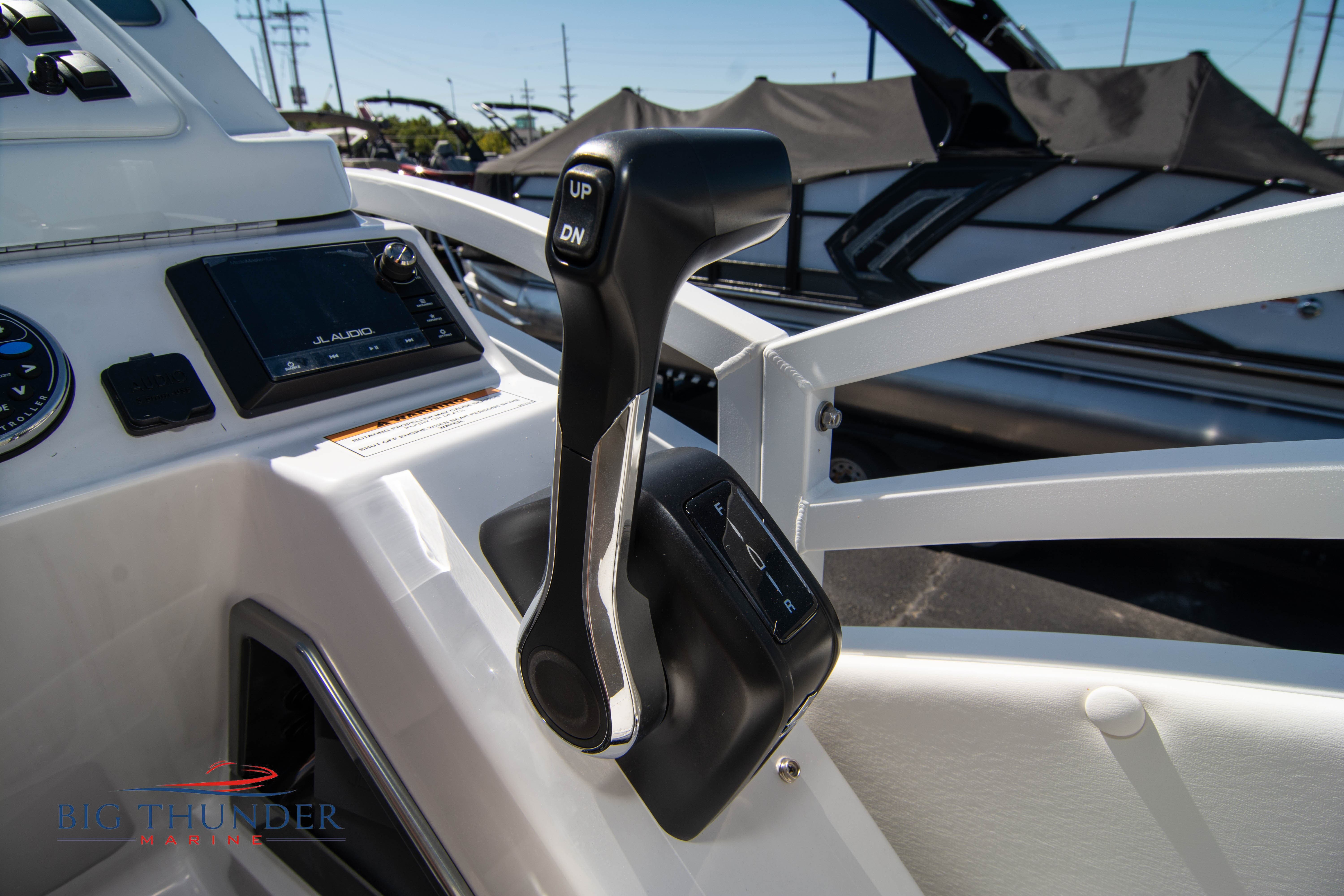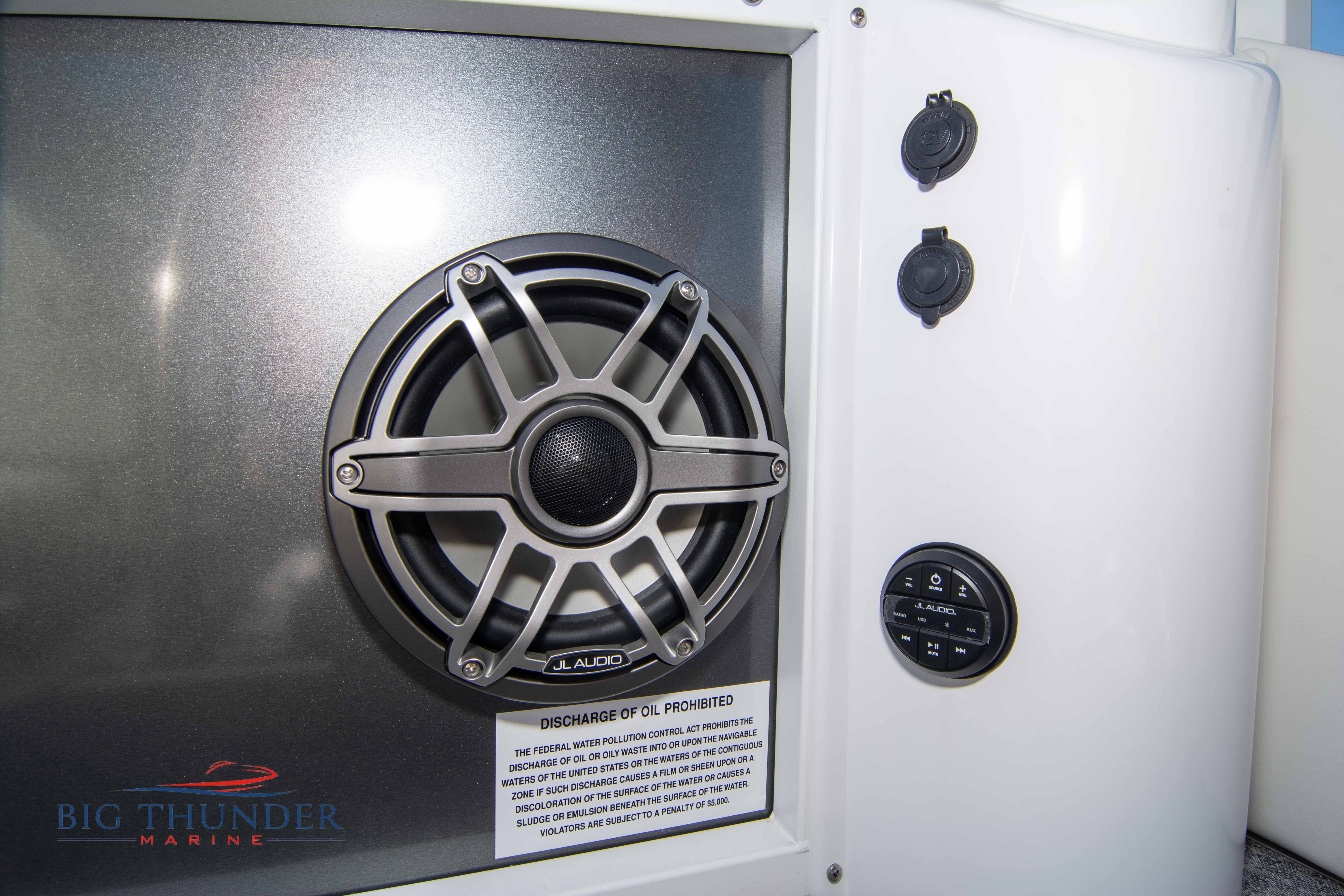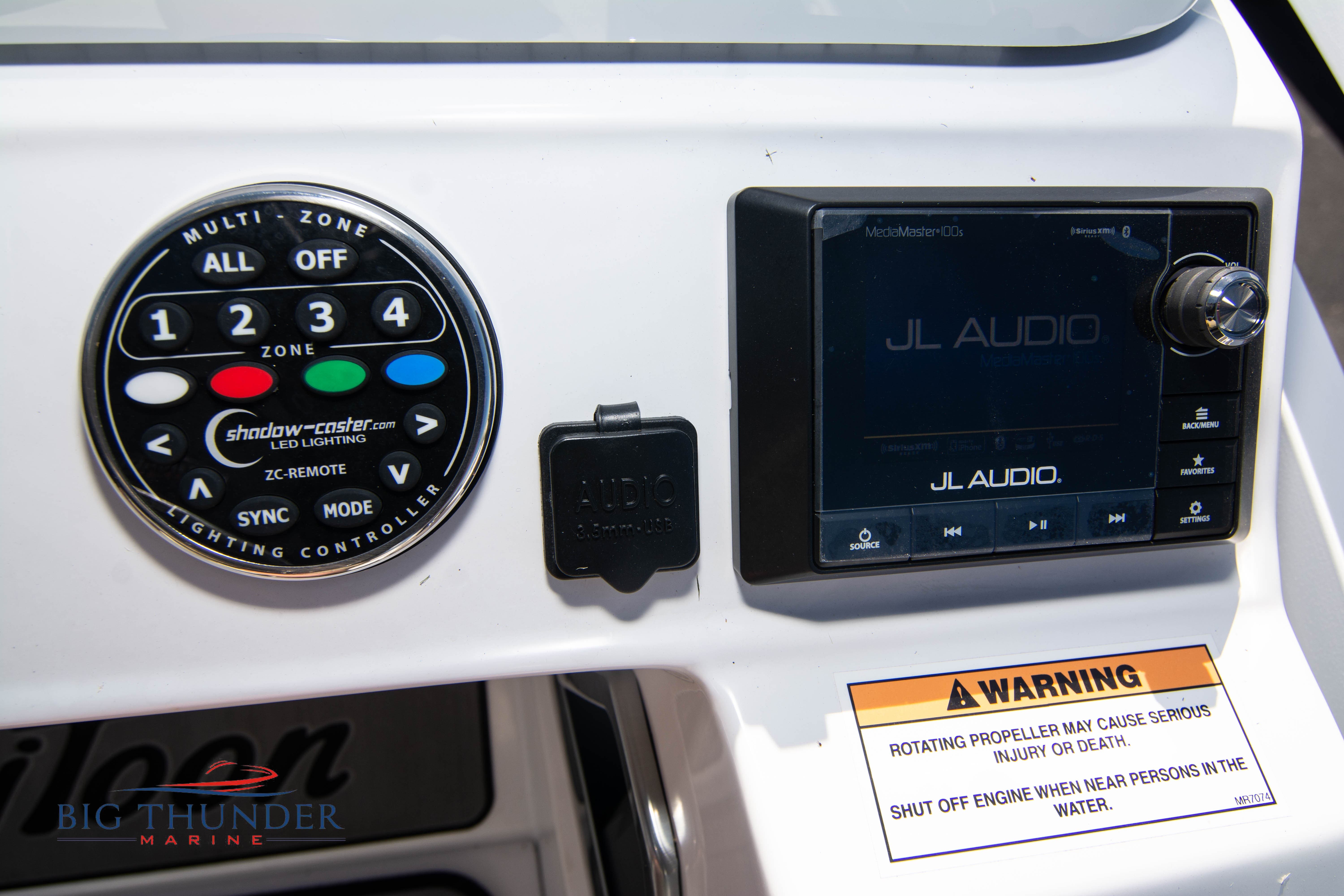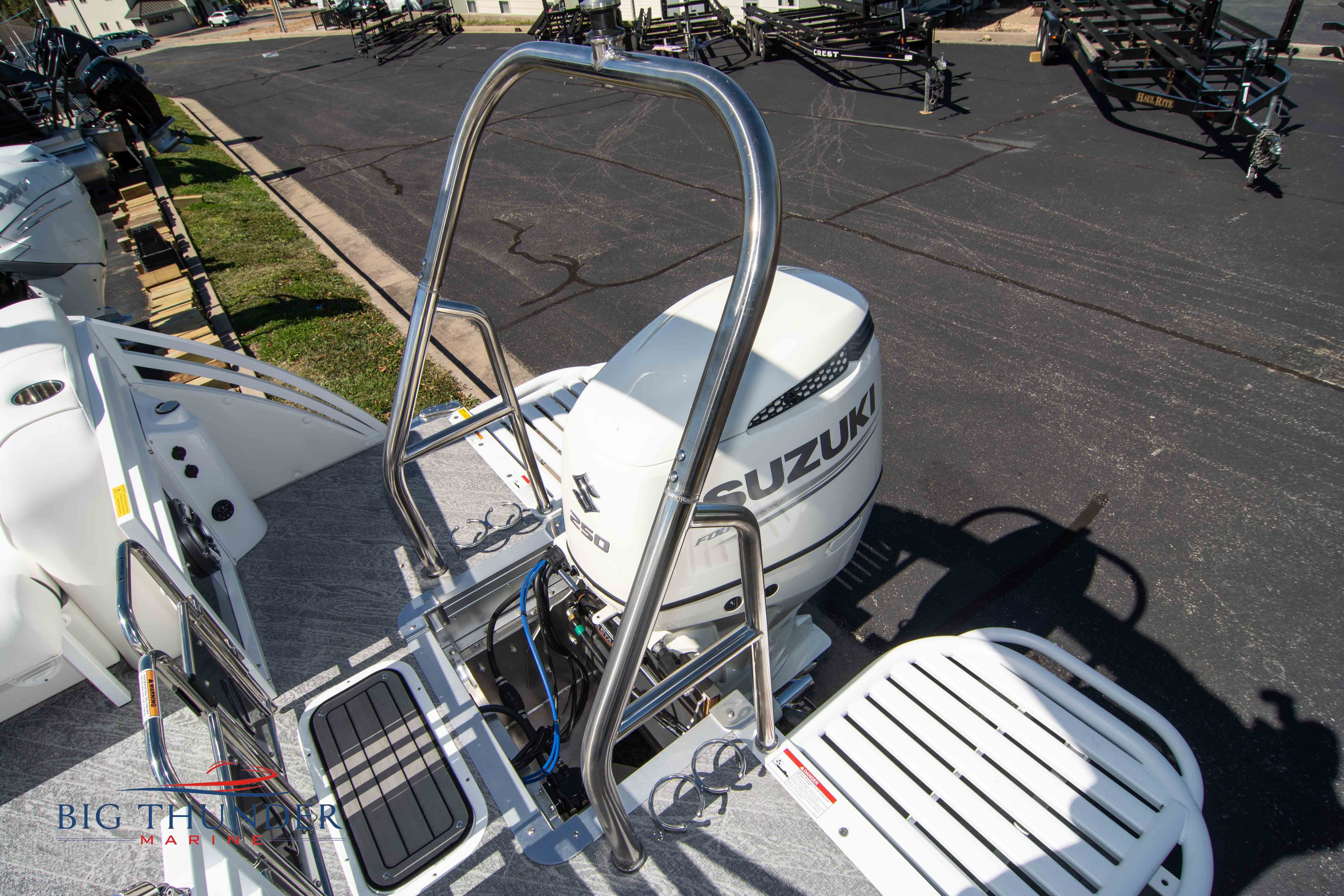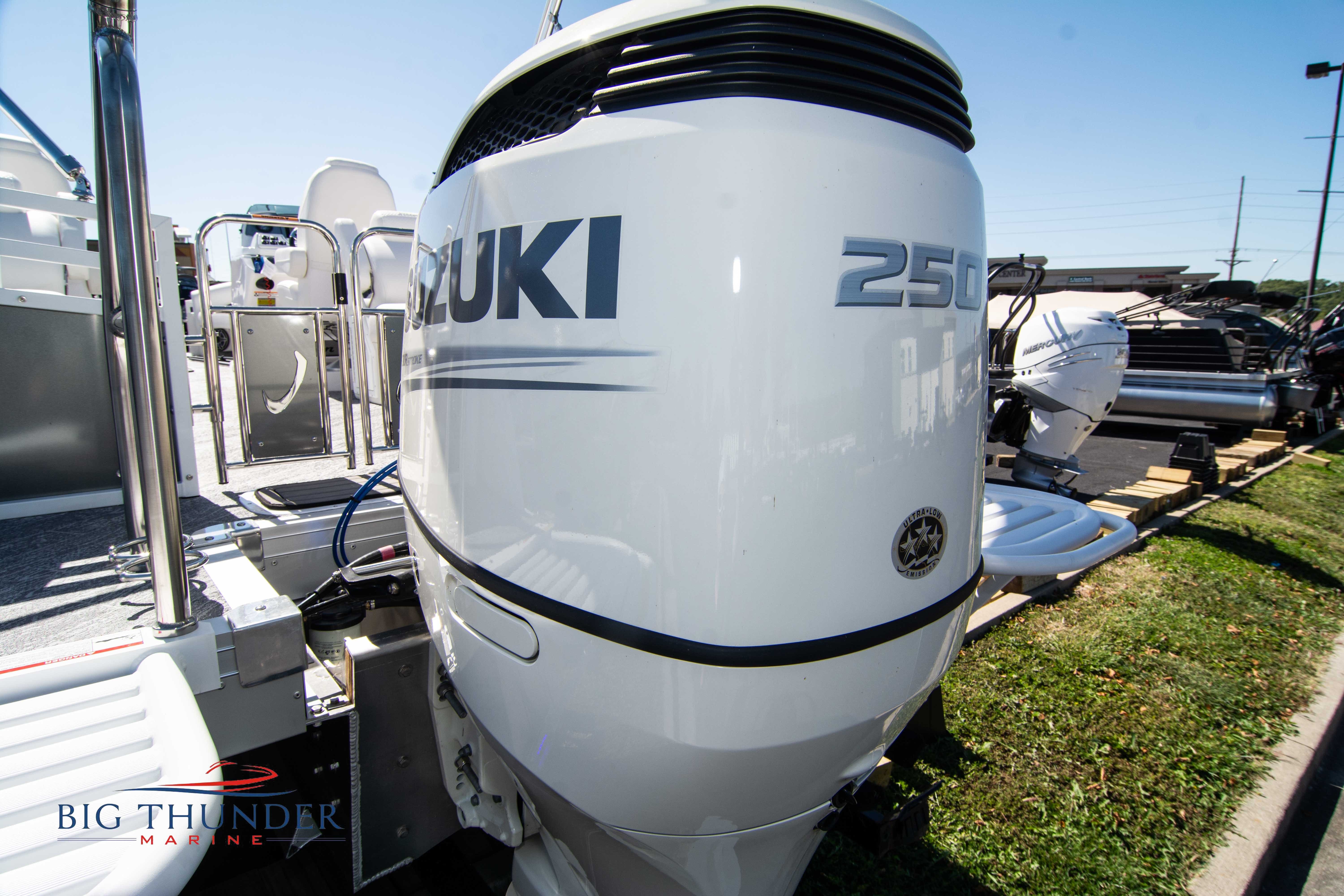 Suzuki Pre-Rig. Suzuki 250 SSTXW2. Sport Pkg. (Hydraulic Steering 1.7 w/ Power Assist, Lifting Fins). High Tide Hull (High Strength Elevated Performance Hull w/ 350HP Rating, Bow Anchor Locker w/ Marine Mat, In-Tube Storage w/ Marine Mat, Taller SS Heavy Duty Ski Tow). Charcoal Wall Panels. White Rails & Helm Cap. SS Rubrail Insert. SS Flip Up Bow Cleat. SS Fender Holder w/ Fenders. SS Bow Rails.Gray JC Plank Flooring. White Upholstery w/ Charcoal Upholstery Trim Pkg. Steel Color Bimini Top. Bimini Trailering Supports-10’ HD 1 1/4"" Frame (2). Dual Swim Platform w/ Ladder. Dual Stern Lounges w/ Storage & Drawer. Bow Lounger w/ Arm Rest w/ USB Storage & Drawer. Bow Lounger w/ Arm Rest w/ Trash And Flip Down Storage. High Back Reclining Companion Seat w/ Leg Lift. High Back Reclining Helm Capt. Chair w/ Bolster. Raised Helm Platform w/ Marine Mat. Deluxe Spoked Steering Wheel. 7"" Simrad GO7 Touch Screen w/ Engine Interface. JL MM-100 Stereo. JL 8.8 Spkr. Upgrade 2/ RGB Lights & 6W Amp. JL 8.8 Stern Spkrs. (2) w/ 2-Way Inline JL Amp. RGB Interior/Exterior Lighting Pkg. w/ Control Center. Floor & Helm Misting System. Glove Box. Fuel/Water Filter. Mooring Cover.