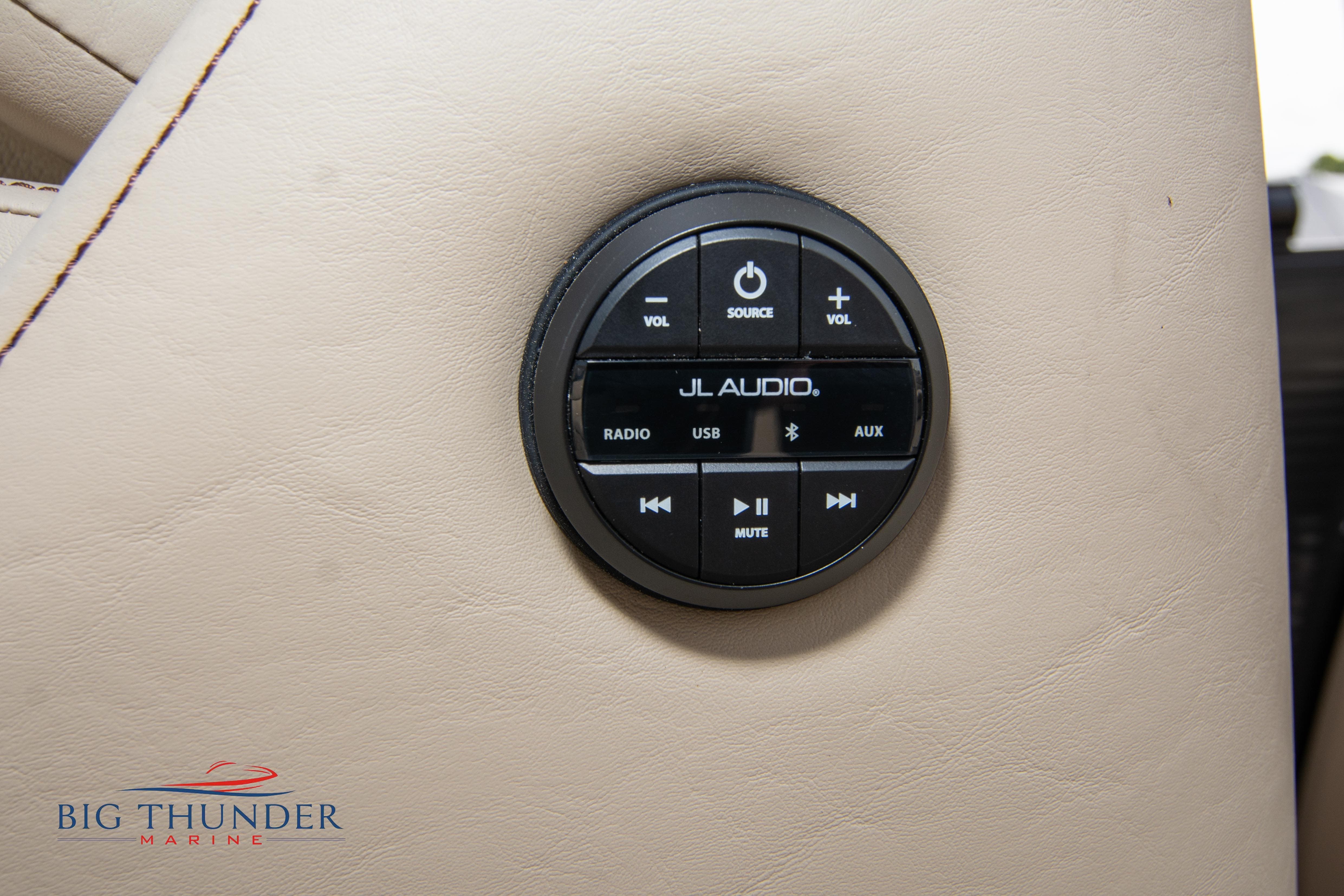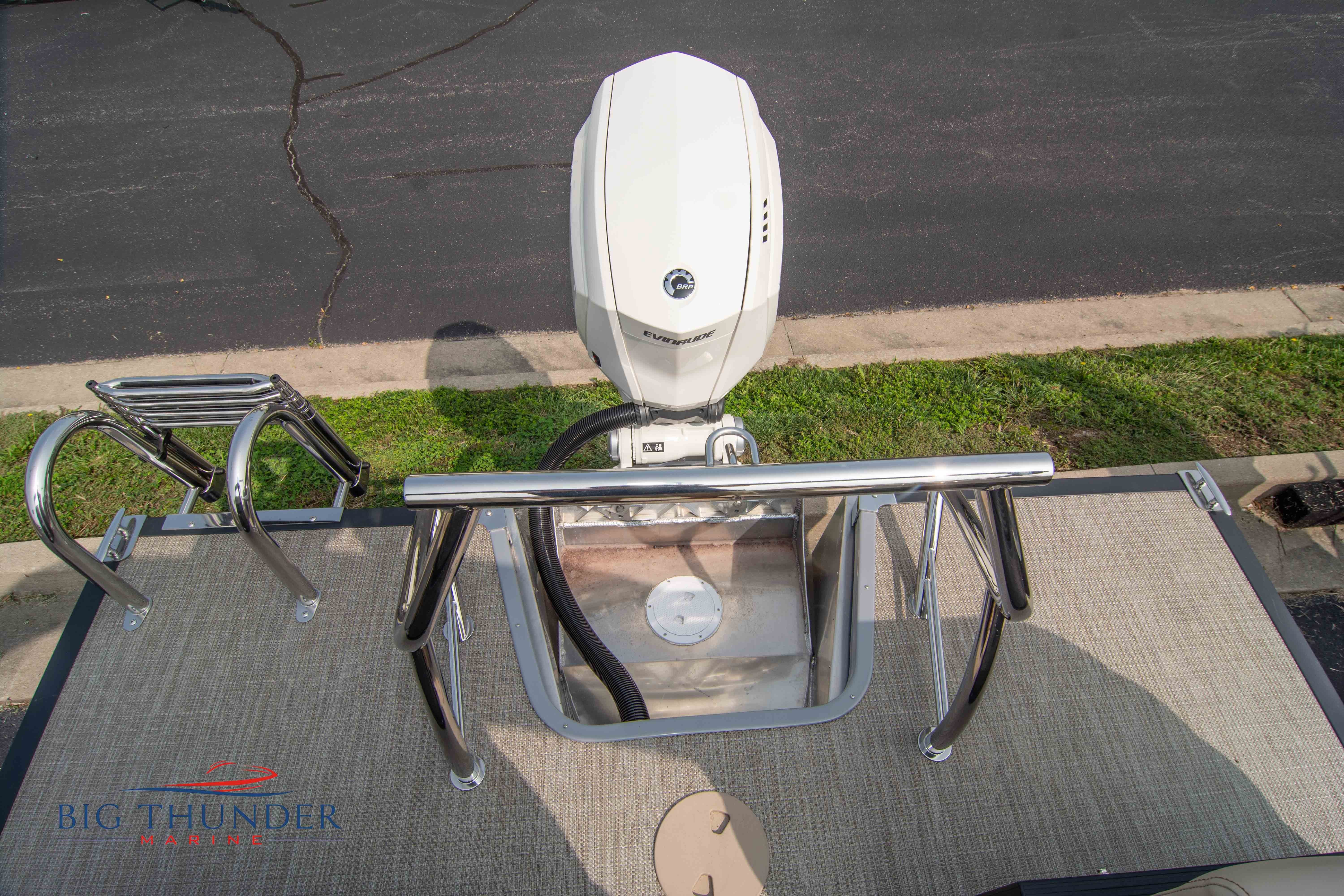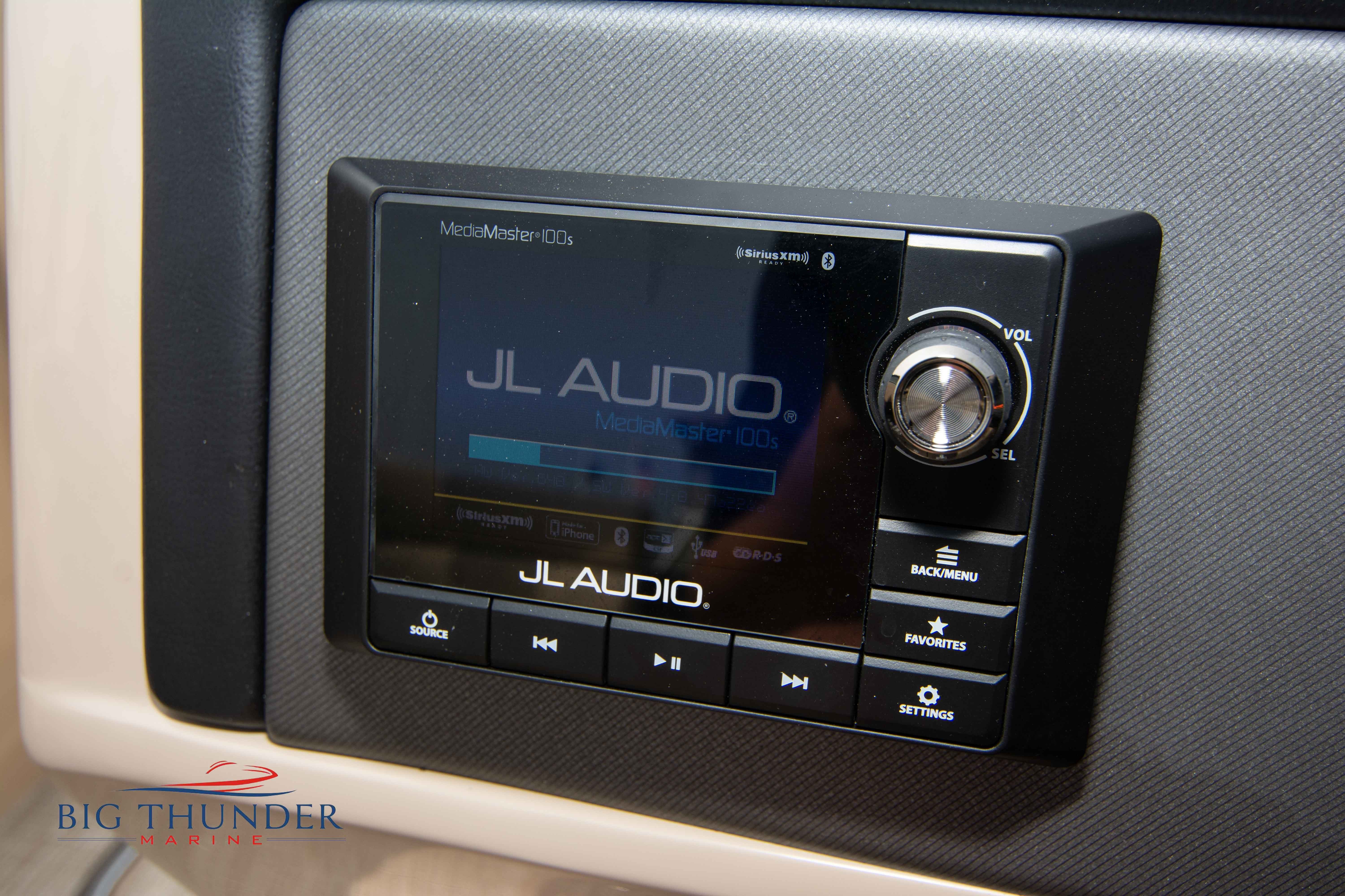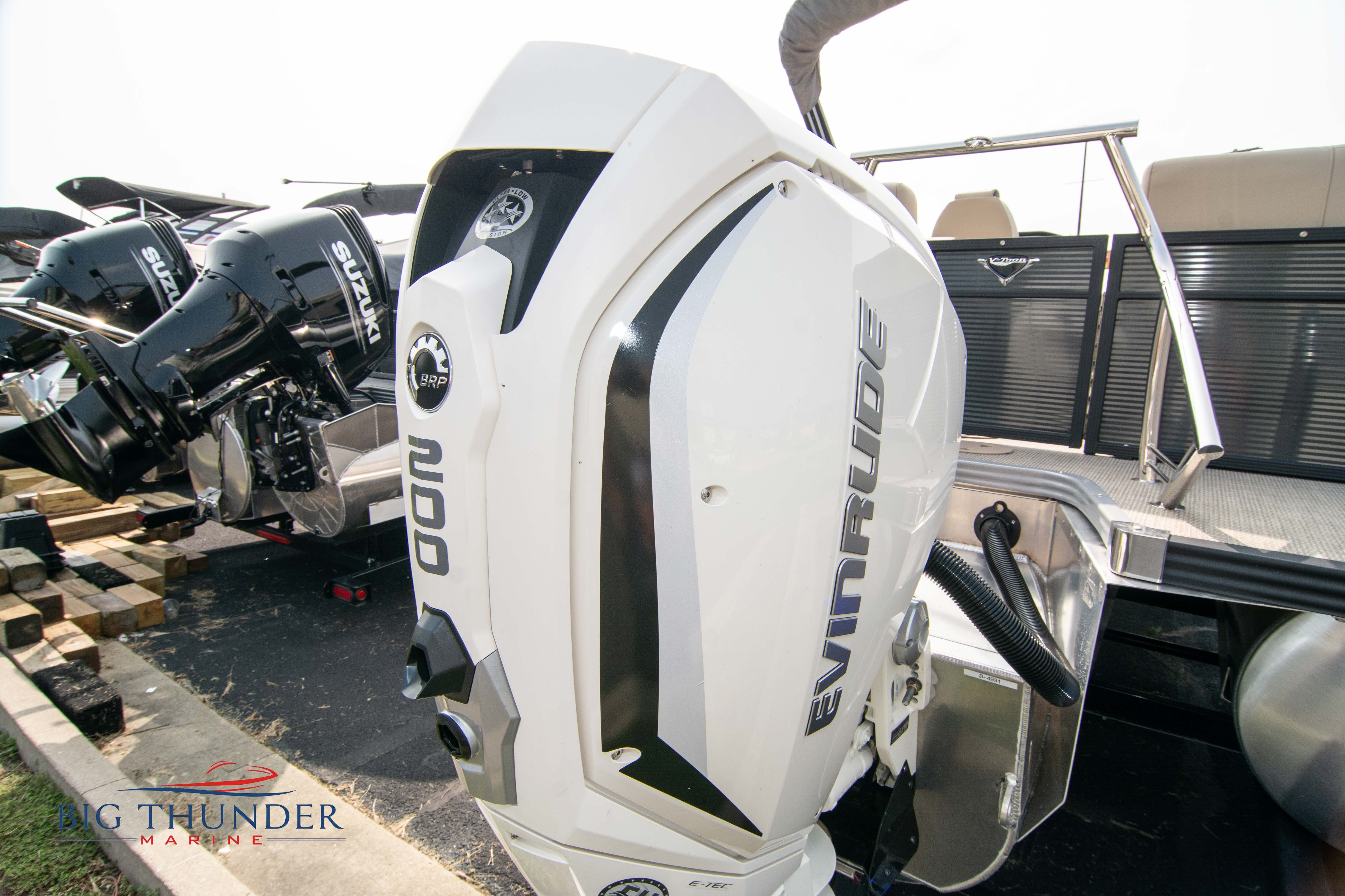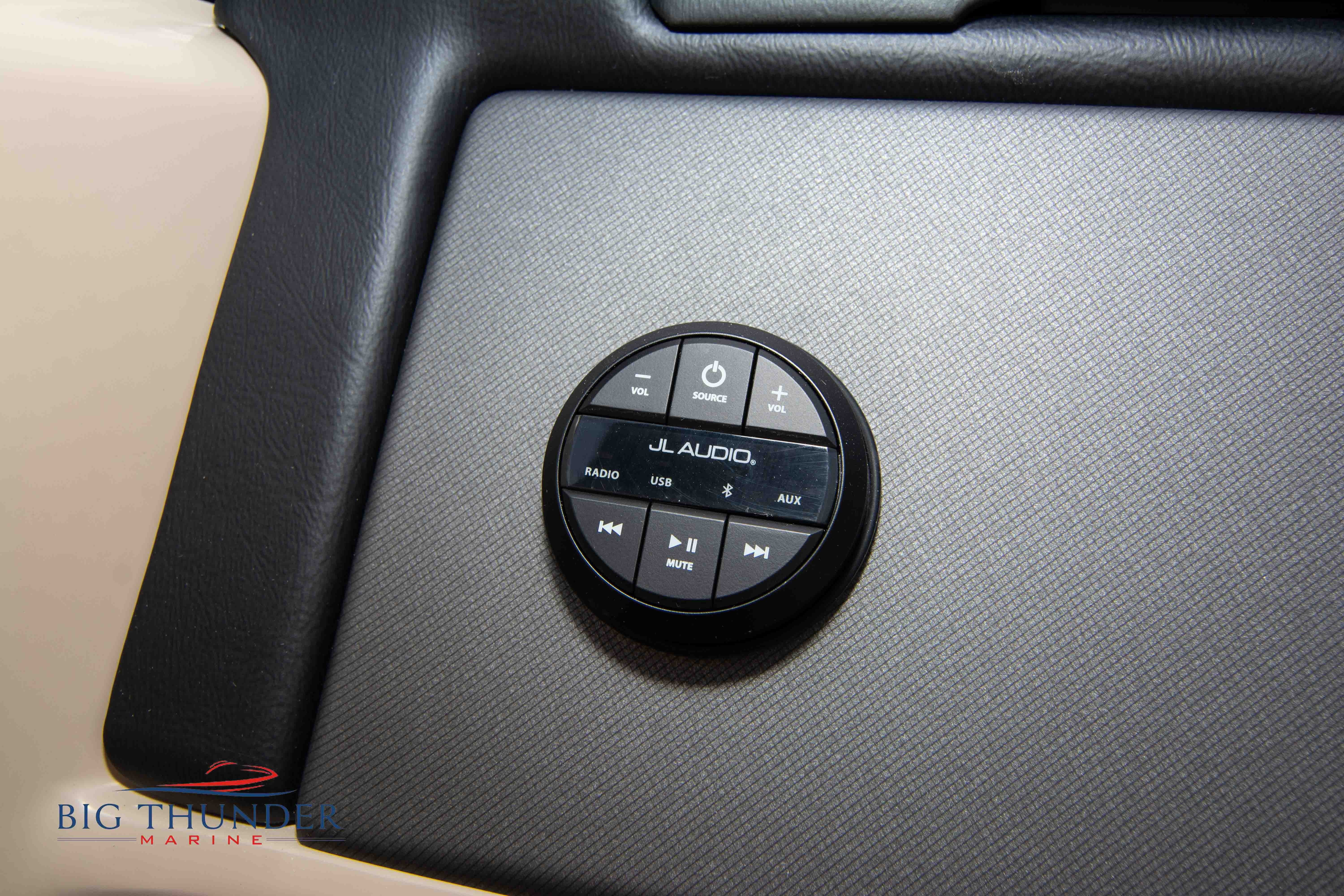 Evinrude Digital DPS Pre-Rig. Evinrude 200 E-Tec - White. Charcoal Metallic Wall Skin. Tan Two-Tone Graphics. Matte Black Powder Coating. Tan Luna Flooring. Tan Furniture. Charcoal Cover & Bimini Top. Power Arm Bimini w/ Black Anodizing & LED Lights. Blue LED Exterior Lights. Blue LED Pedestal & Table Base Light Pkg. Stereo Upgrade - Premium JL MM100 Bluetooth Stereo, (4) JL Chrome LED Spkrs., 10"" Sub & 800W Amp. Garmin Virb Action Camera w/ Standard Mounting Hardware. Garmin GPSmap XS Color Touchscreen Display w/ Gauges & Controls. Battery Charging System. Center In-Tube Storage.