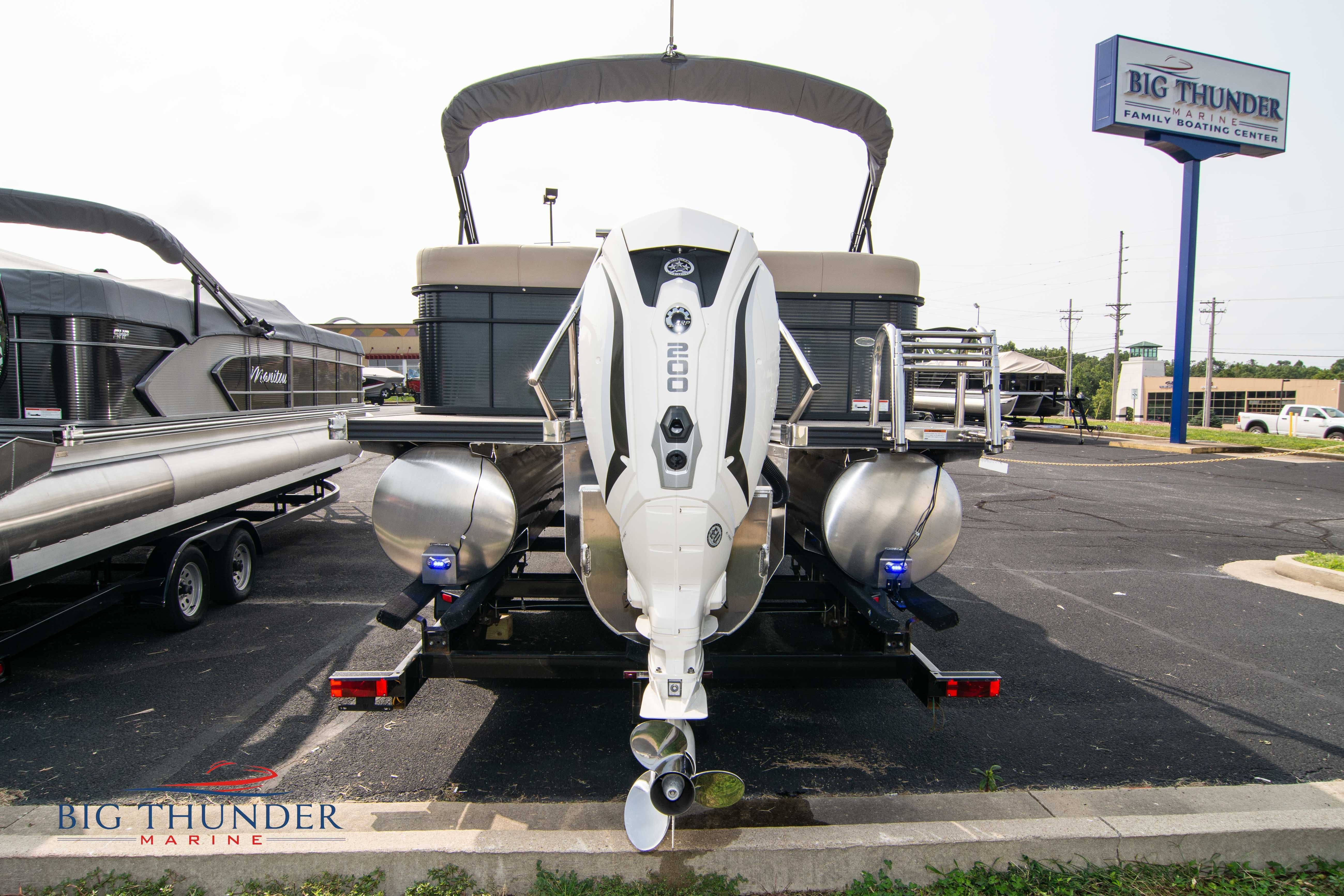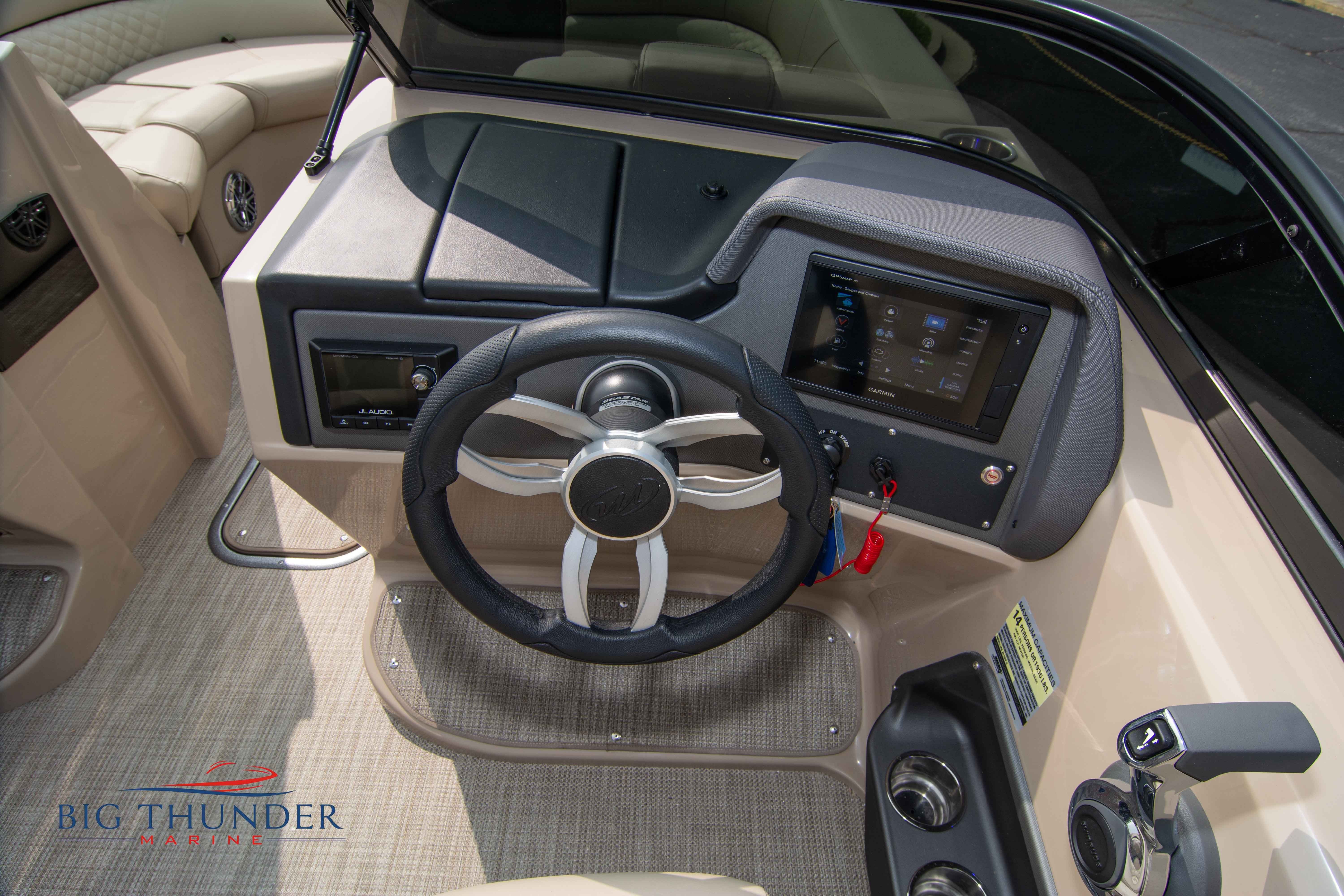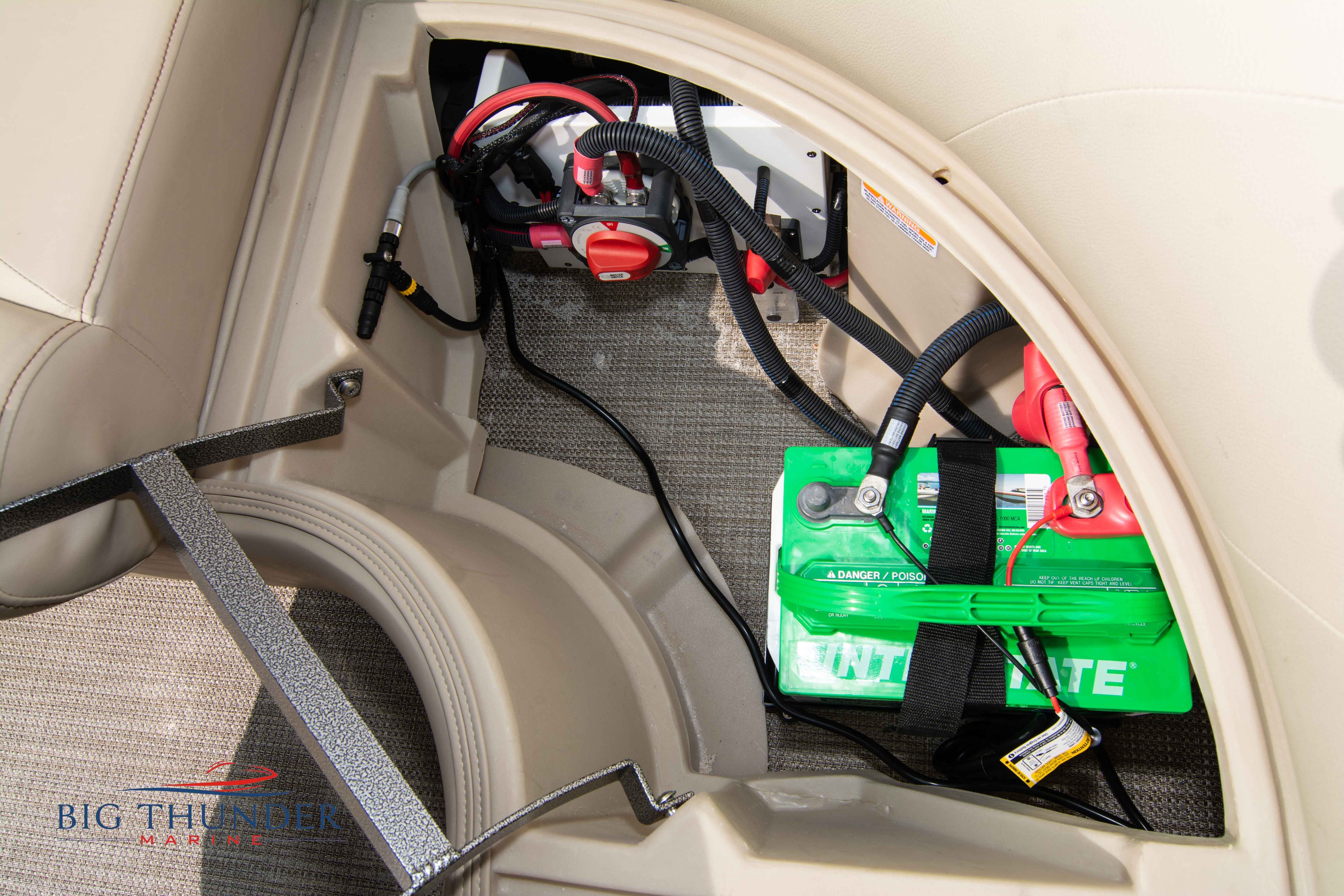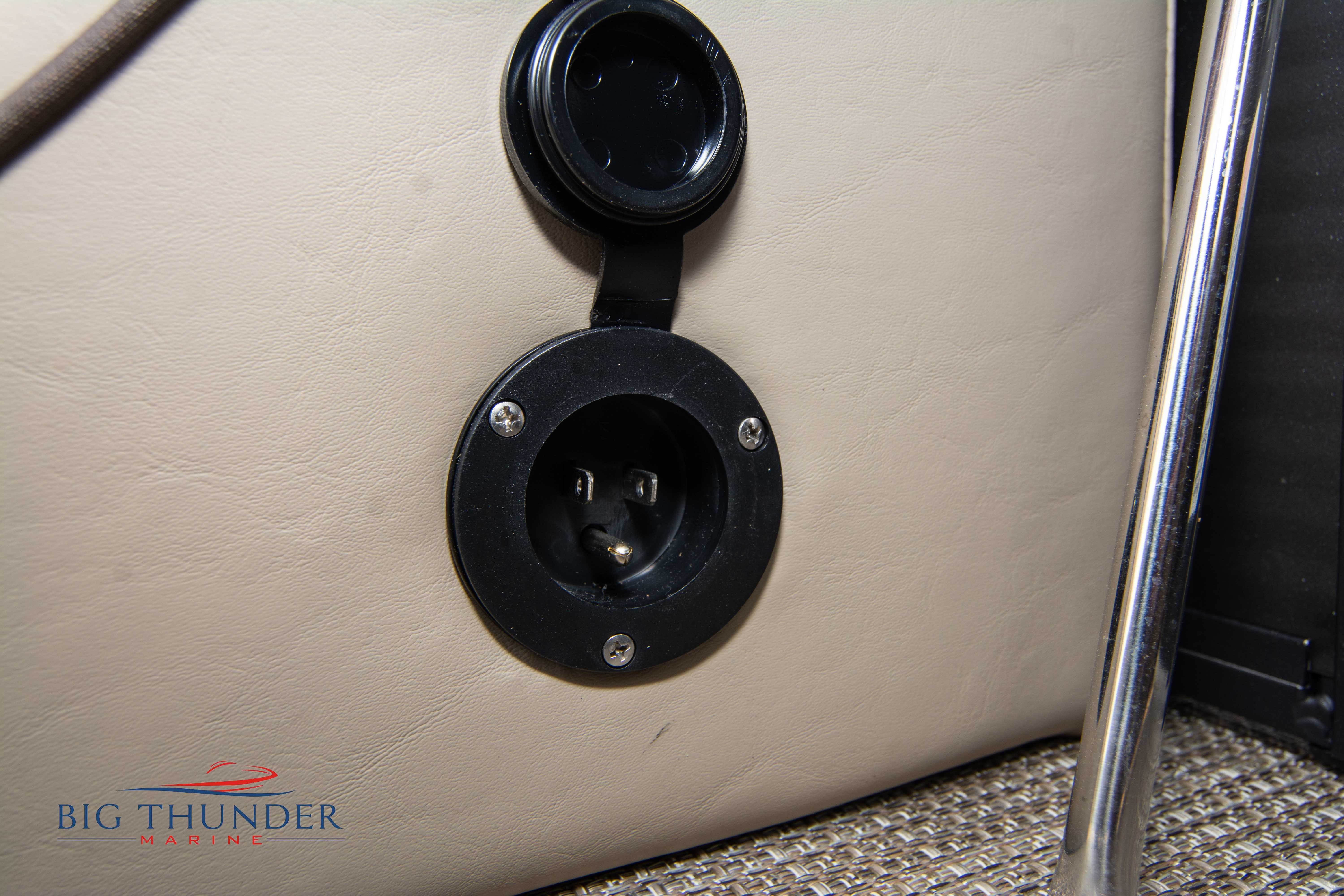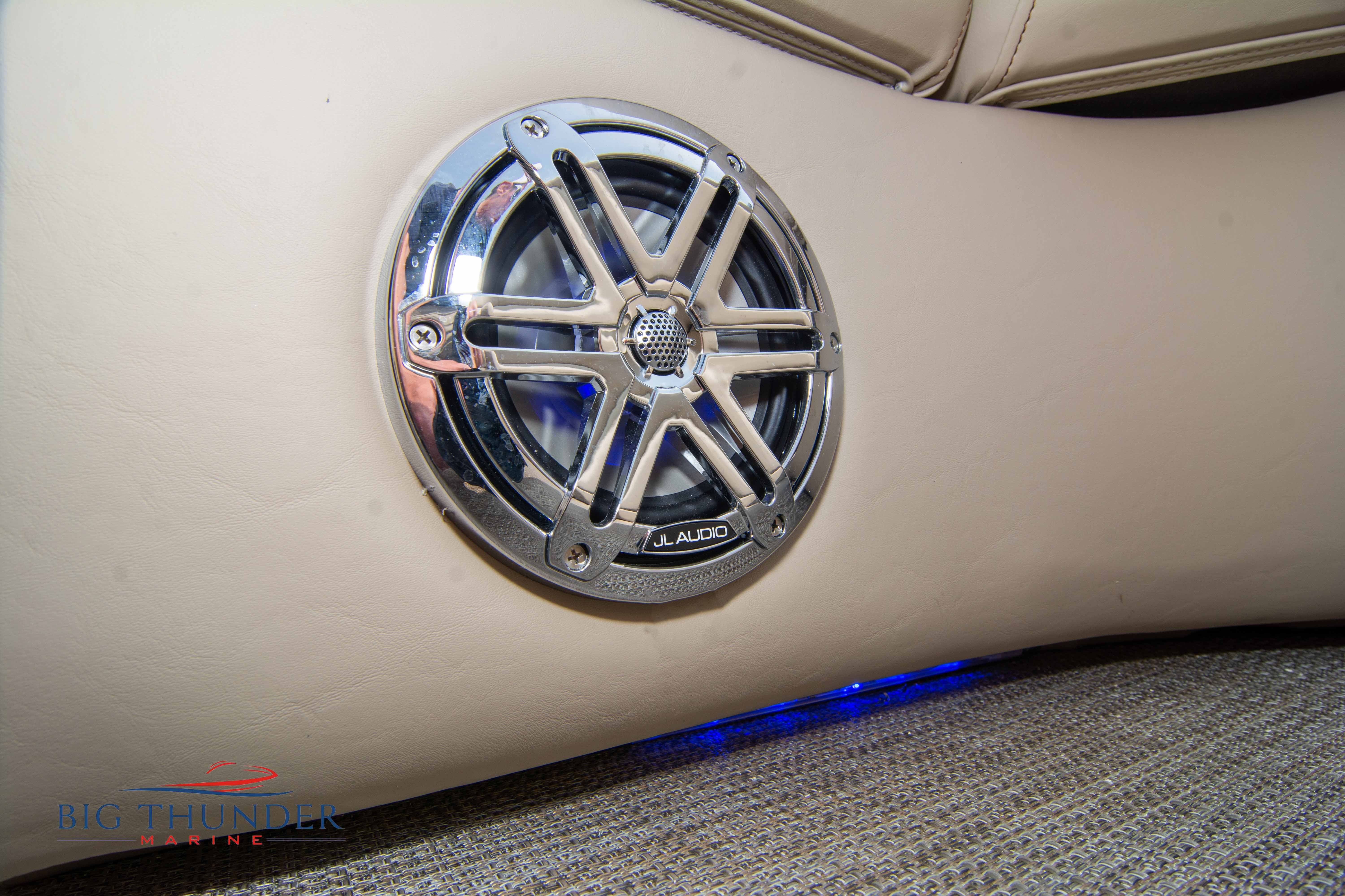 Evinrude Digital DPS Pre-Rig. Evinrude 200 E-Tec - White. Charcoal Metallic Wall Skin. Tan Two-Tone Graphics. Matte Black Powder Coating. Tan Luna Flooring. Tan Furniture. Charcoal Cover & Bimini Top. Power Arm Bimini w/ Black Anodizing & LED Lights. Blue LED Exterior Lights. Blue LED Pedestal & Table Base Light Pkg. Stereo Upgrade - Premium JL MM100 Bluetooth Stereo, (4) JL Chrome LED Spkrs., 10"" Sub & 800W Amp. Garmin Virb Action Camera w/ Standard Mounting Hardware. Garmin GPSmap XS Color Touchscreen Display w/ Gauges & Controls. Battery Charging System. Center In-Tube Storage.