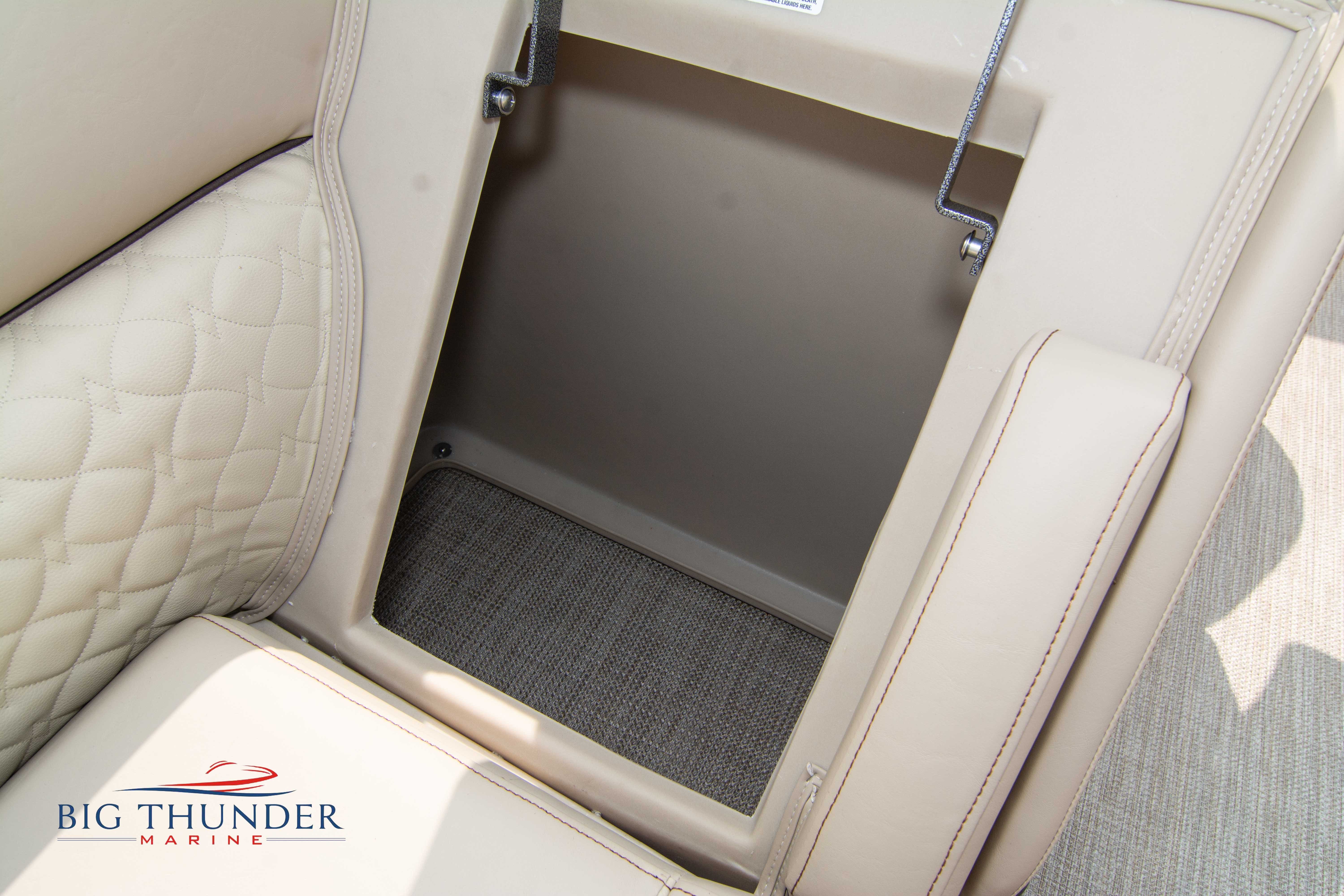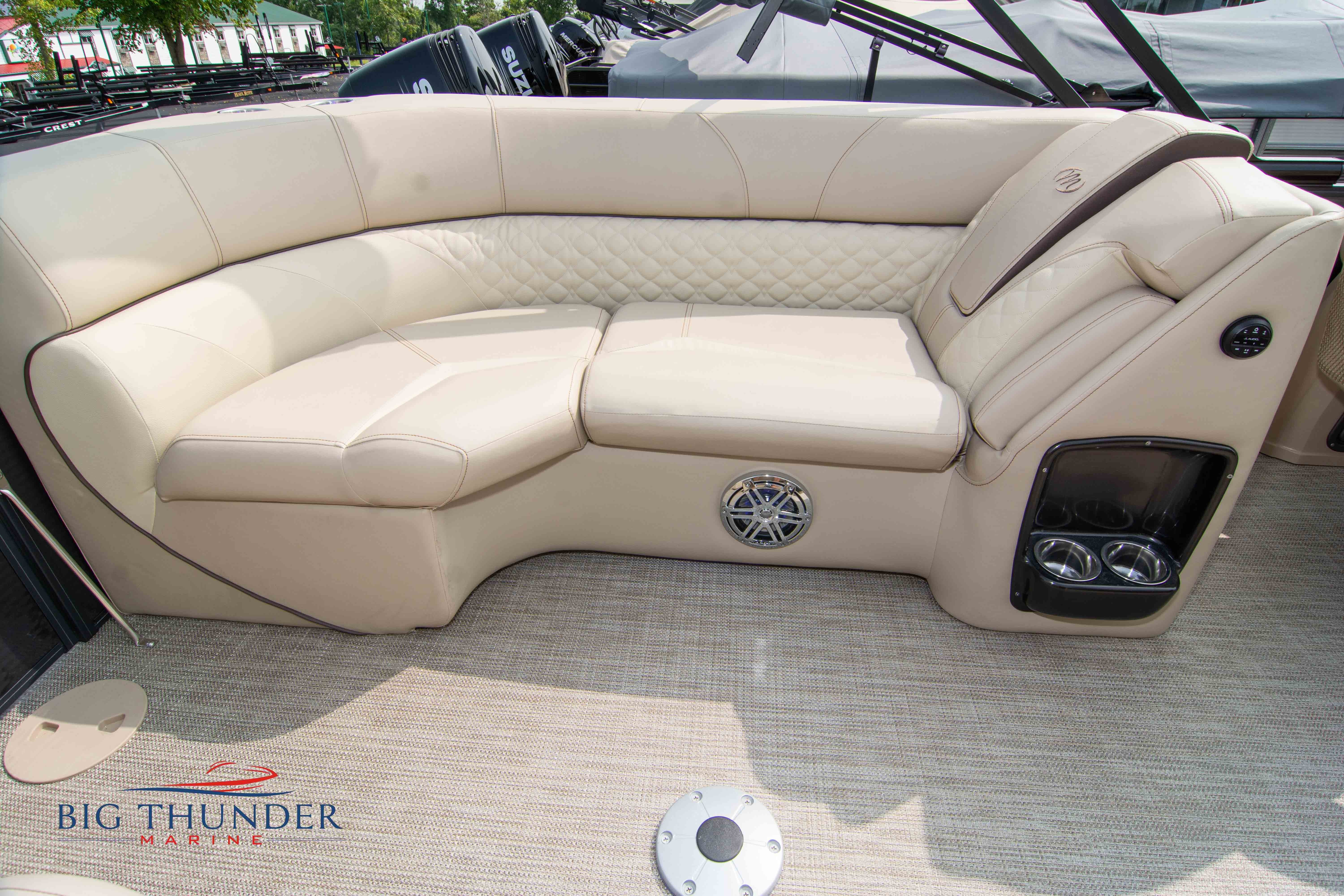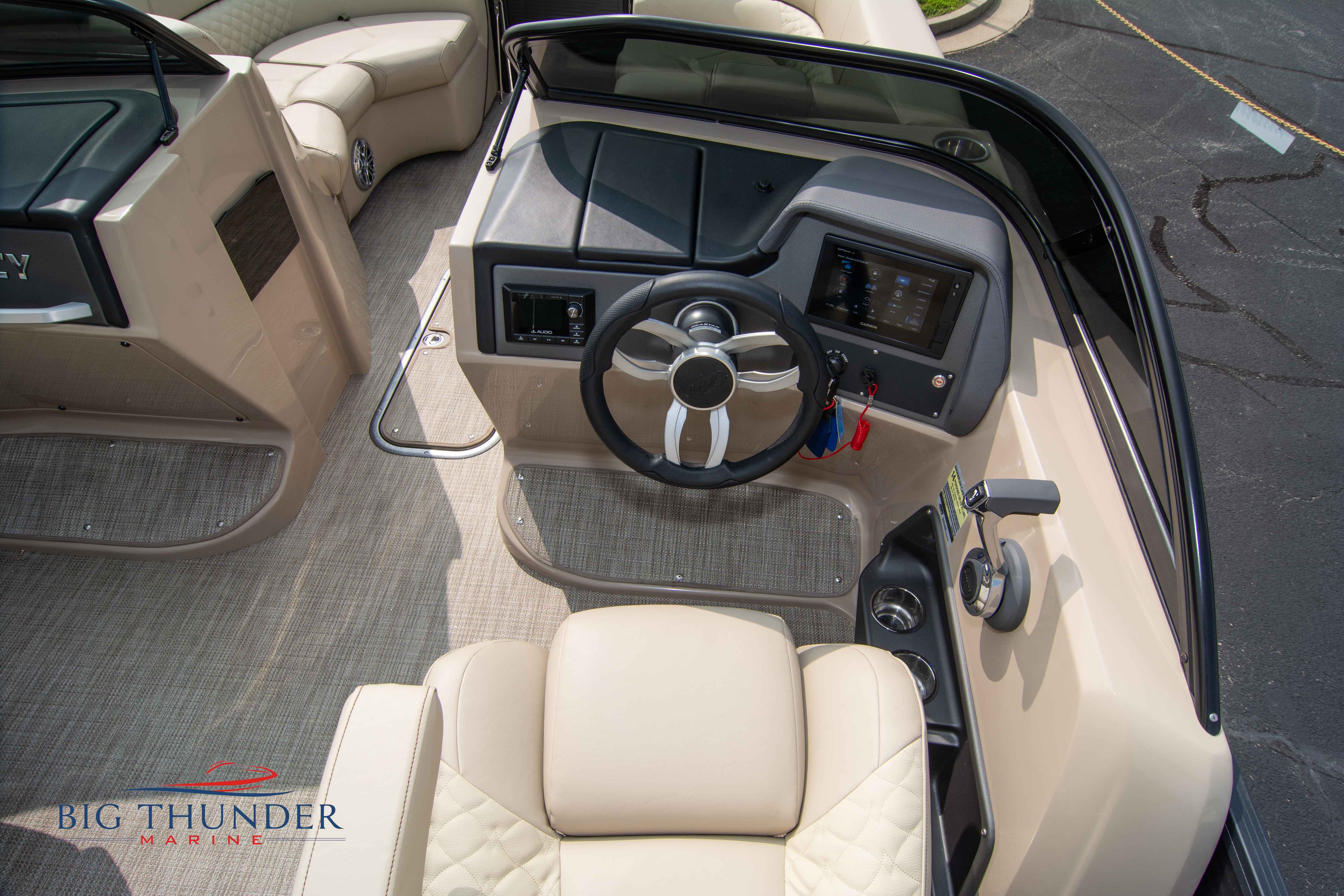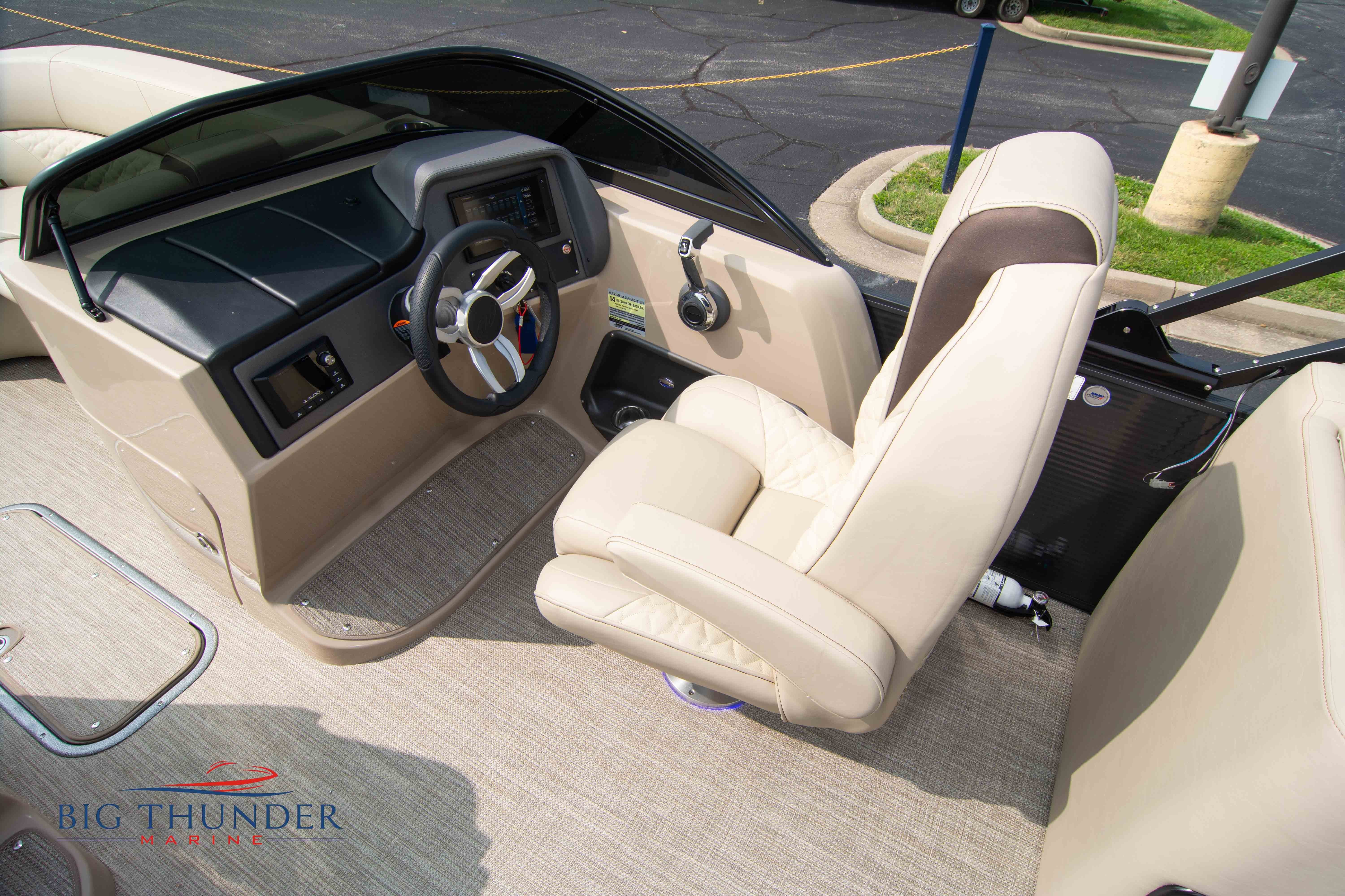 Evinrude Digital DPS Pre-Rig. Evinrude 200 E-Tec - White. Charcoal Metallic Wall Skin. Tan Two-Tone Graphics. Matte Black Powder Coating. Tan Luna Flooring. Tan Furniture. Charcoal Cover & Bimini Top. Power Arm Bimini w/ Black Anodizing & LED Lights. Blue LED Exterior Lights. Blue LED Pedestal & Table Base Light Pkg. Stereo Upgrade - Premium JL MM100 Bluetooth Stereo, (4) JL Chrome LED Spkrs., 10"" Sub & 800W Amp. Garmin Virb Action Camera w/ Standard Mounting Hardware. Garmin GPSmap XS Color Touchscreen Display w/ Gauges & Controls. Battery Charging System. Center In-Tube Storage.