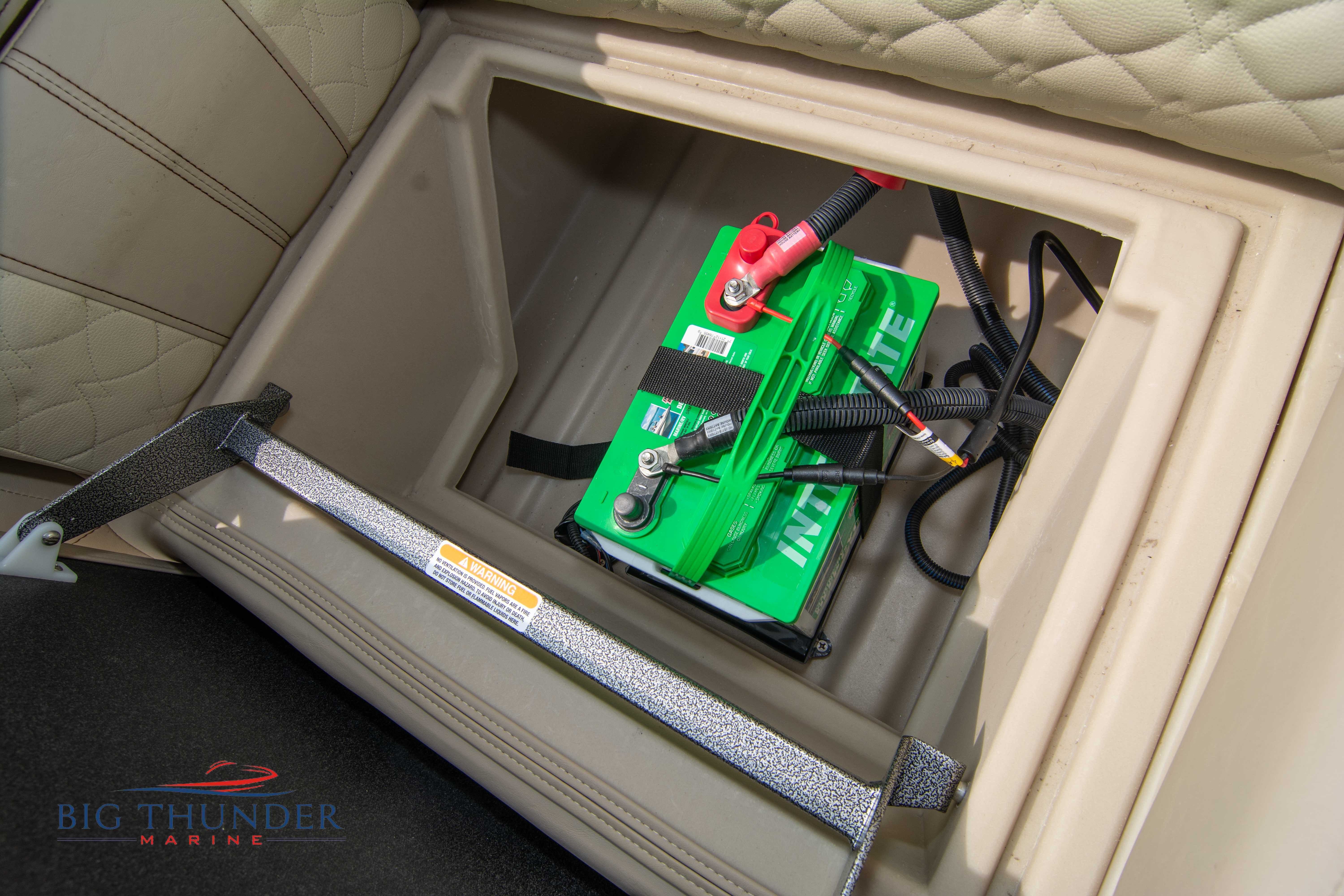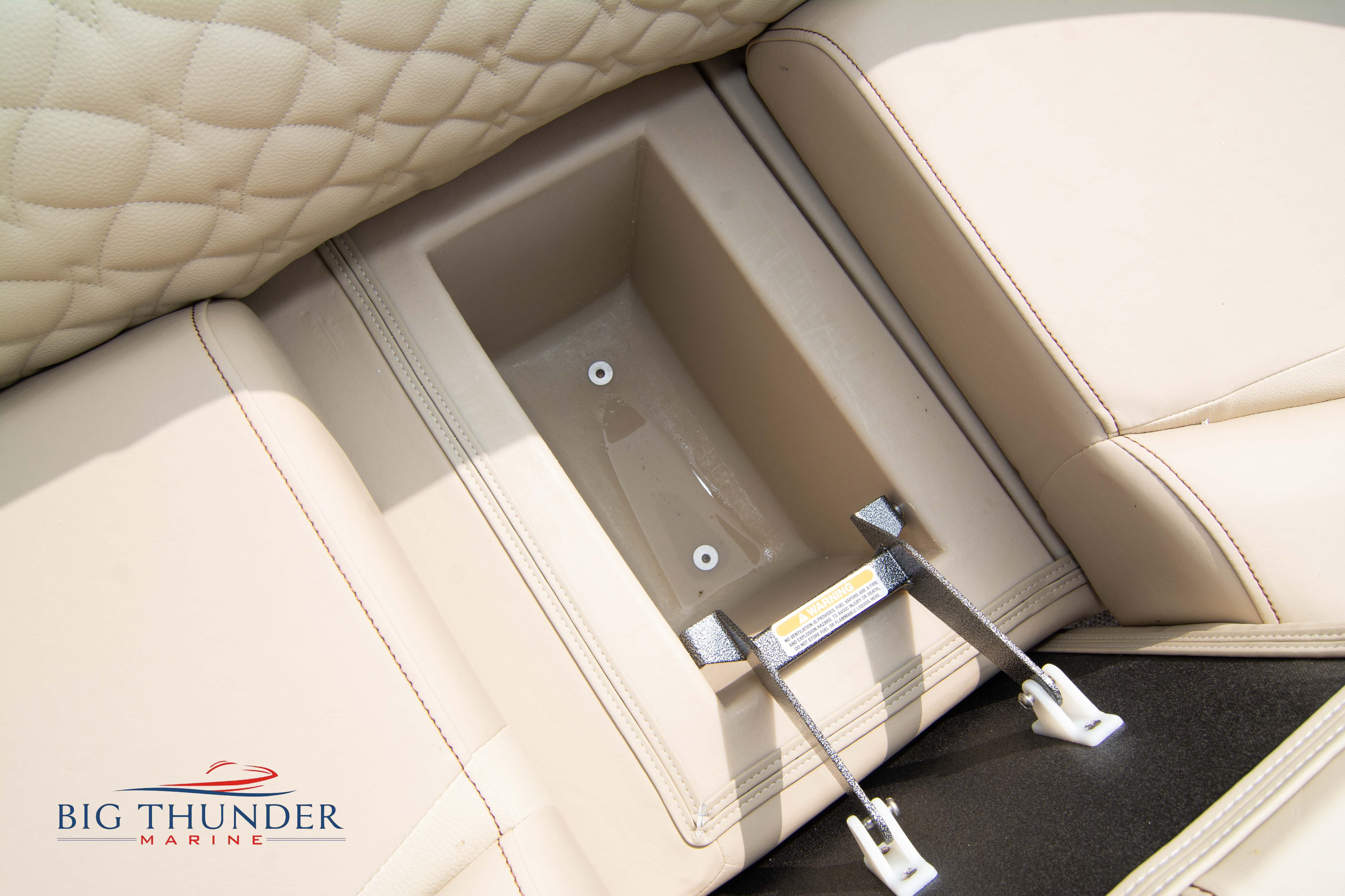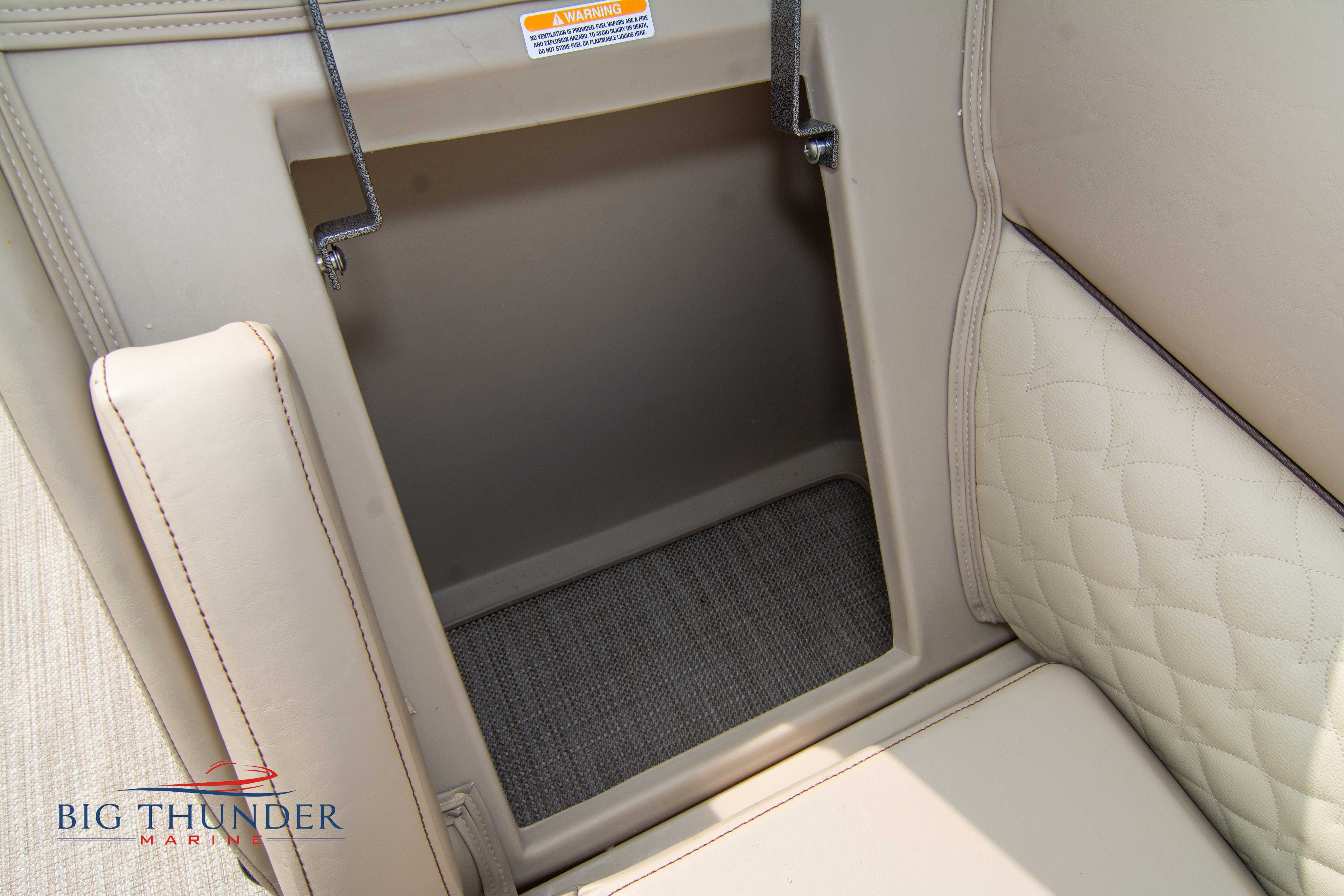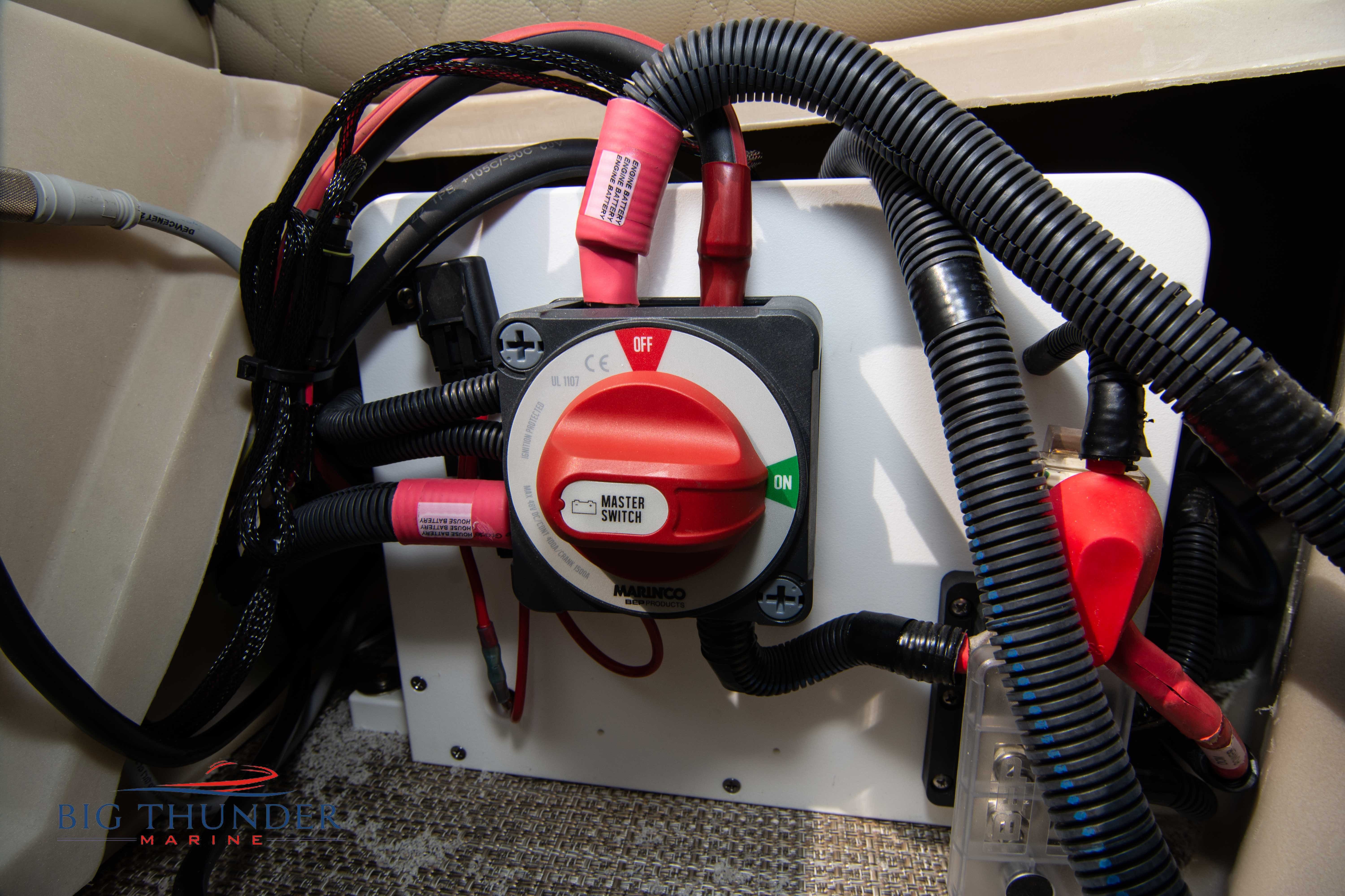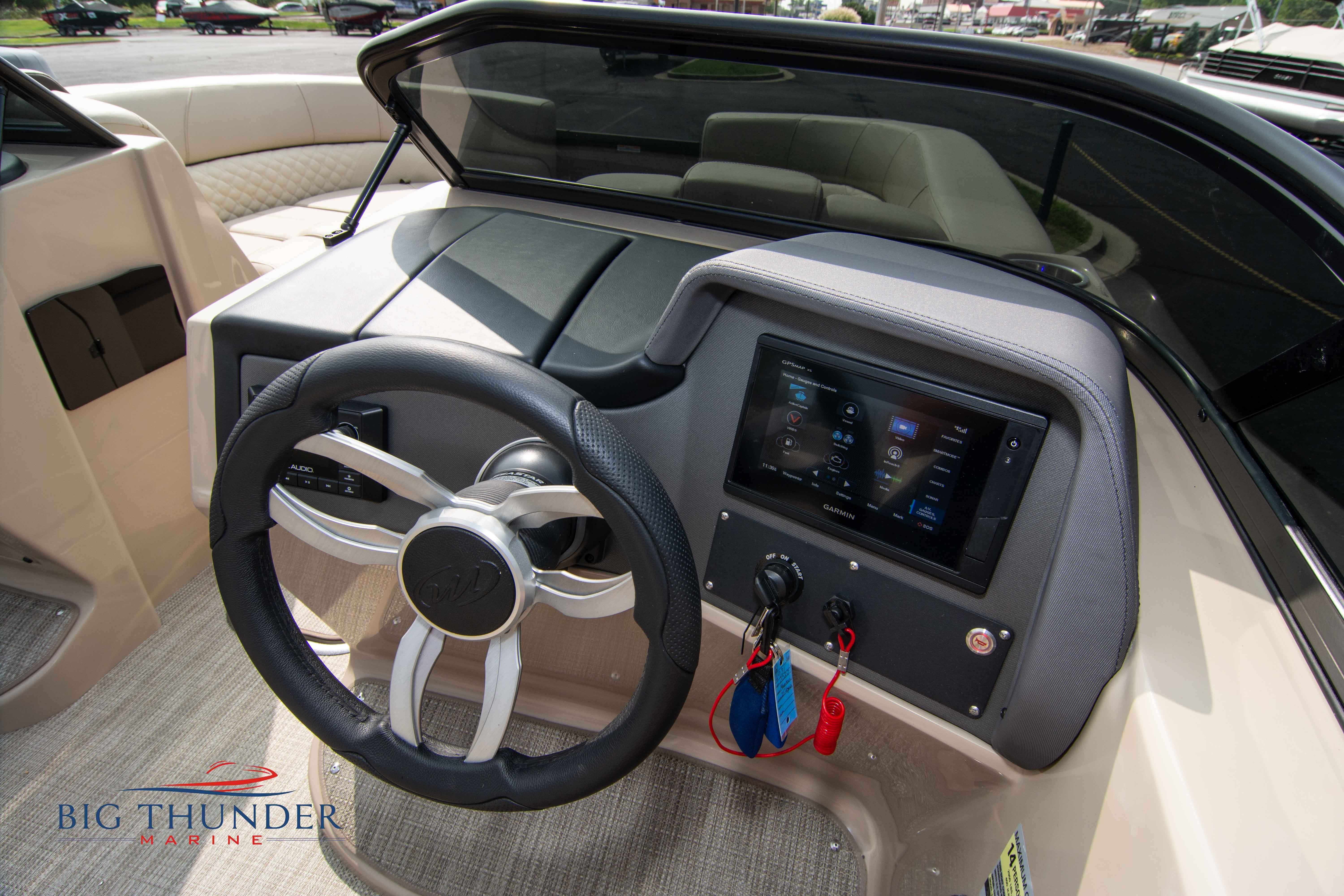 Evinrude Digital DPS Pre-Rig. Evinrude 200 E-Tec - White. Charcoal Metallic Wall Skin. Tan Two-Tone Graphics. Matte Black Powder Coating. Tan Luna Flooring. Tan Furniture. Charcoal Cover & Bimini Top. Power Arm Bimini w/ Black Anodizing & LED Lights. Blue LED Exterior Lights. Blue LED Pedestal & Table Base Light Pkg. Stereo Upgrade - Premium JL MM100 Bluetooth Stereo, (4) JL Chrome LED Spkrs., 10"" Sub & 800W Amp. Garmin Virb Action Camera w/ Standard Mounting Hardware. Garmin GPSmap XS Color Touchscreen Display w/ Gauges & Controls. Battery Charging System. Center In-Tube Storage.